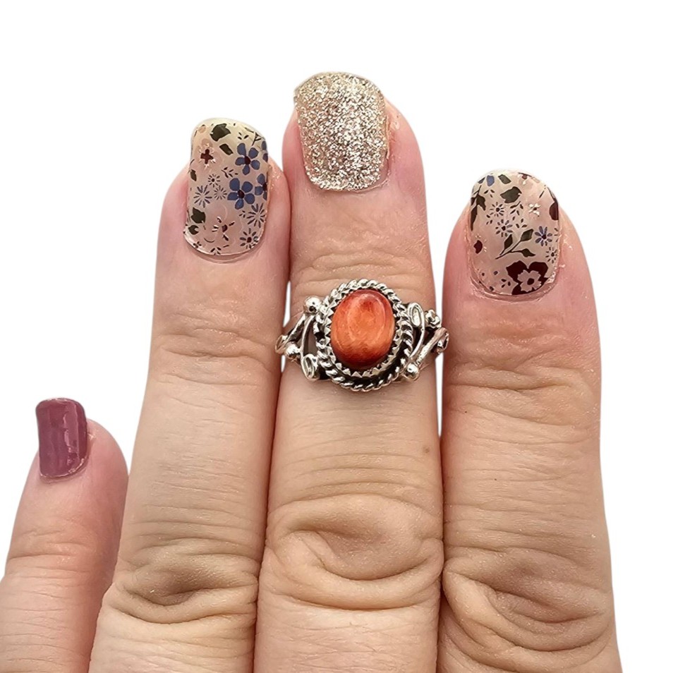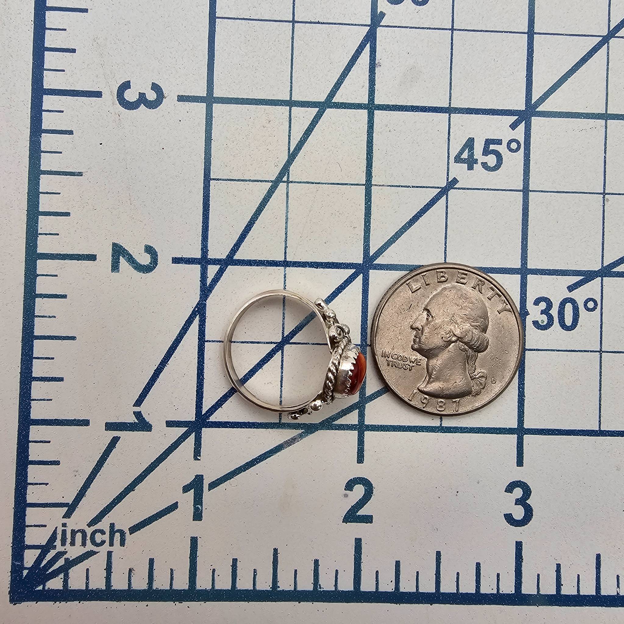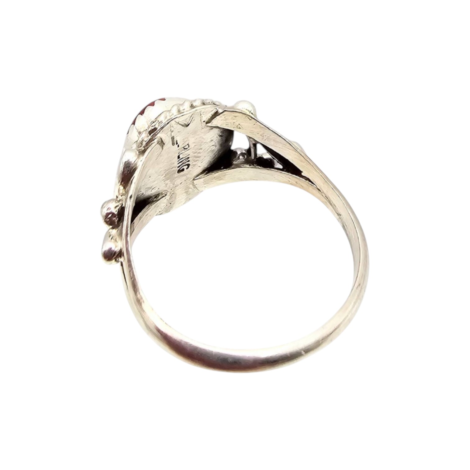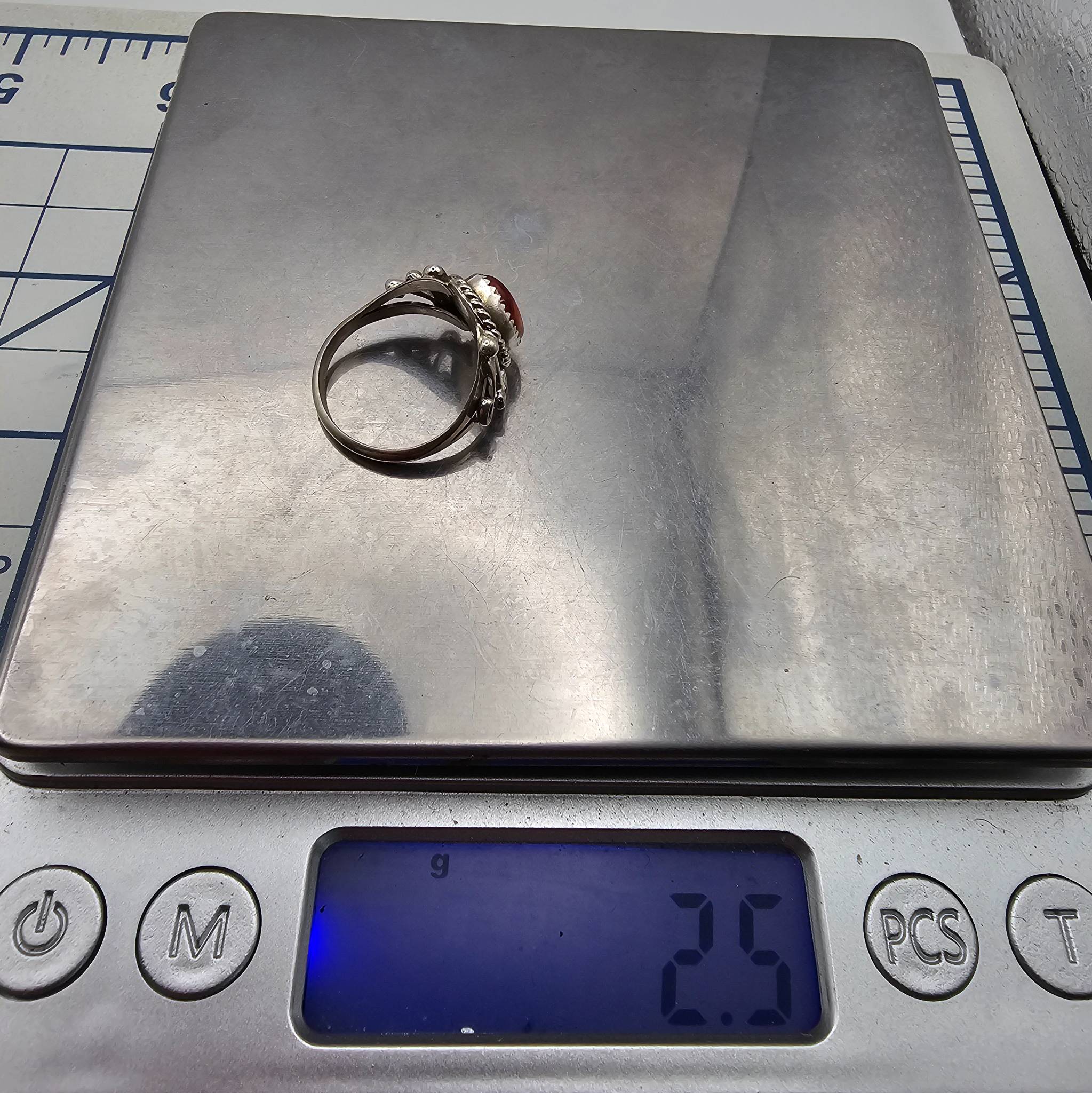 Sterling silver ring handcrafted by Navajo artisan Martha Martinez, featuring a spiny oyster stone centerpiece. The weight of the ring is 2.5 grams, as displayed on a scale.