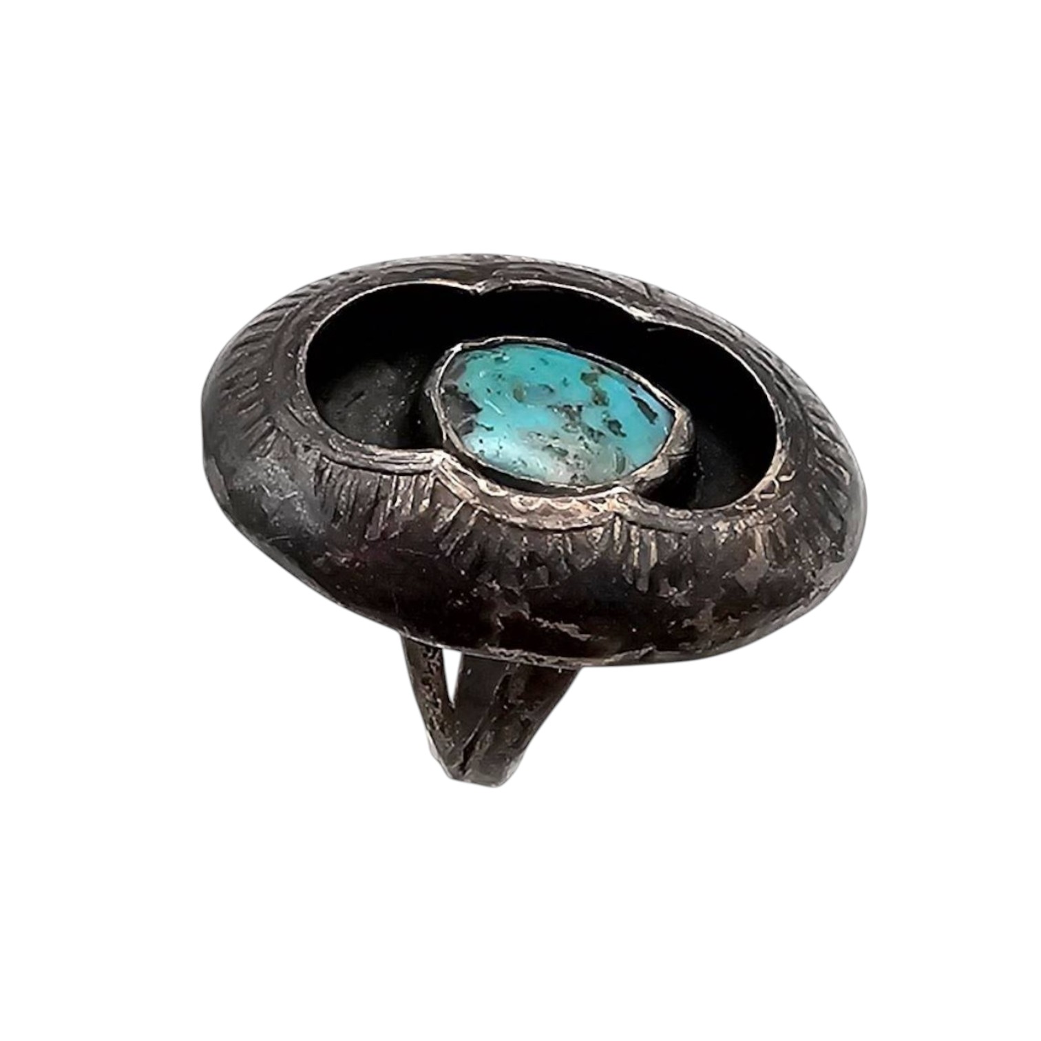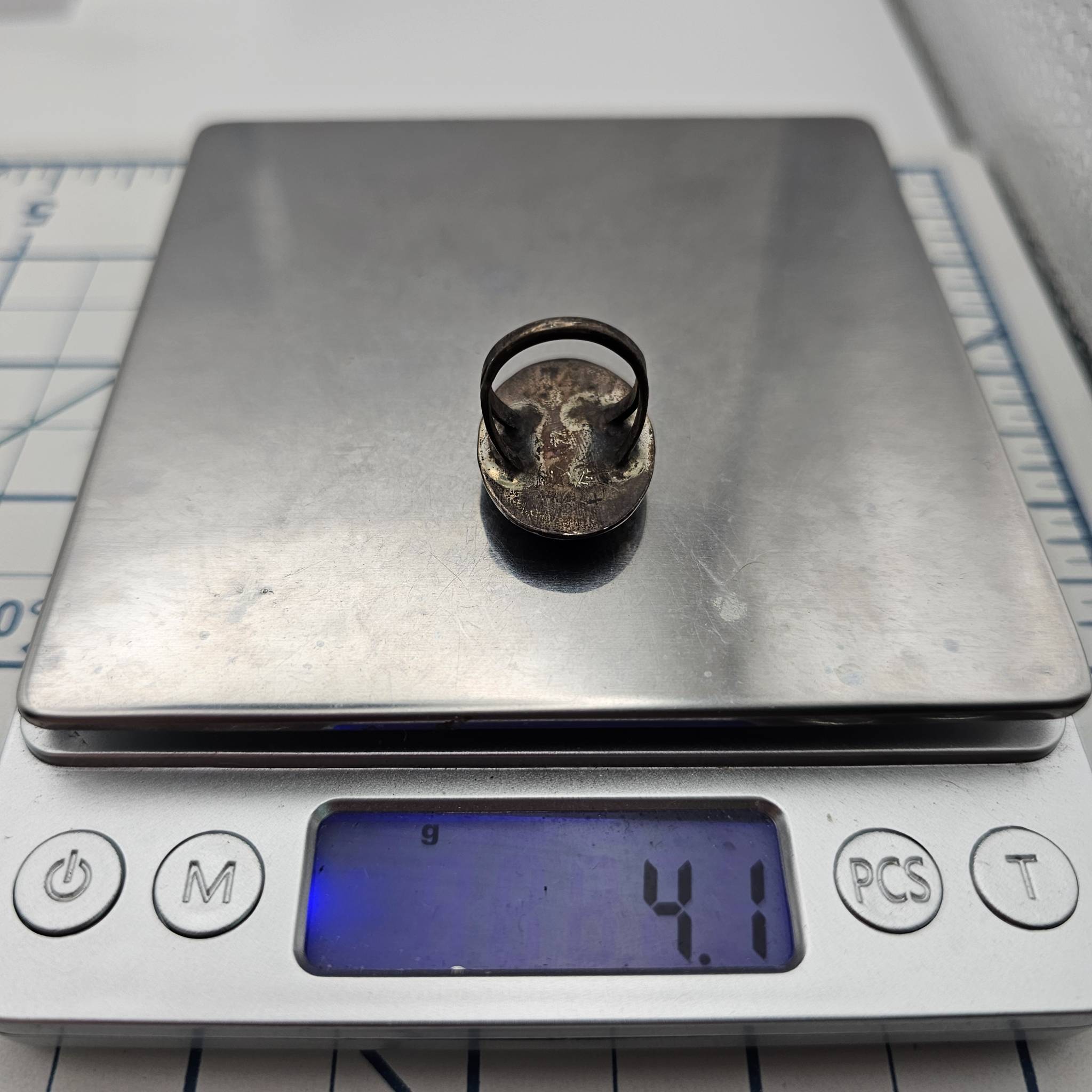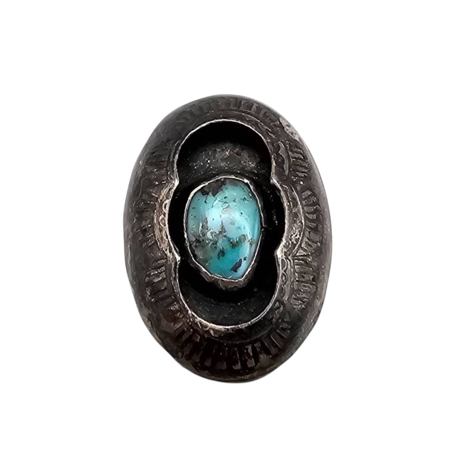 Navajo-made sterling silver (marked ) shadowbox ring featuring a turquoise stone as the centerpiece. The ring weighs 4.1g and has a unique shadowbox design with engraved details. Measures approximately 1 inch in length, reference provided alongside a US quarter for scale.