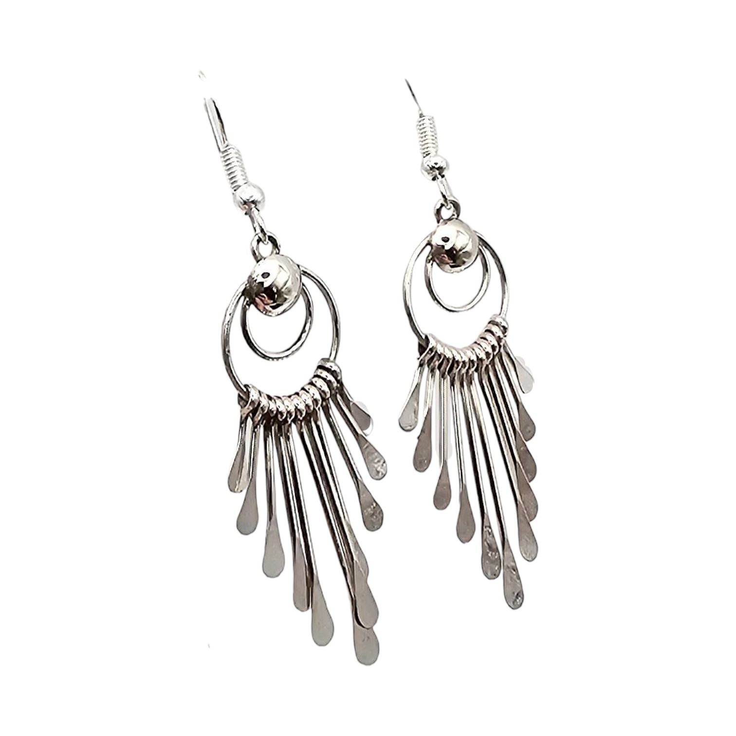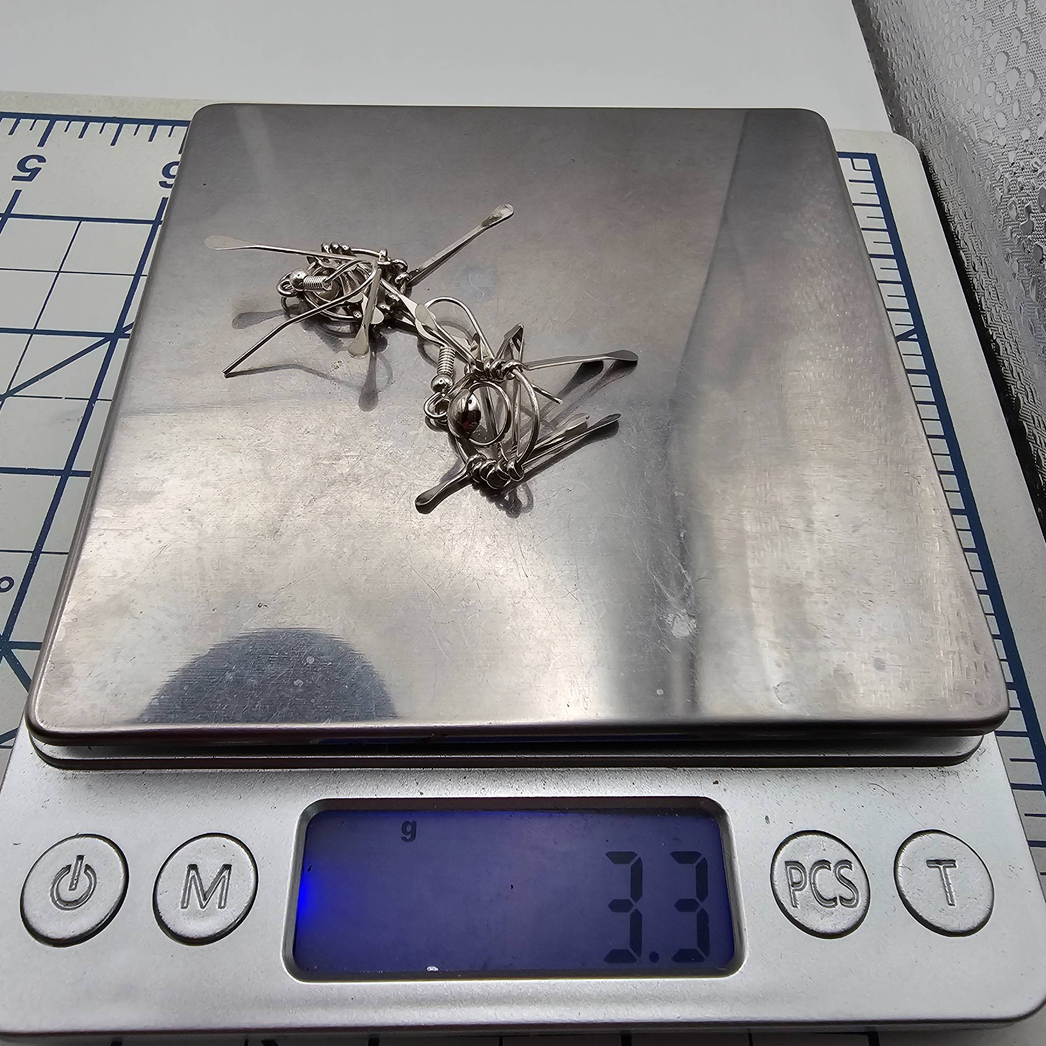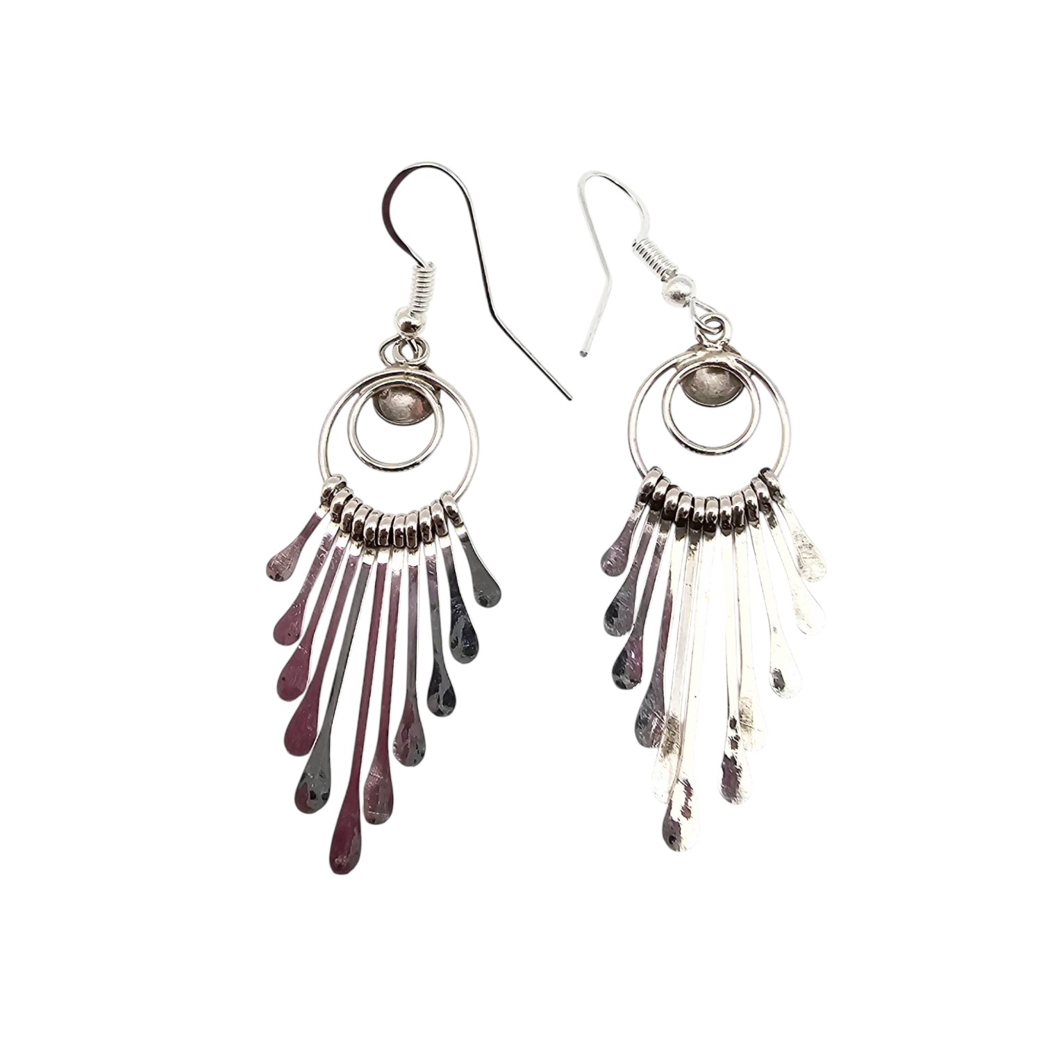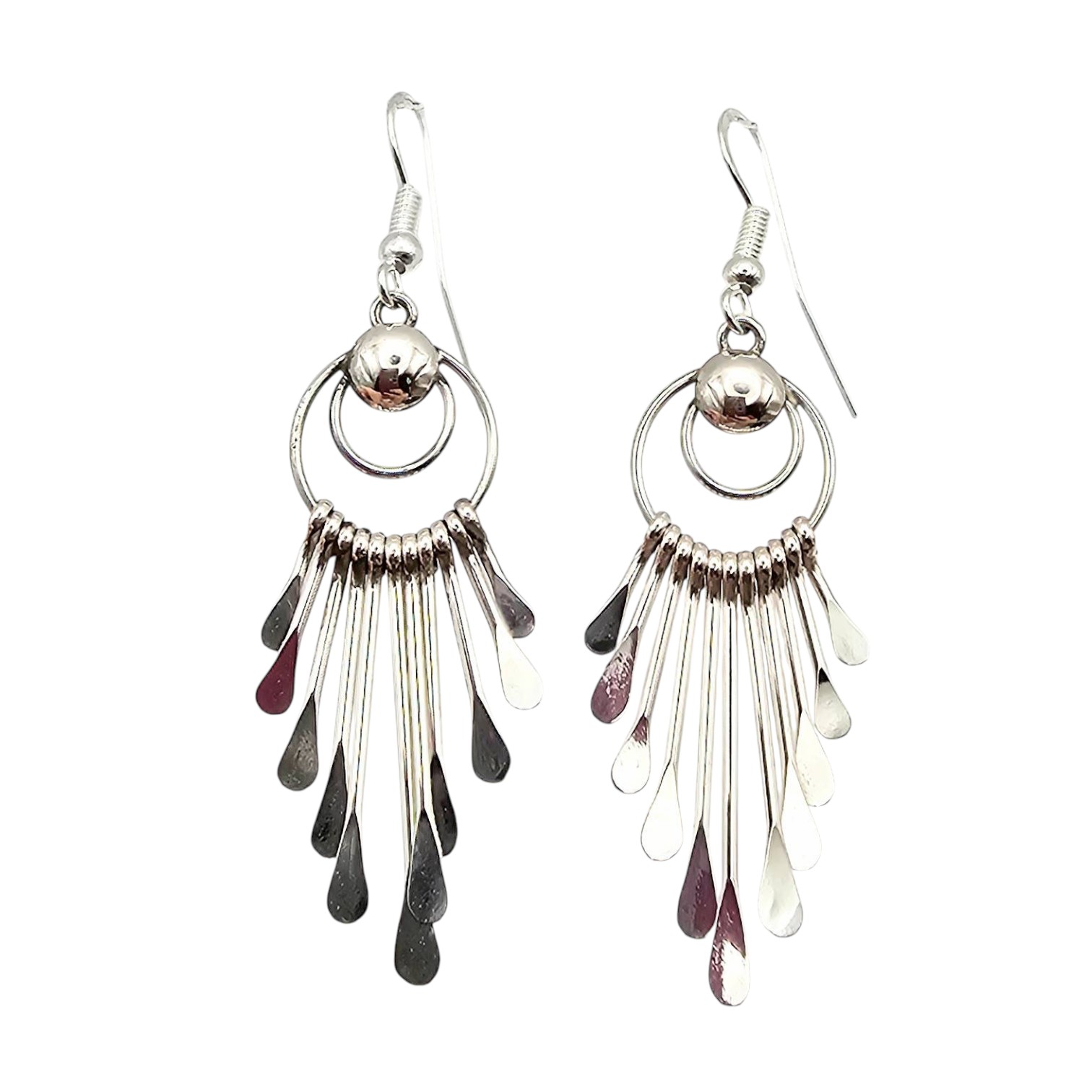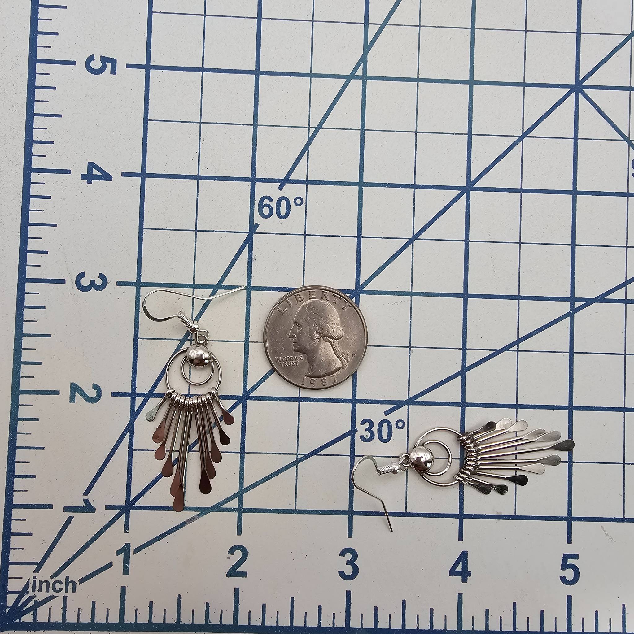 Handmade sterling silver earrings crafted by Navajo artisan Pam Armstrong. Features dangling silver elements attached to circular bases with fishhook backs. Earrings weigh approximately 3.3 grams and include a maker’s label identifying the artist and material. Size details visible in photos, no additional measurements provided.