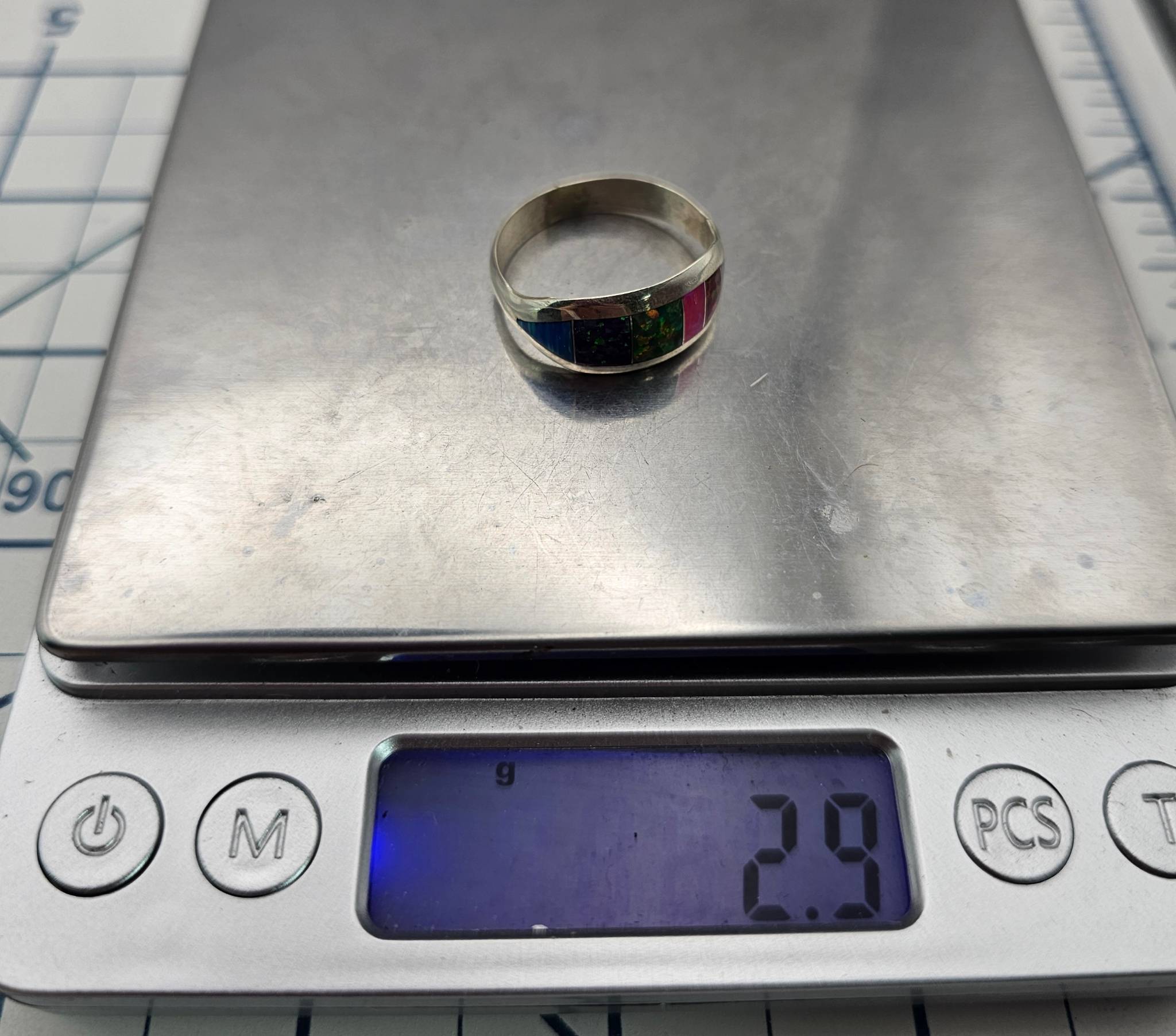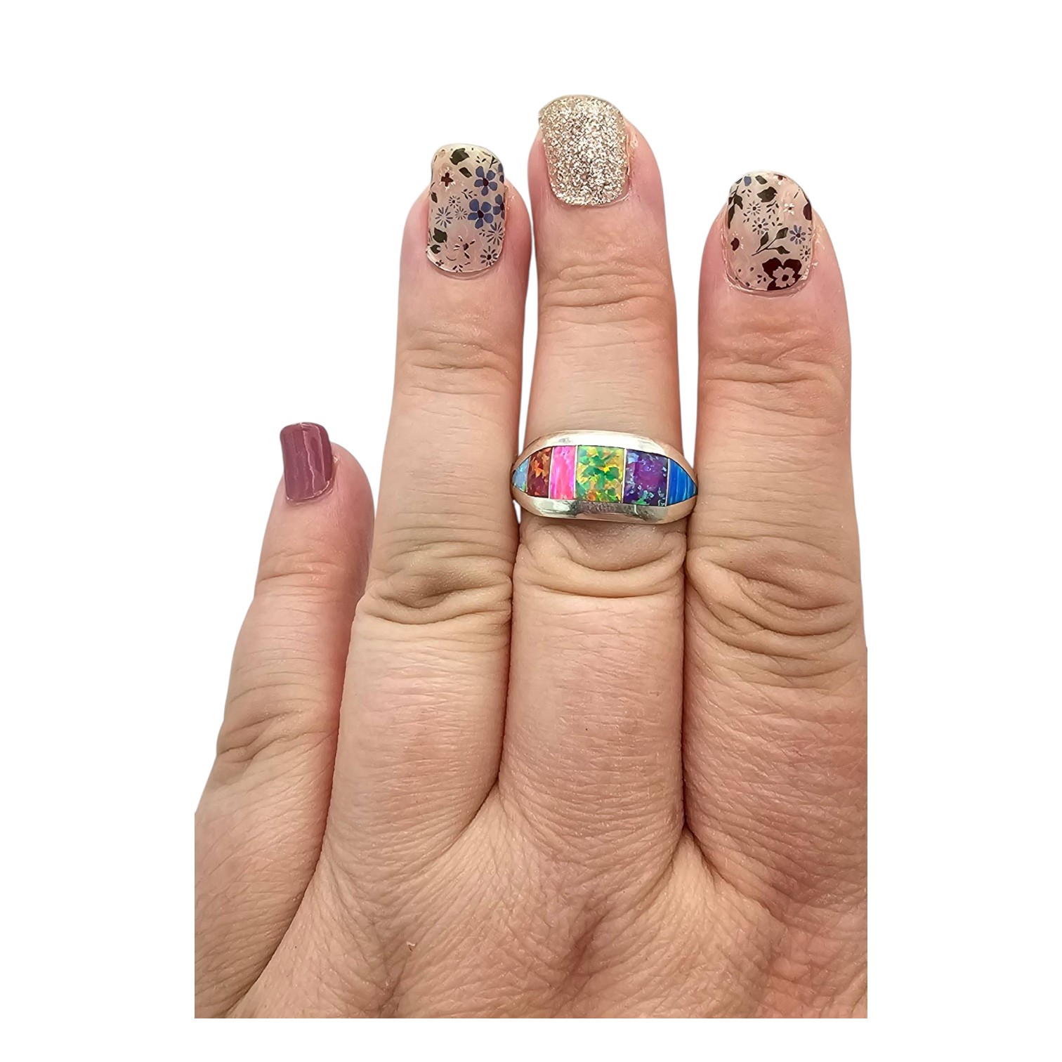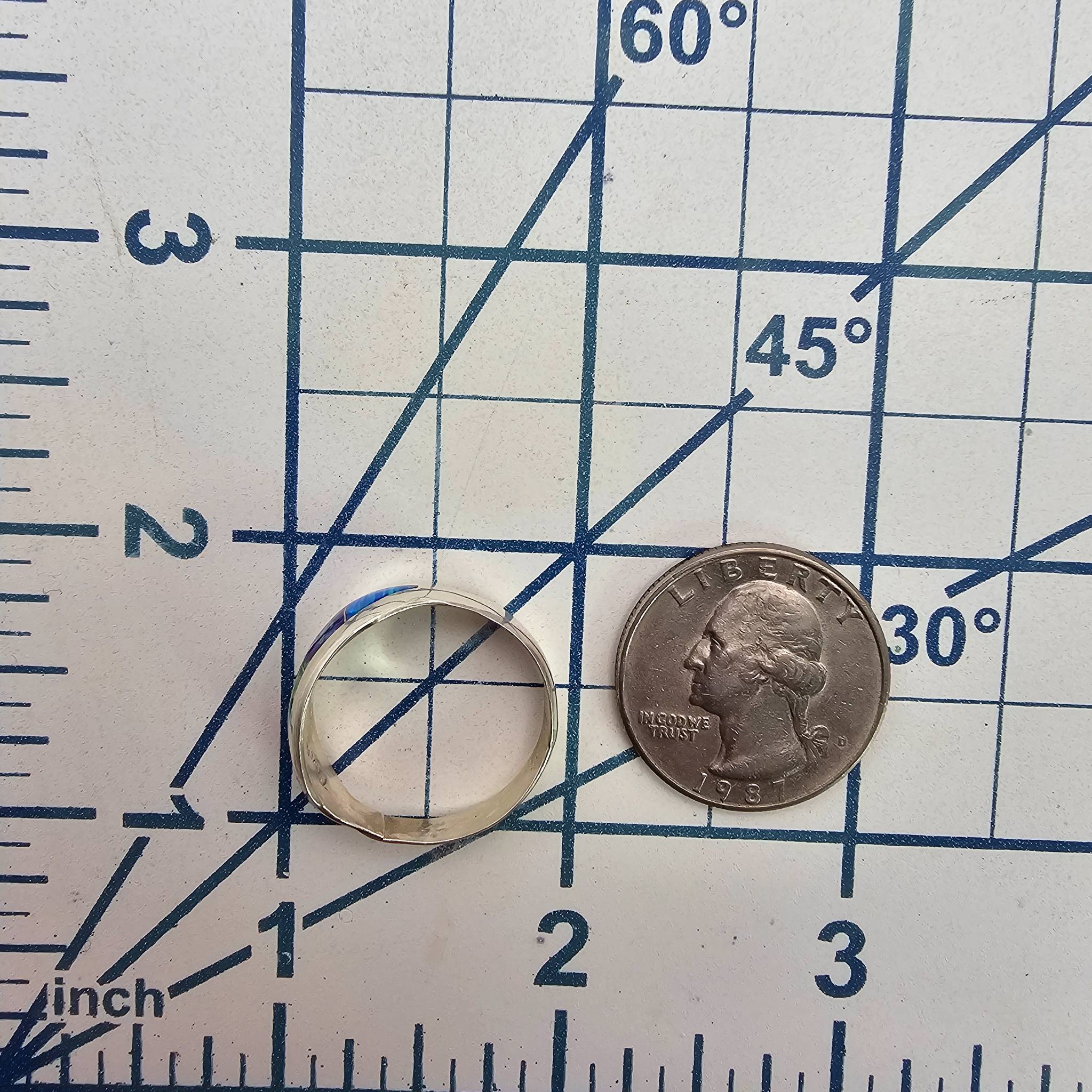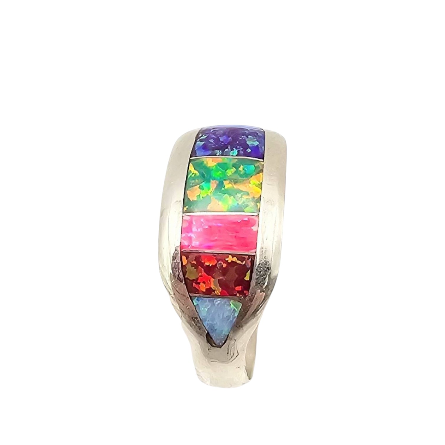 Sterling silver ring handmade by Navajo artisan Norvin Johnson. Features vibrant opal inlay in a multicolored design. Size 10.5 with a total weight of 2.9 grams.