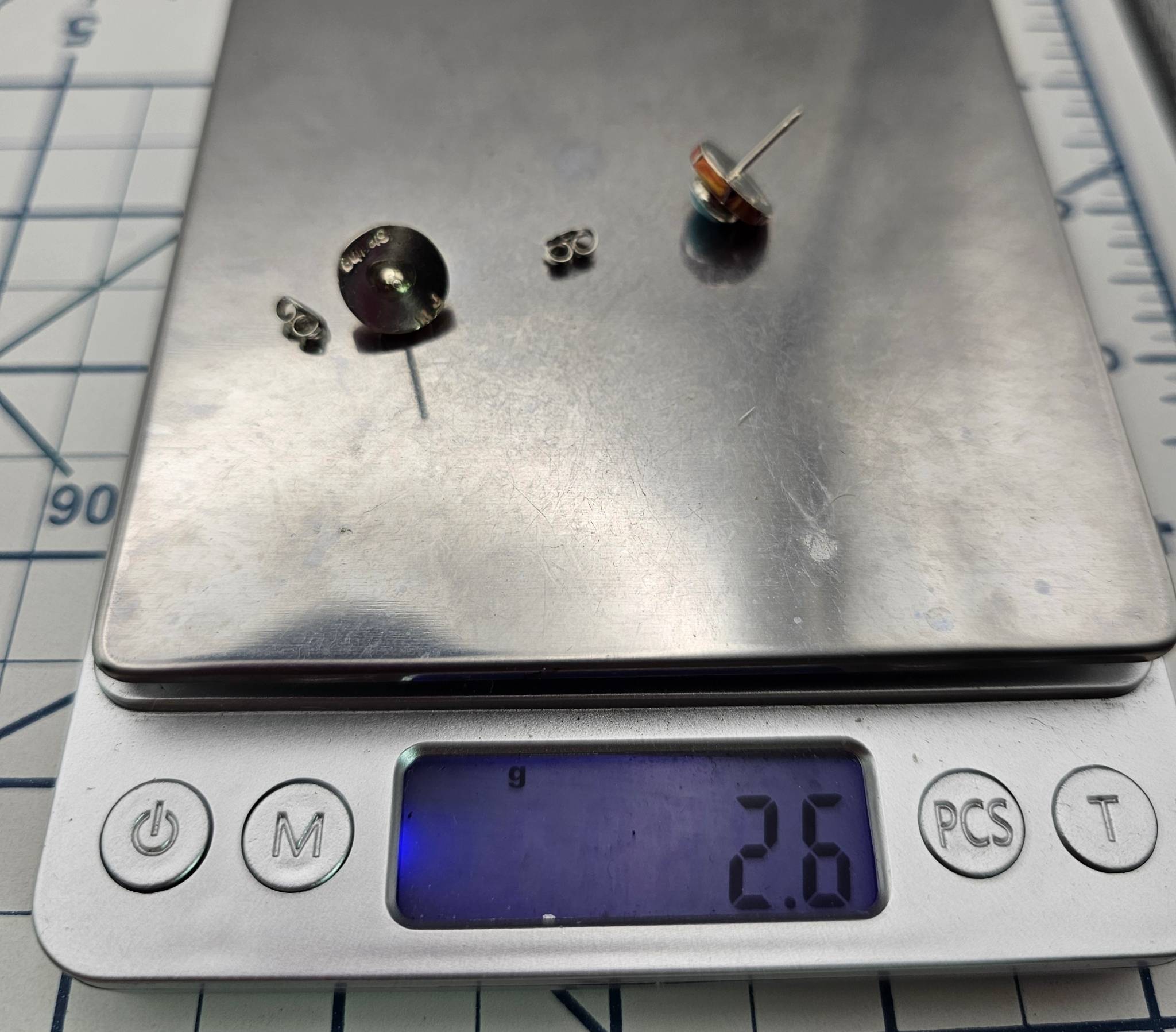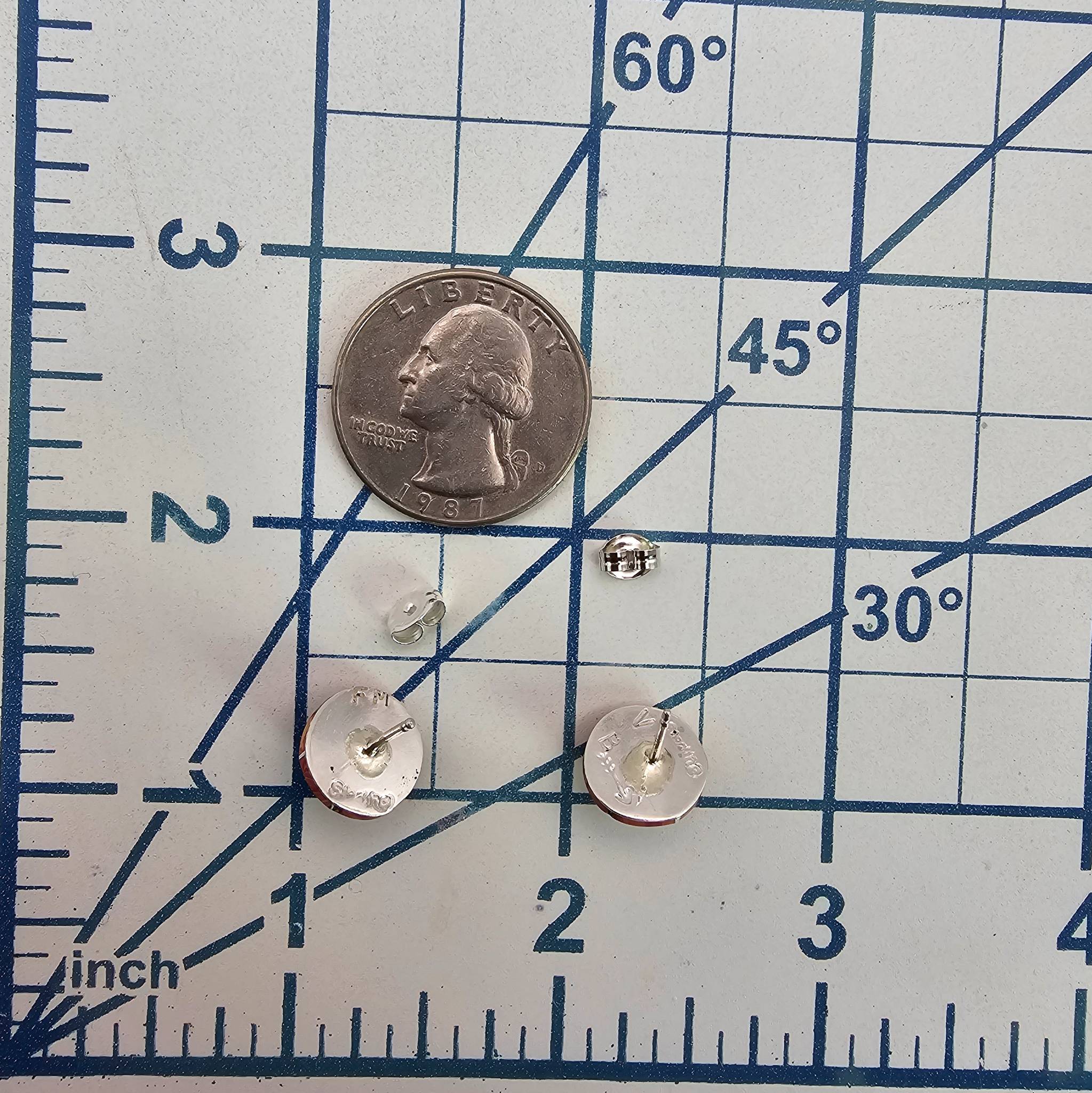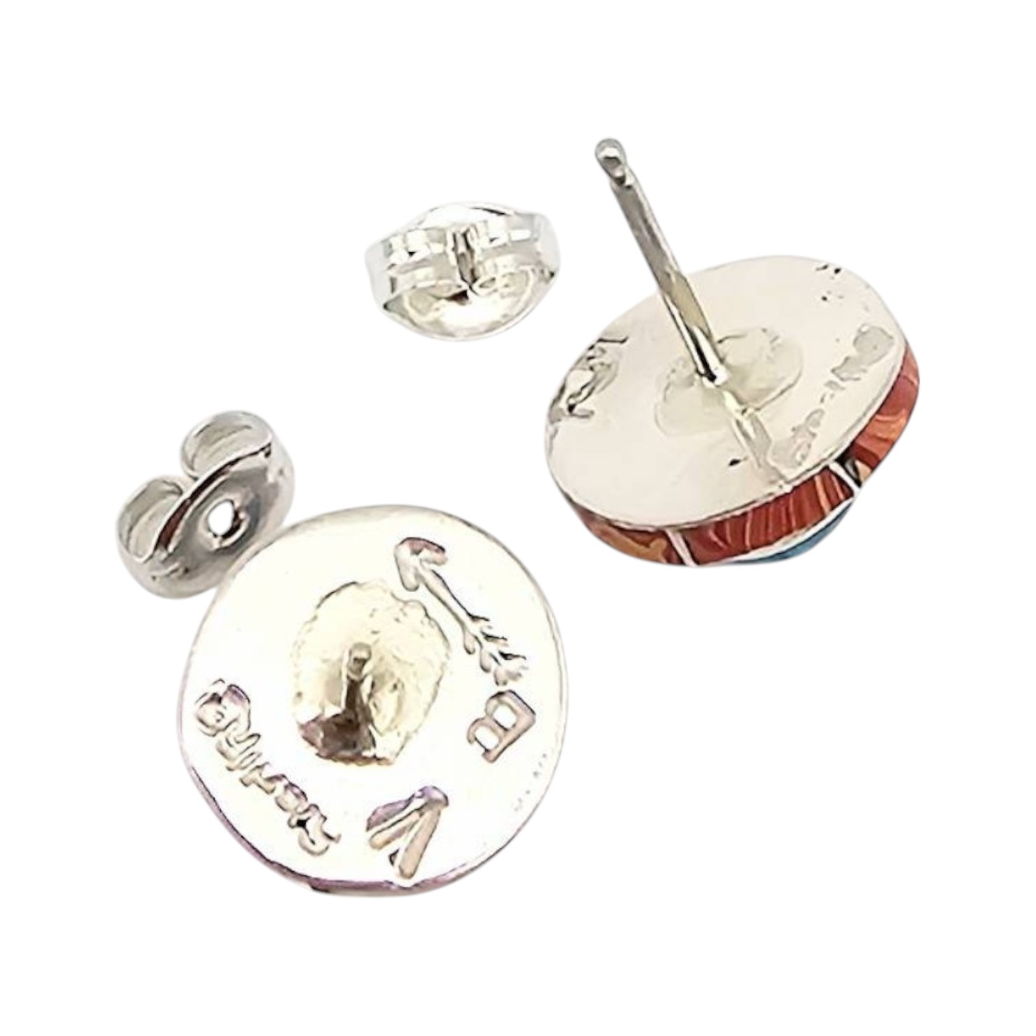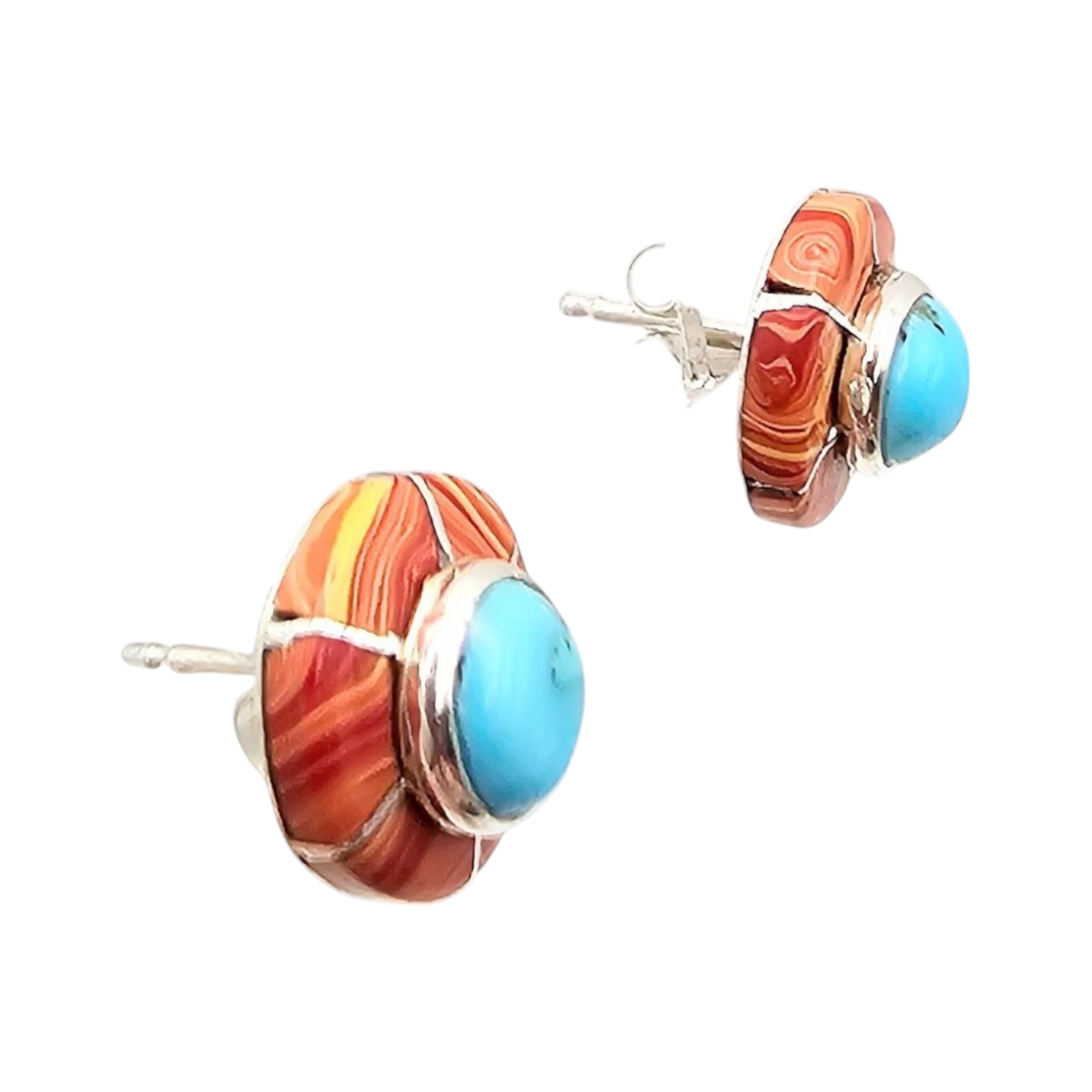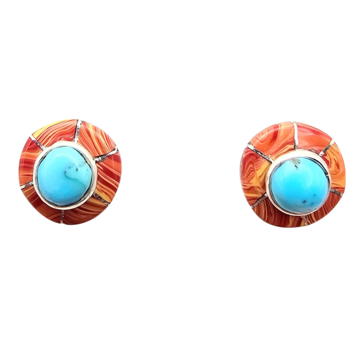 Fred Manuelito Navajo handmade multicolor earrings crafted from sterling silver. These stud-style earrings feature a combination of vibrant inlaid turquoise and orange Spiny Oyster stonework. Weighing approximately 2.6 grams, the items are hallmarked on the back. Comes with the original backings as shown.