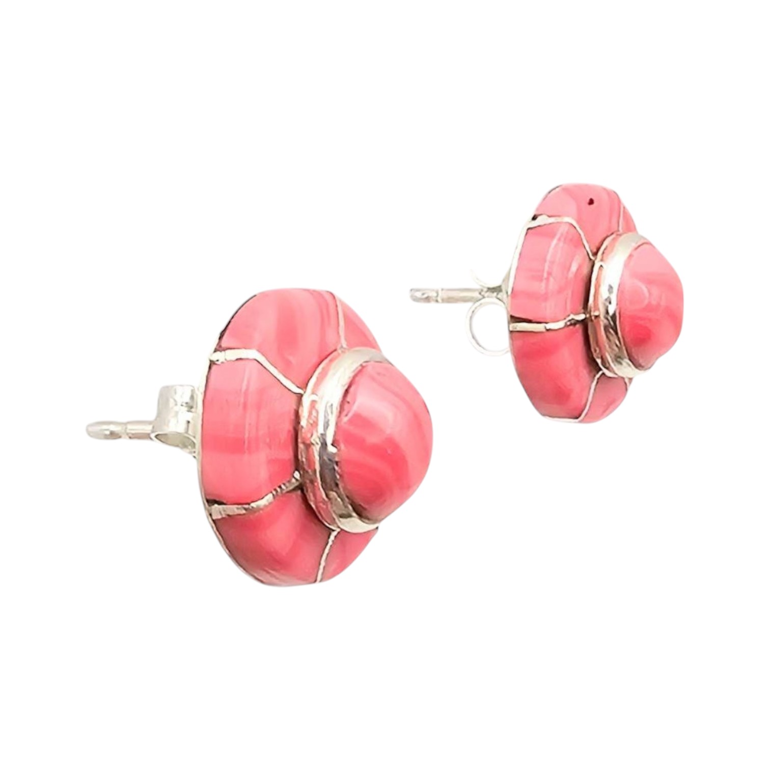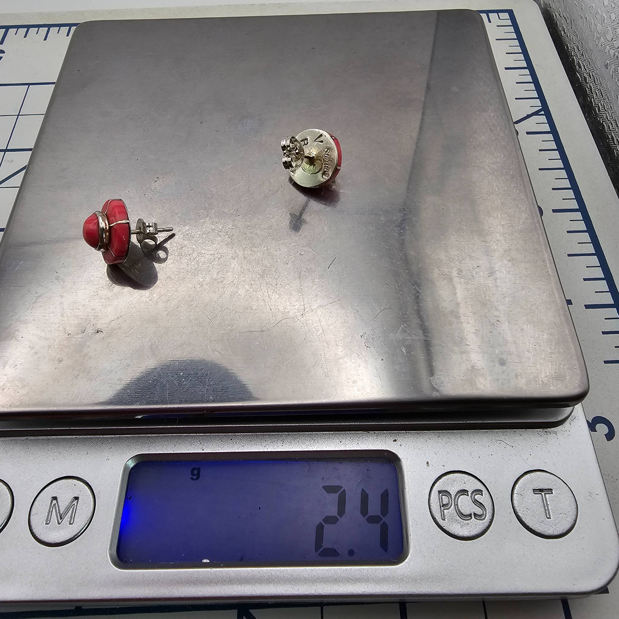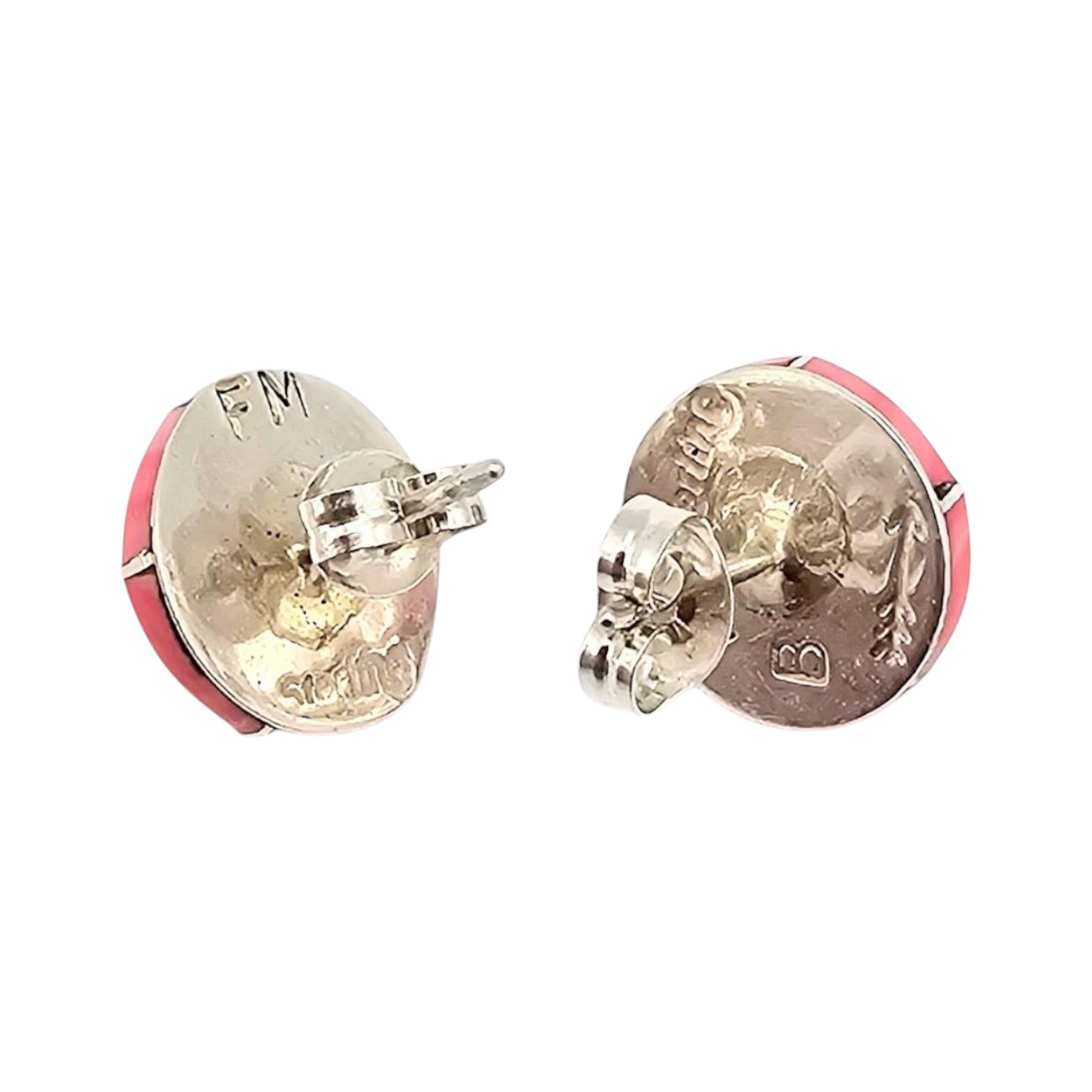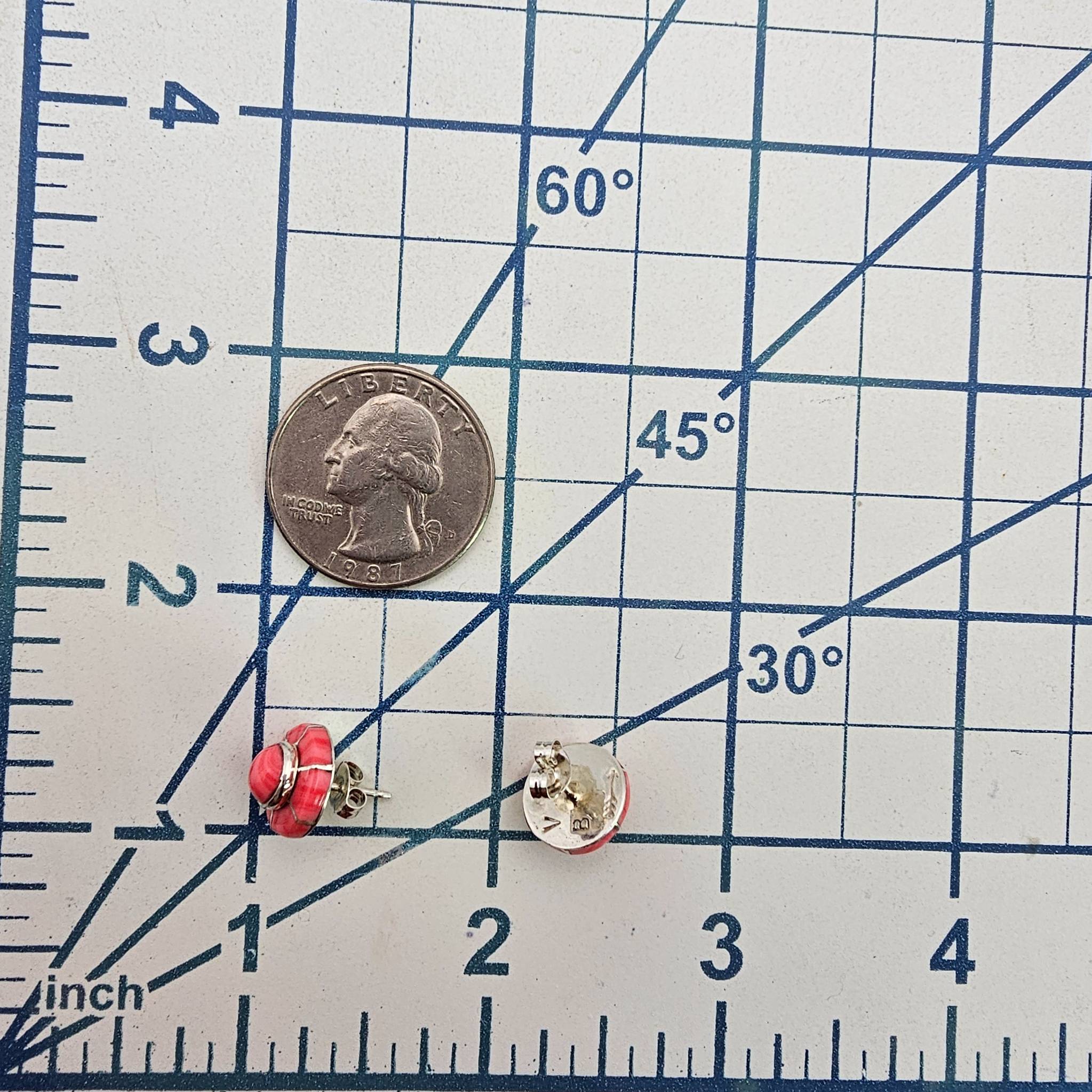 Handmade Navajo earrings by Fred Manuelito, crafted in sterling silver. These earrings showcase a vibrant Spiny Oyster design featuring pink stones arranged in a circular pattern. They are marked ‘FM’ and ‘Sterling’ on the backs and come with secure butterfly backings. The pair weighs approximately 2.4 grams, with dimensions visible in scaled images referencing a quarter and grid for measurement.