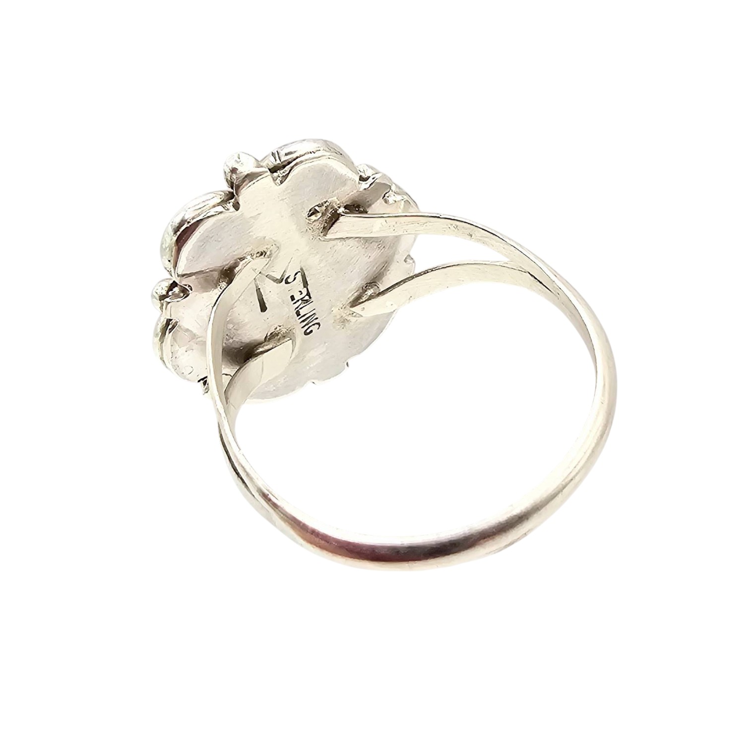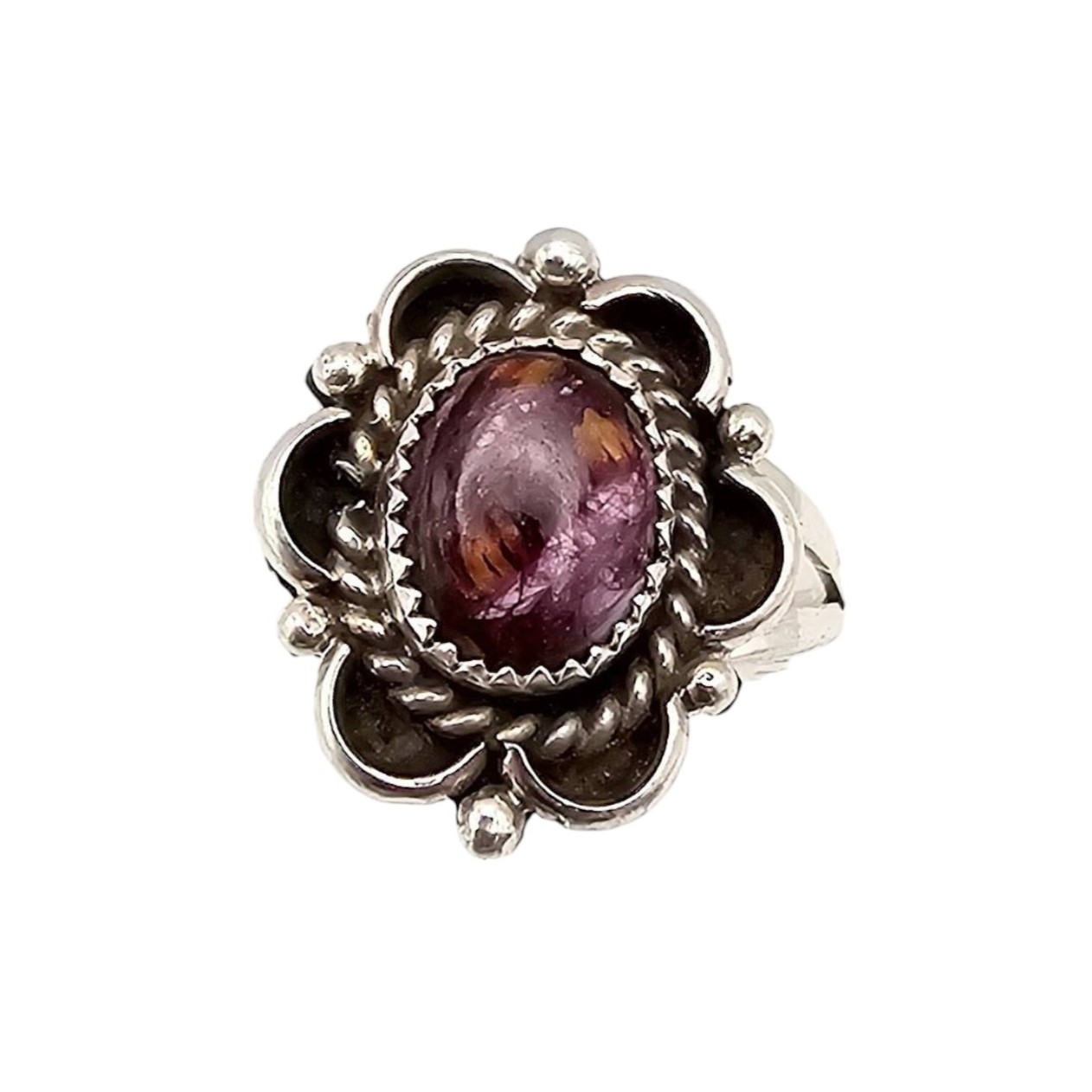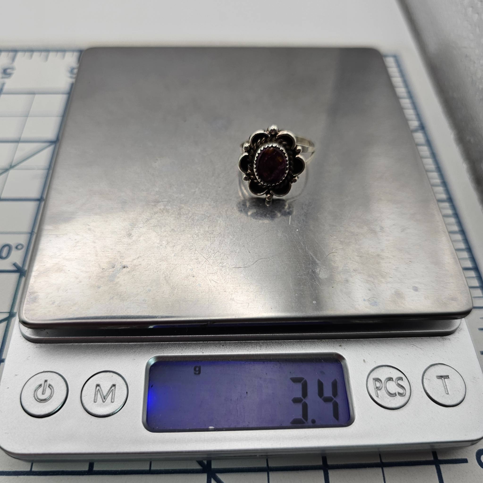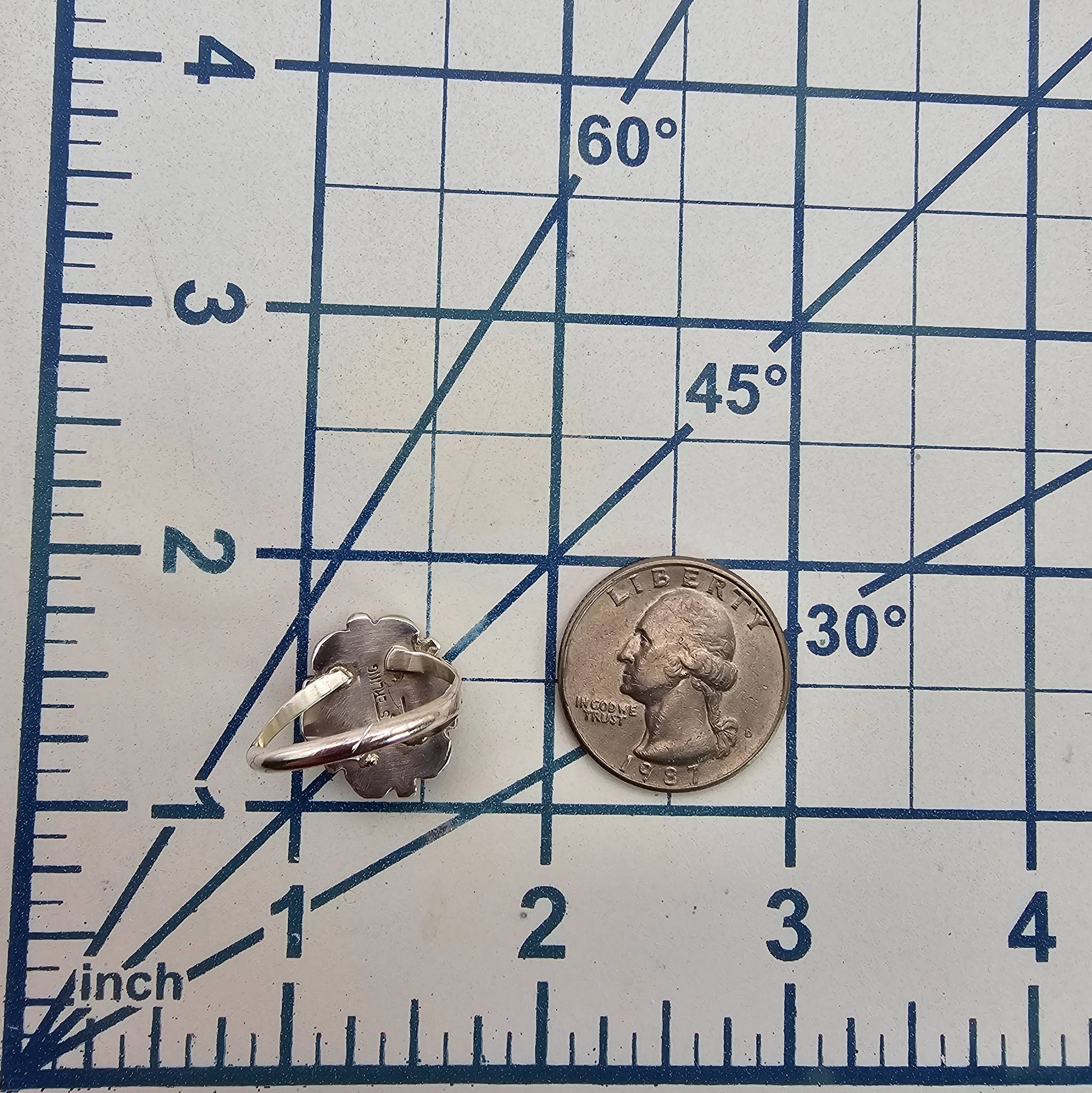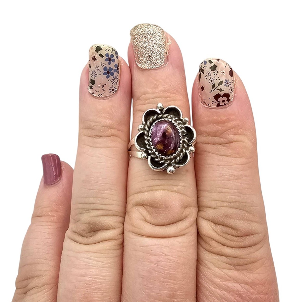 Handmade by Navajo artisan Freda Martinez, this sterling silver ring features a spiny oyster gemstone centerpiece set in an intricate floral-inspired design. The ring is marked ‘S. Silver’ on the underside, weighs 3.4 grams, and is a size 7.