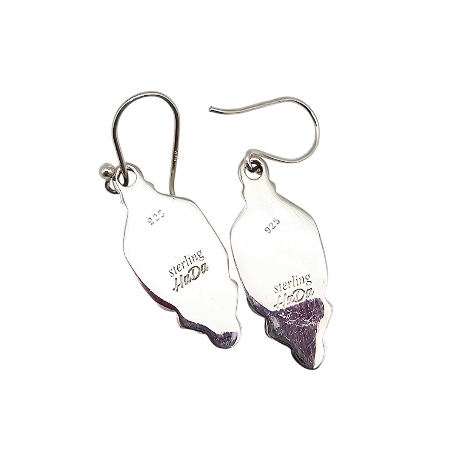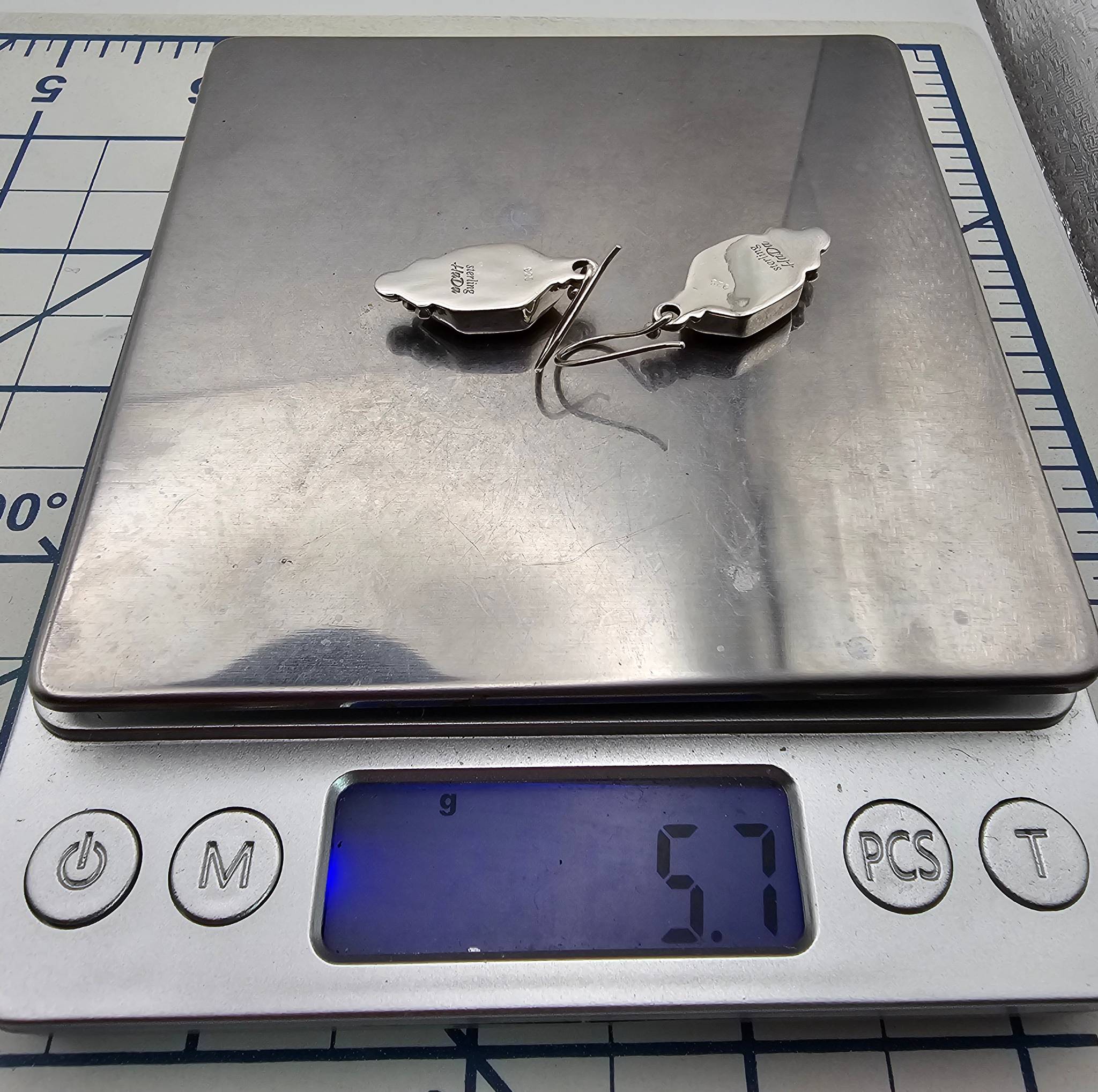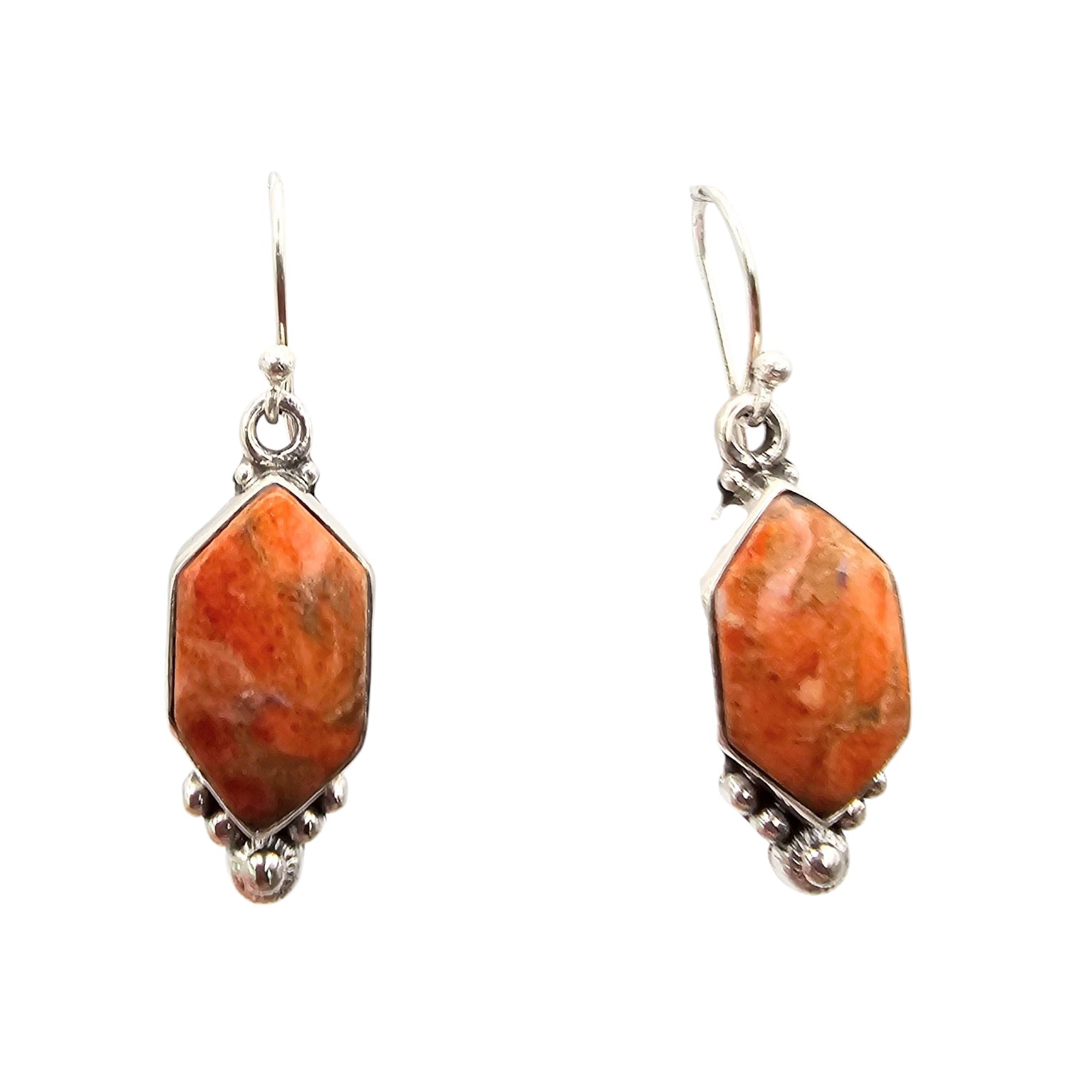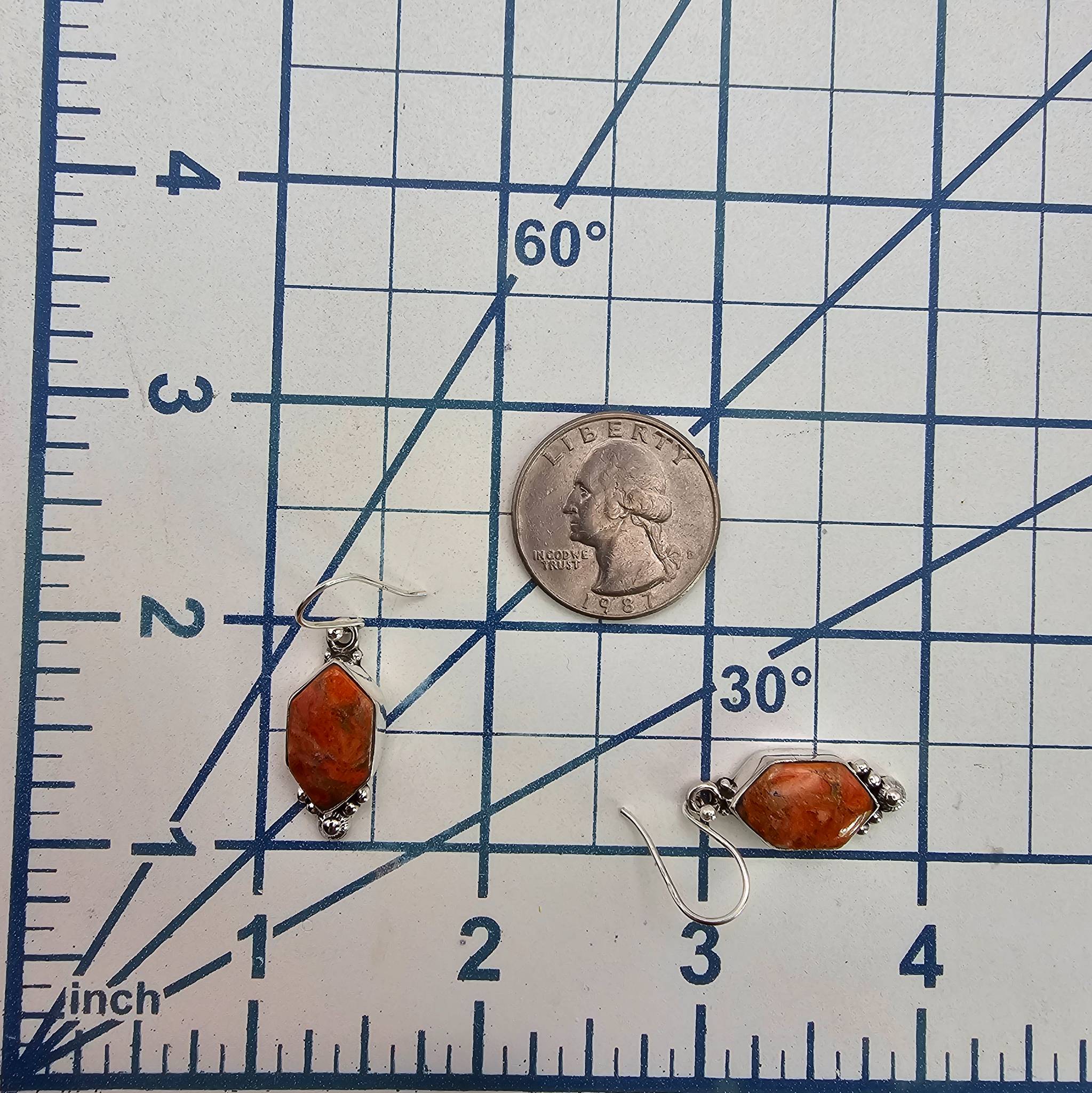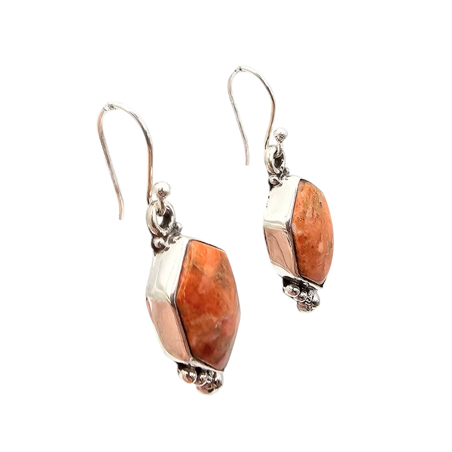 Sterling silver earrings from the Hada Collection, featuring apple coral gemstones. The gemstones are set in a geometric design and weigh a total of 5.7 grams as shown on the scale. Each earring is marked ‘ ‘ and branded ‘sterling Hada’ on the backside. Includes fishhook backings for wear. Dimensions can be estimated using the scale in the photos.