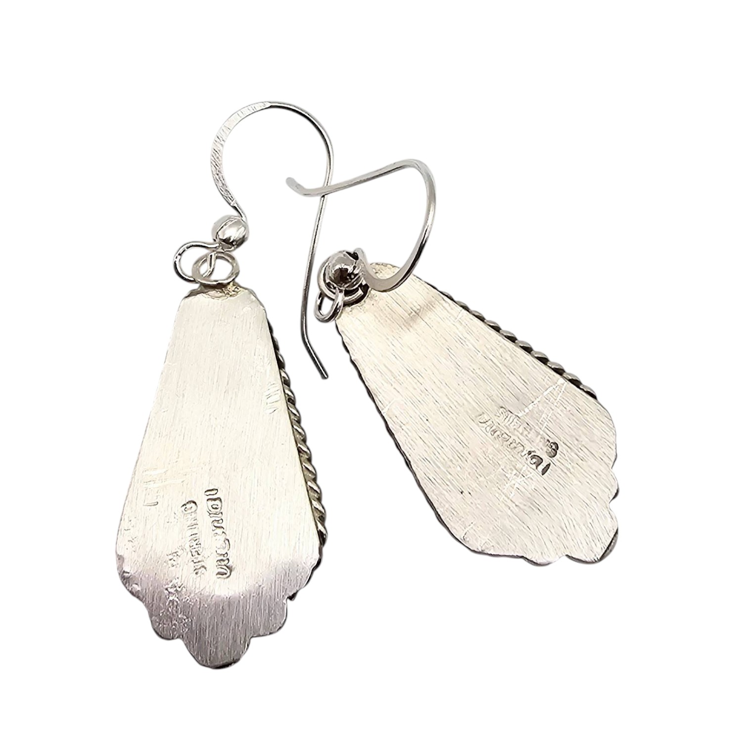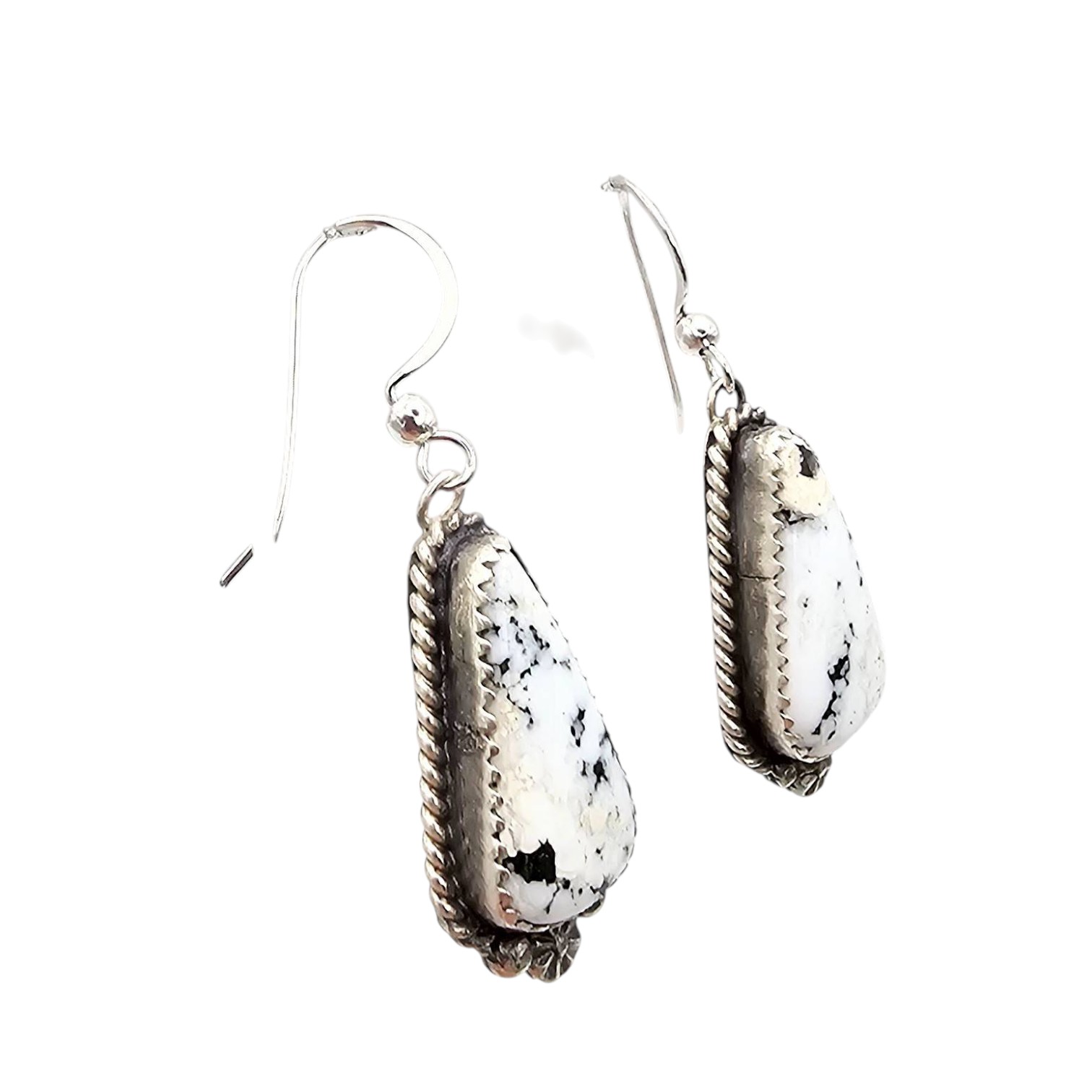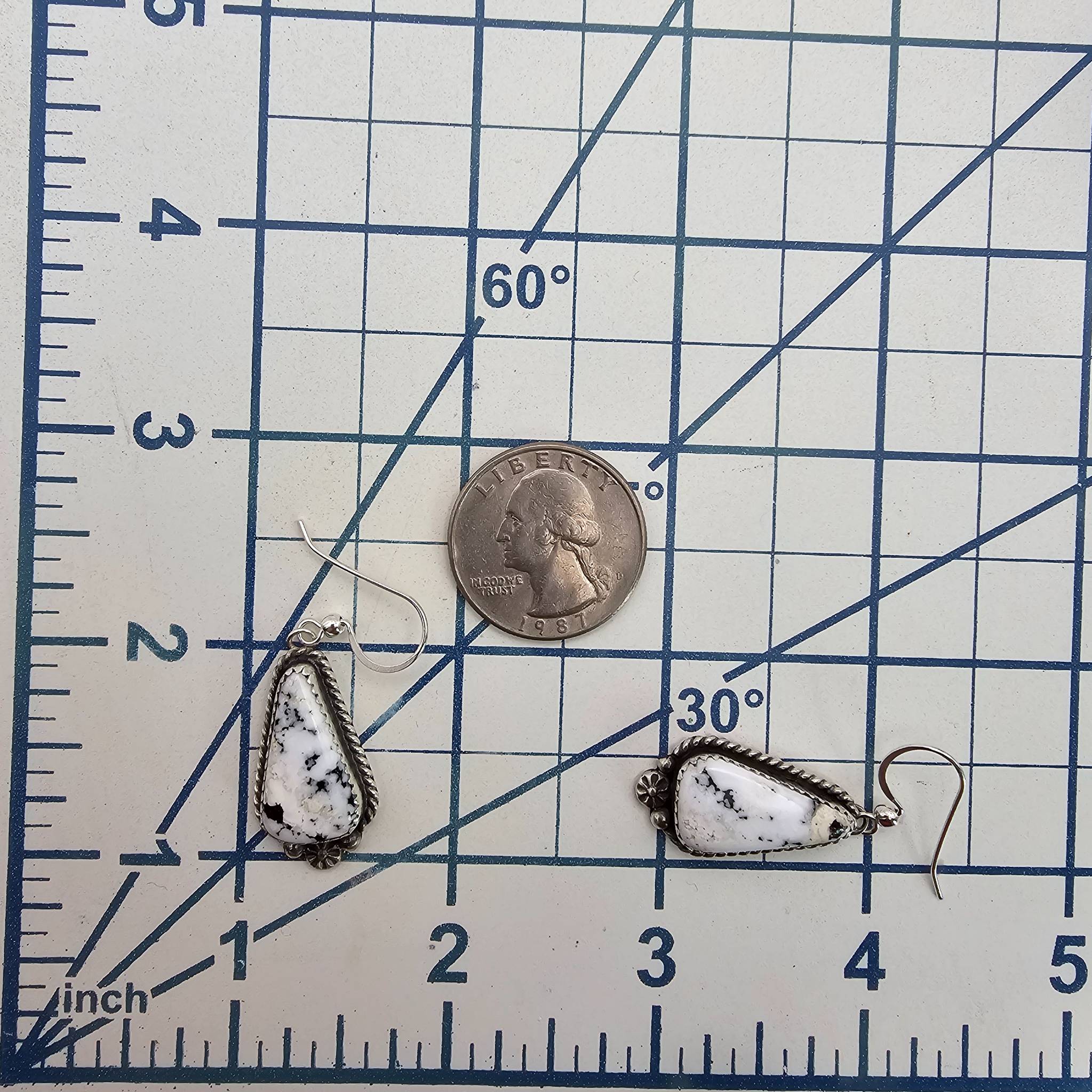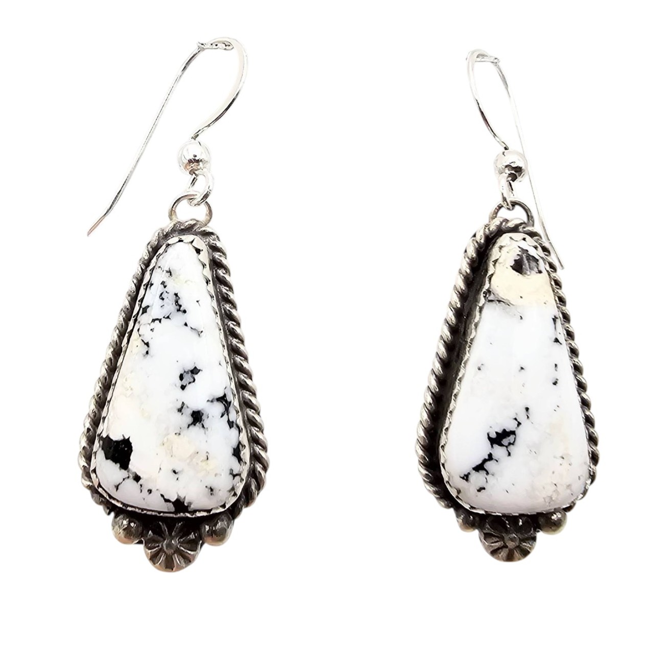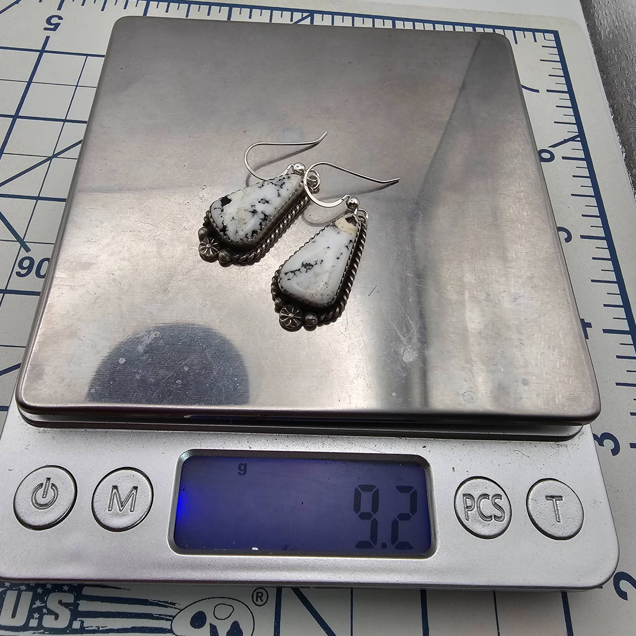 Handmade earrings by Navajo artist Judith Dixon. Crafted from sterling silver (SS), these earrings feature striking white buffalo Turquoise stones accented with intricate rope and scalloped designs. Measuring approximately 1 inch in height without hooks, they are clearly artist-stamped on the back. The total weight is 9.2 grams as shown. Original retail price marked at $325.