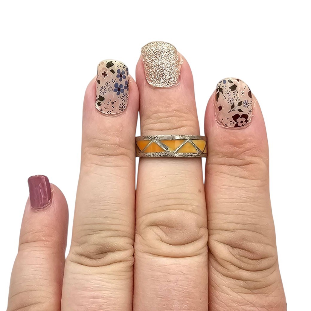 Handmade sterling silver ring by Navajo artisan Roger Morgan, featuring spiny oyster shell inlays and tribal design motifs. The ring is size 7 and weighs 3.0 grams. It is labeled with an original price of $60.