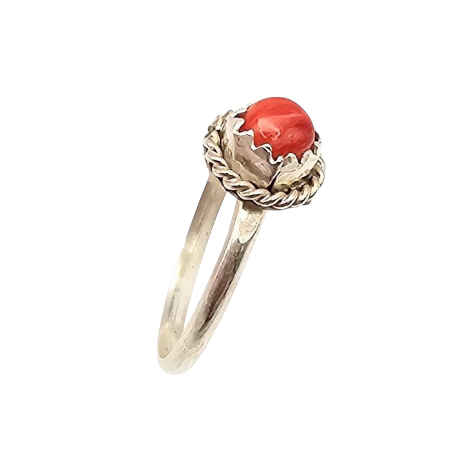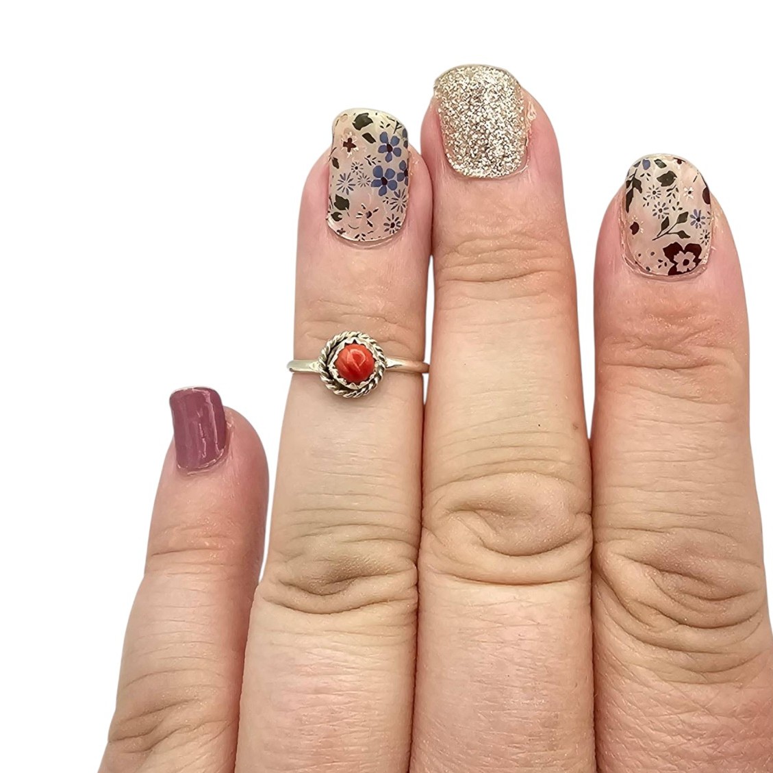 Handmade Navajo sterling silver ring crafted by Esther White. Features a single spiny oyster stone in a size 4 setting, weighing approximately 0.8 grams.