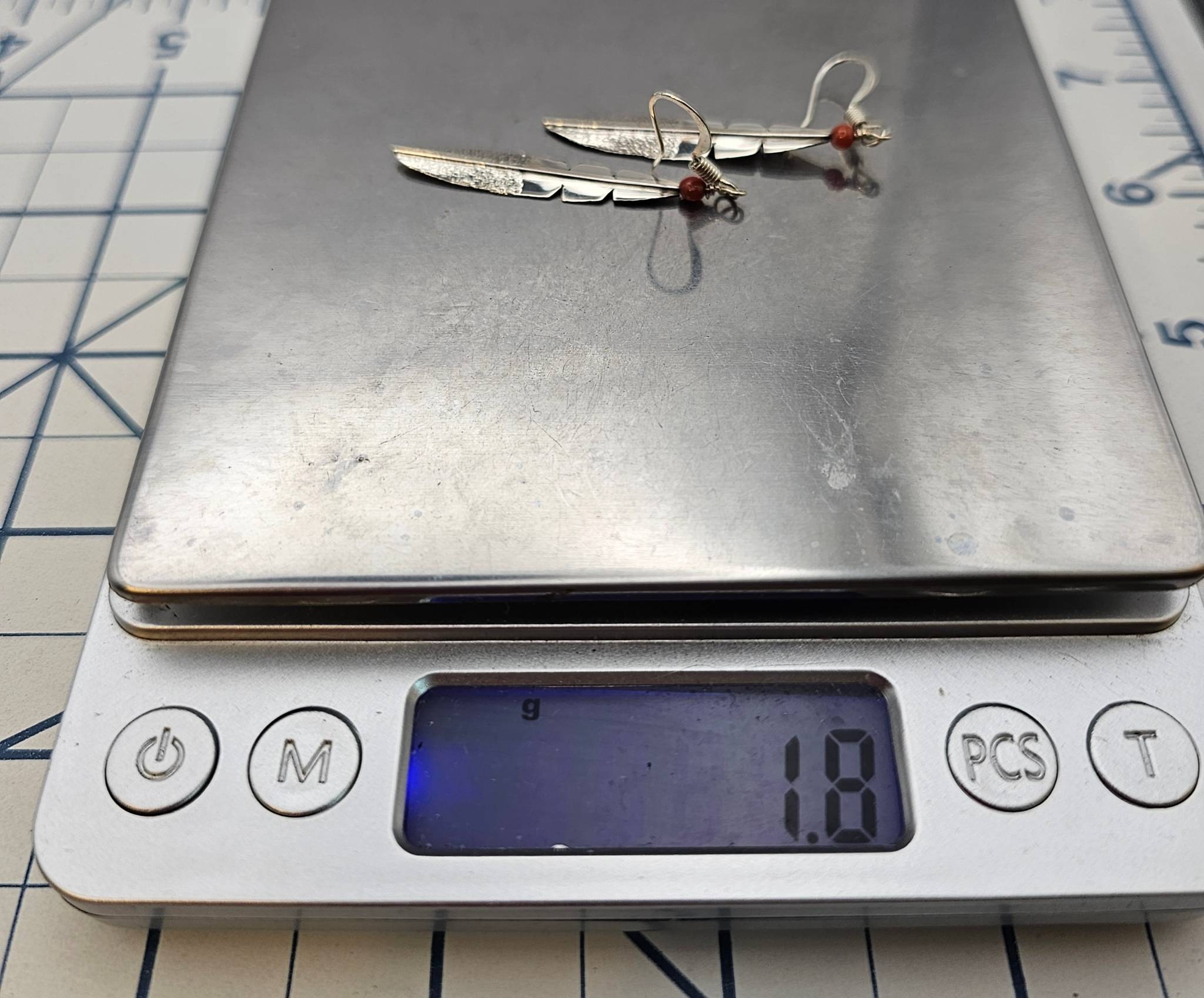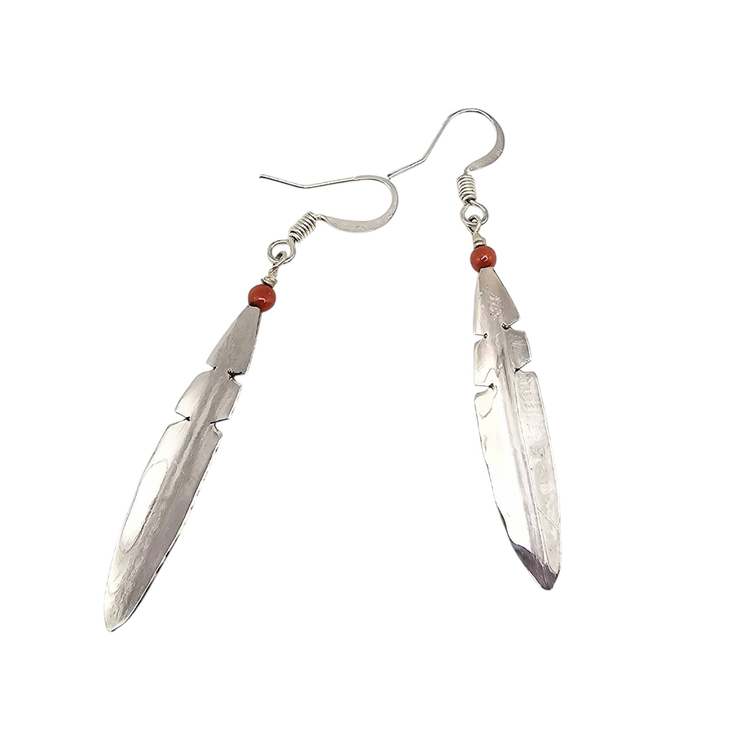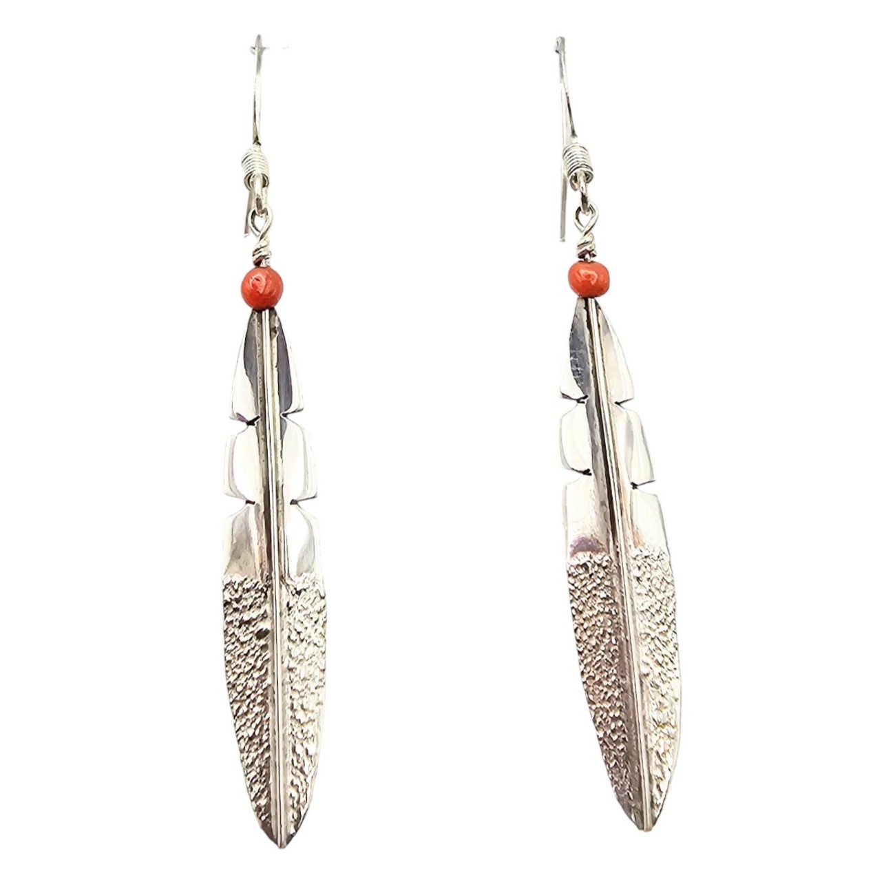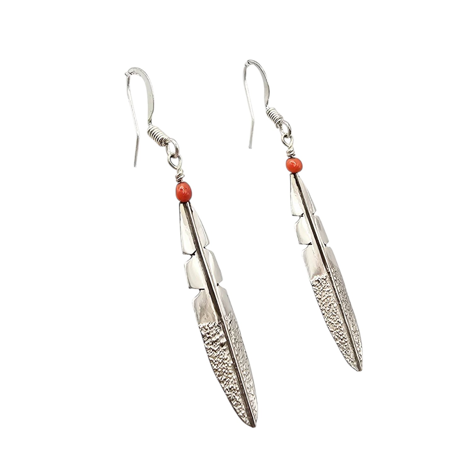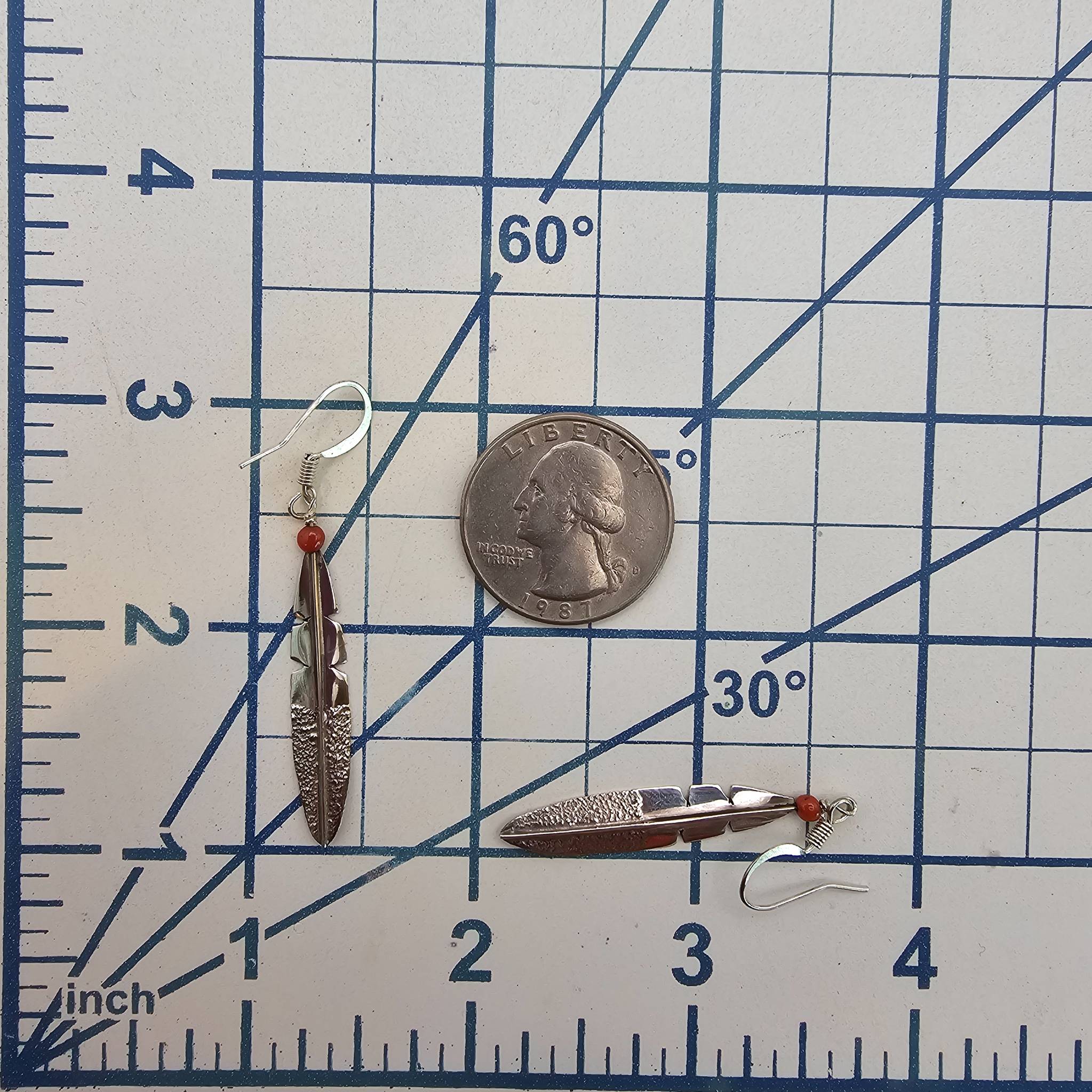 Navajo handmade sterling silver feather drop earrings adorned with red coral accents. Each earring features intricate feather detailing and measures approximately 2.5 inches in length. They weigh 1.8 grams in total. The earrings come with hook-style closures, ensuring a secure fit.