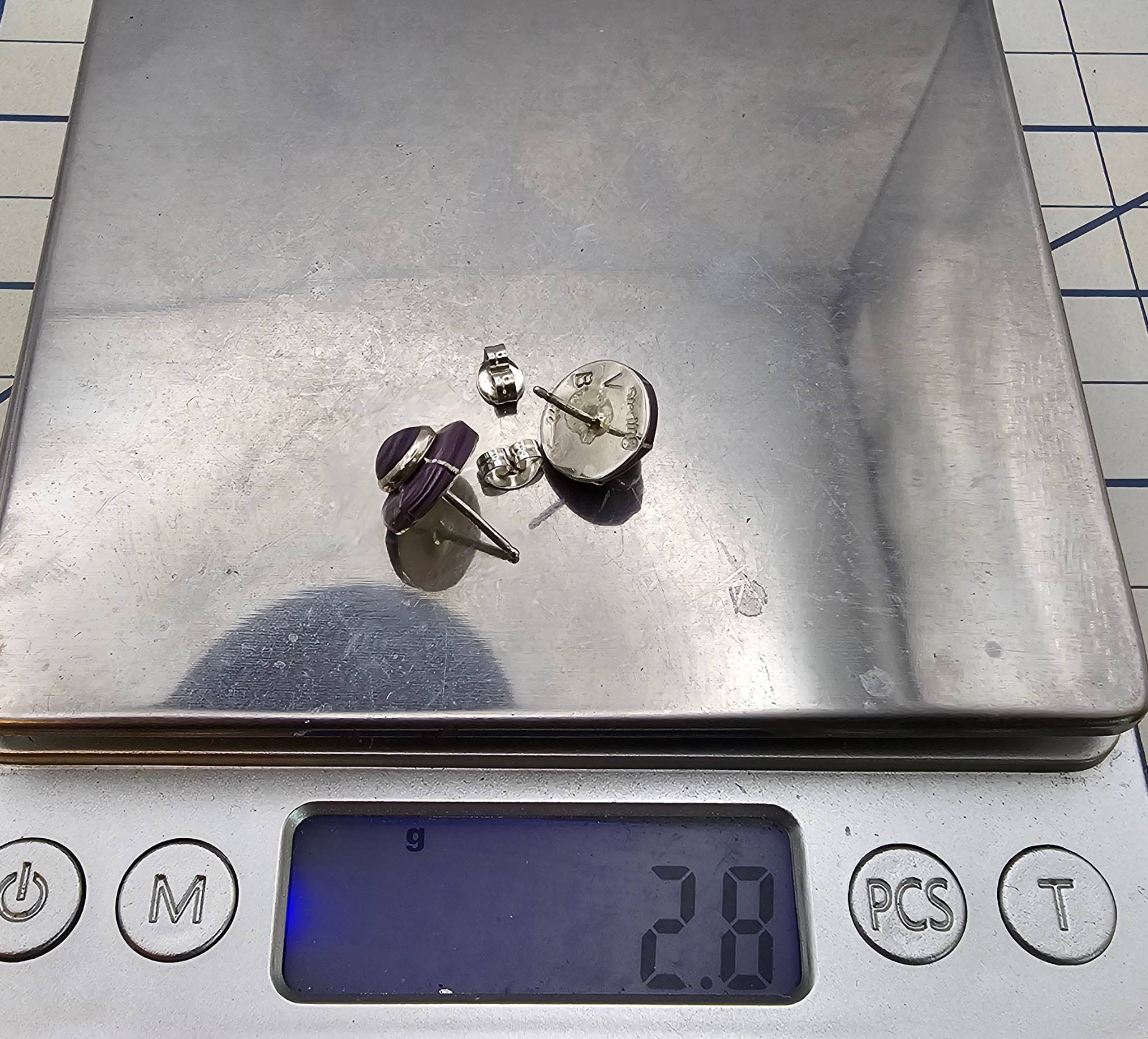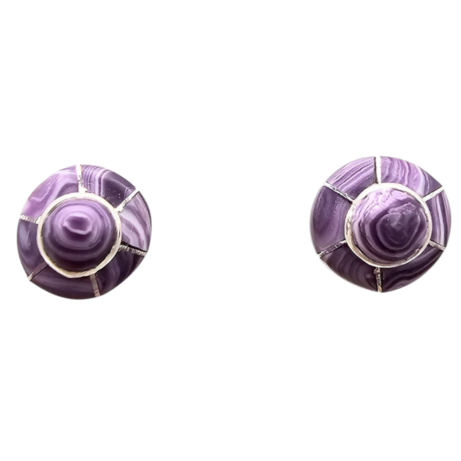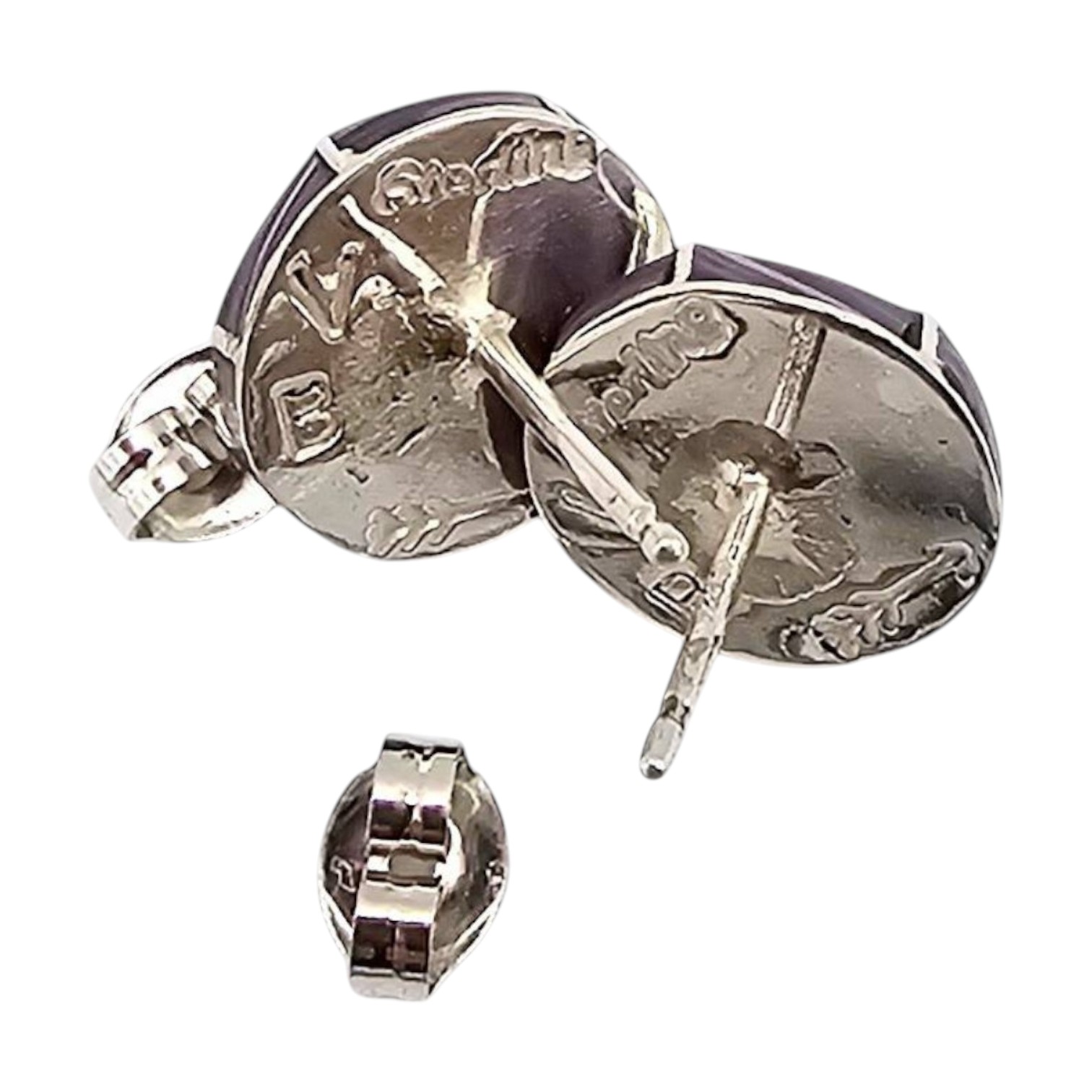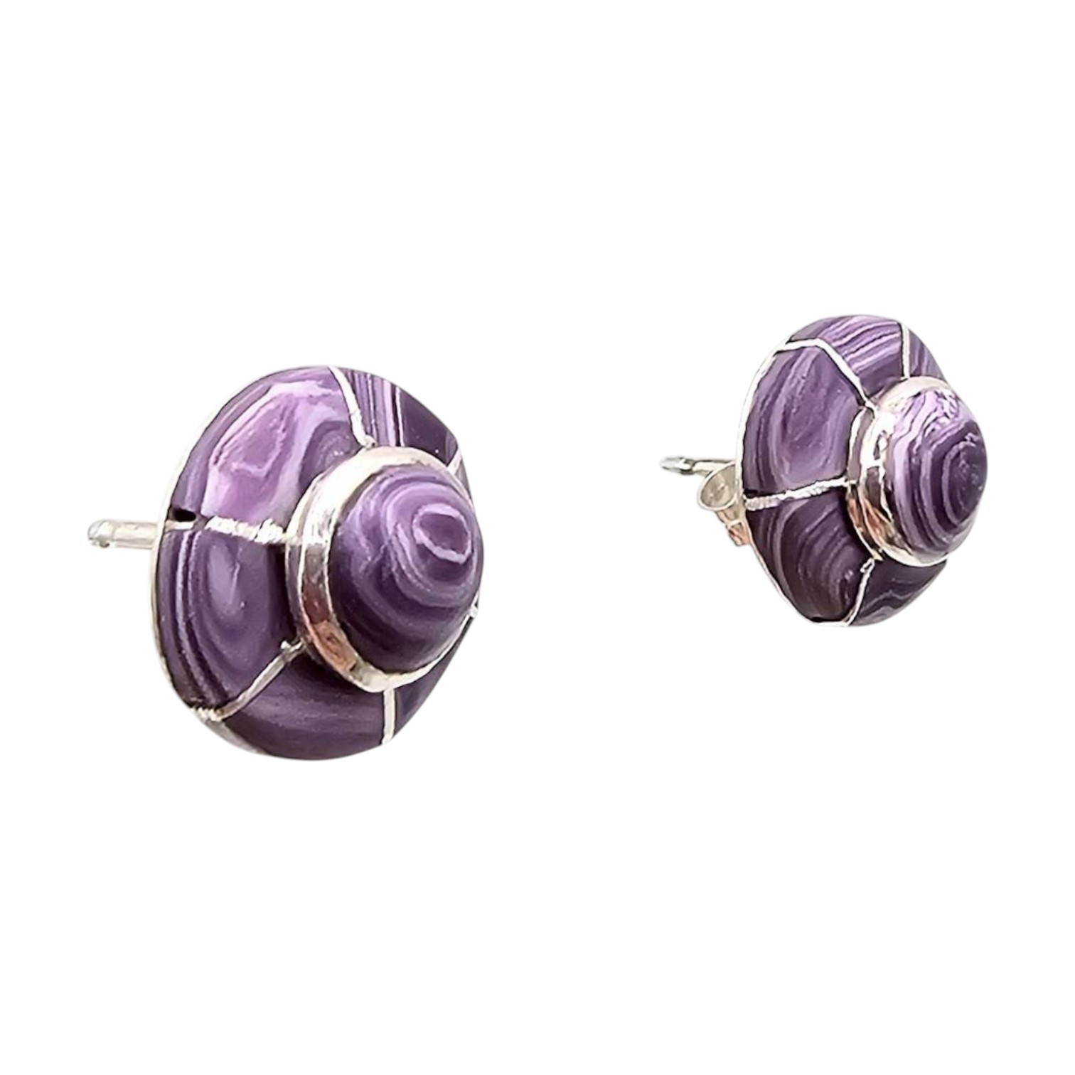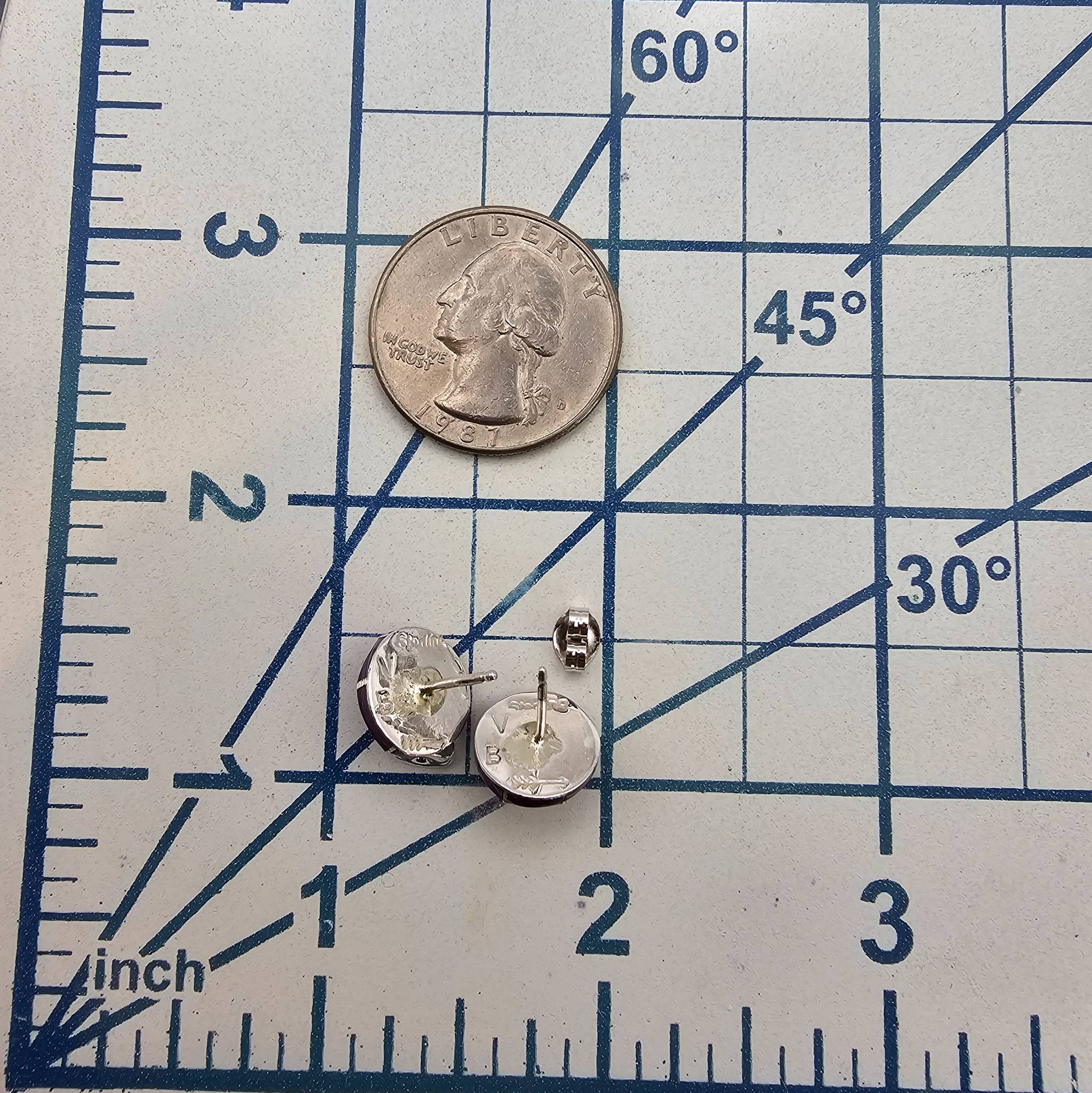 Handmade sterling silver stud earrings by Navajo artisan Fred Manuelito, featuring an intricate circular design with spiney oyster inlay segments. Weighing approximately 2.8 grams, the earrings display artisan hallmarks on the backs. Includes secure butterfly back closures.