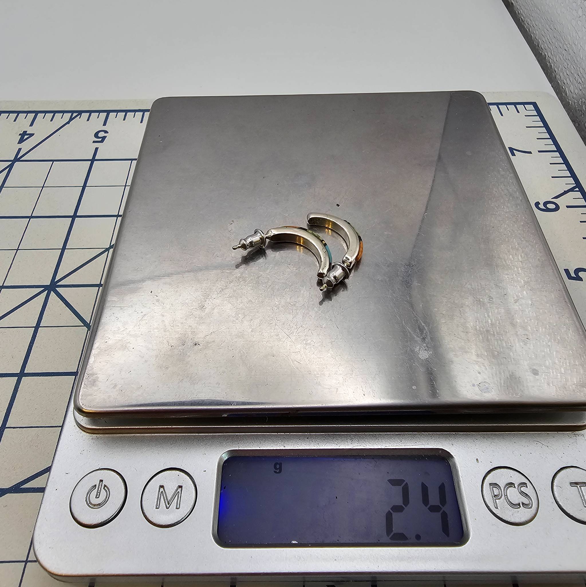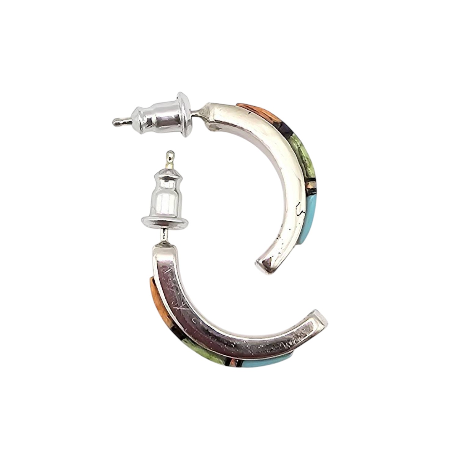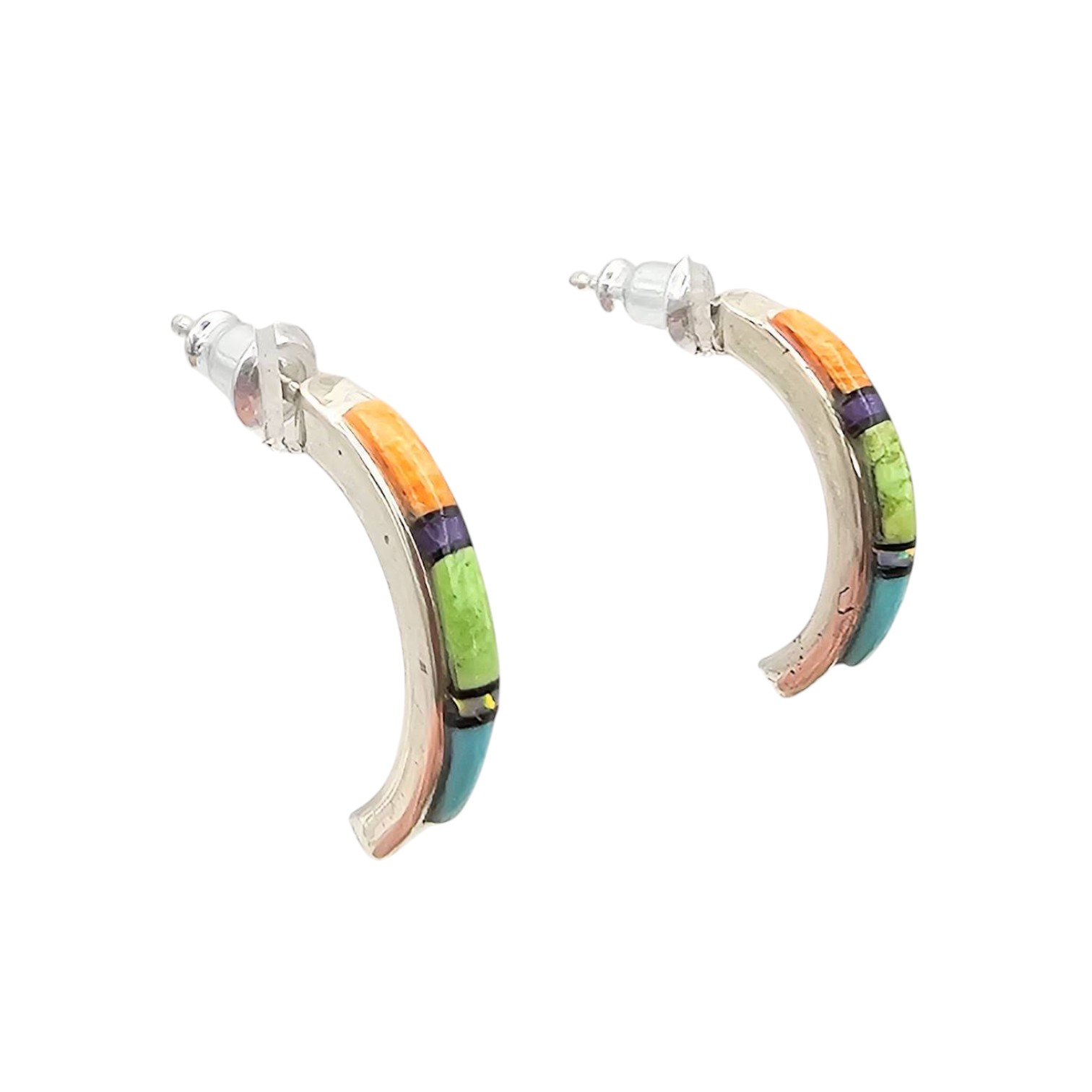 Handcrafted hoop earrings by Navajo artisan Laura Lincoln. Featuring a vibrant multicolor inlay design set in sterling silver. Earrings measure approximately 1 inch in diameter and weigh 2.4 grams as shown. Post-back closures included.