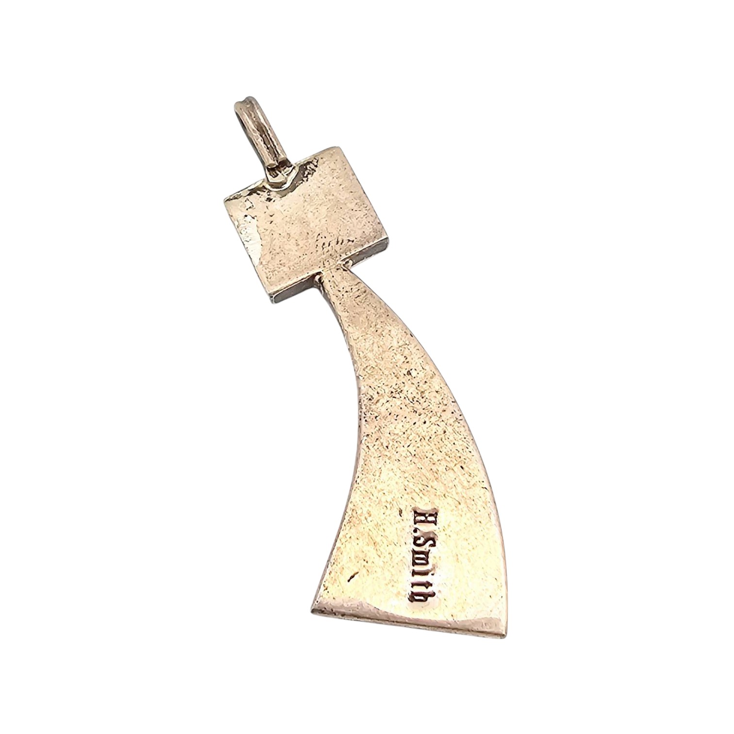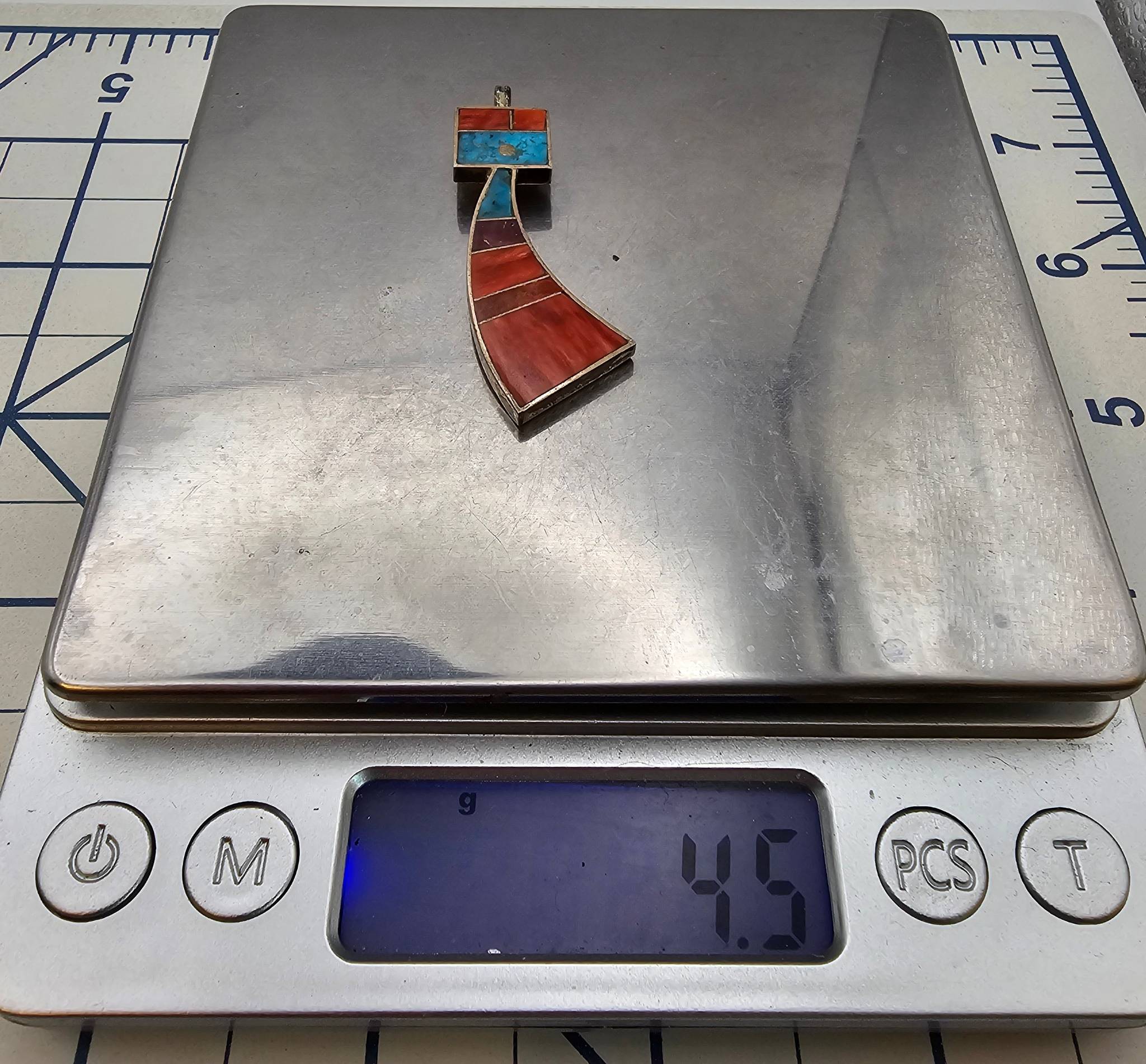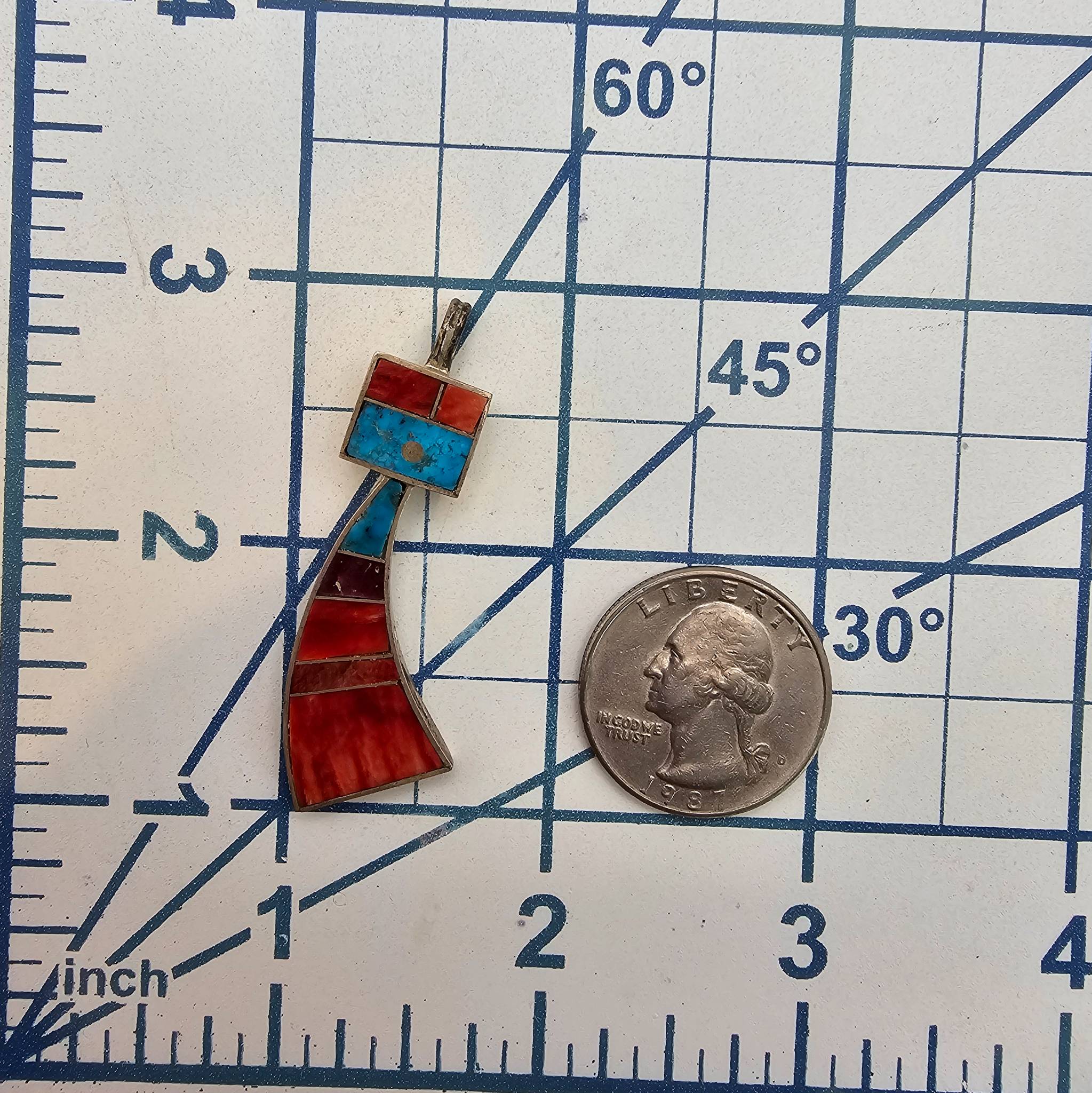 H. Smith Navajo pendant handcrafted in sterling silver with inlaid spiny oyster and turquoise stones. The piece features a modern, curved design with vibrant orange, blue, and red hues. The back is stamped with the artist’s name, “H Smith,” and the total weight is approximately 4.5 grams. Dimensions are shown relative to a U.S. quarter (not included).
