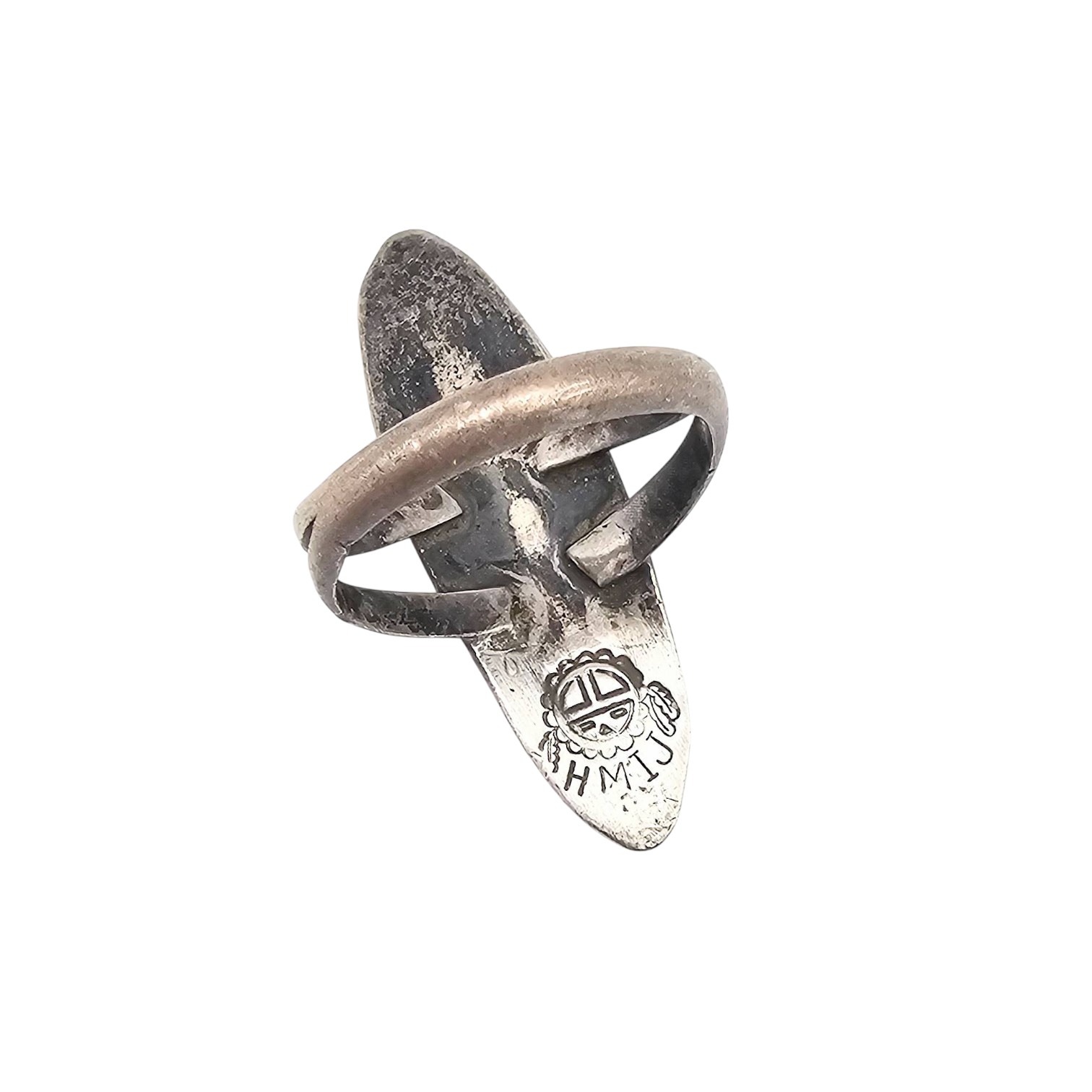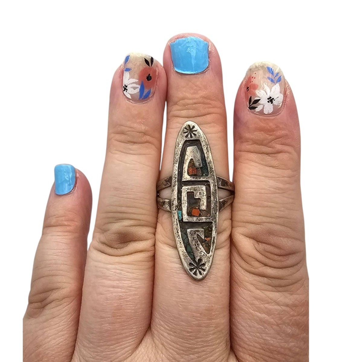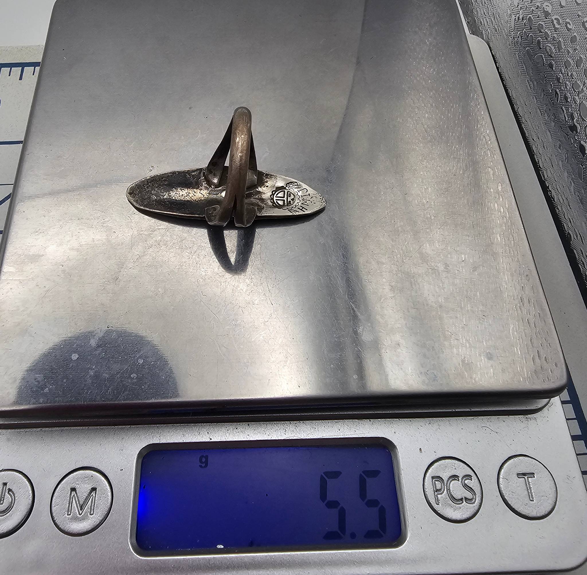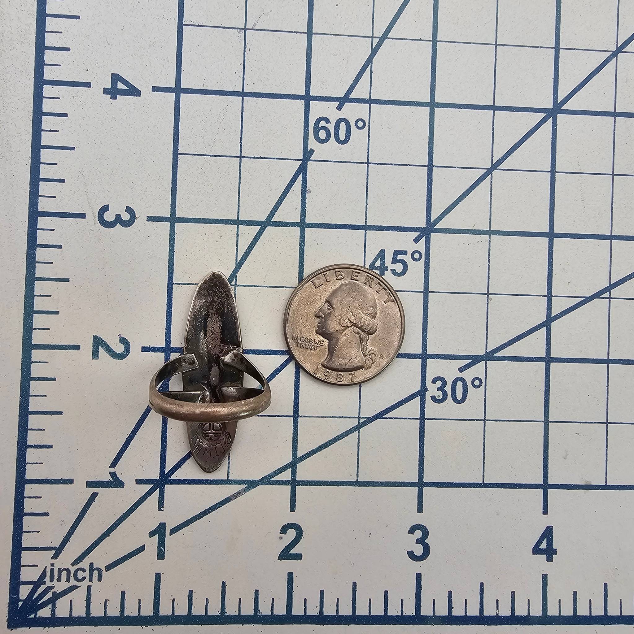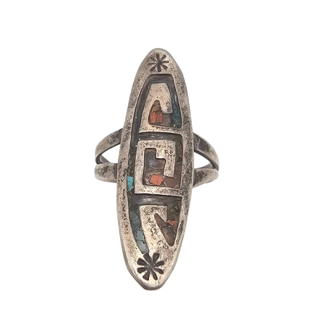 Hopi-inspired sterling silver ring marked by OrtegaShop, featuring coral and turquoise inlays in a geometric design. Ring size 7.5 and weighs approximately 5.5 grams. Some stones are missing, sold as-is. The band has a double-split shank design, and the back shows the artisan’s hallmark.