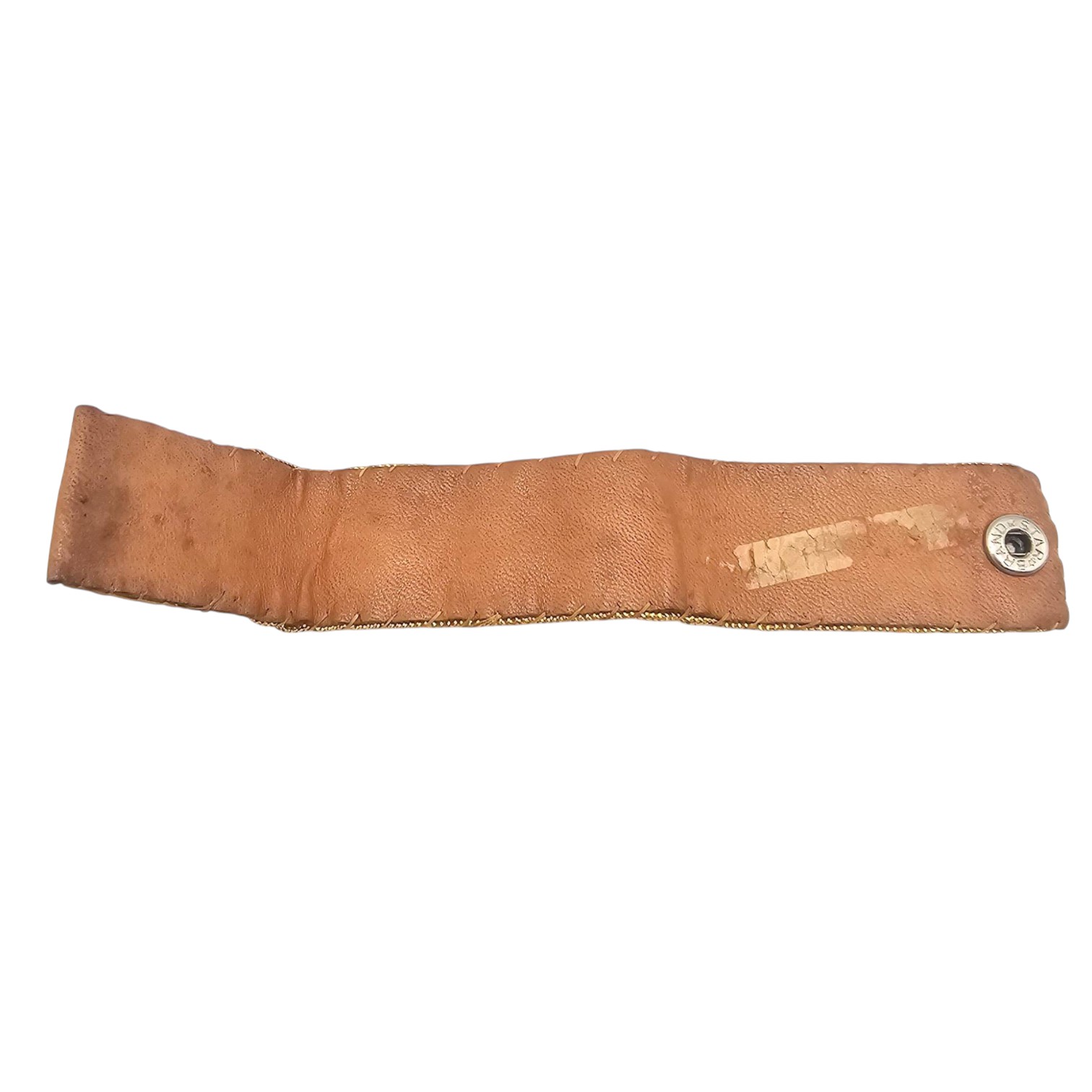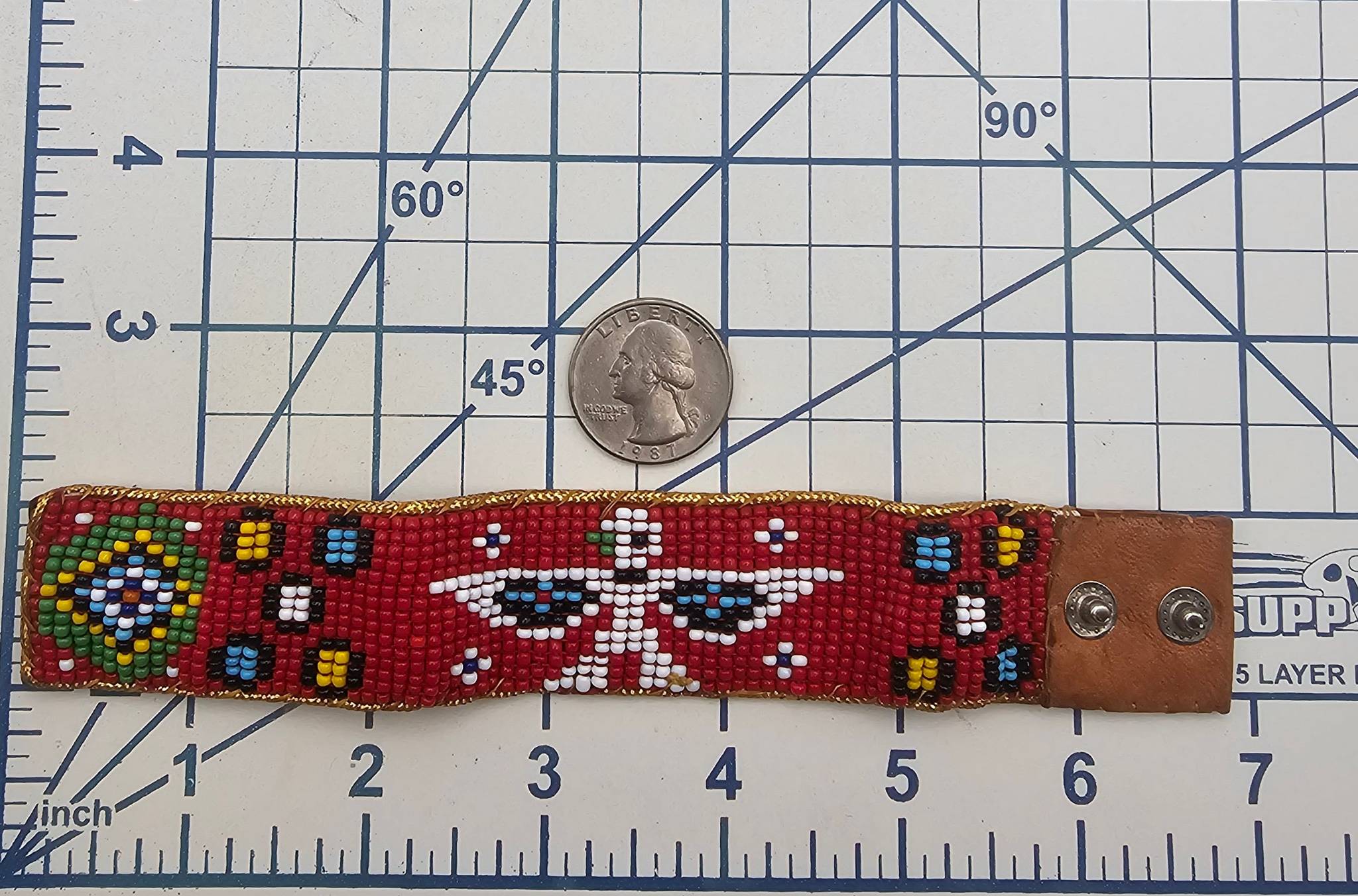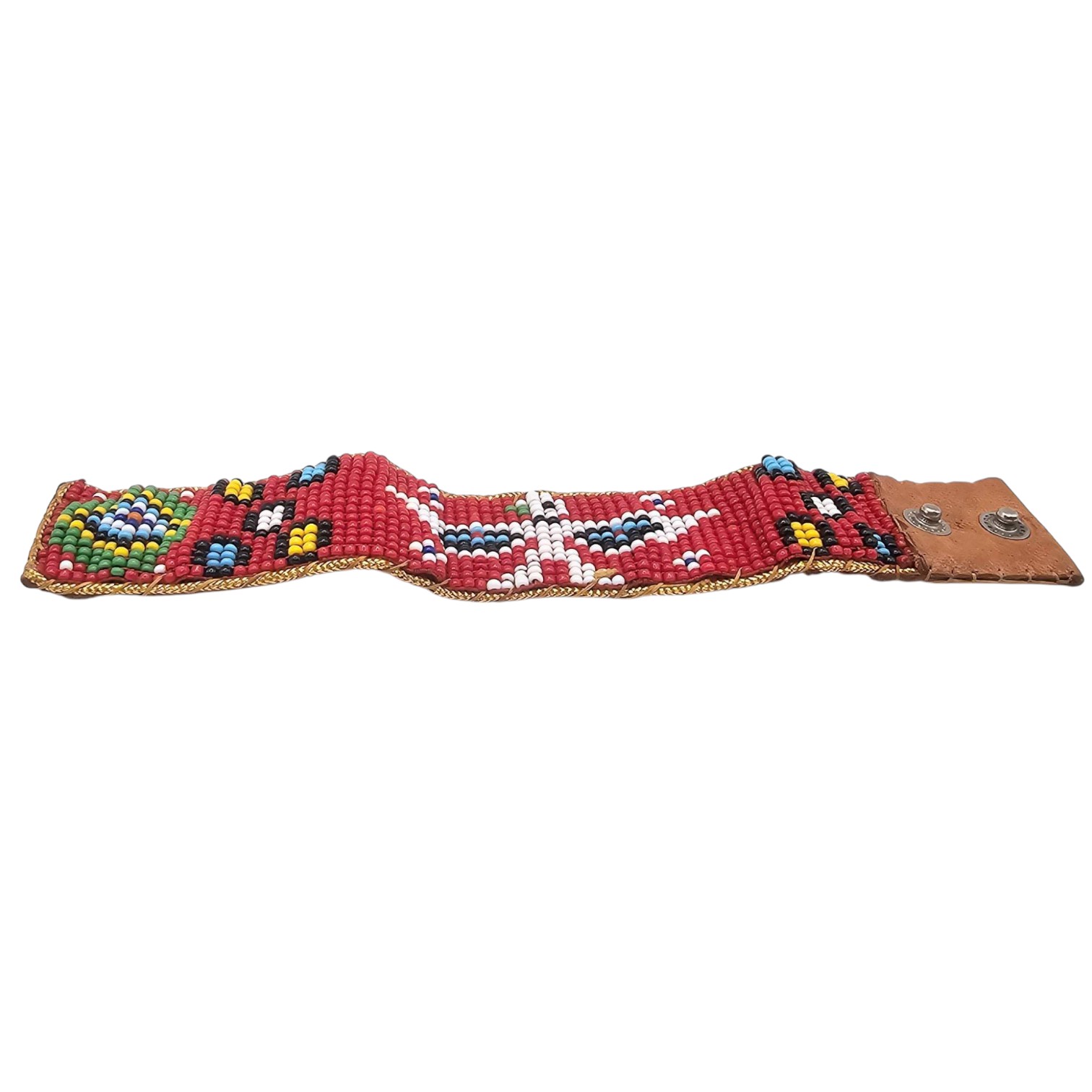 A vintage child’s size bracelet handmade in Idaho during the early-to-mid 1960s. Features a colorful bead design with a prominent white Thunderbird motif against a red background. Leather backing with two metal snap closures. Measures approximately 5.5 inches in length (unfolded).