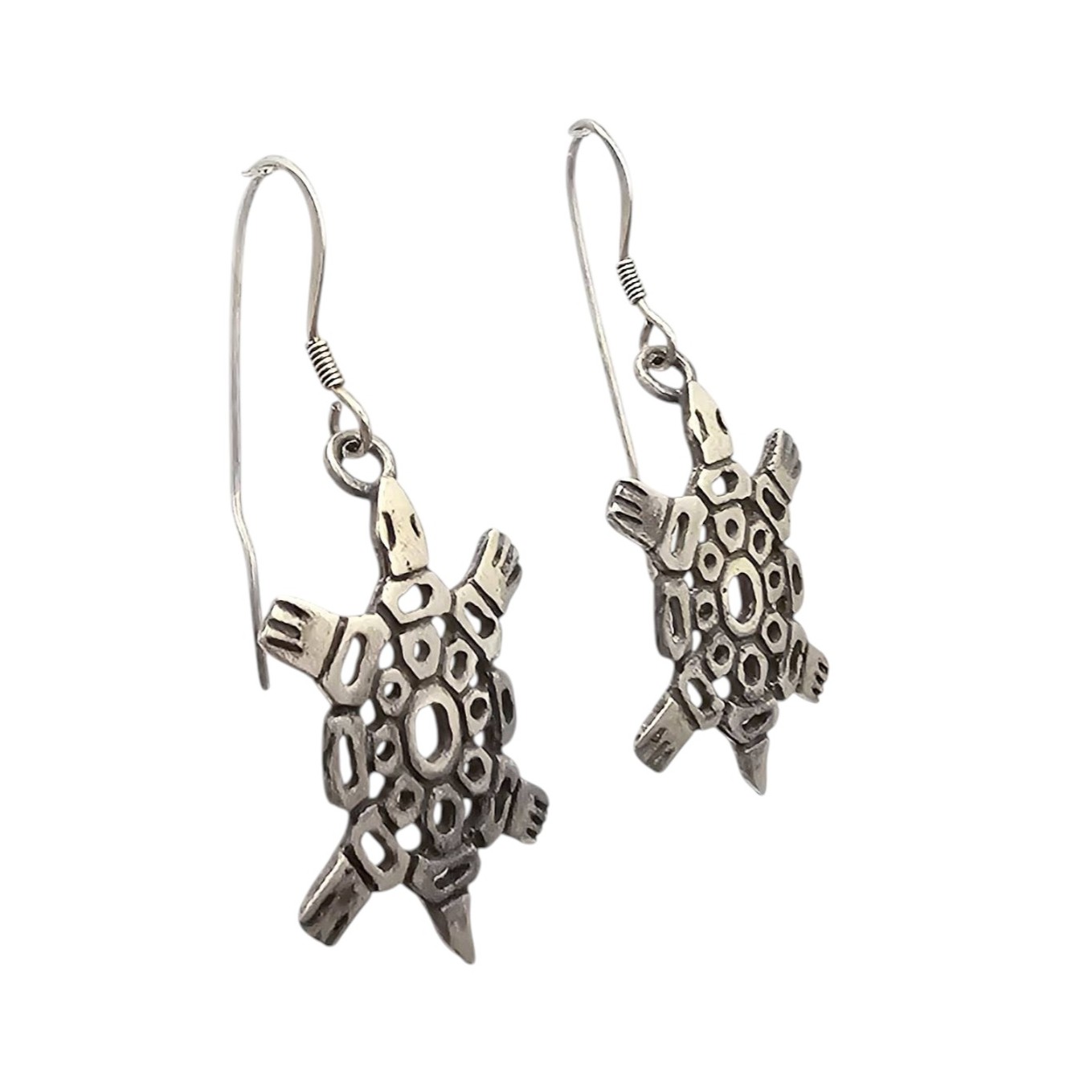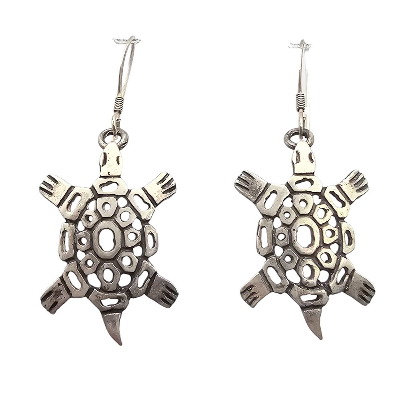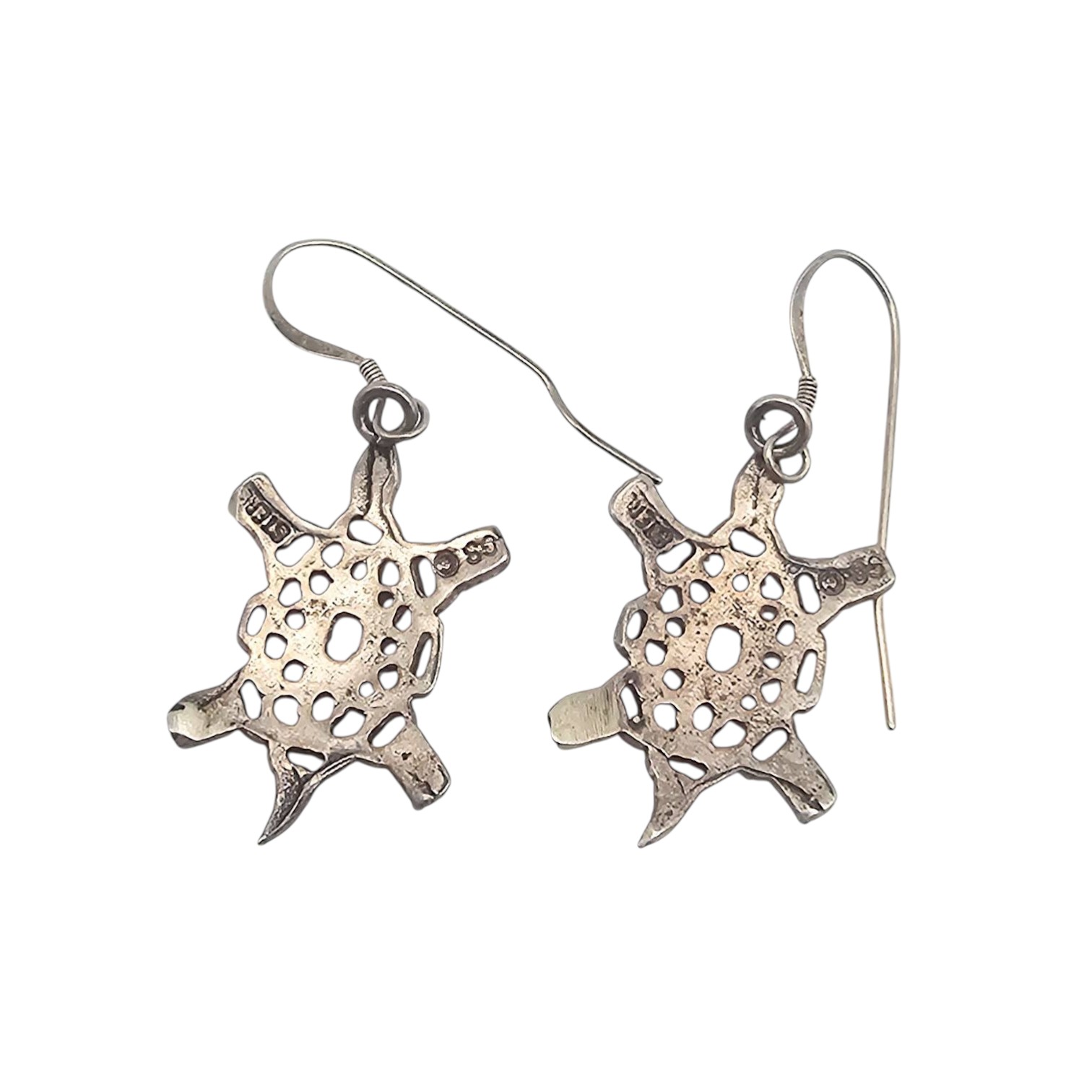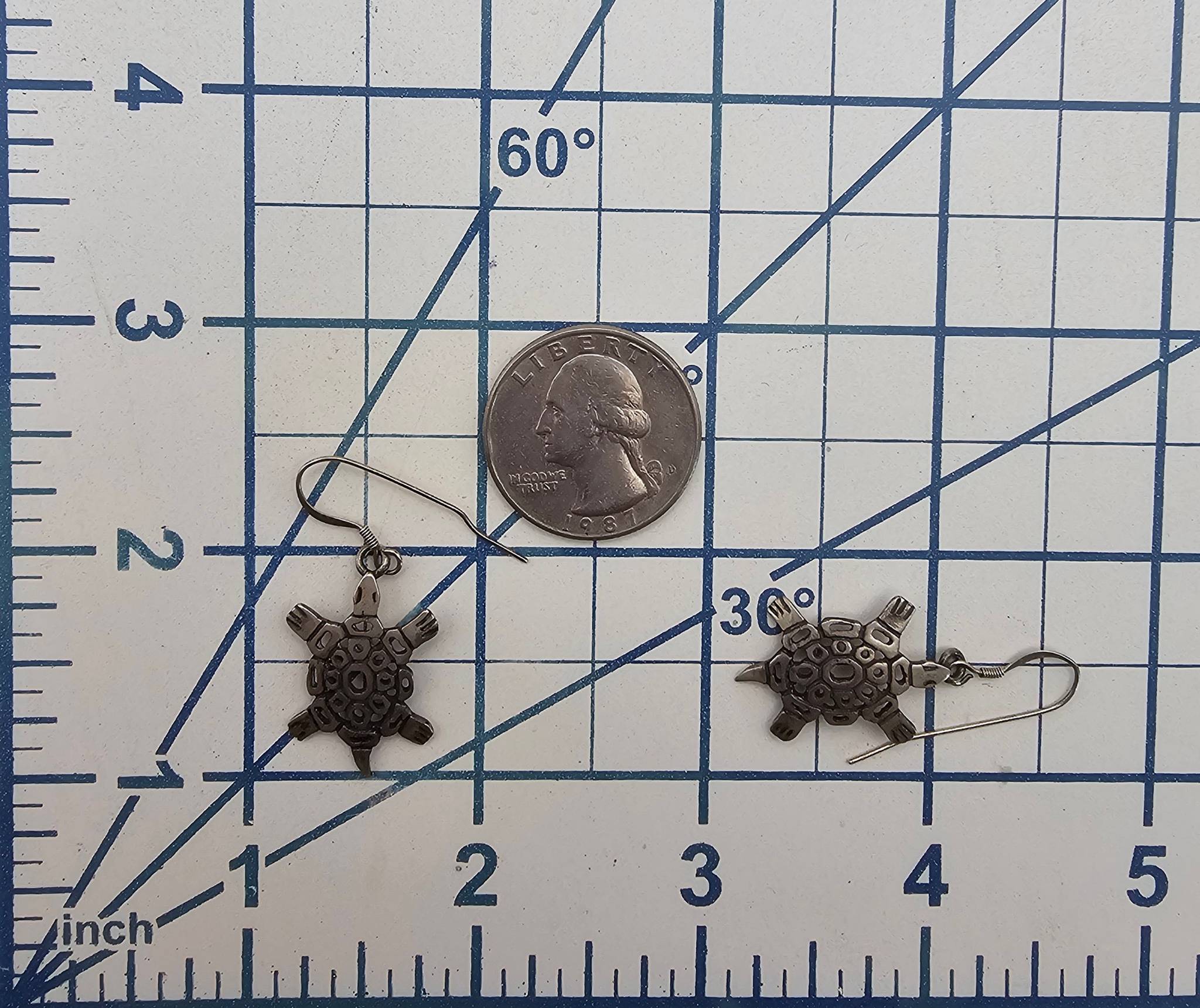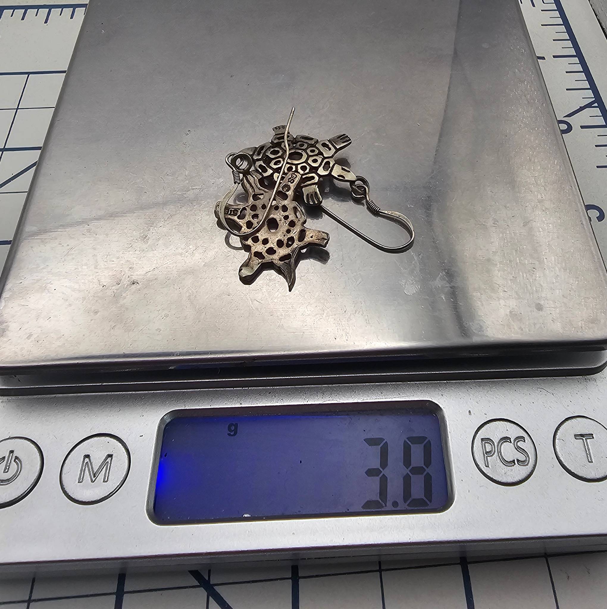 Sterling silver turtle drop earrings by Navajo artisans Glenn and Irene Sandoval. The earrings feature a turtle design with intricate cutout patterns. They weigh 3.8 grams in total as shown on the scale, and measurements are provided against a ruler backdrop. These earrings are crafted with hook ear wires for wearing.
