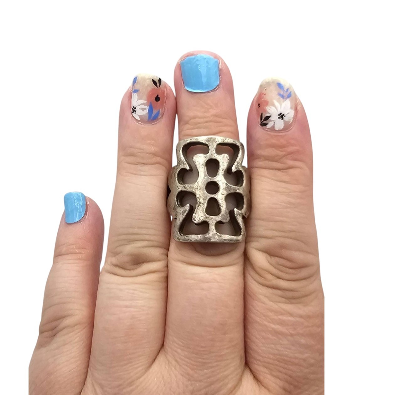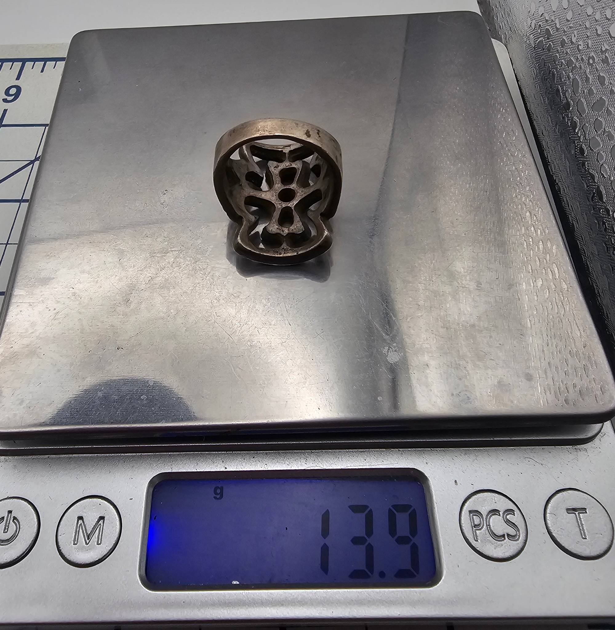 The ring is a size 7 and weighs approximately 13.9 grams. Ideal as a statement piece, it has a durable build and timeless aesthetic.