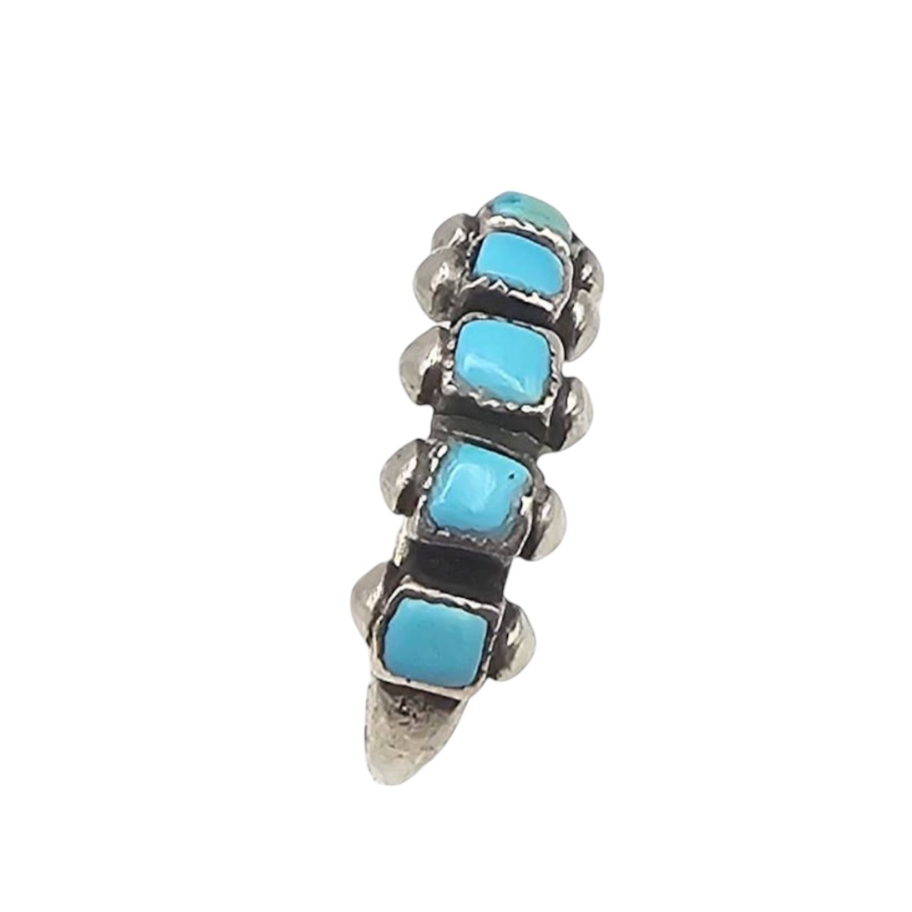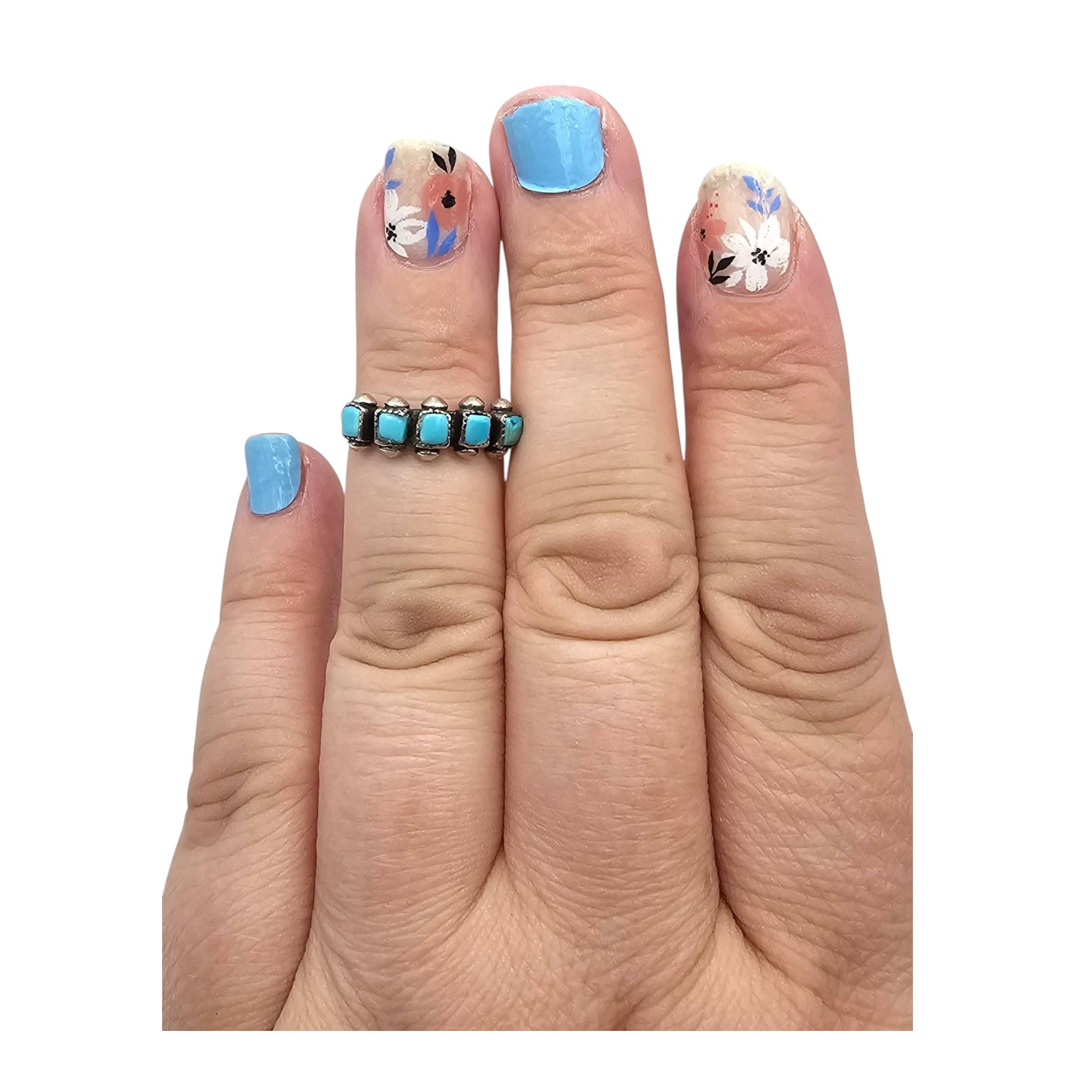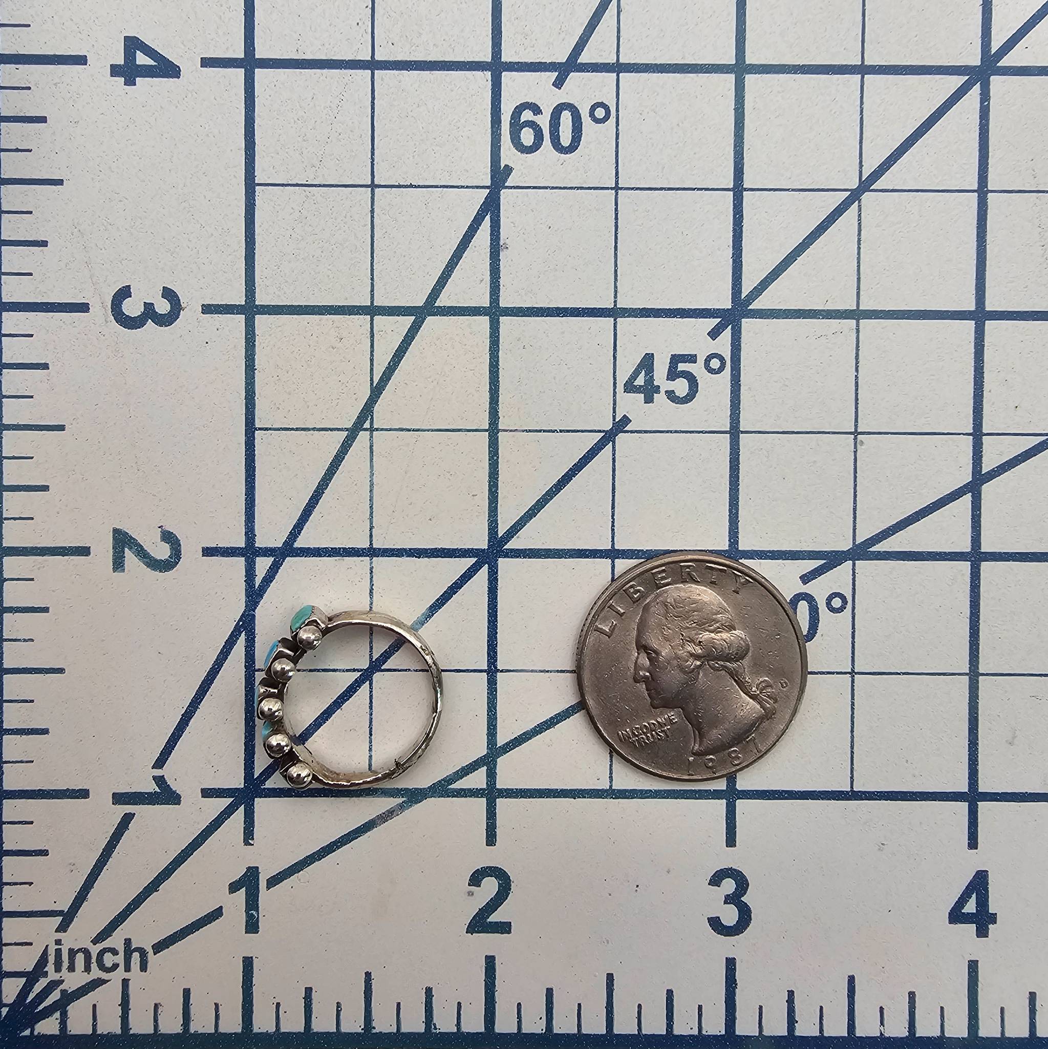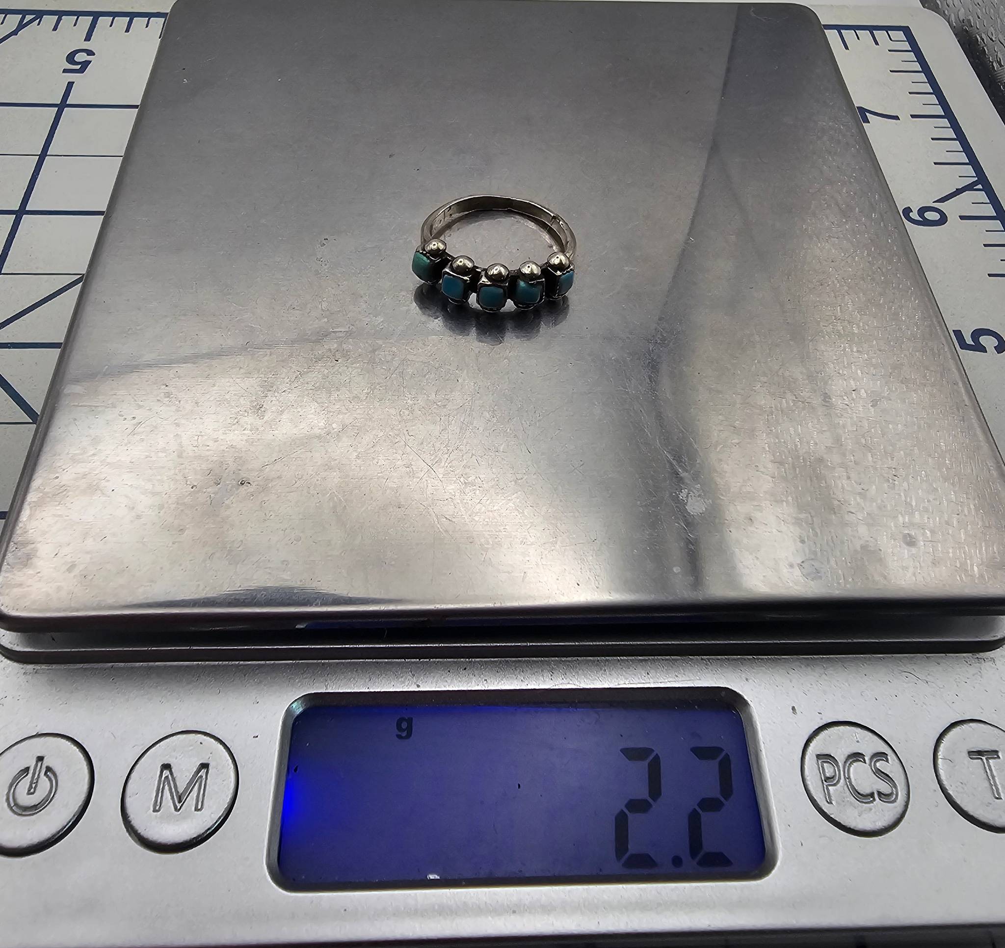 Native turquoise ring crafted from sterling silver. Features five rectangular turquoise stones in bezel settings with small silver embellishments. Ring size is 4.5, and weight is approximately 2.2 grams. Simple yet elegant design suitable for various occasions.