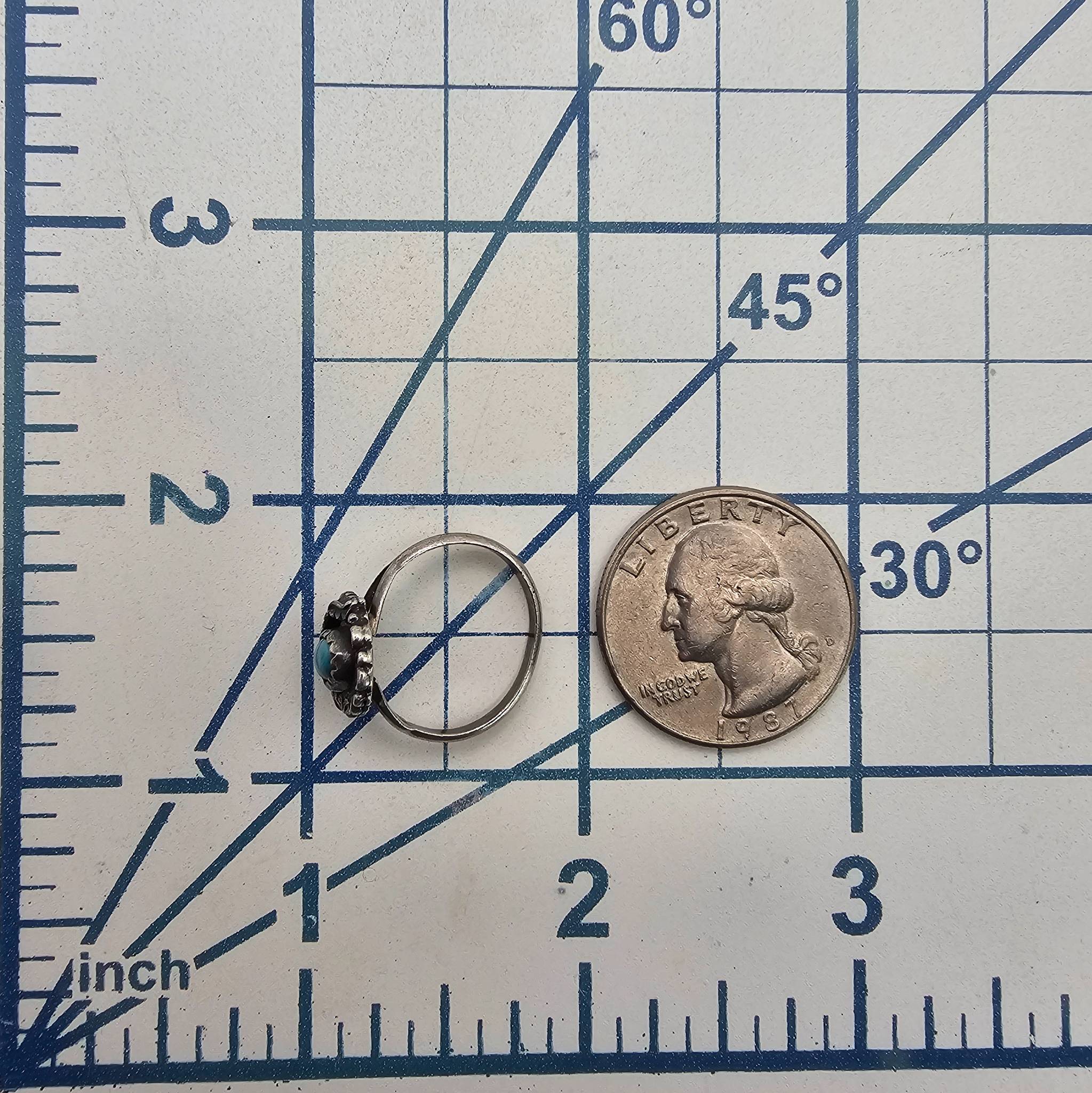 Navajo handcrafted sterling silver ring featuring a turquoise stone as the centerpiece. It is shown next to a ruler and US quarter for scale. The condition of the item appears consistent with crafted silver jewelry. Size 4.75