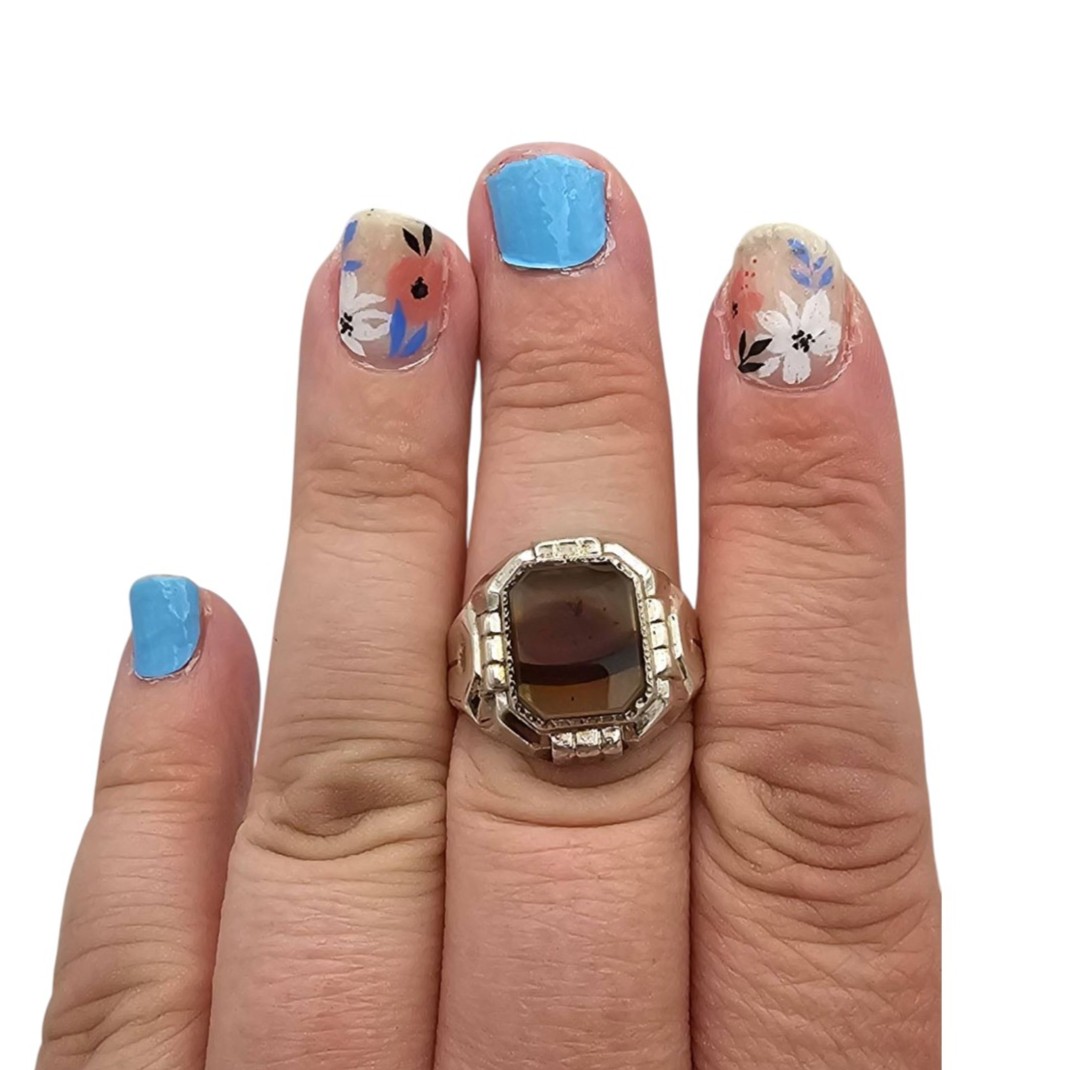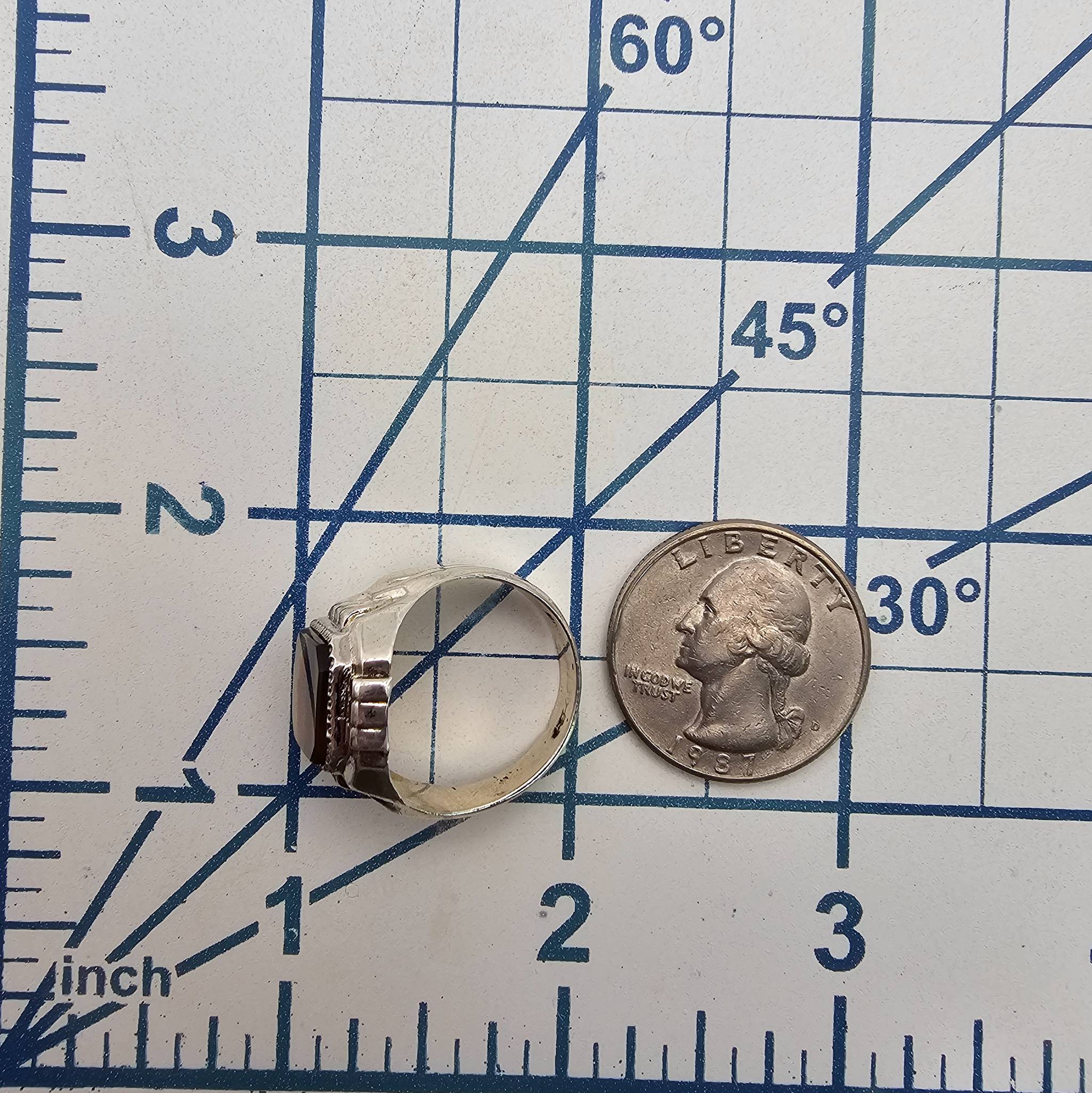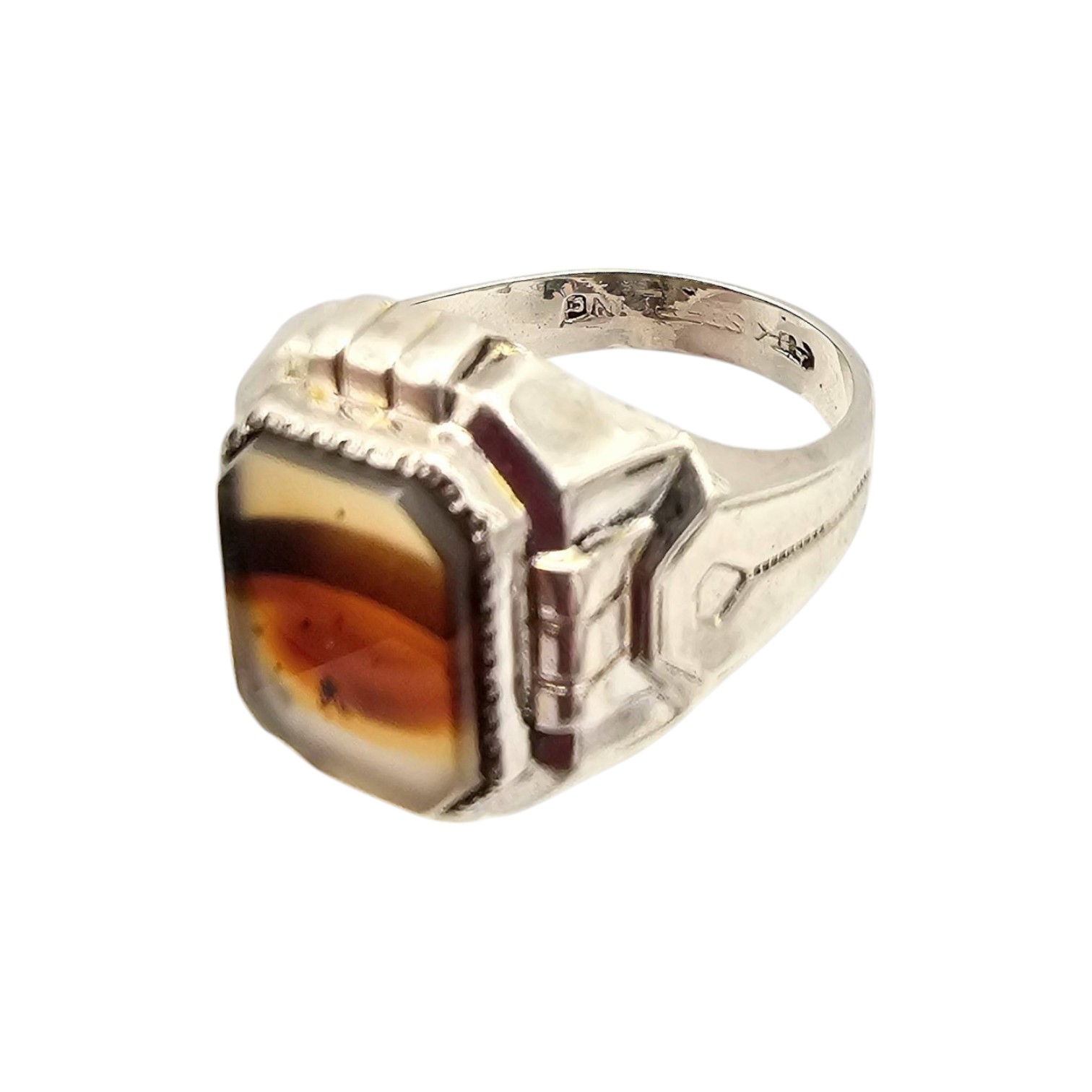 Sterling silver ring featuring a Native design with a polished agate stone. The ring is marked ‘ ’ for sterling silver and is a size 9. Includes a sturdy band and decorative accents around the bezel.