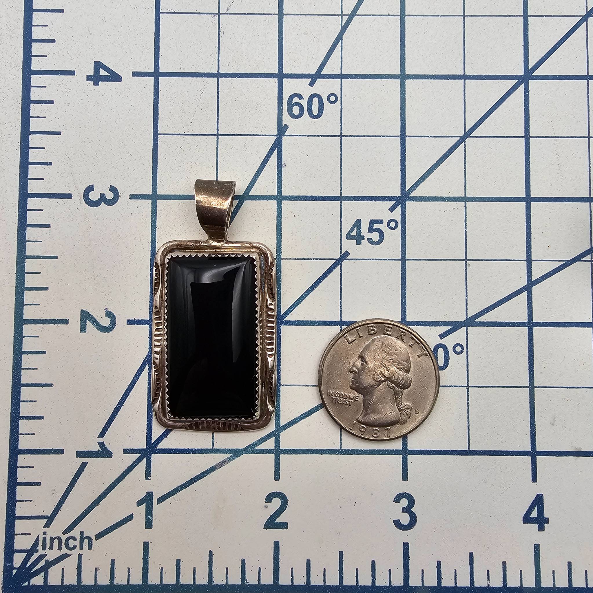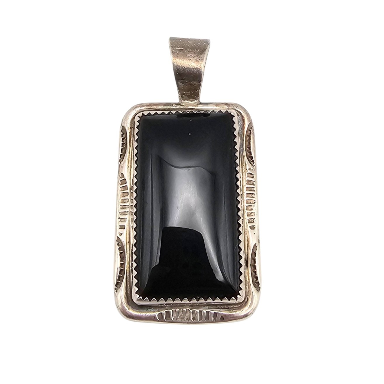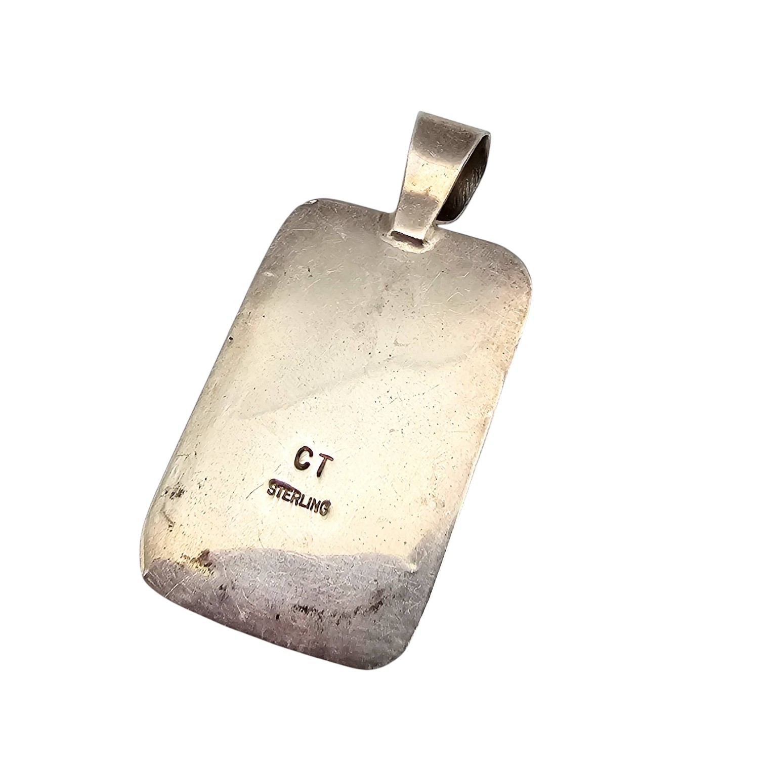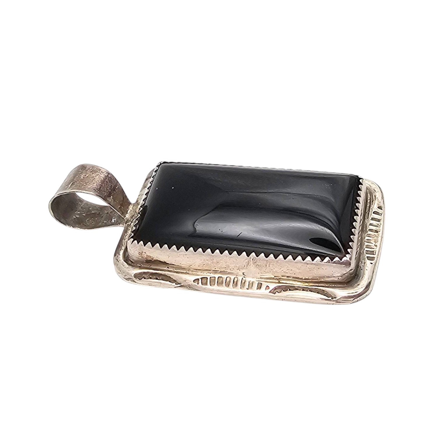 Navajo Calvin Tom solid sterling silver (. ) stamped pendant featuring a rectangular black onyx stone. The pendant has an artisan-crafted design and is stamped ‘CT’ and ‘STERLING’ on the back. It weighs 13.9 grams and measures approximately 2 inches in height including the bail. Elegant handcrafted details throughout.