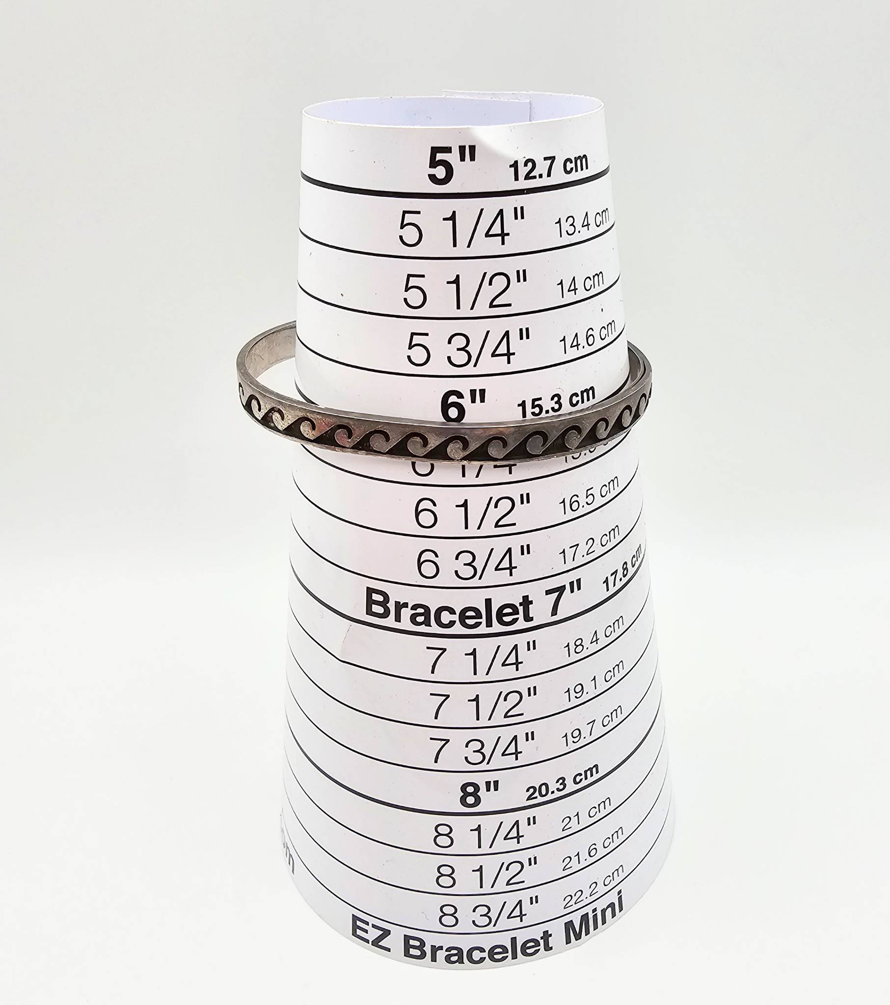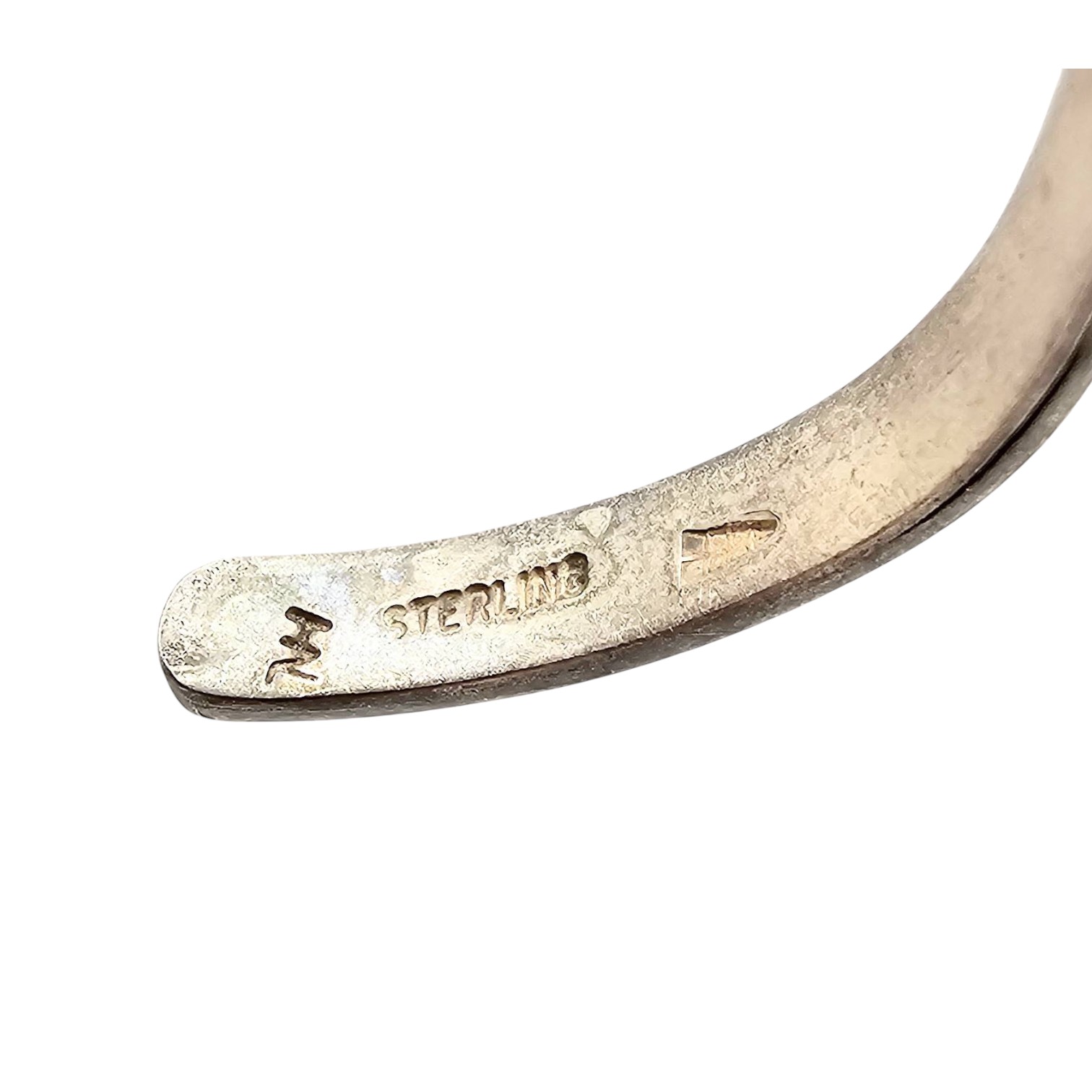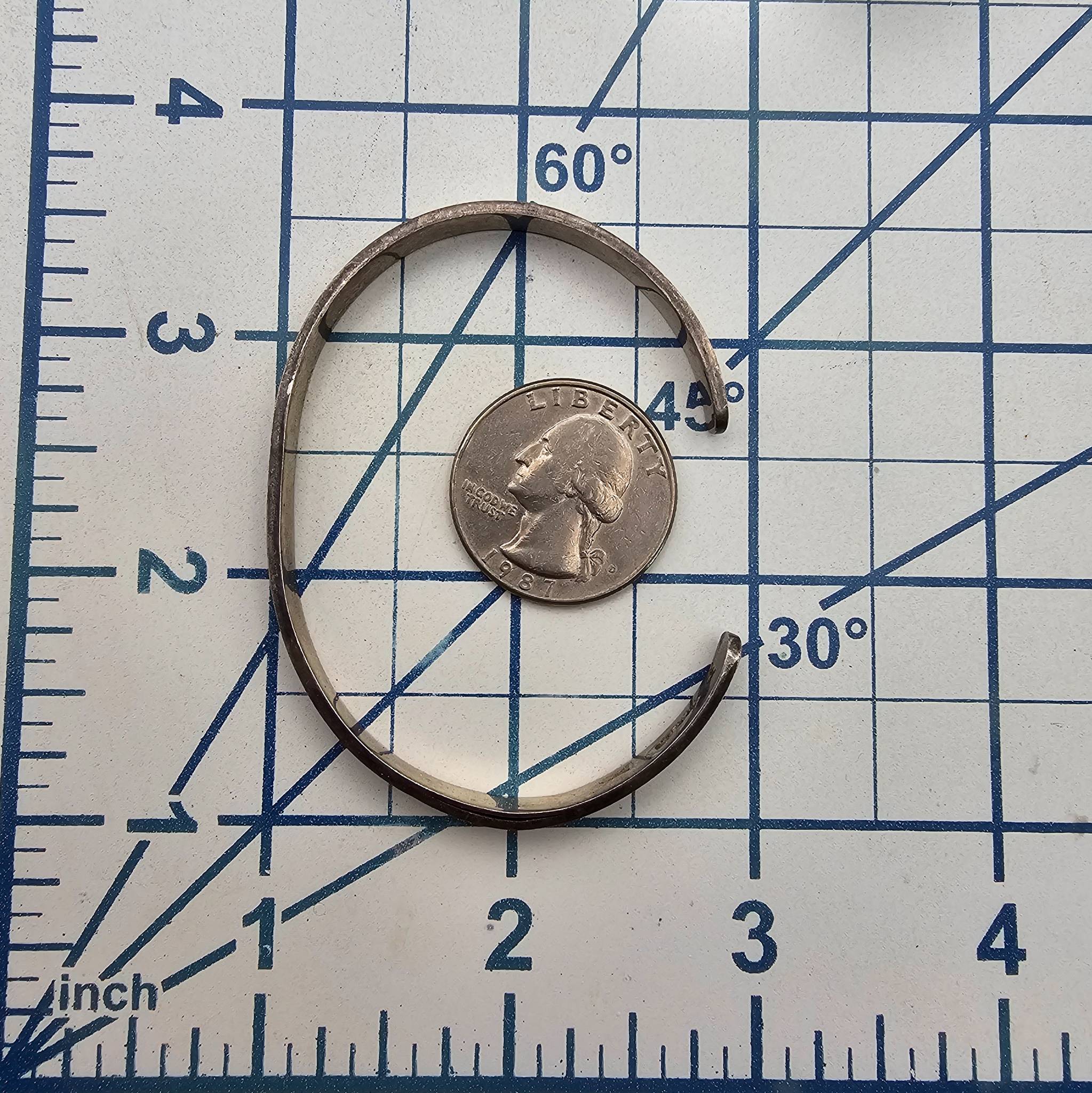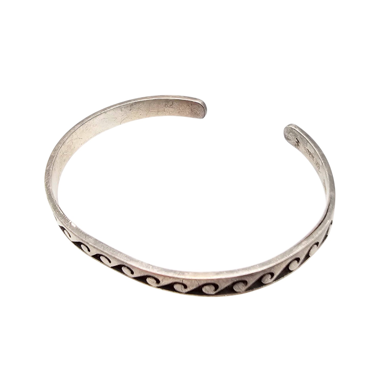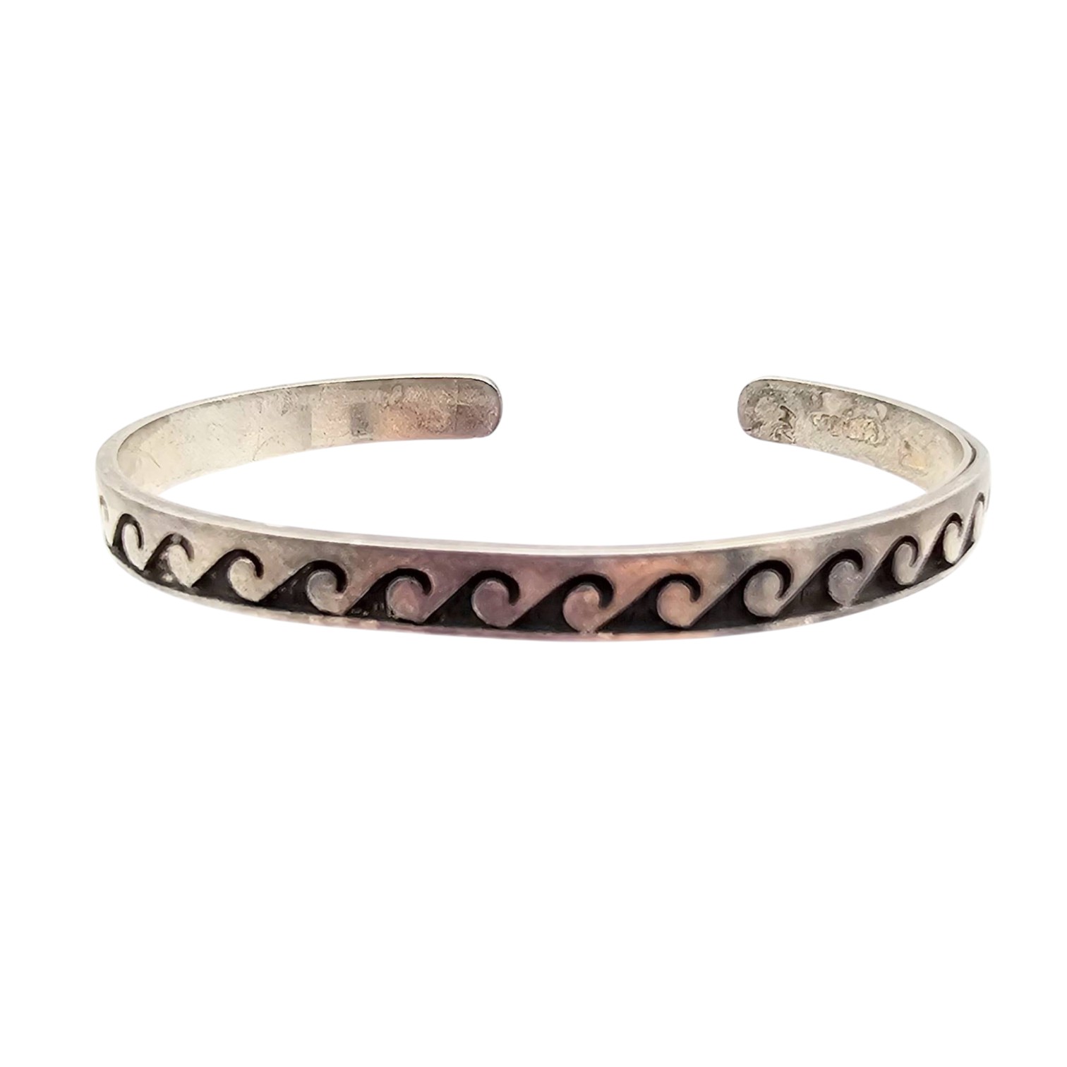 Sterling silver cuff bracelet featuring a wave design motif, attributed to artists Walter Polelonema or Raymie Namingha, with a ‘STERLING’ hallmark and artist’s mark. Weighs 12.3g and is approximately 6 inches in circumference, measured on a bracelet sizer.