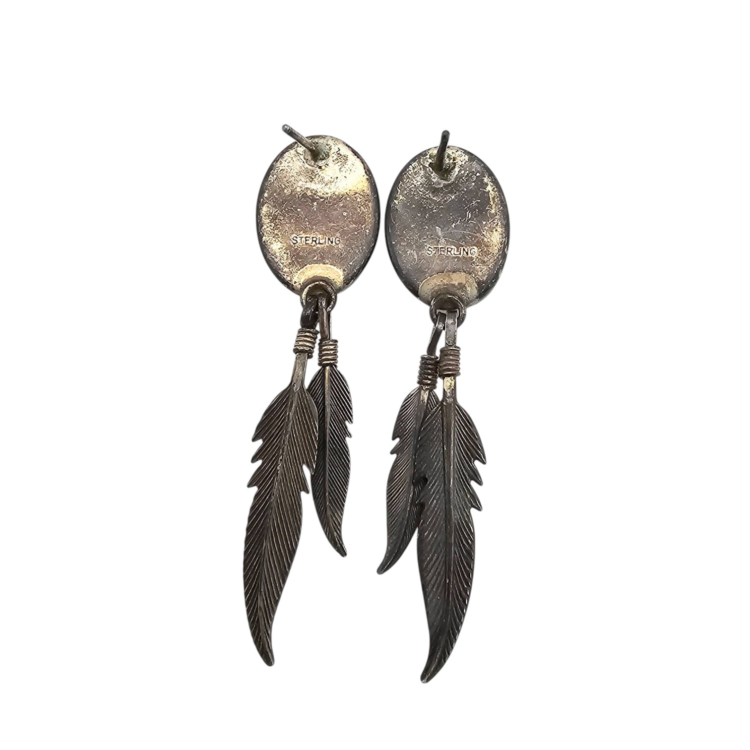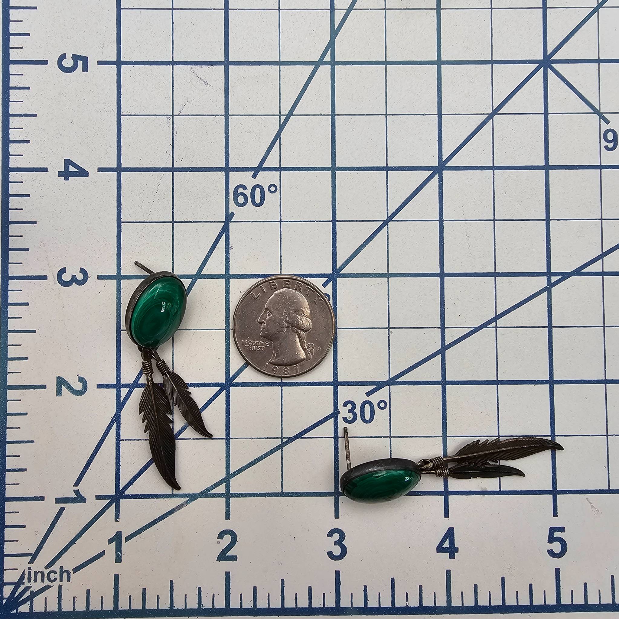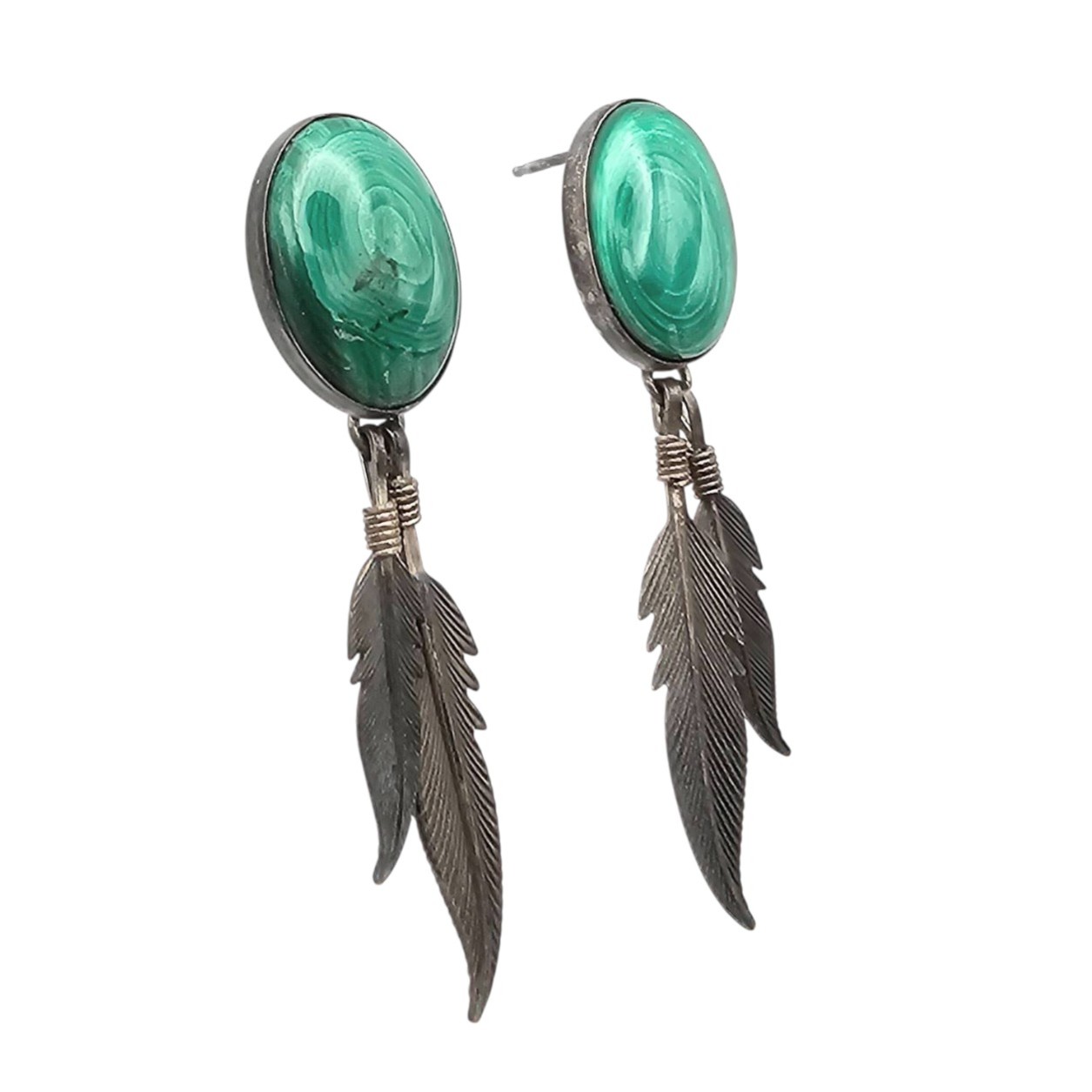 Navajo malachite drop earrings crafted from sterling silver. The earrings feature vibrant malachite cabochons and two intricately designed silver feathers per earring. Marked “Sterling” on the reverse. Total weight is 9.7g. The earrings are post style with an approximate length of 2-3 inches.