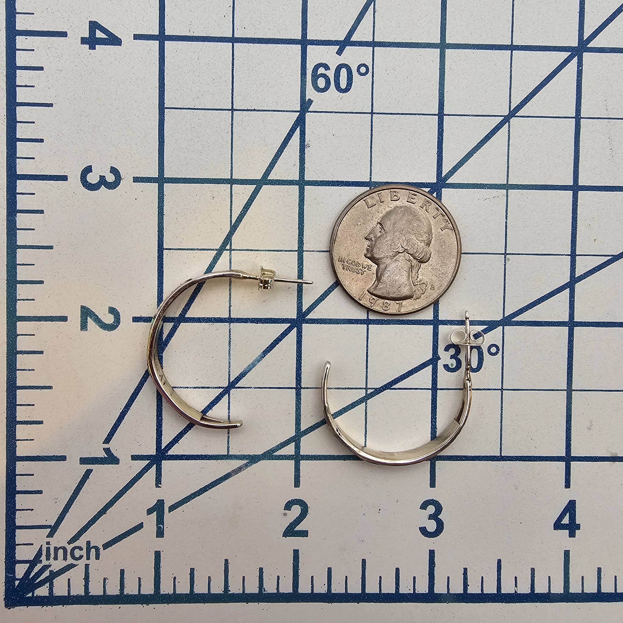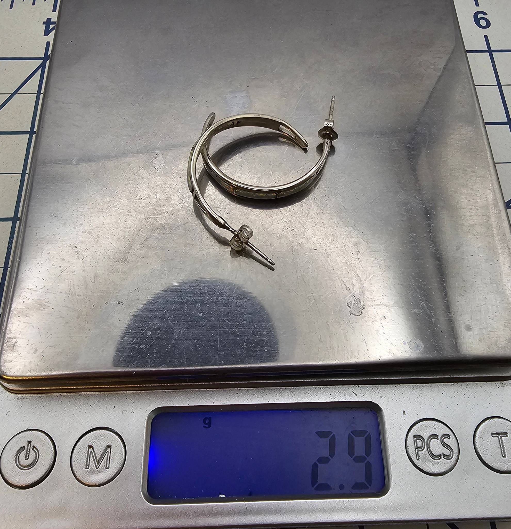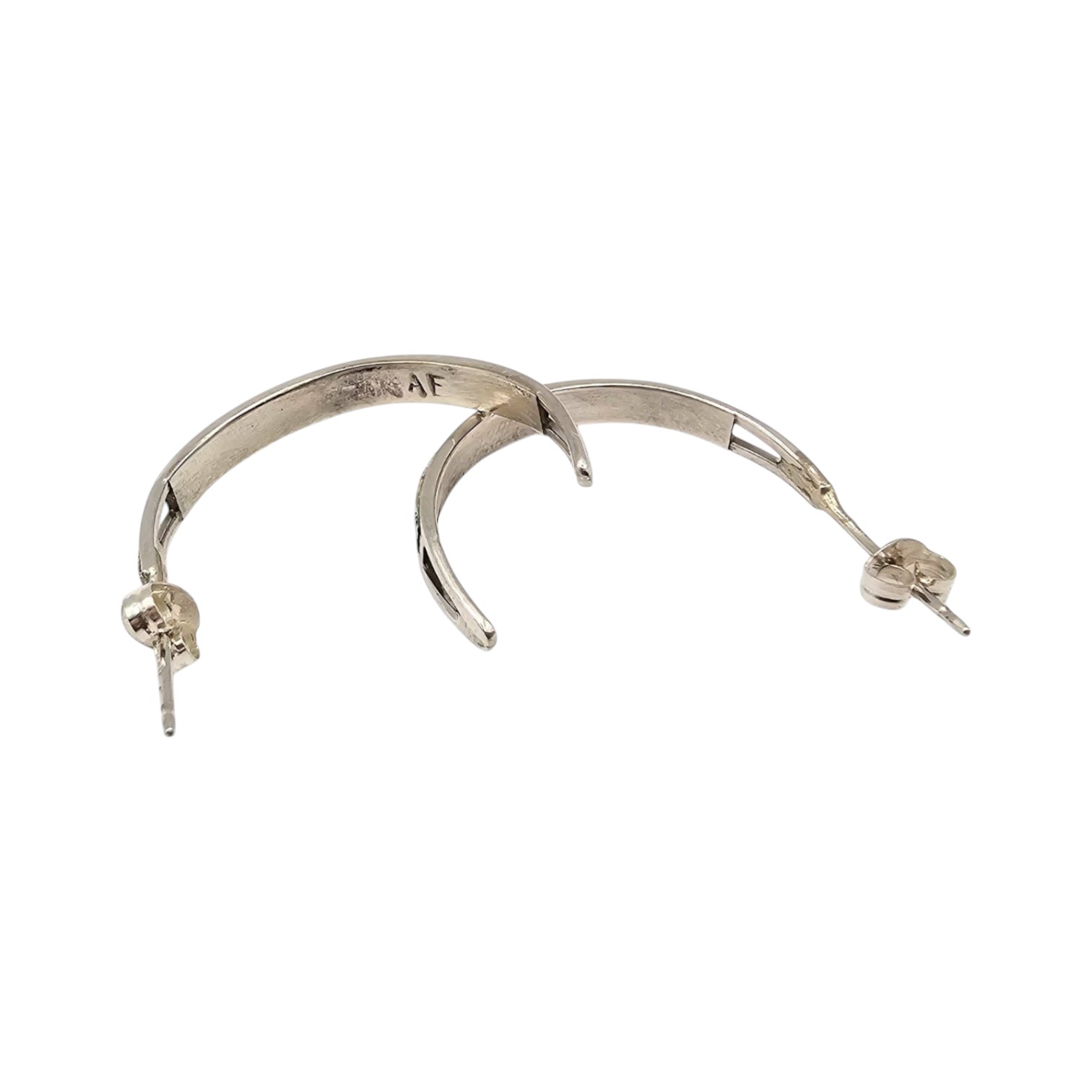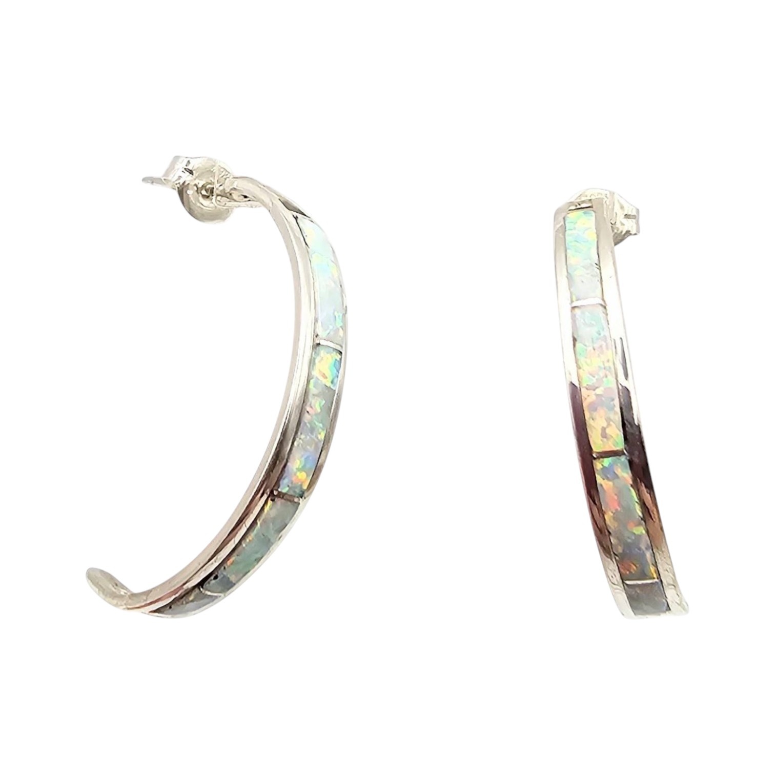 Handmade sterling silver hoop earrings by Navajo artisan Jamie Johnson. These earrings feature inlaid opal accents and stud backs for secure wear. The total weight of the earrings is 2.9 grams.