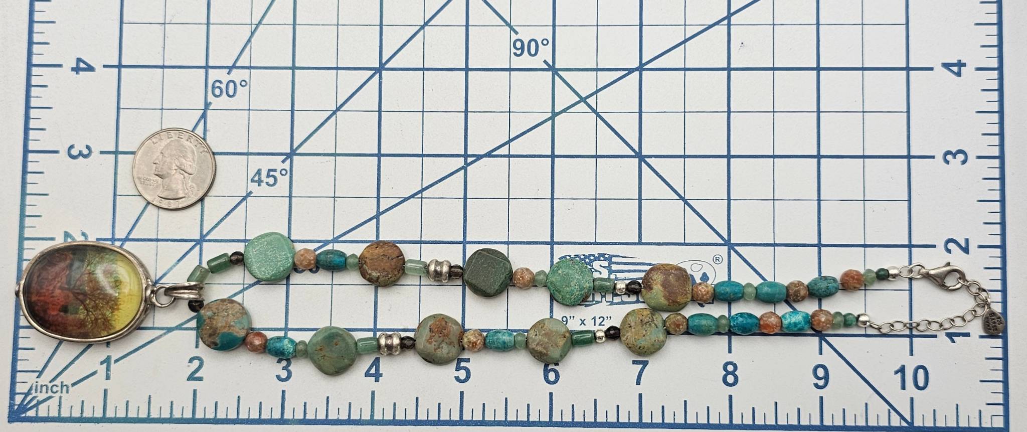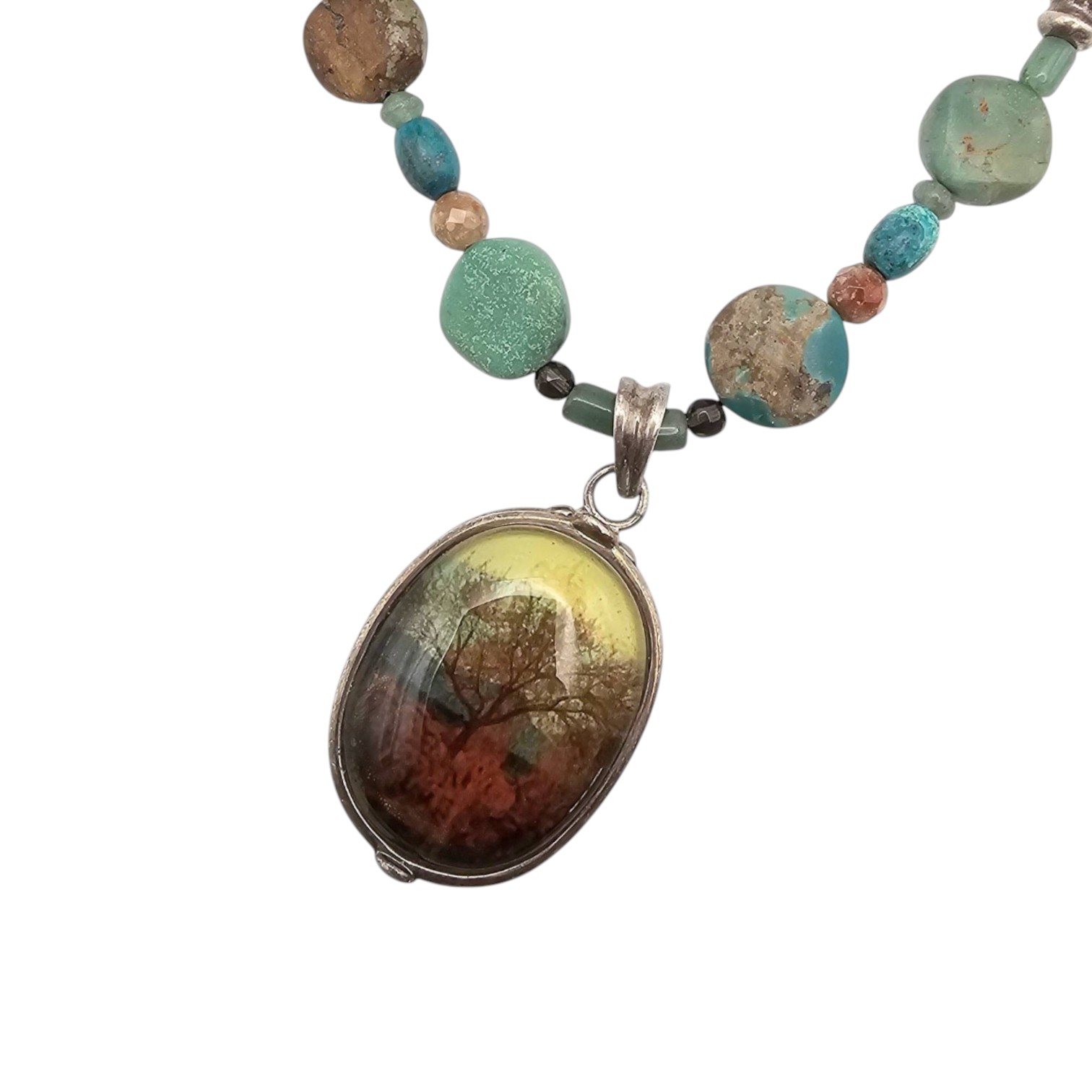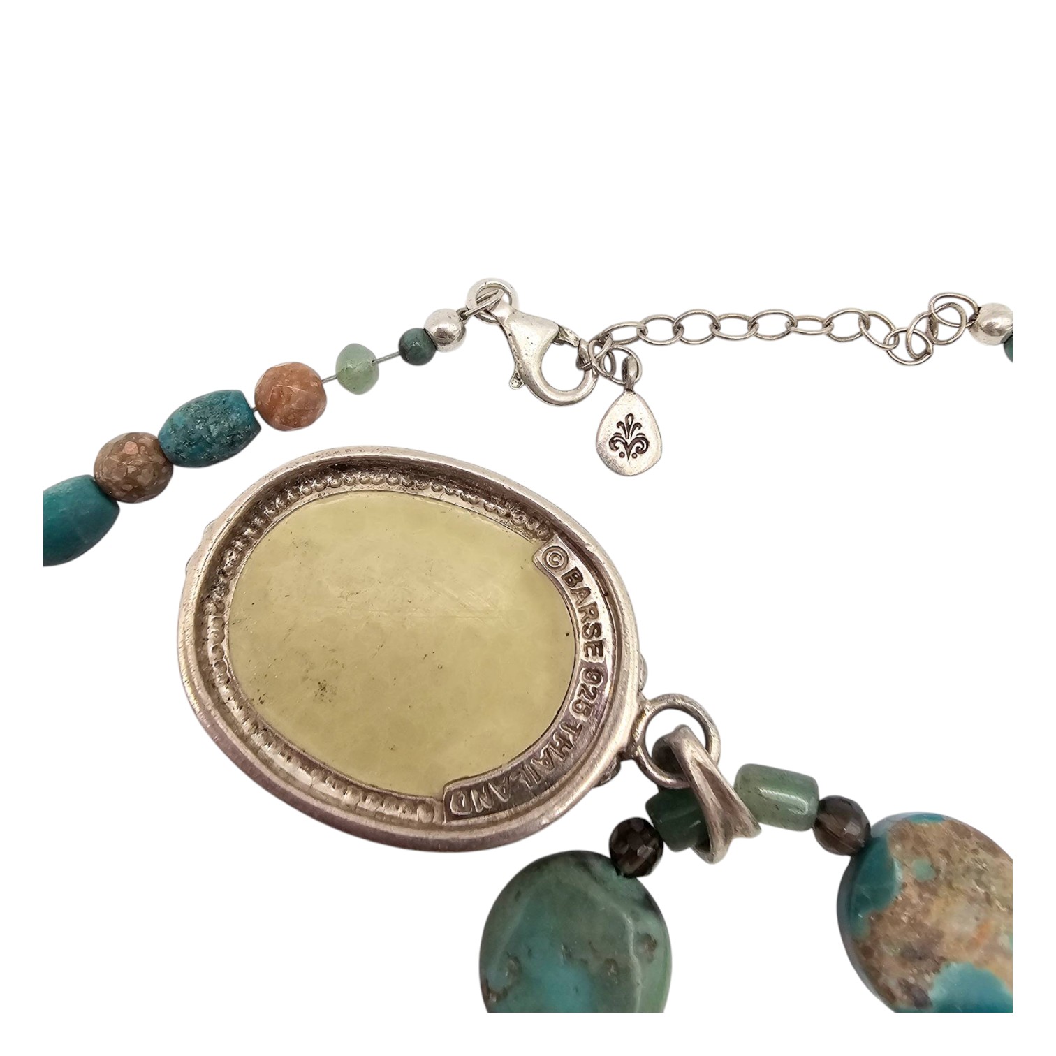 A Barse sterling silver necklace featuring a Southwestern design. The necklace is crafted with turquoise stones and other semi-precious beads, complemented by a large, colorful oval pendant set in sterling silver. Measures approximately 18 inches long with an adjustable clasp for fit. The pendant is hallmarked ‘BARSE’ and made of fine materials consistent with the brand’s quality.