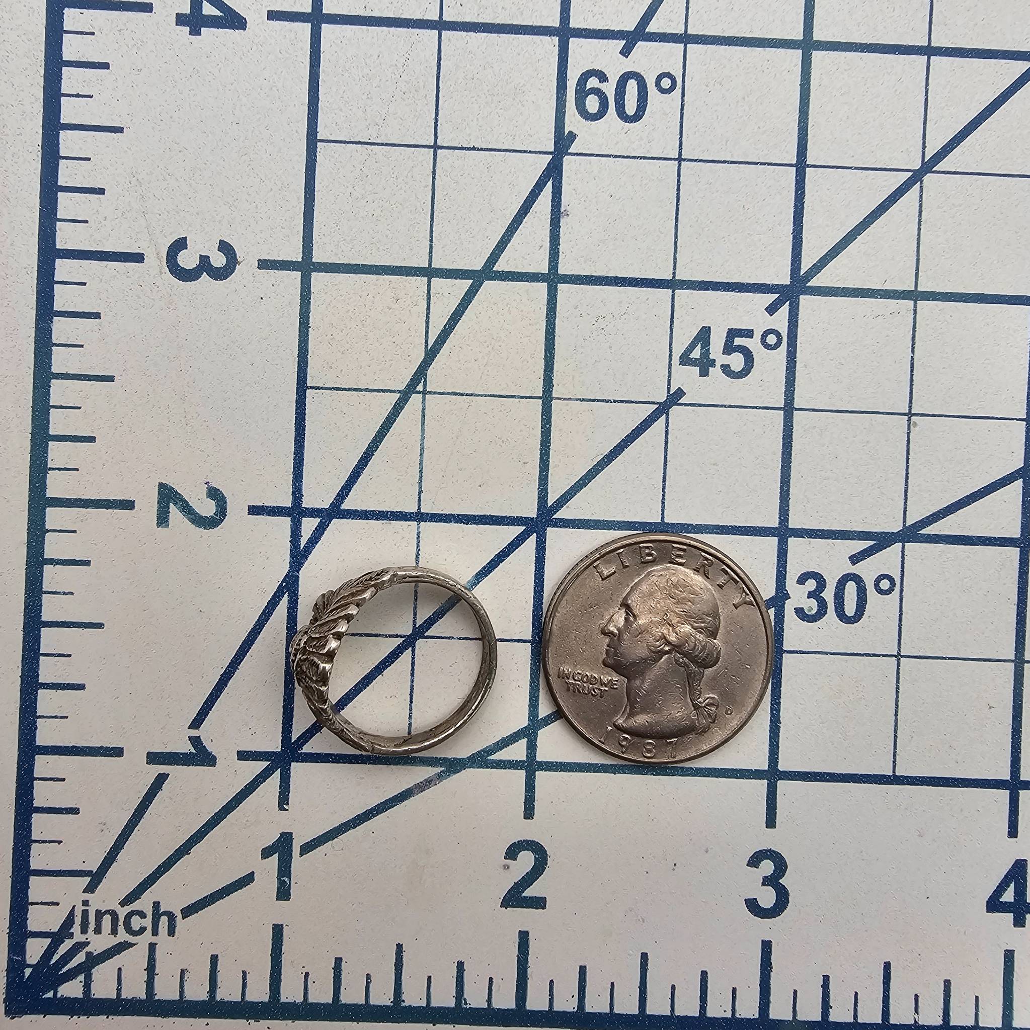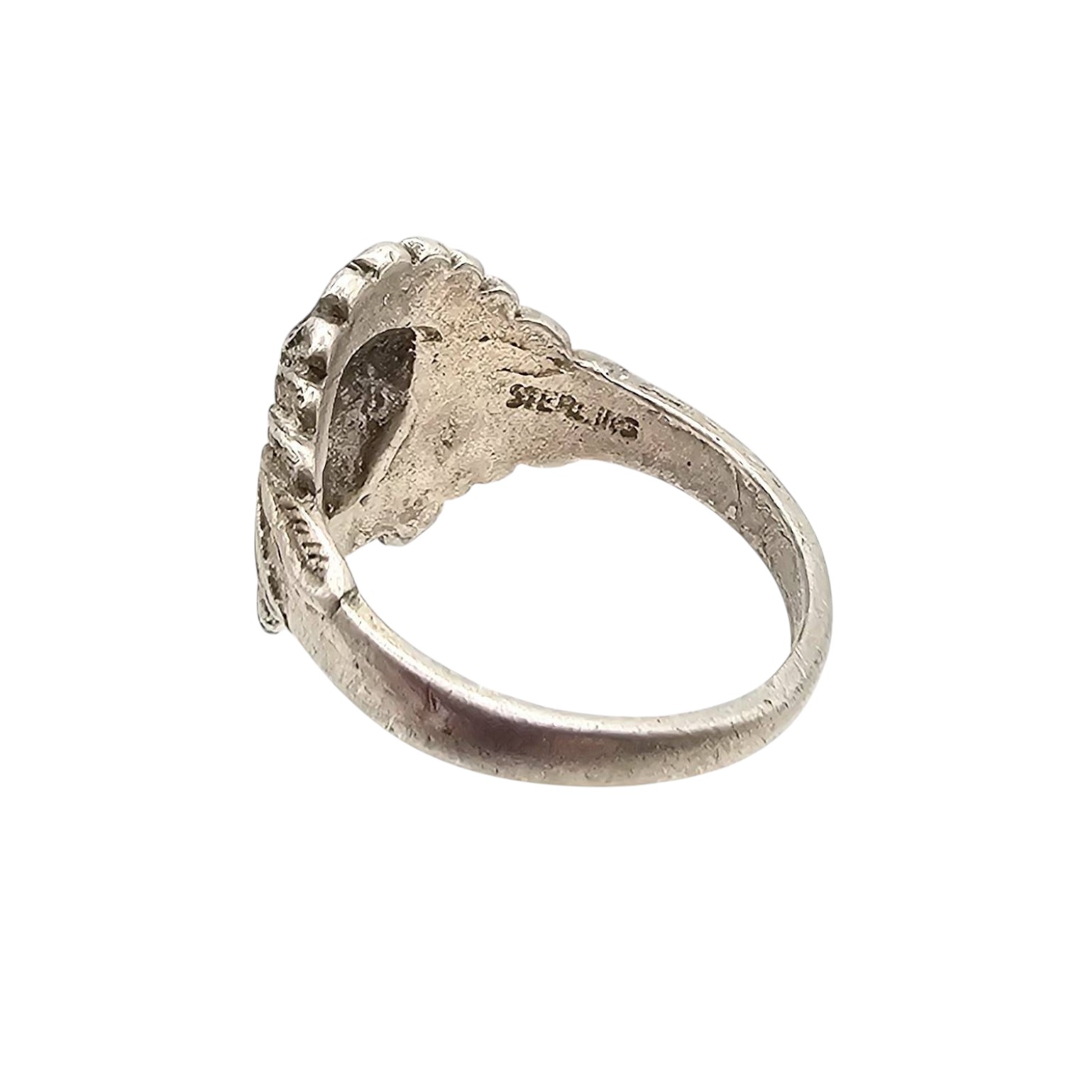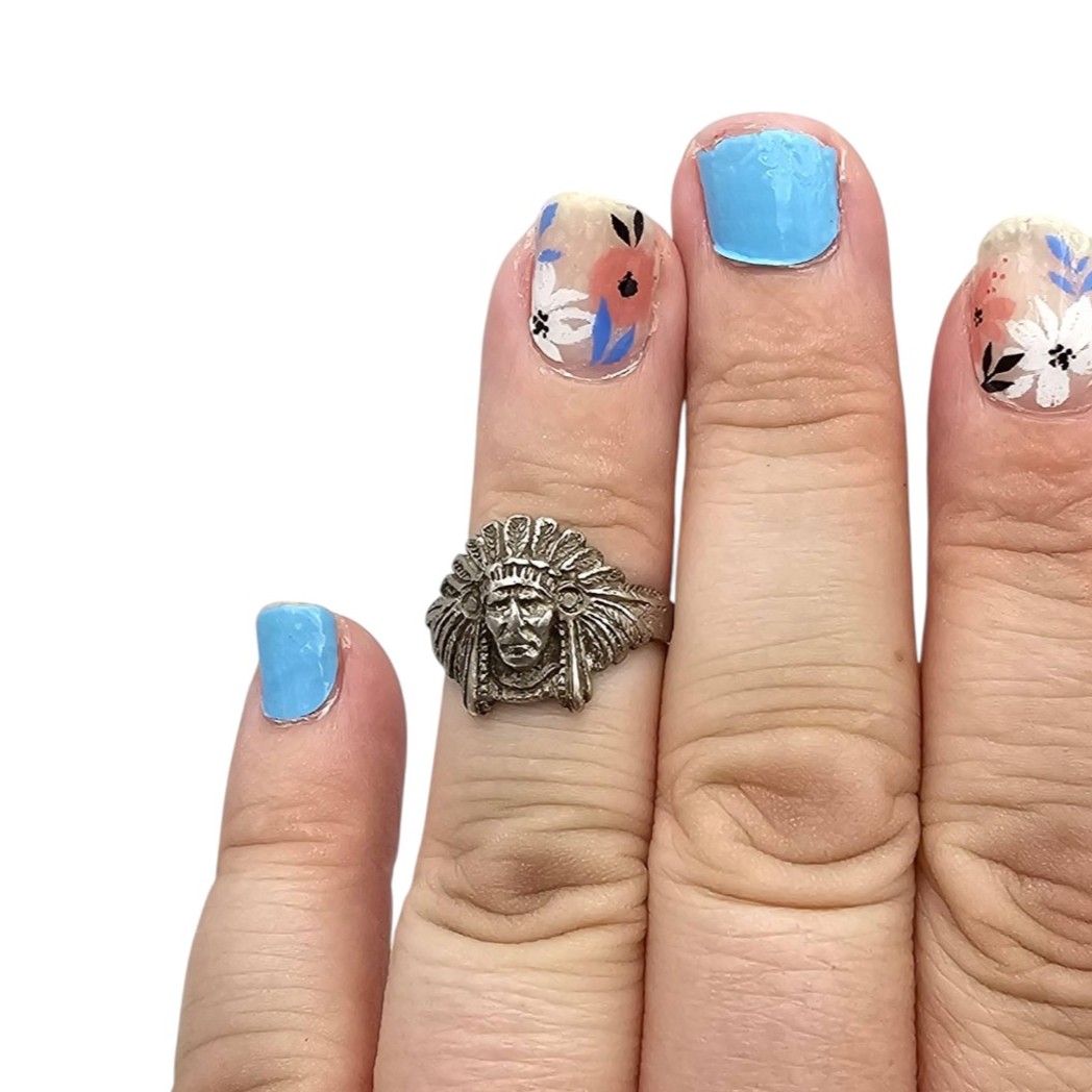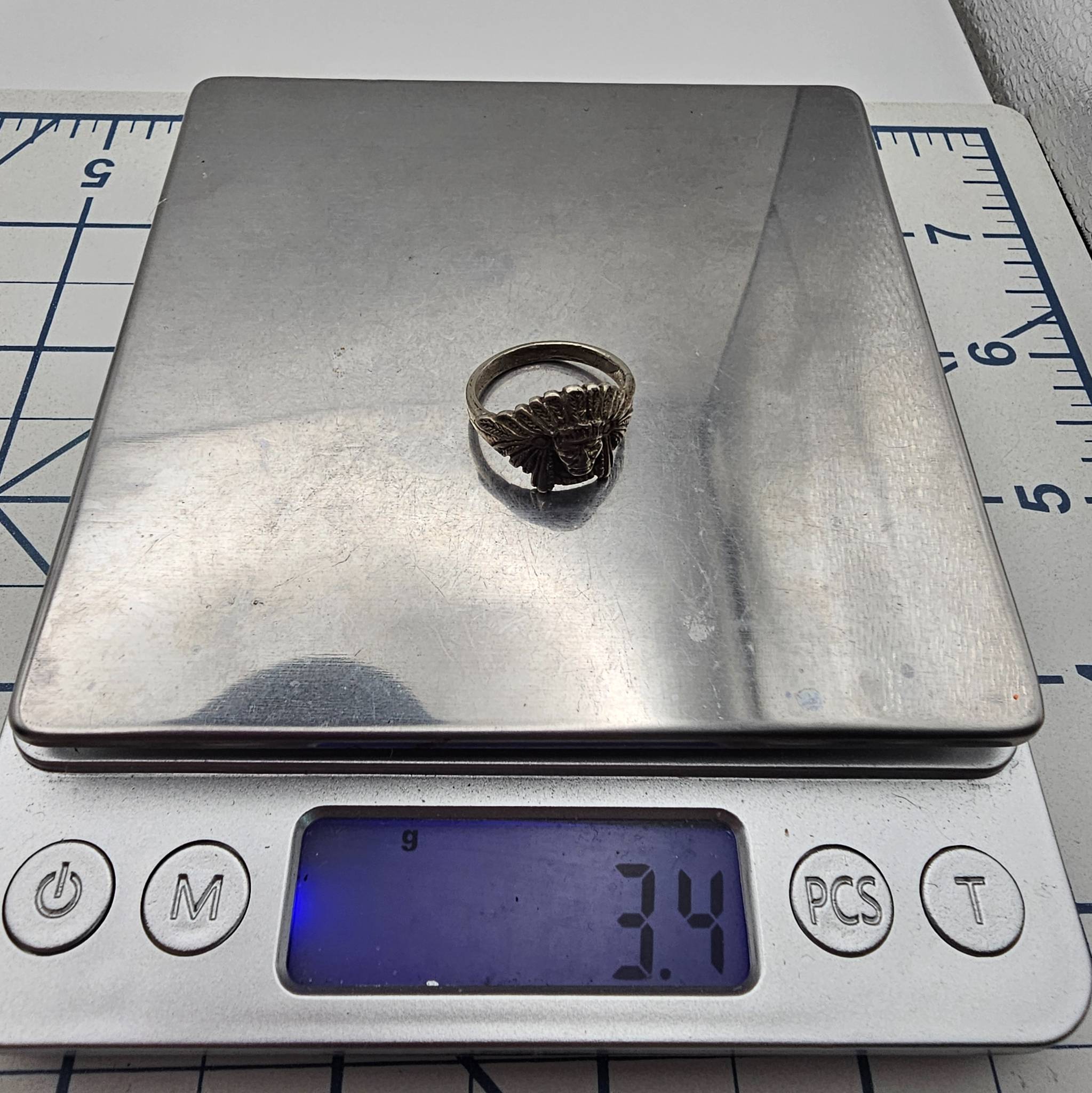 Sterling silver ring featuring a detailed depiction of a chief’s head. The ring is marked ‘Sterling’ and has a weight of approximately 3.4 grams. Size is 5.75, as stated.