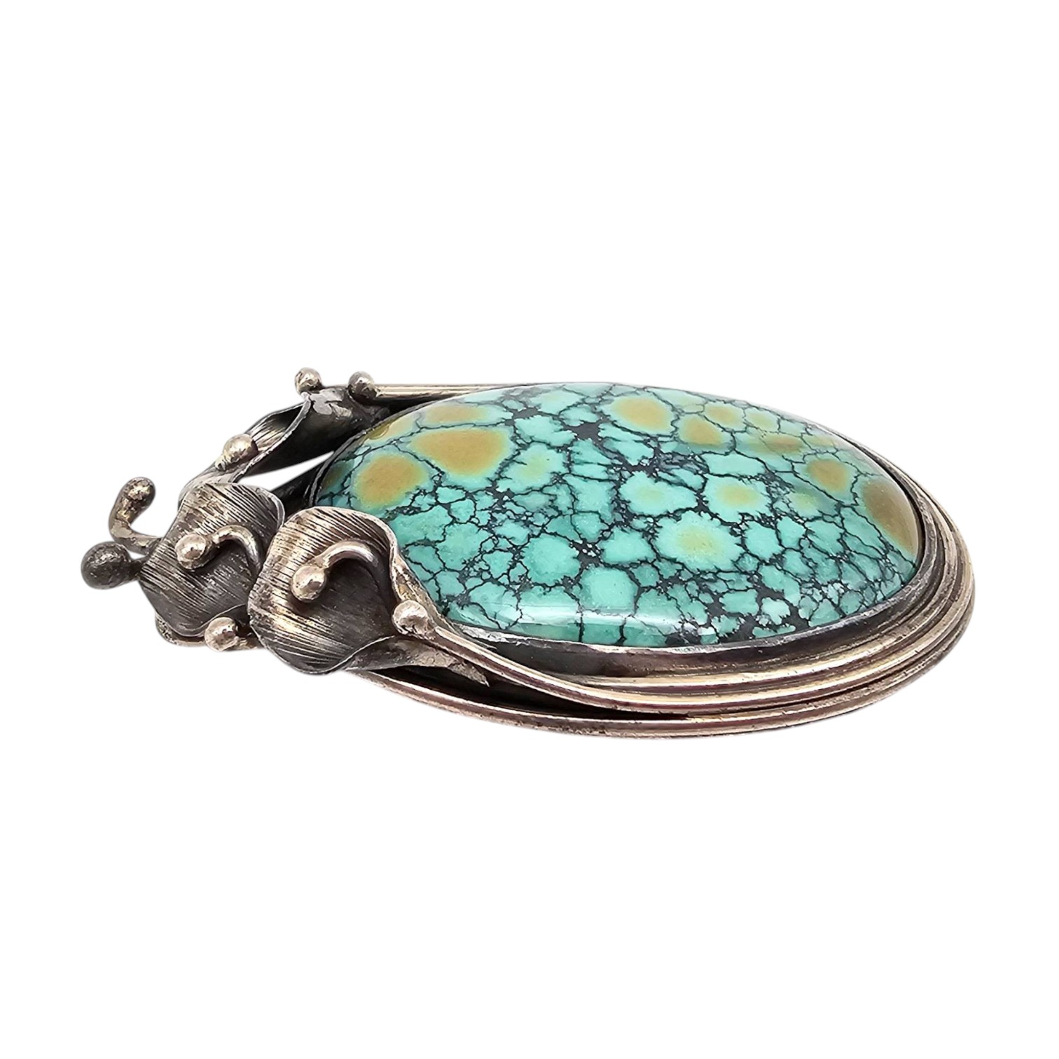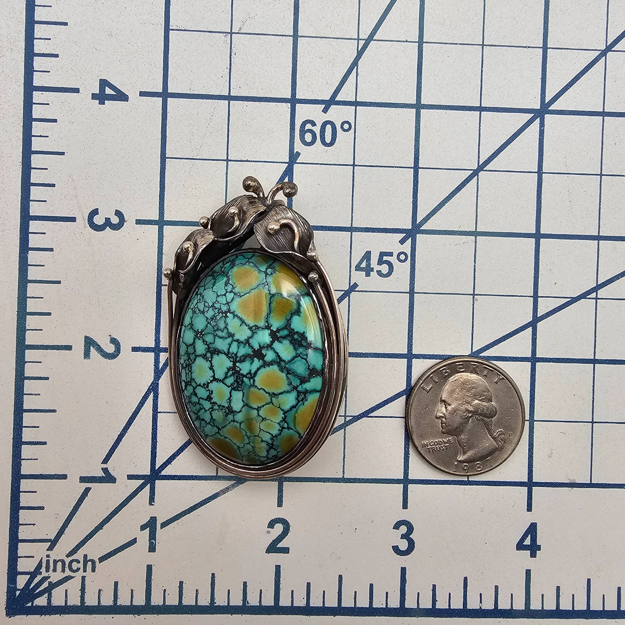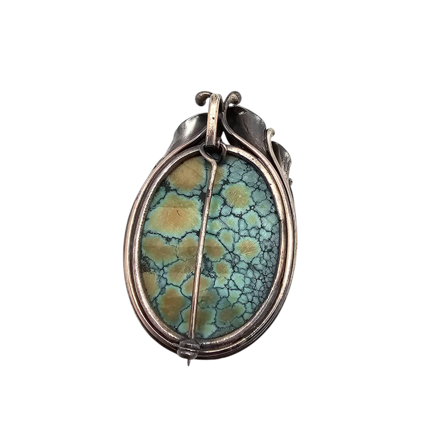 Sterling silver brooch and pendant featuring a large turquoise stone with vibrant green and yellow tones and intricate black veining. Designed with calla lily motifs, it functions as both a brooch and a pendant, offering versatility. Weighs approximately 30 grams and measures about 2.5 x 1.75 inches. The piece includes a pin clasp and loop for chain attachment.