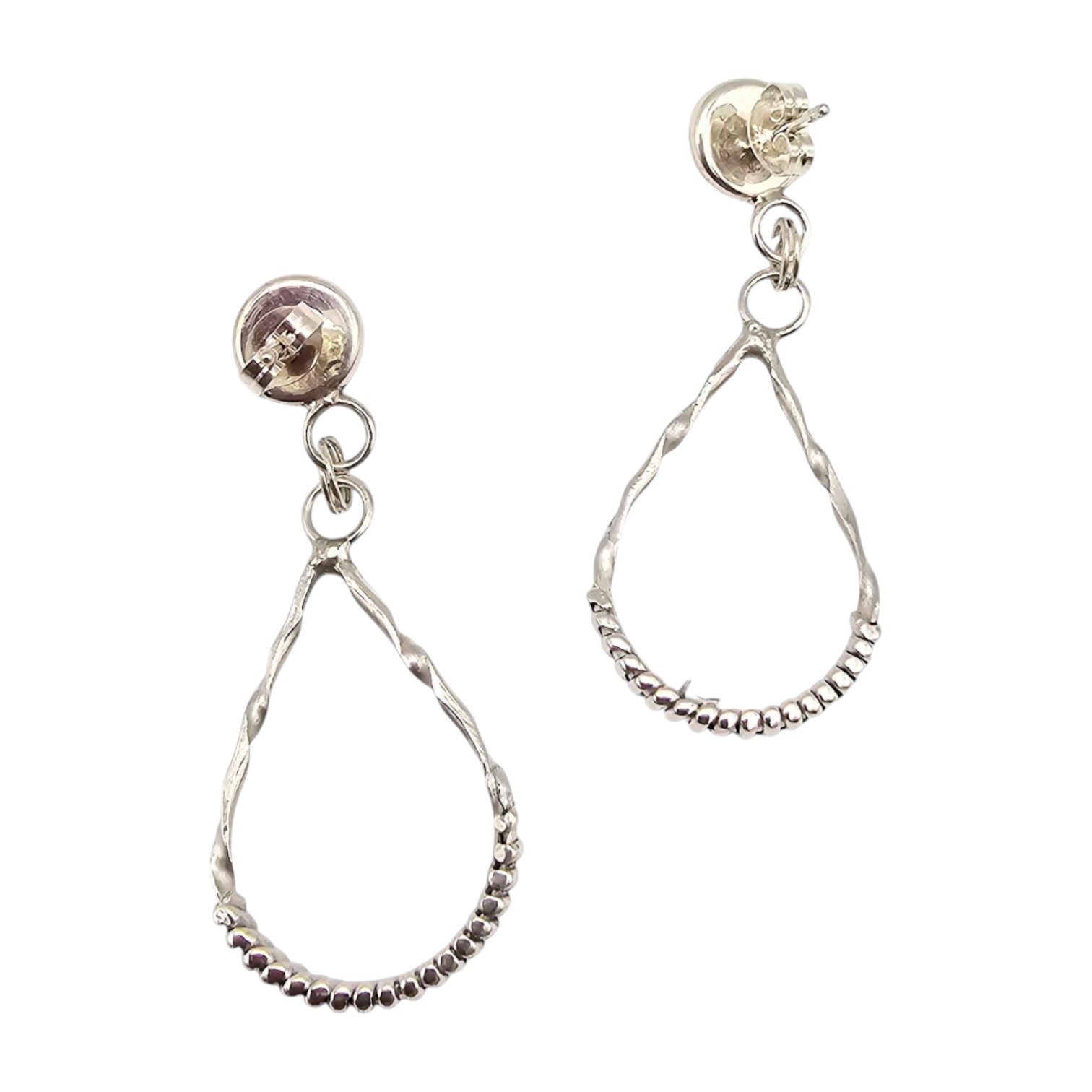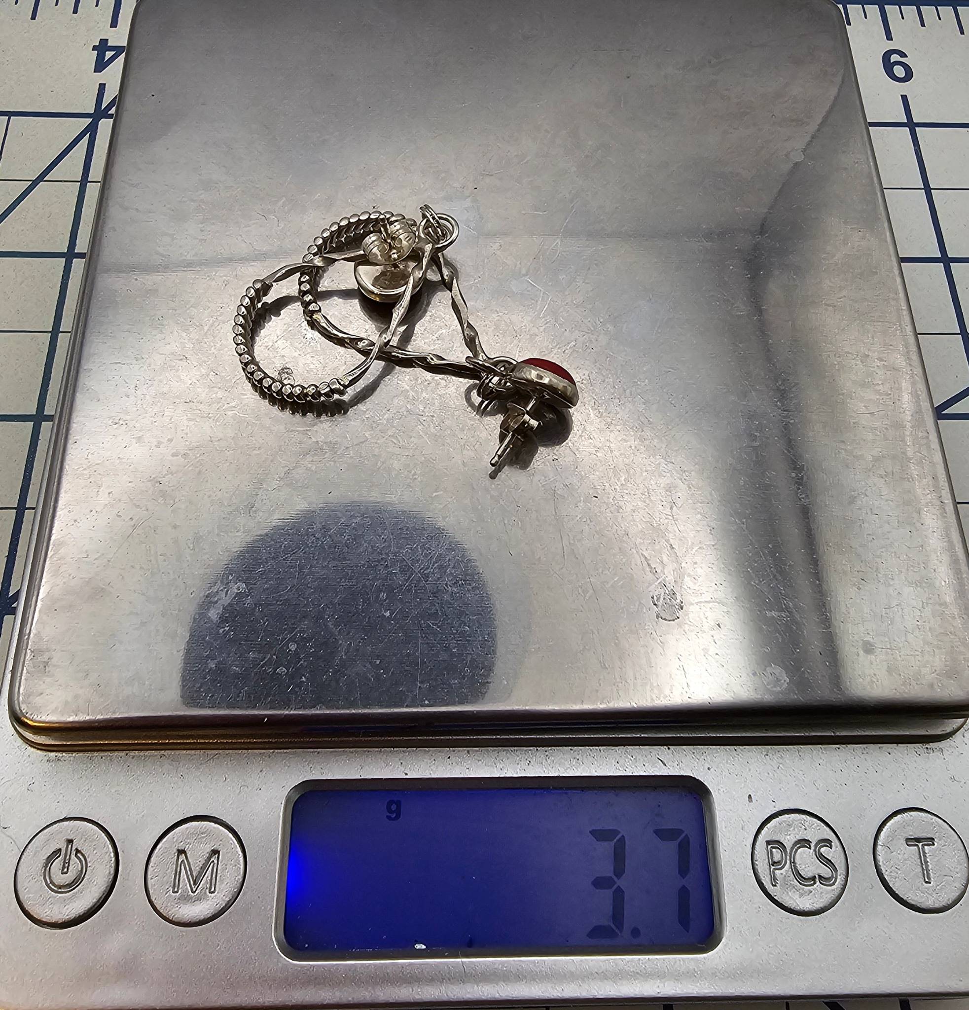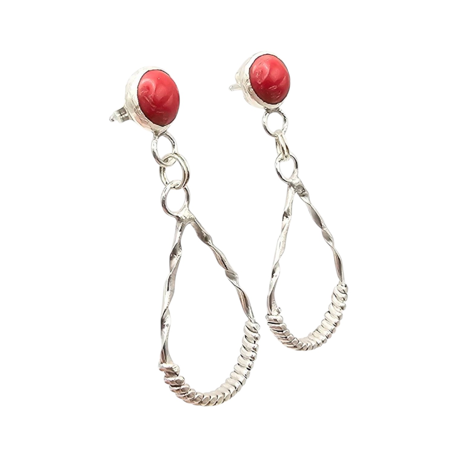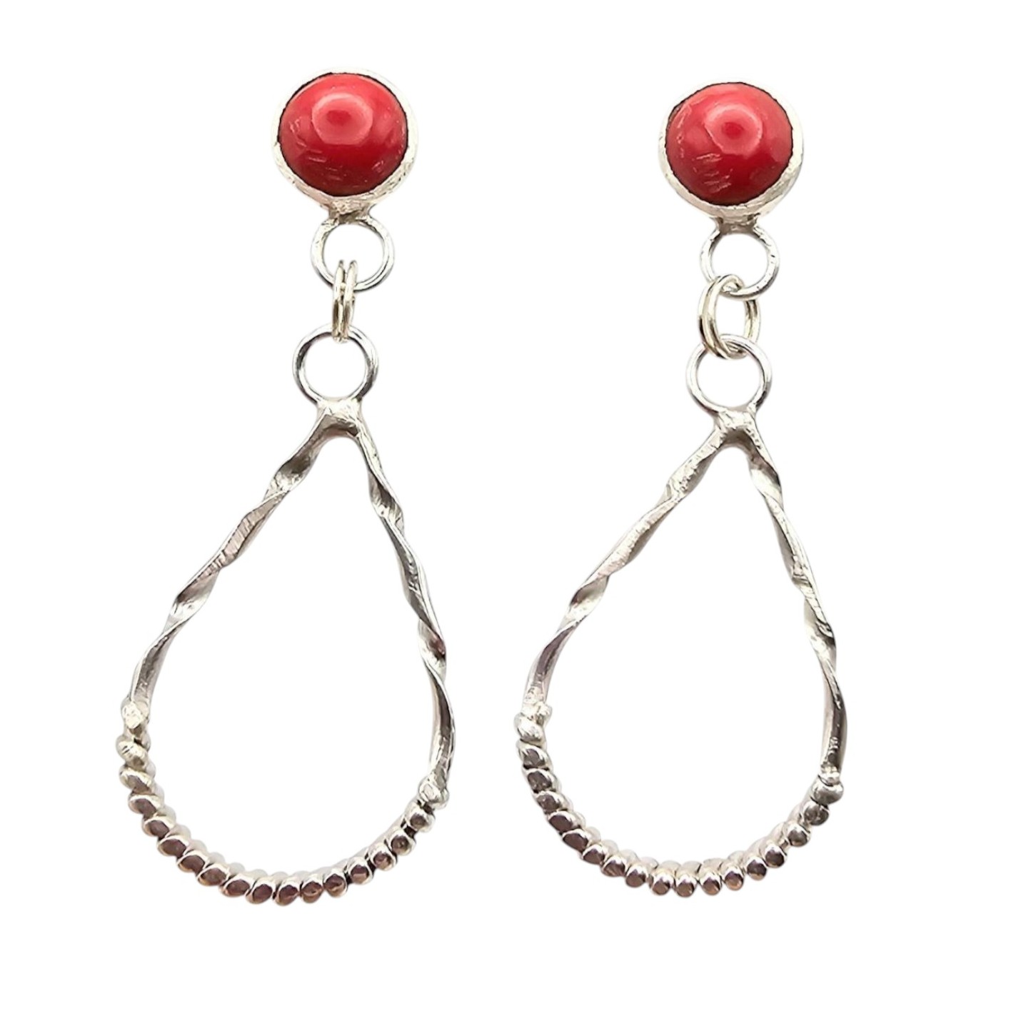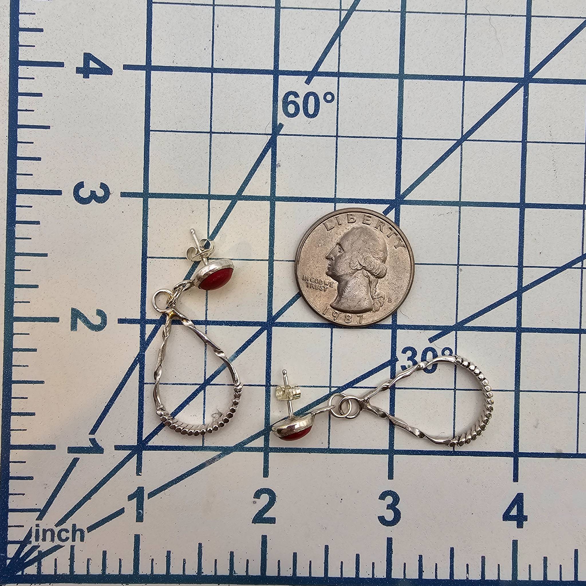 Navajo handmade earrings by artisan Richard Mike. Crafted from sterling silver (SS) with a distinctive twisted teardrop design and featuring vibrant red coral cabochons. Each earring is lightweight, weighing a combined total of 3.7 grams. Measuring ruler and quarter shown for scale.