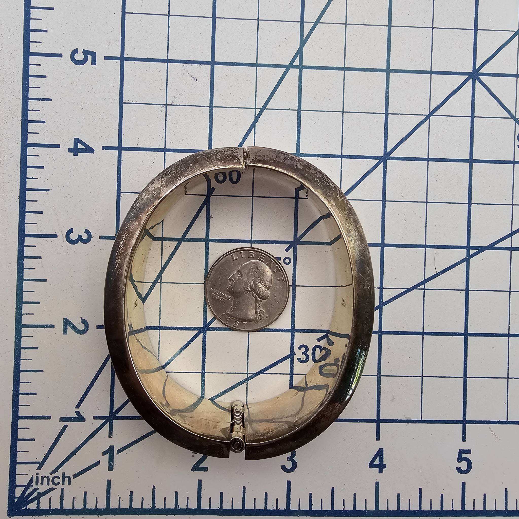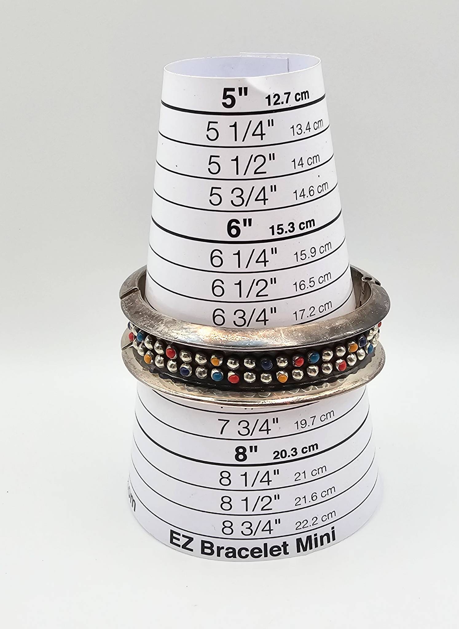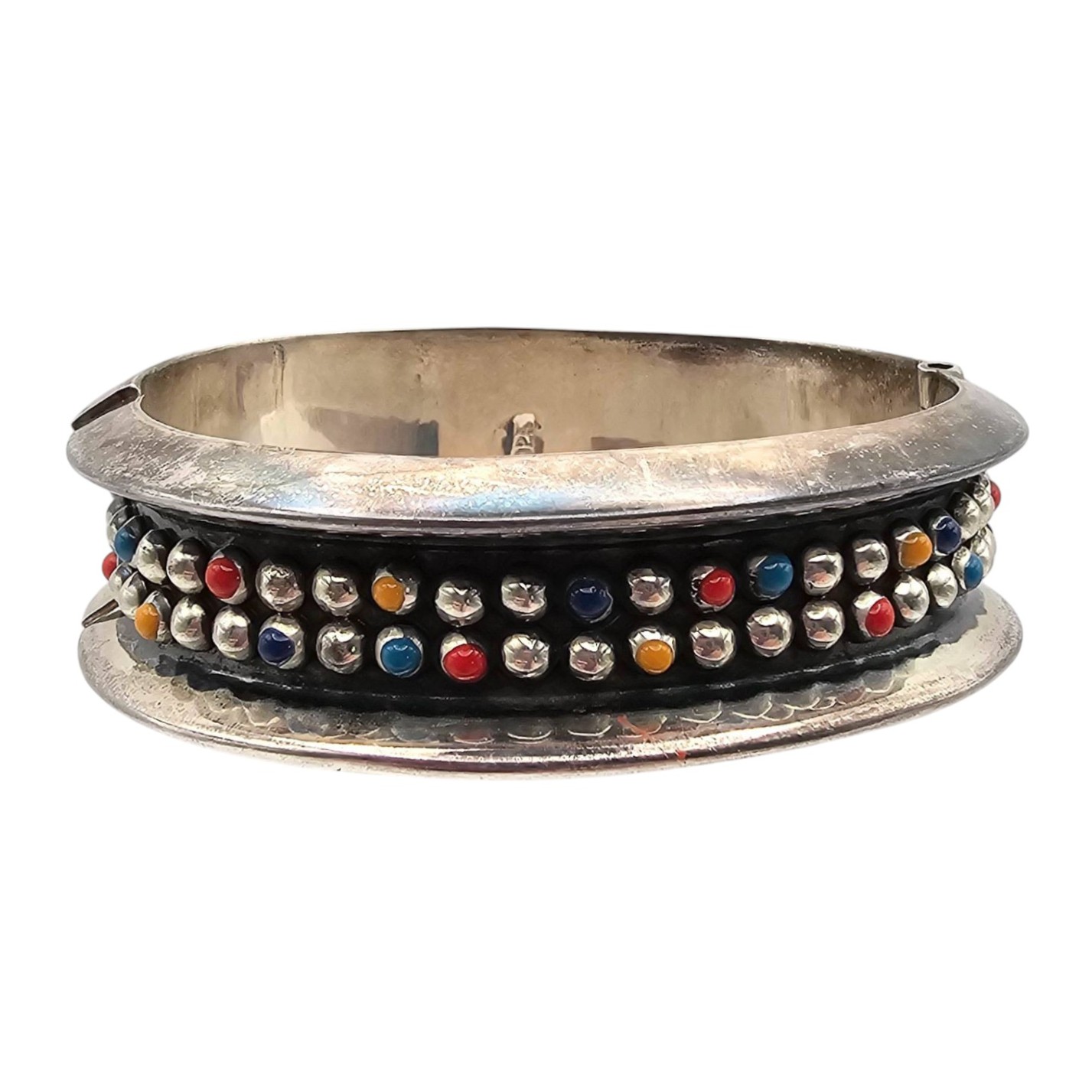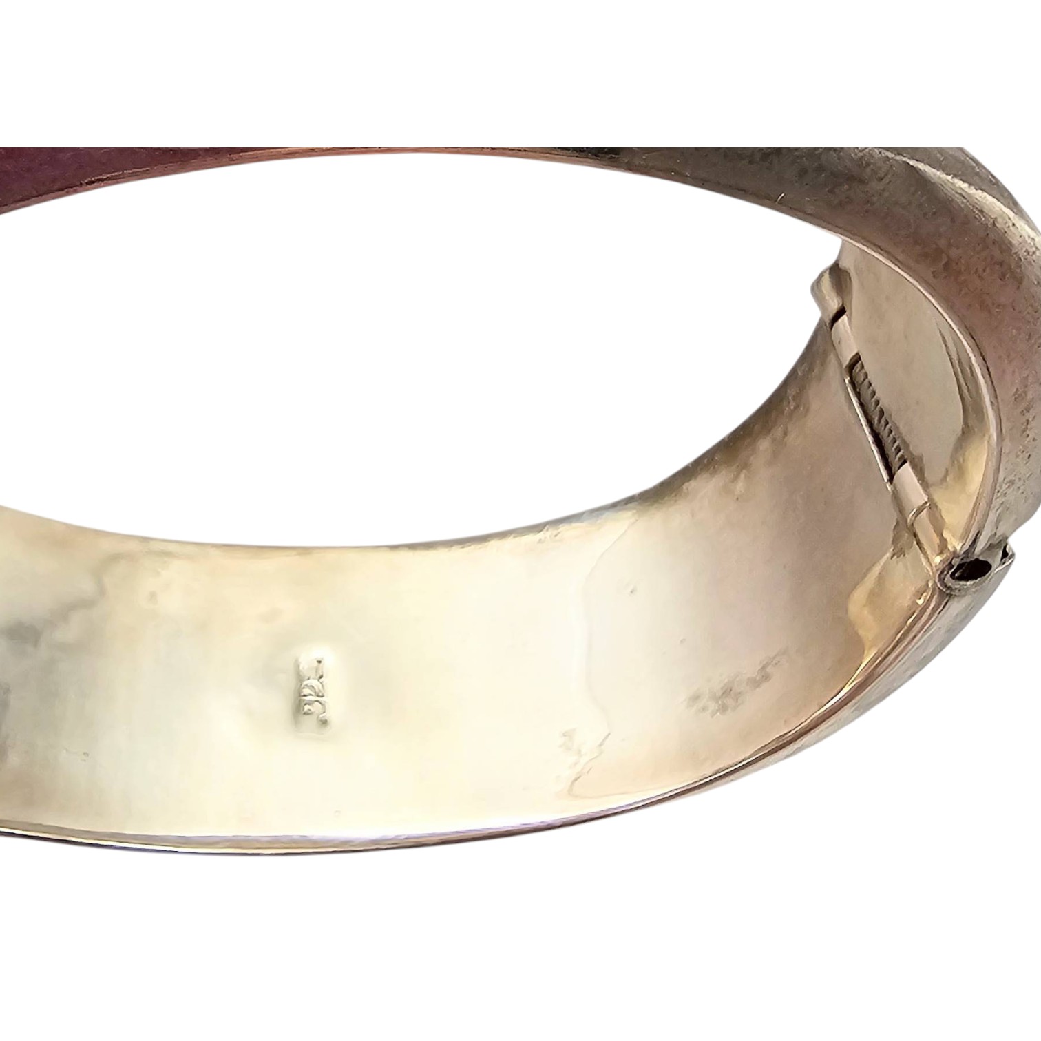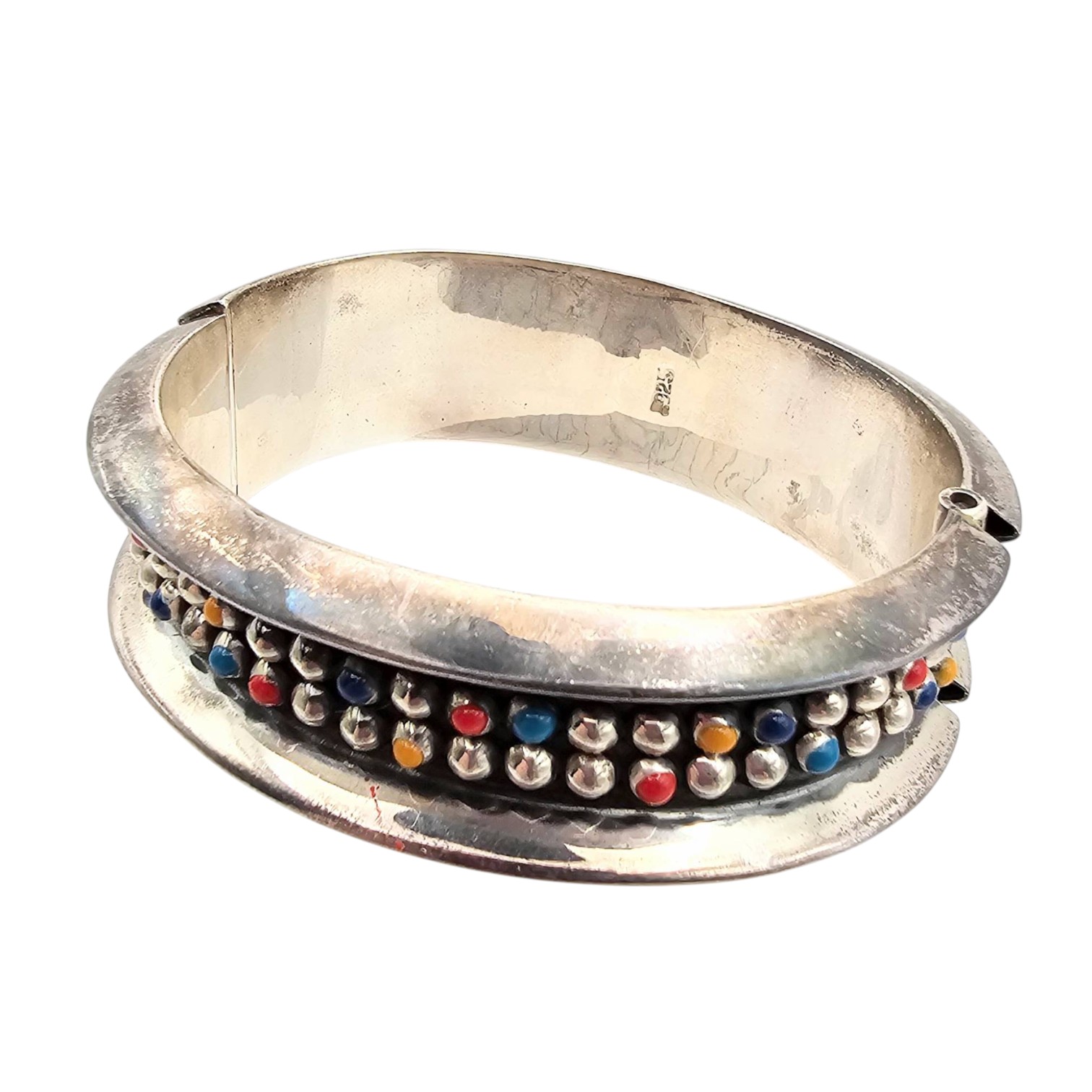Sterling silver (. ) hinged bangle bracelet weighing 68.5 grams. The bracelet features a multi-stone design with colorful accents and a secure hinge mechanism. Stamped with ‘ ‘ hallmark on the interior. Measurements shown in photos include approximately 6.5 inches in interior circumference. This bracelet is a blend of polished silver and vibrant stones.