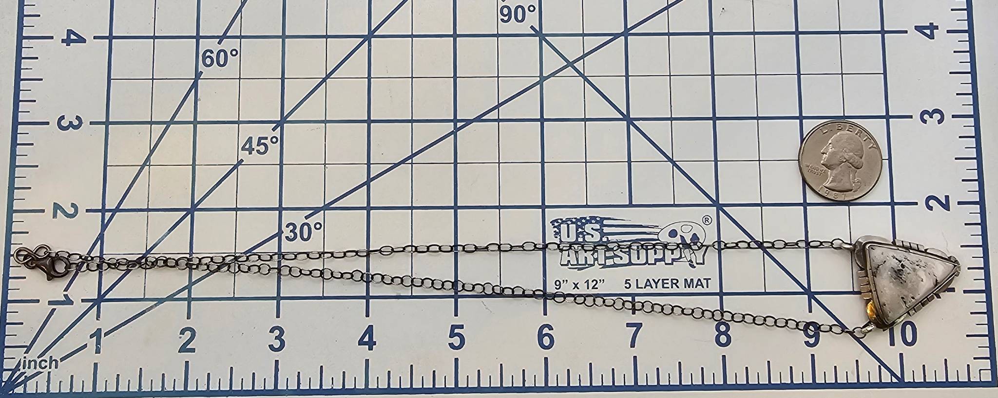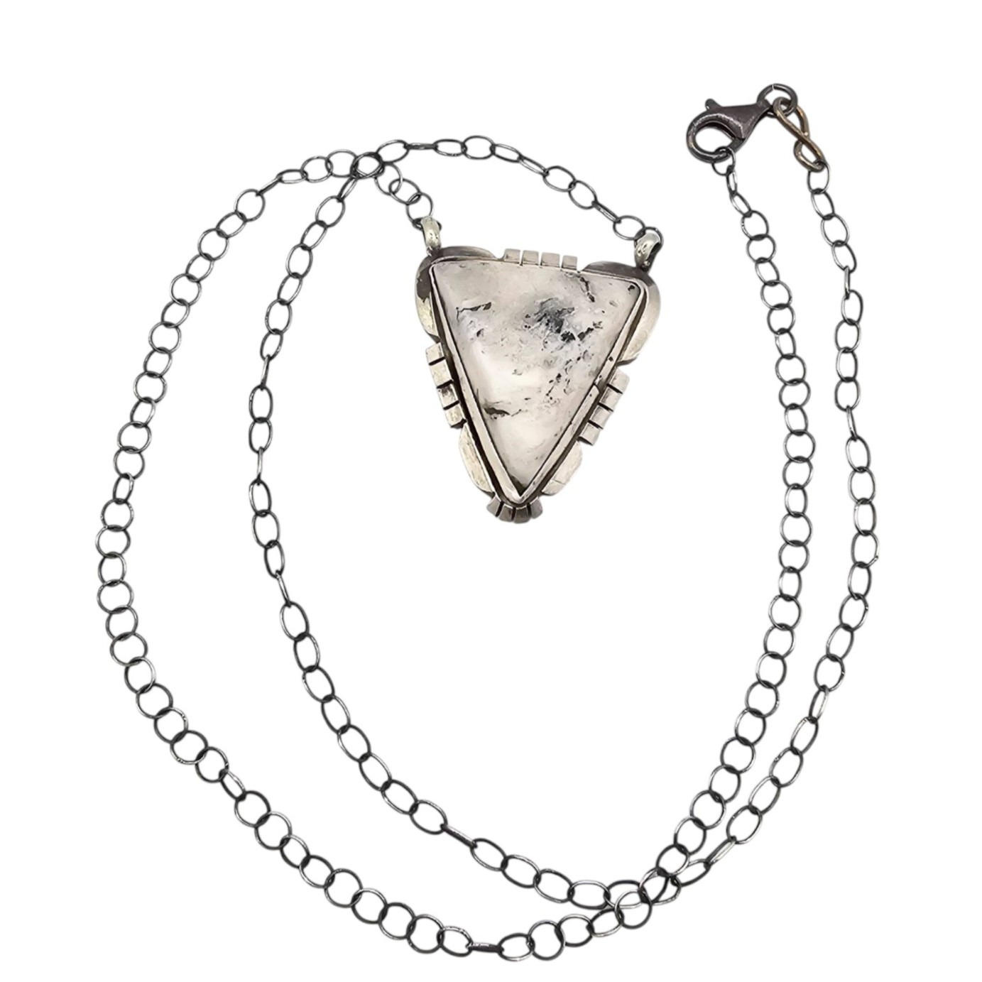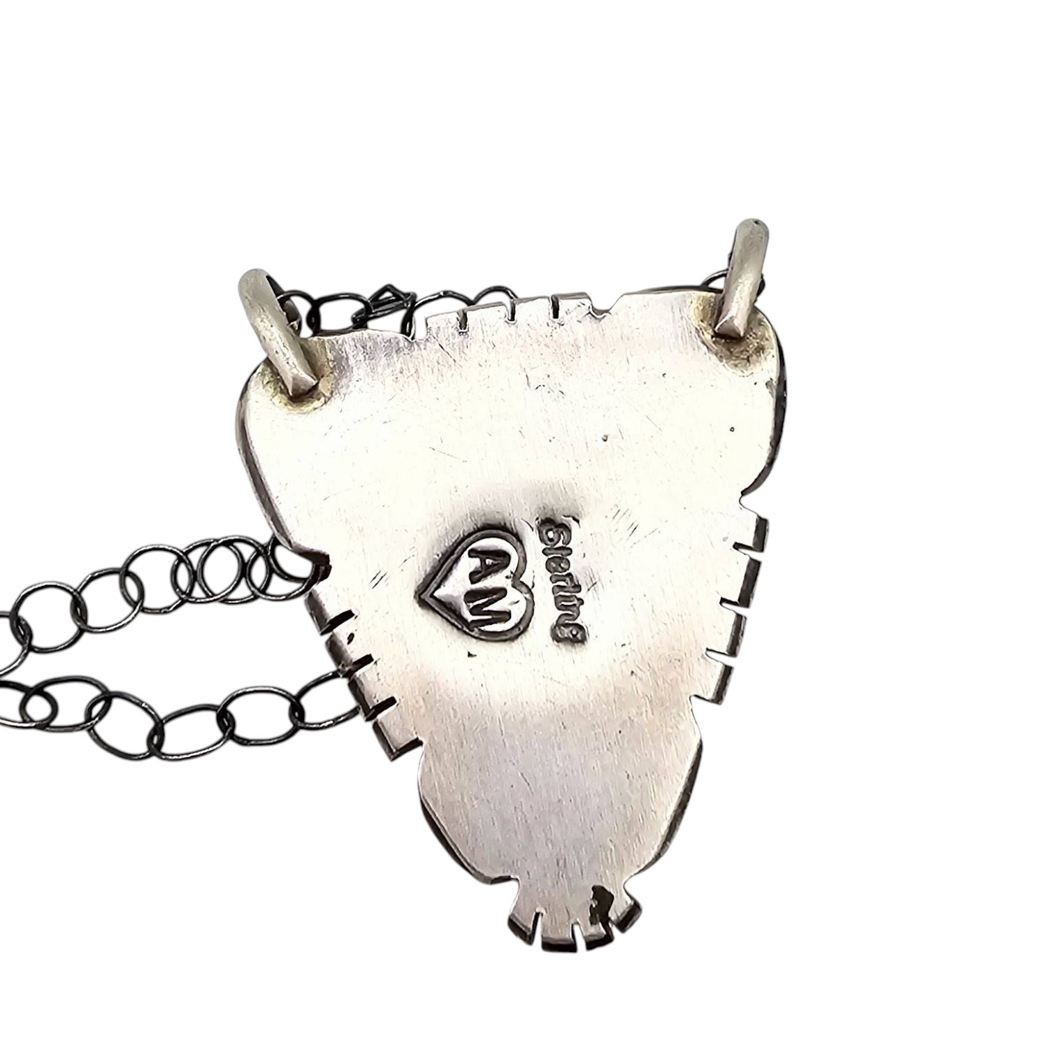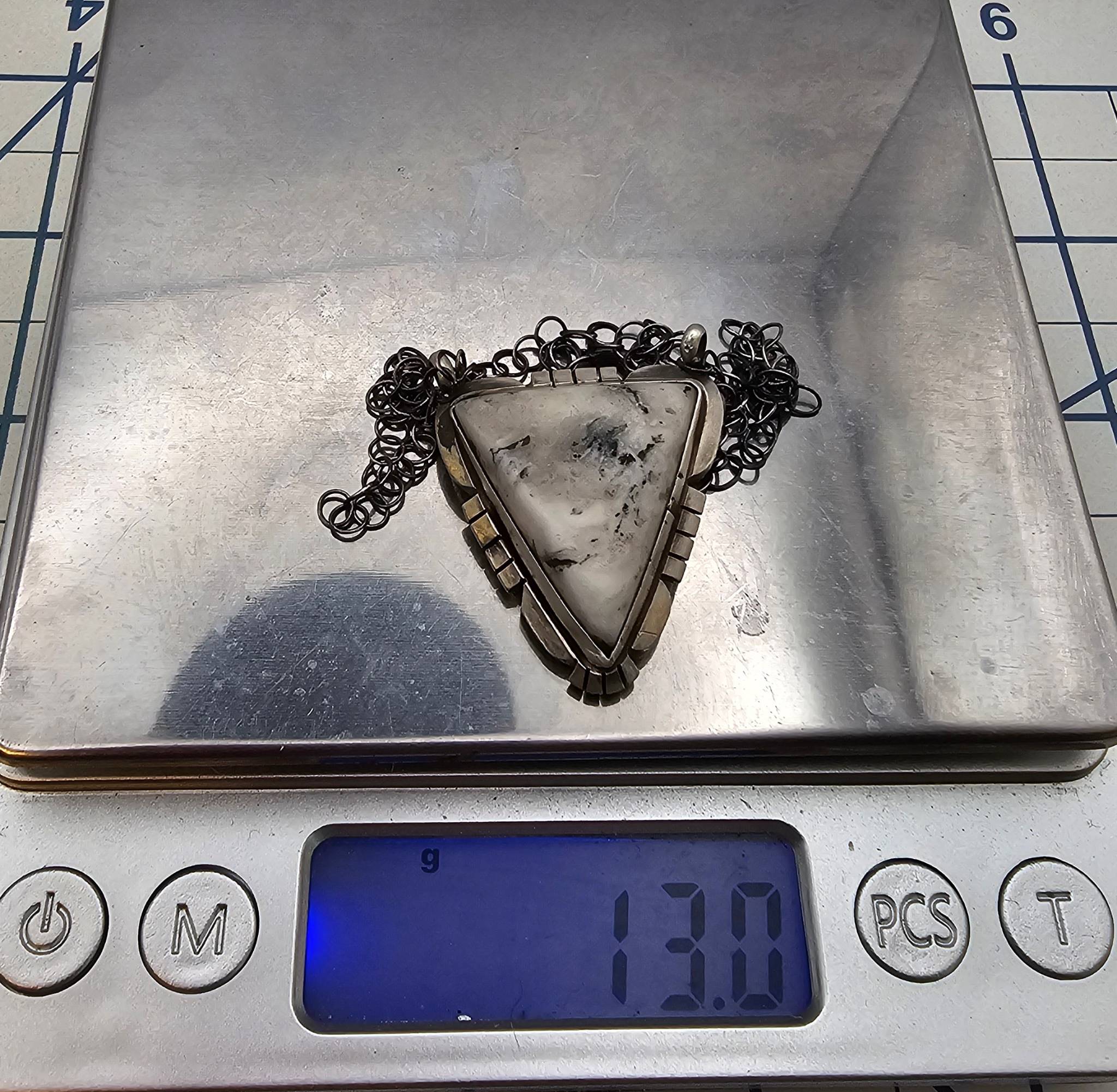 Handmade sterling silver necklace featuring a triangular White Buffalo Turquoise stone set in a bezel. The necklace weighs 13.0 grams and includes the hallmark ‘A.M.’ on the back.