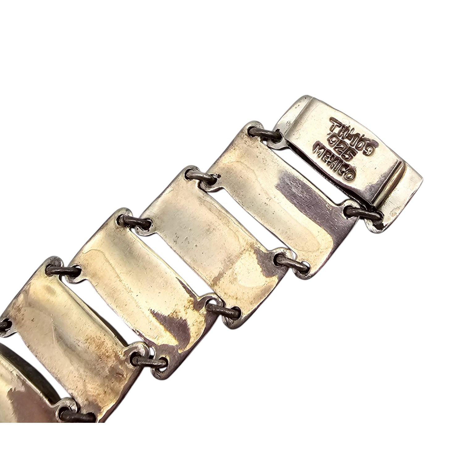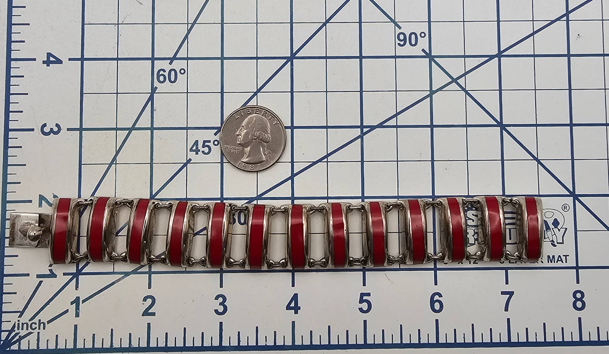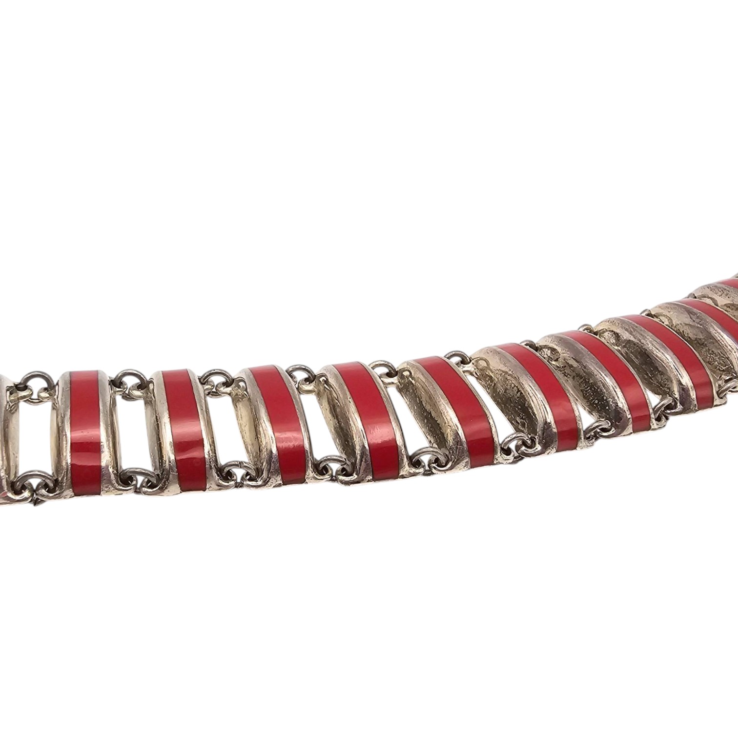 Mexican-made sterling silver bracelet featuring red enameled links and decorative scroll motifs. Marked ‘TH-105 Mexico’ and ‘ ‘ on the clasp.