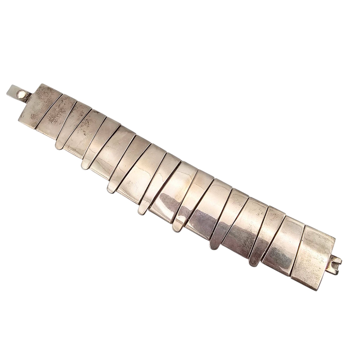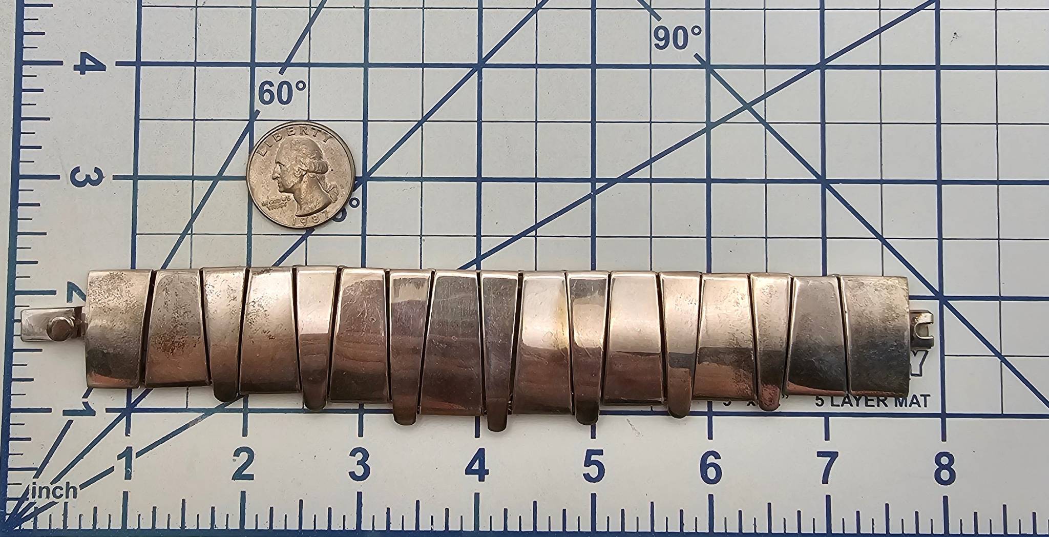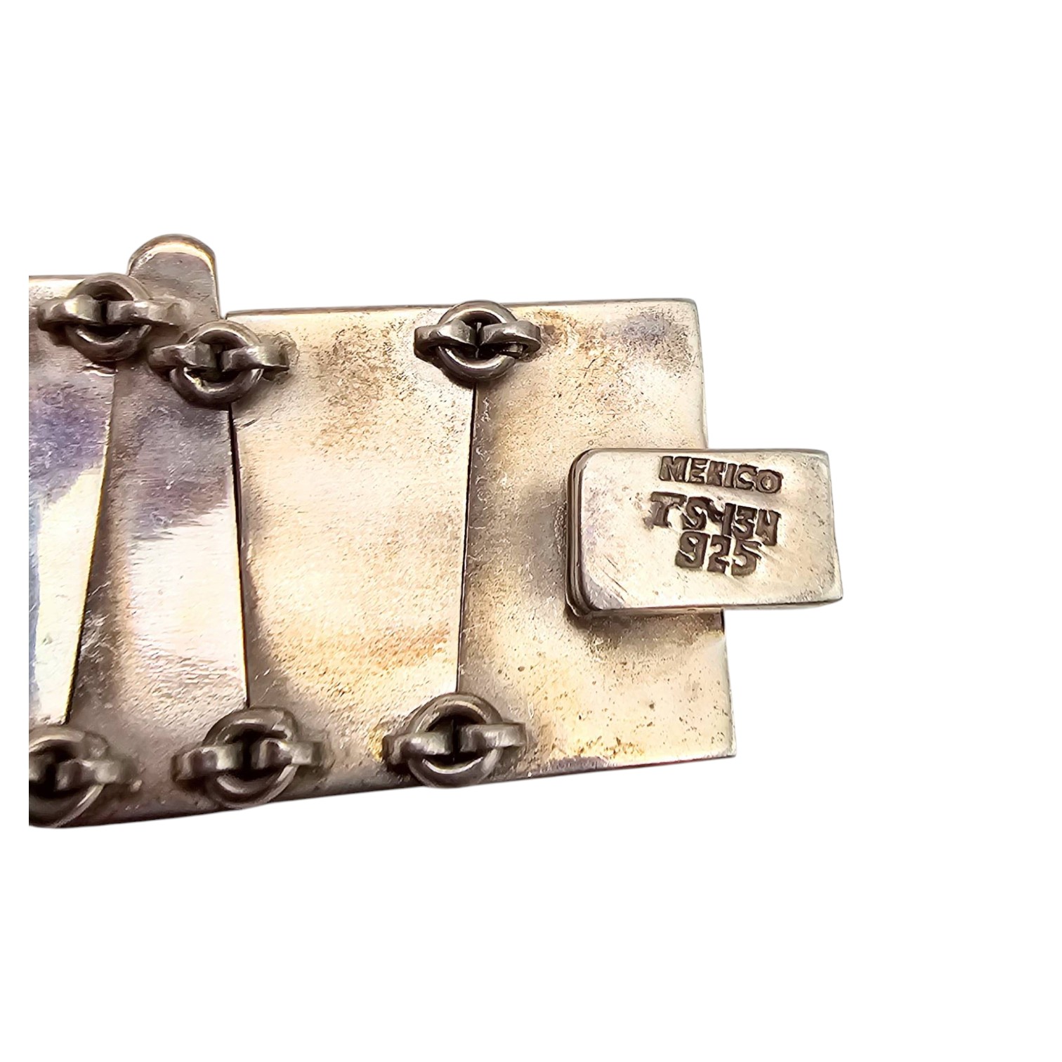 Sterling silver geometric link bracelet marked ‘Mexico TS-134 .’ Weighs 86.3g. Features interlocking links with a sleek, modern design. Sturdy clasp closure for secure wear. Crafted from high-quality sterling silver with slight surface wear consistent with age and use. Measures approximately 7 inches in length.