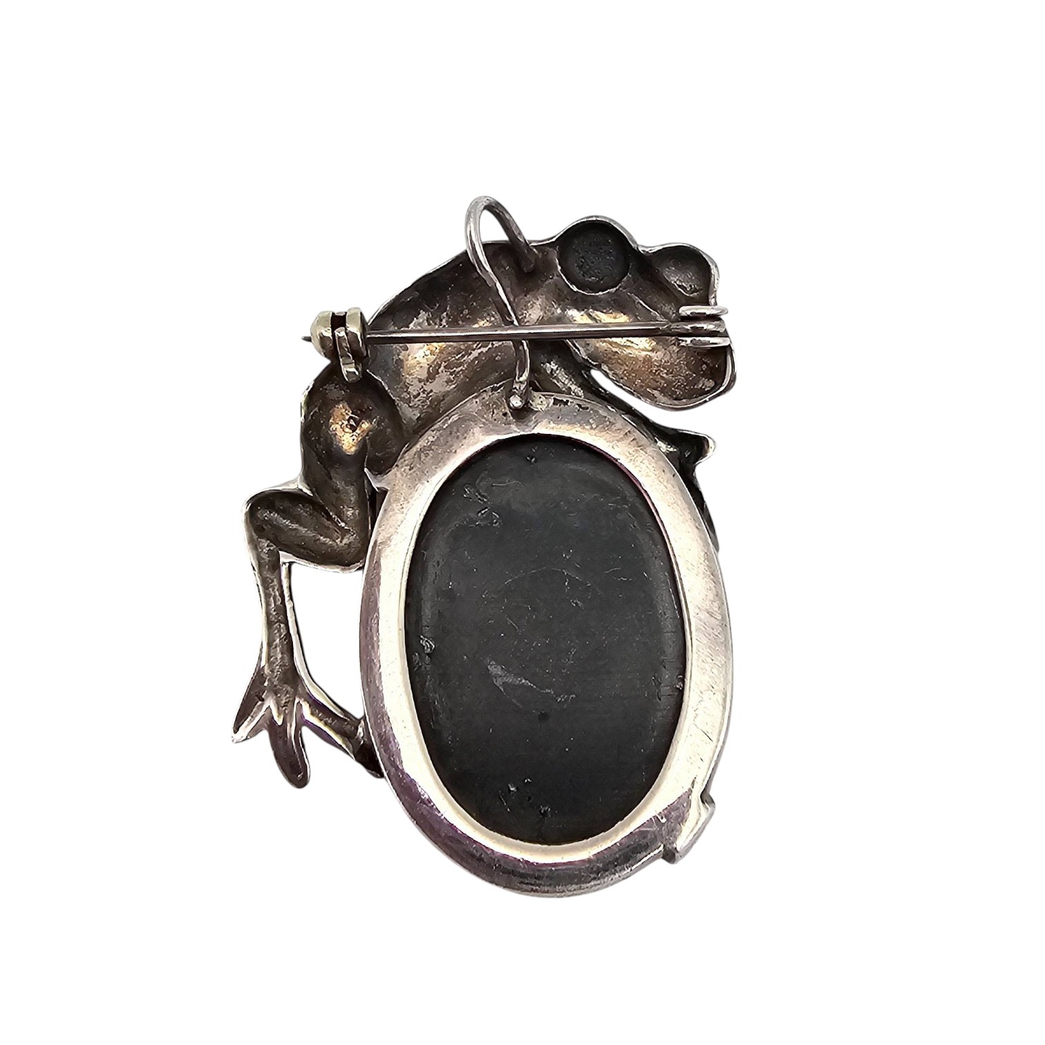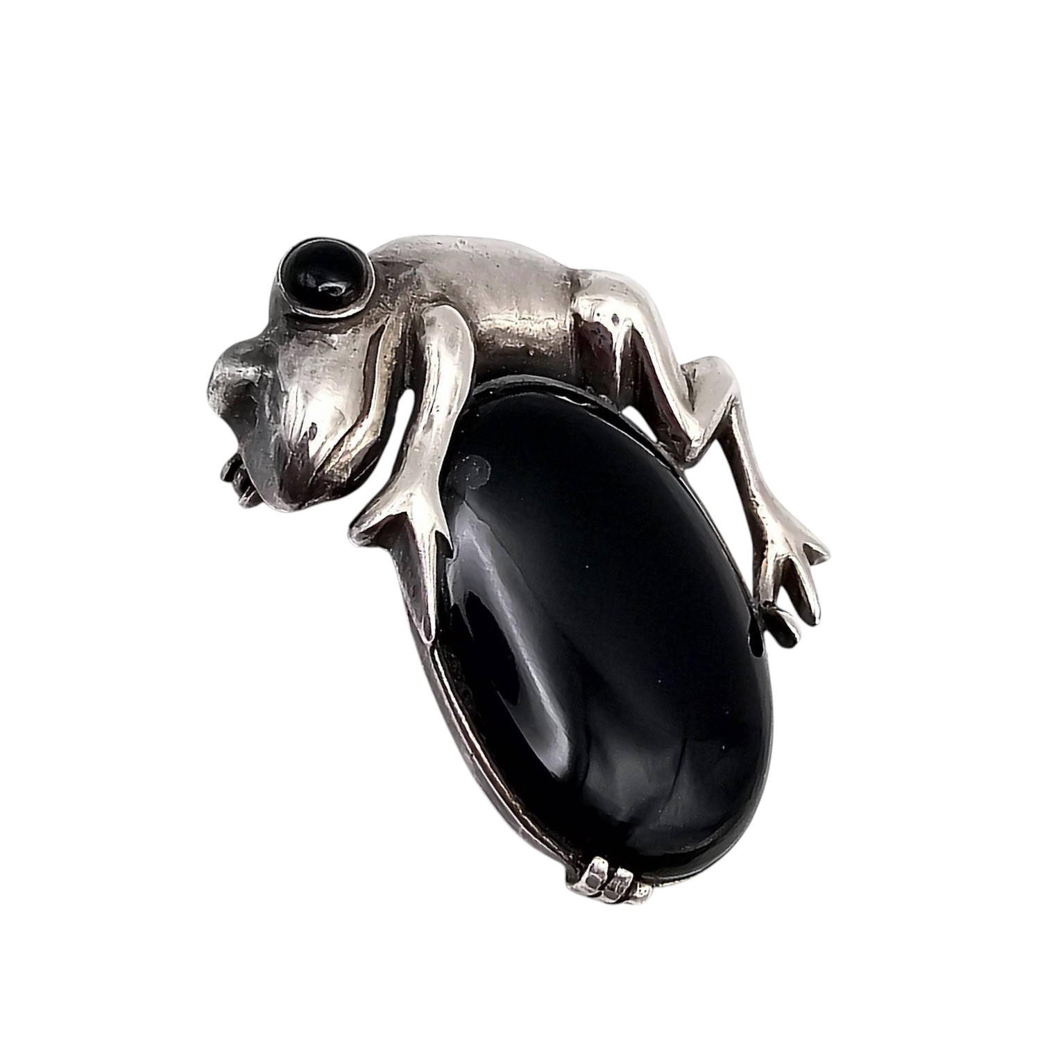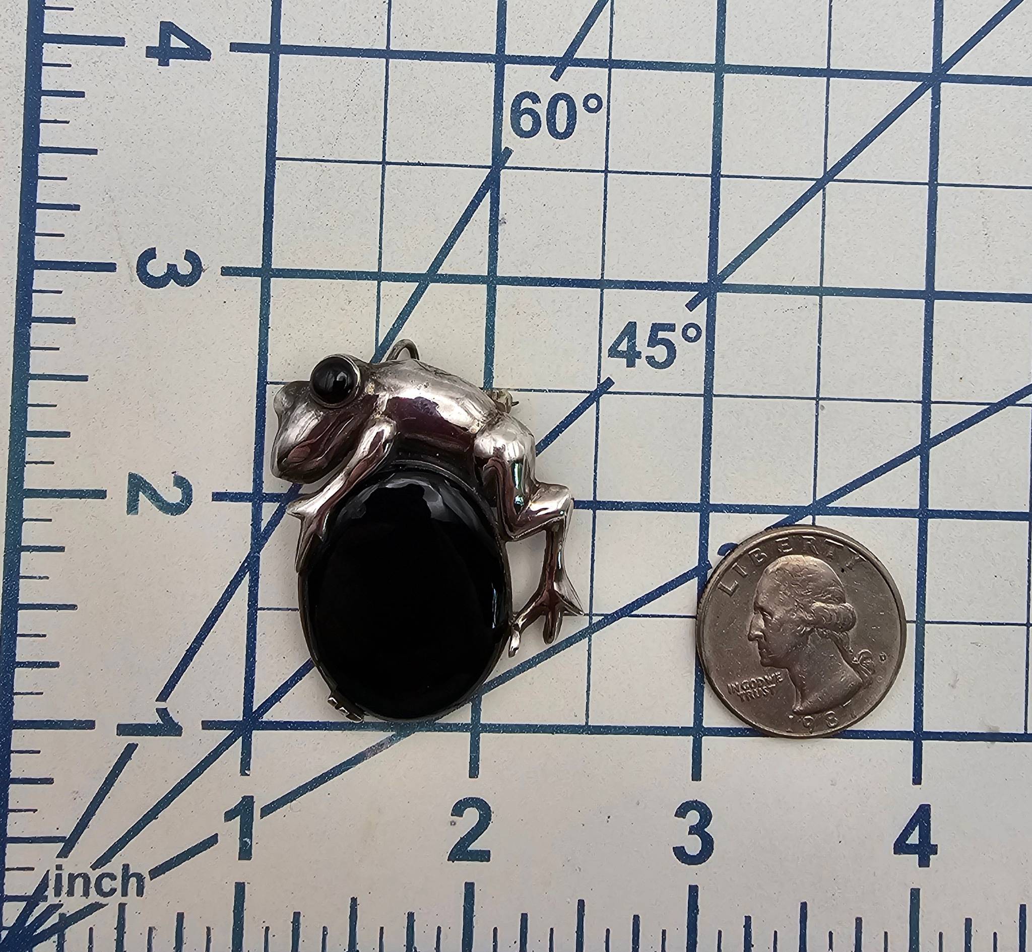Sterling silver frog-shaped brooch featuring an oval onyx stone. The brooch weighs 11.8g and has a pin-back closure. The frog’s eye is also crafted with onyx. A stylish and nature-inspired accessory, approximately 1.5 inches in length. Condition appears intact with functional clasp.