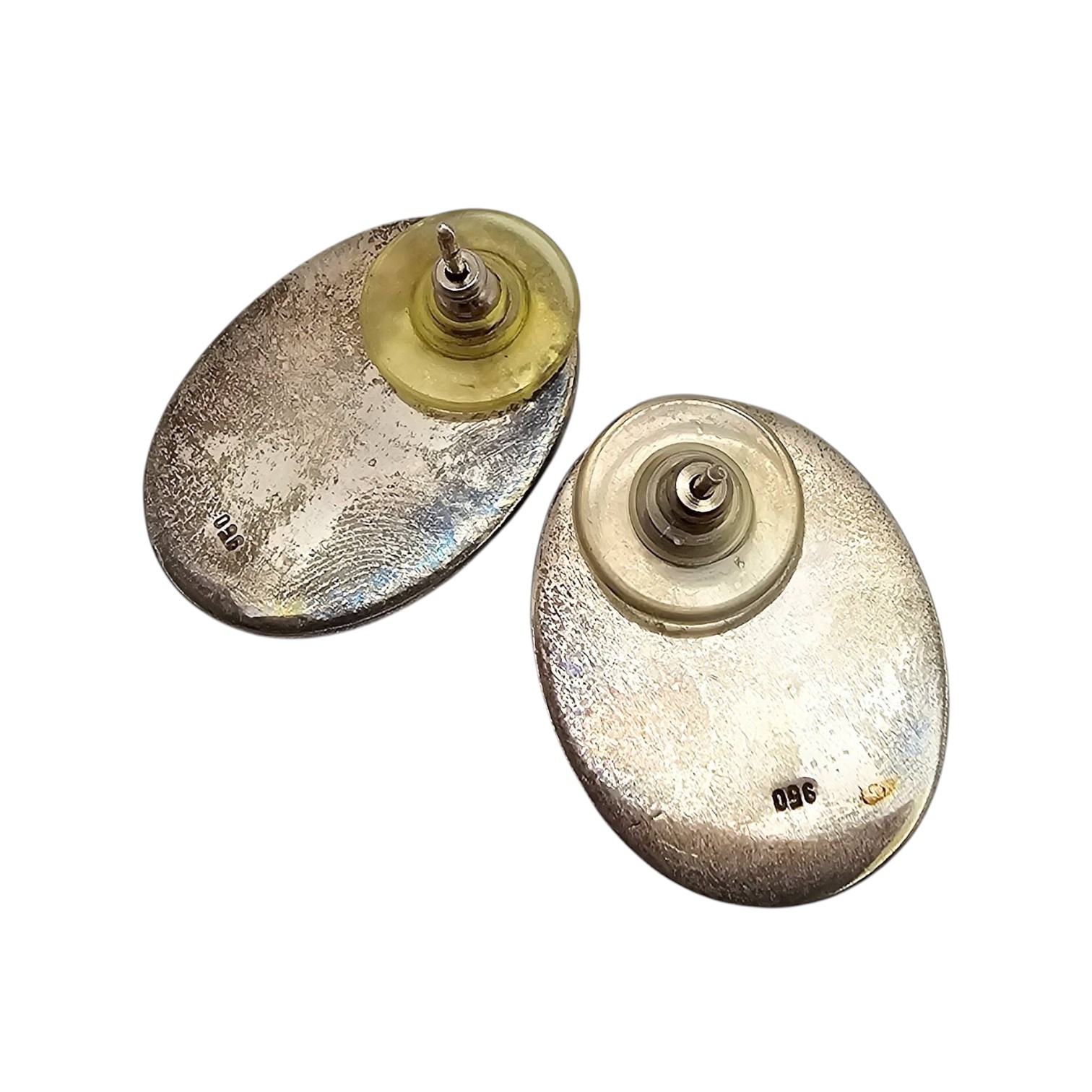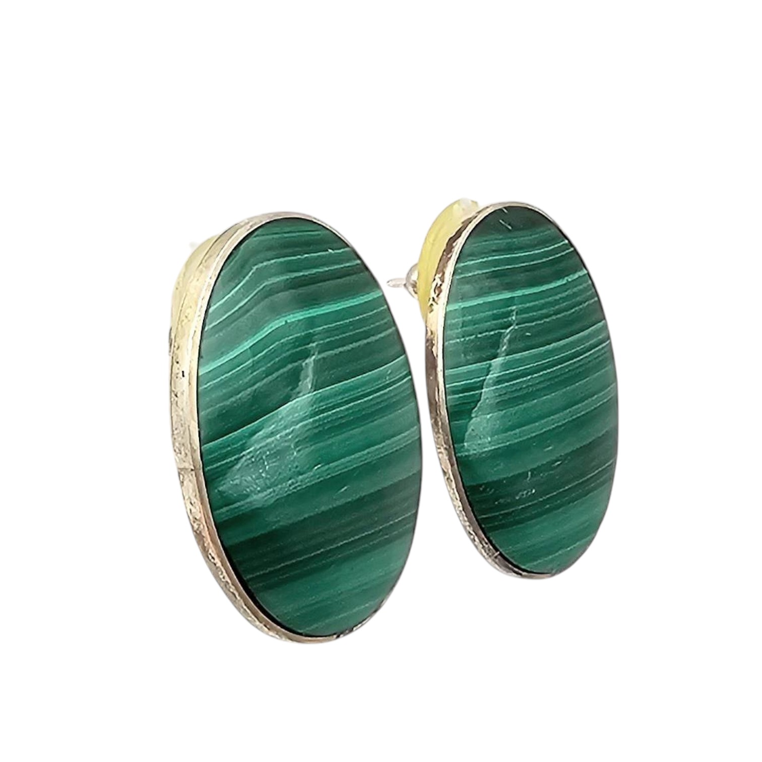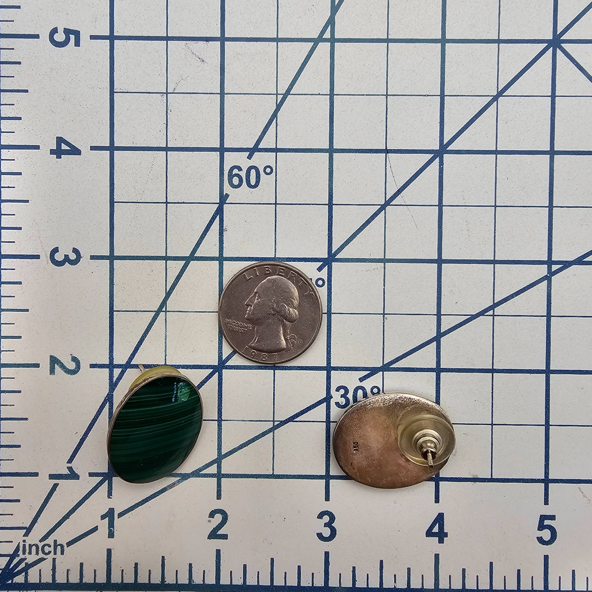 Oval-shaped malachite earrings crafted in Mexico from sterling silver. The earrings feature vibrant green malachite stones with natural banding patterns. Each earring is marked on the back and weighs a total of 12.8g. The earrings have post backs with stabilizing silicone pads, ensuring secure wear.