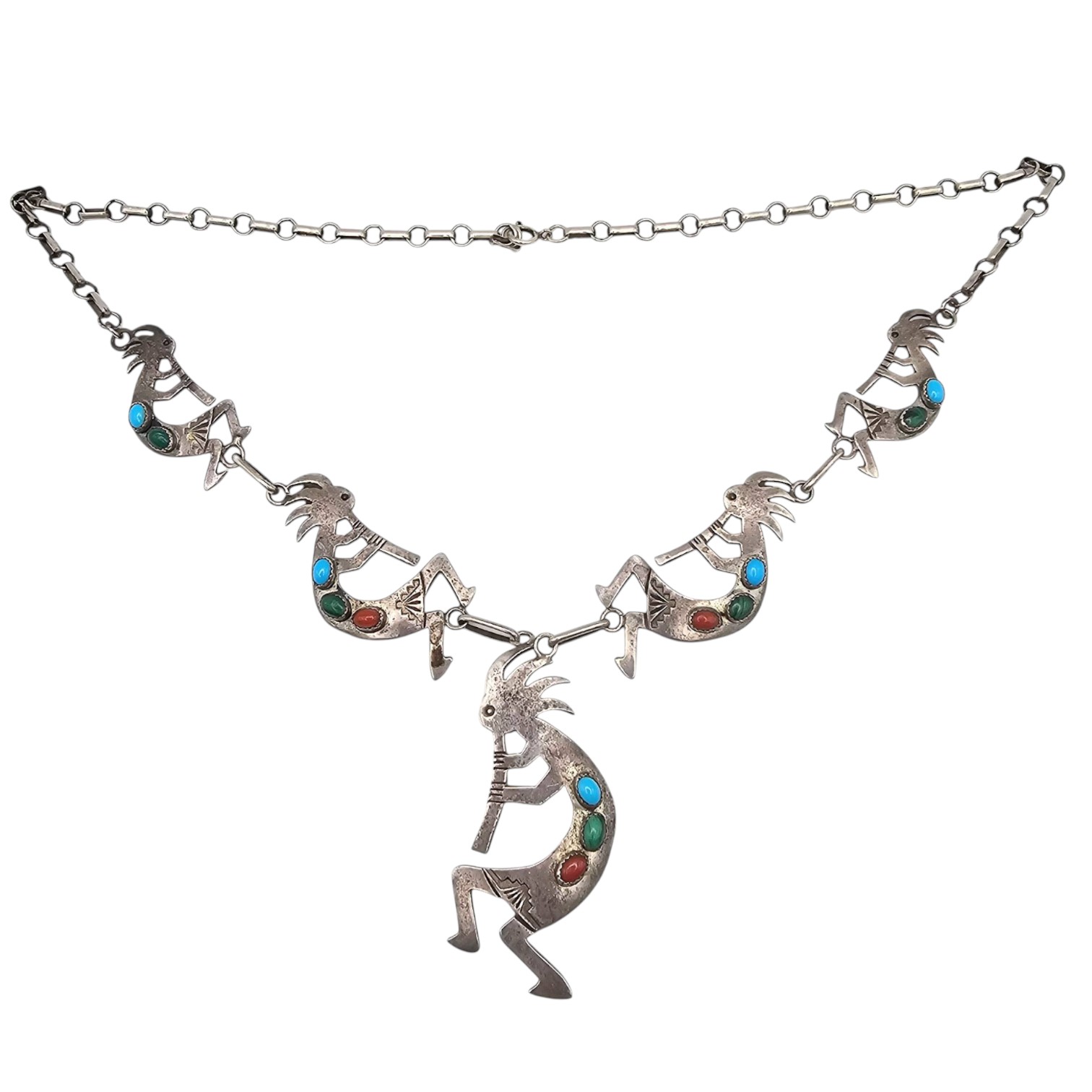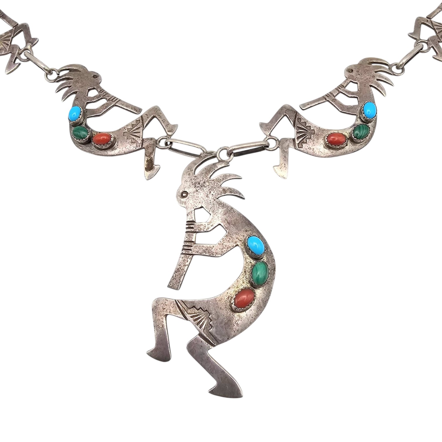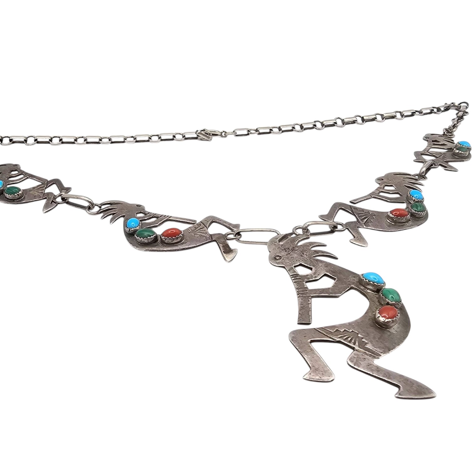 Handcrafted Navajo necklace made of sterling silver, featuring Kokopelli figures adorned with turquoise, coral, and malachite stones. The design includes multiple connected Kokopelli pieces and a chain clasp. Weighs approximately 35.9 grams. Considered a collectible Native American jewelry piece.
