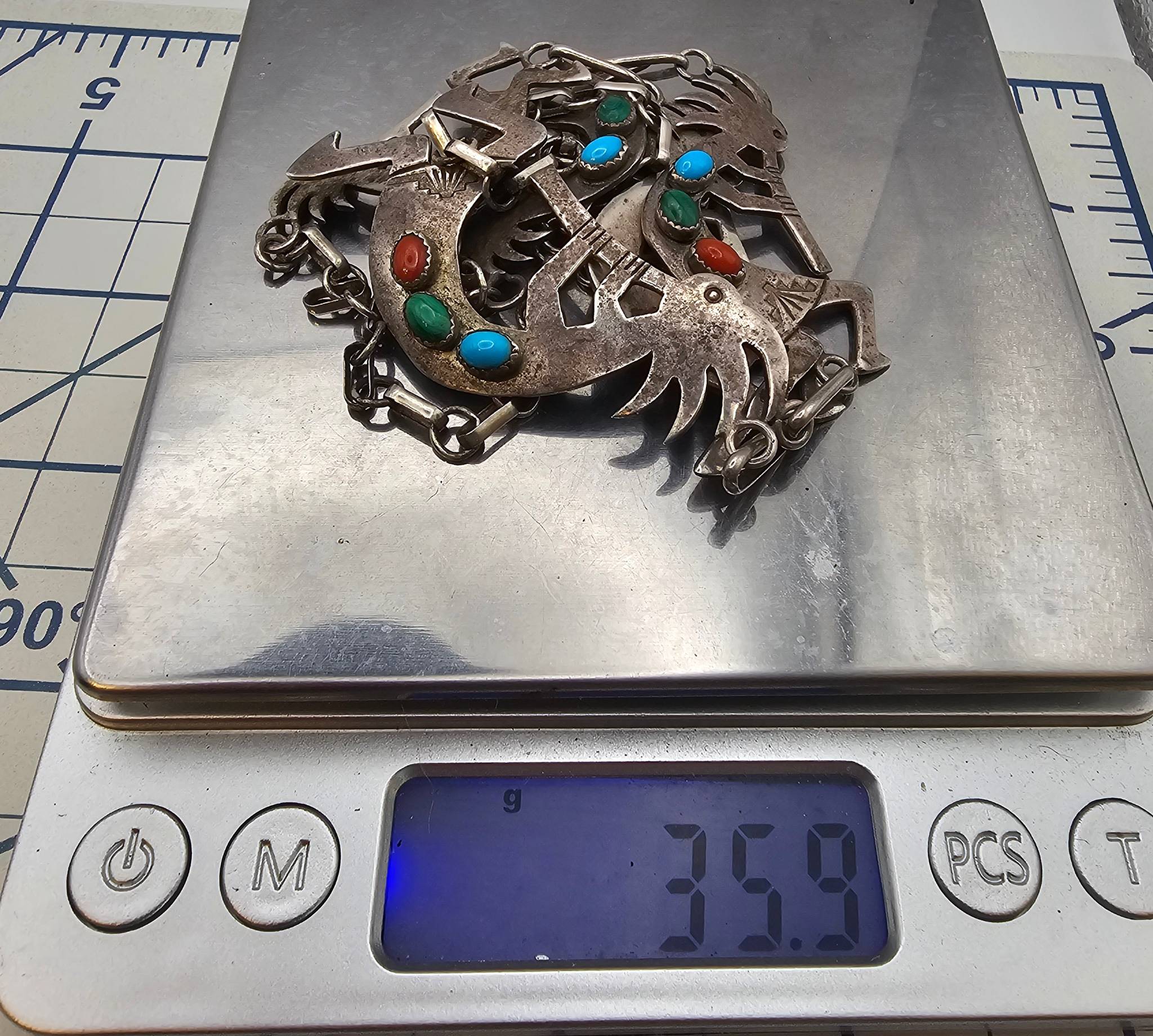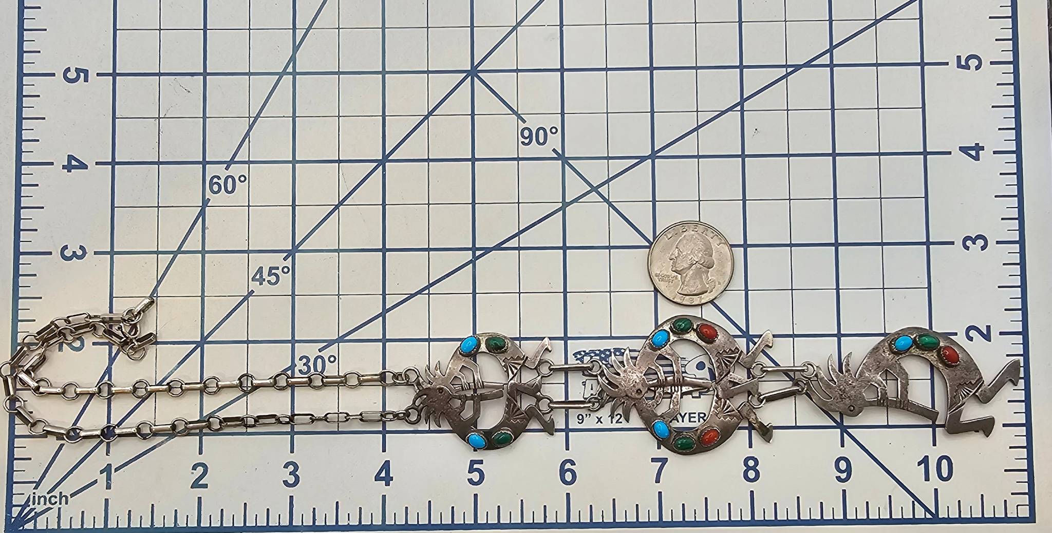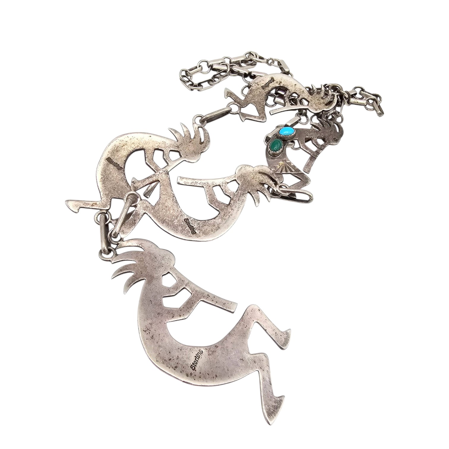 Handcrafted Navajo necklace made of sterling silver, featuring Kokopelli figures adorned with turquoise, coral, and malachite stones. The design includes multiple connected Kokopelli pieces and a chain clasp. Weighs approximately 35.9 grams. Considered a collectible Native American jewelry piece.