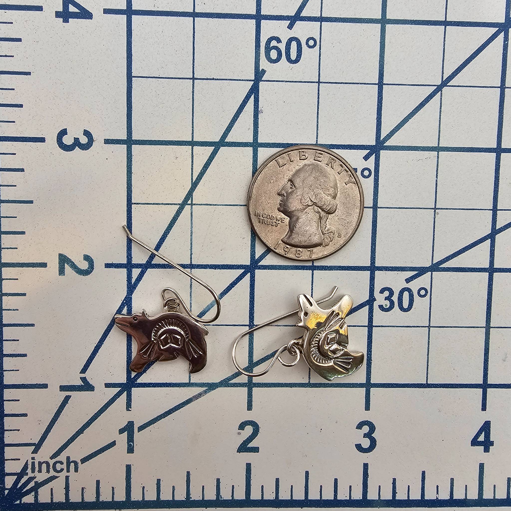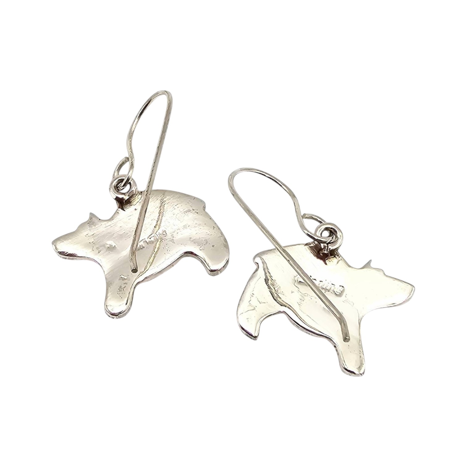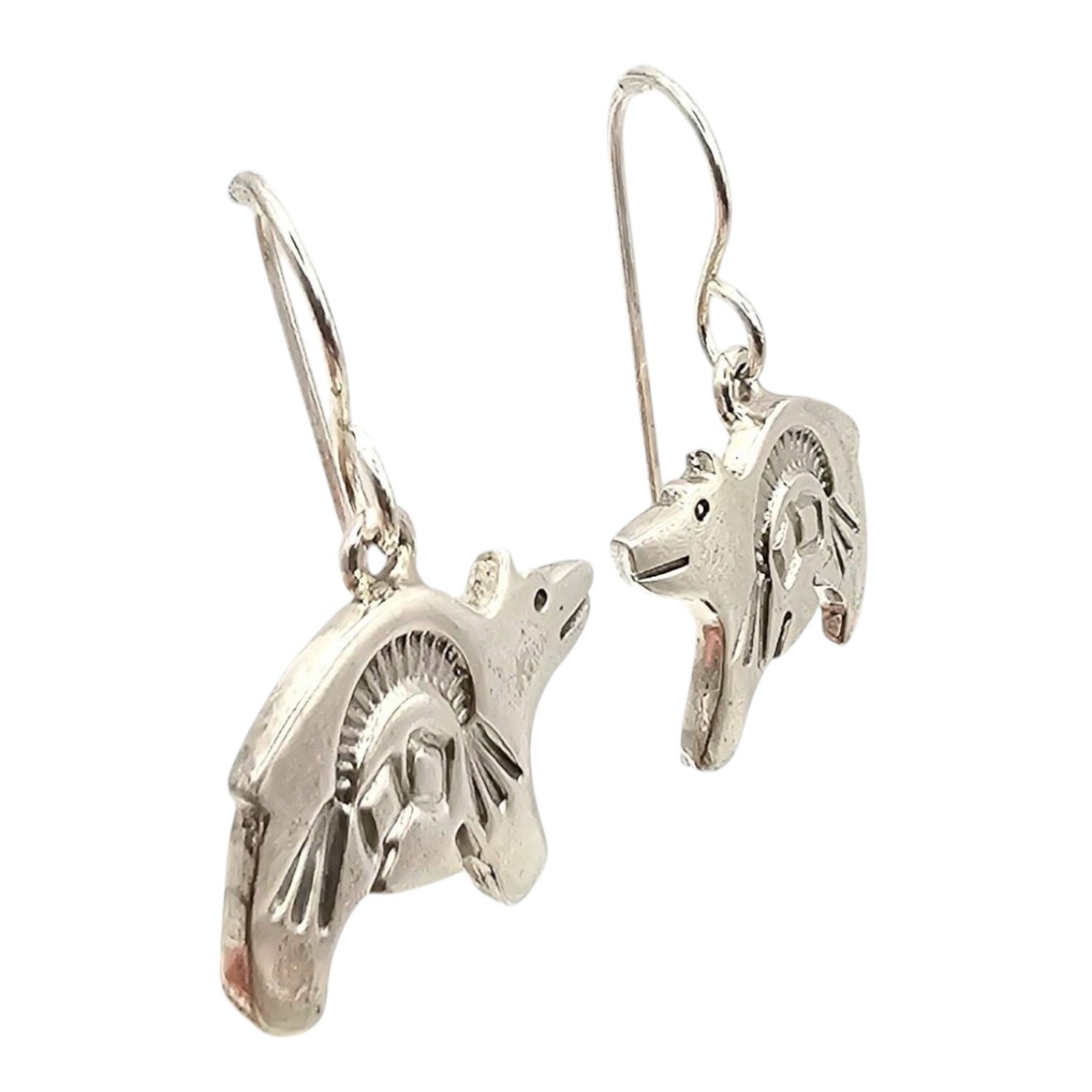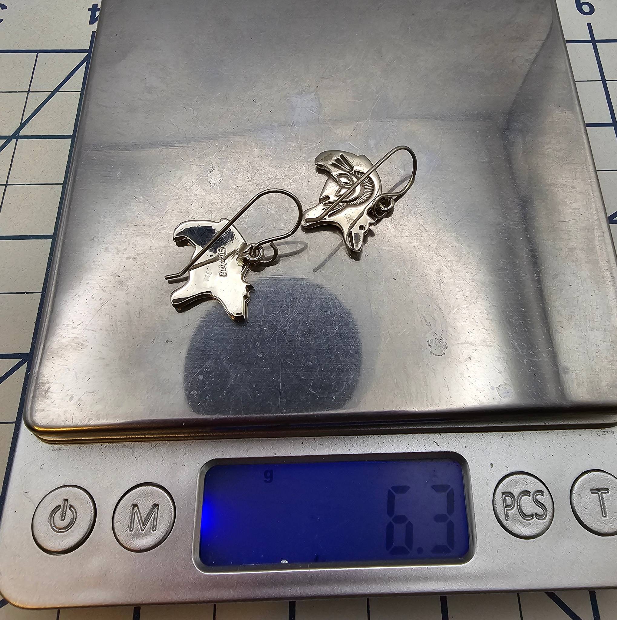 Navajo handmade sterling silver earrings crafted by Allen Lee, featuring bear-shaped design with etched details. Marked ‘Sterling’ on the reverse side. The total weight of the earrings is 6.3 grams as shown on the scale. Includes an ear hook design for wearing. Crafted with high-quality sterling silver, likely inspired by traditional Navajo themes.