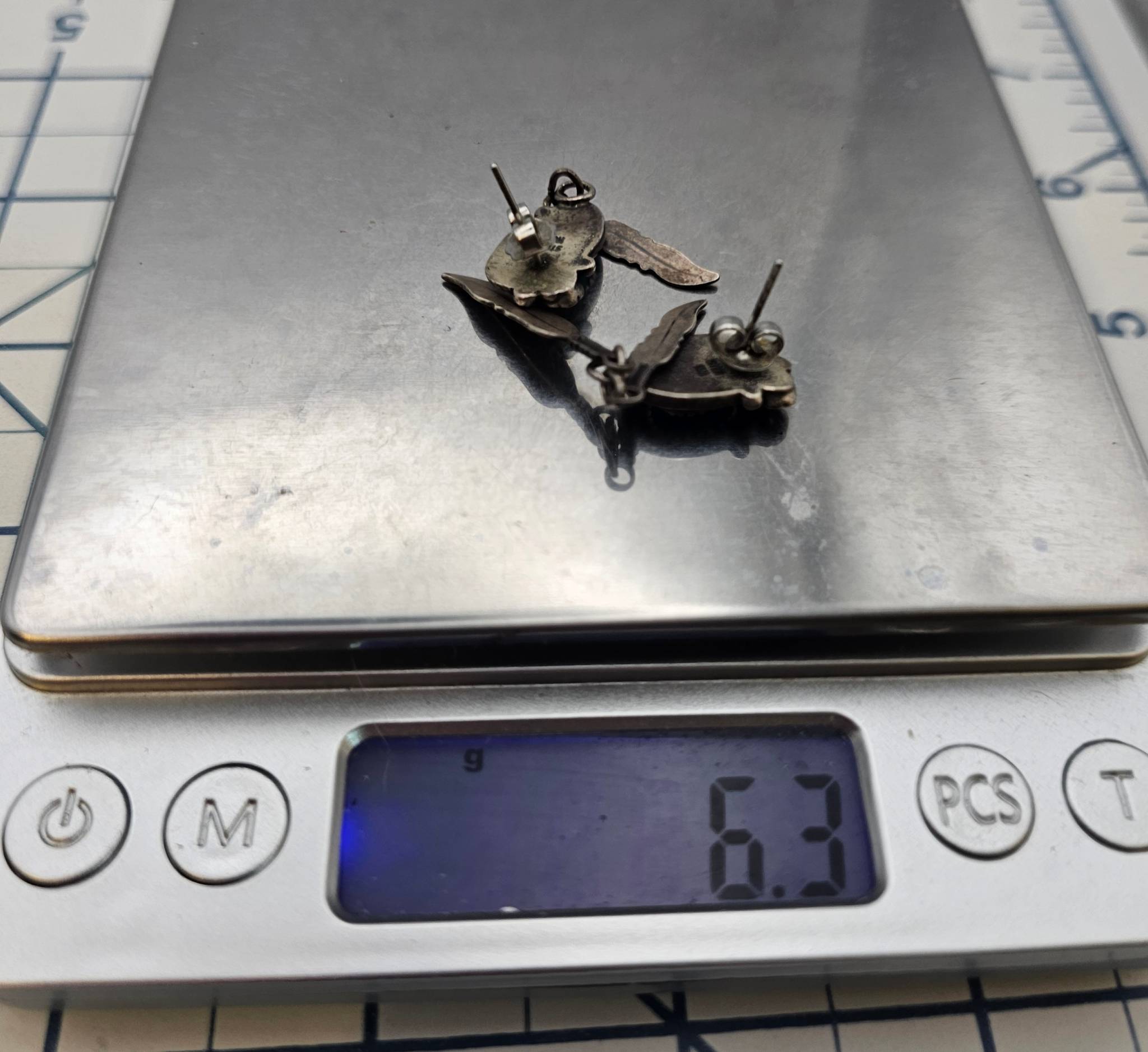 Sterling silver earrings made by Wheeler Manufacturing Co., featuring turquoise stones in a floral and feather motif. These earrings weigh 6.3 grams as shown on a digital scale. They include post-back closures and dangle feather accents. Both are marked with the maker’s hallmark. As is.