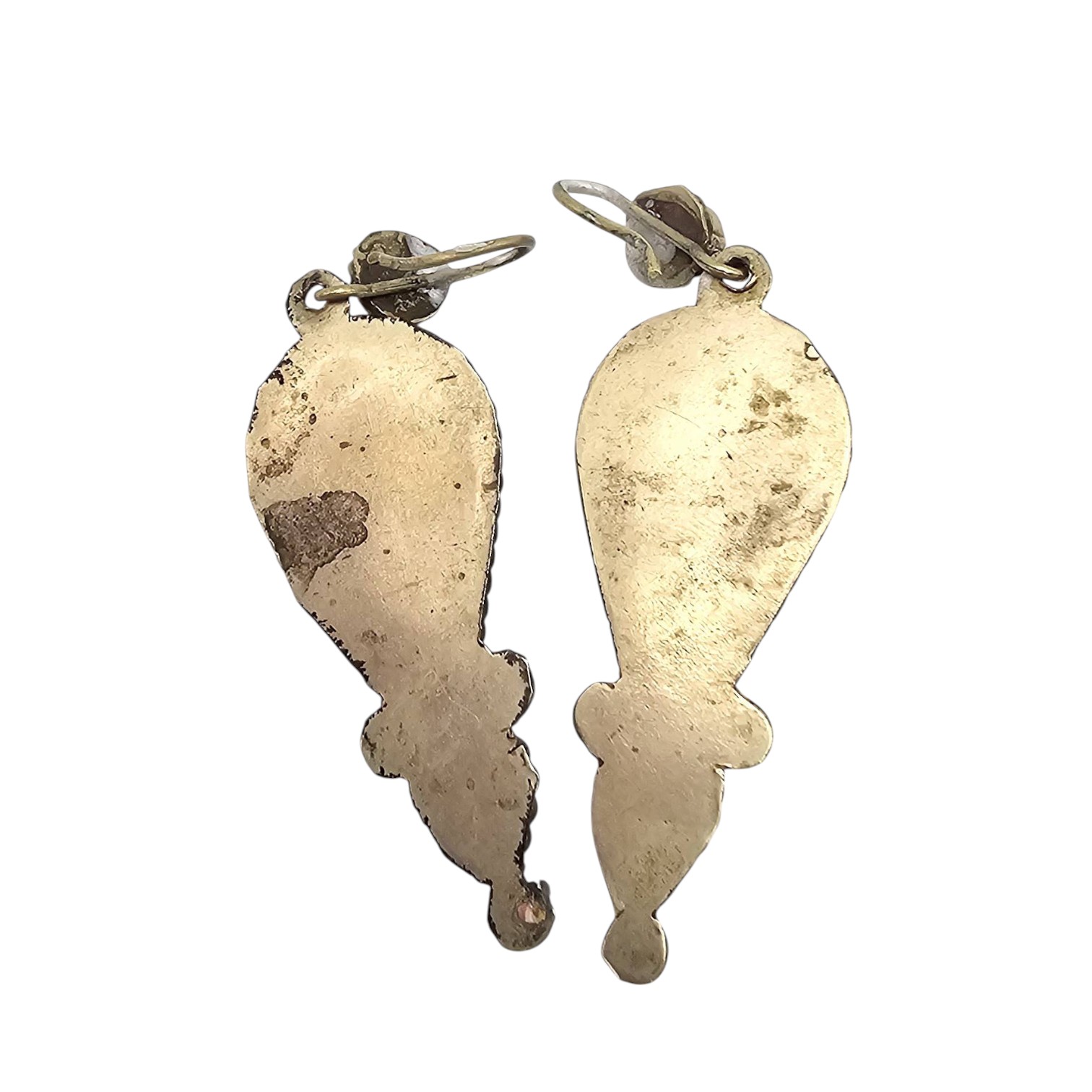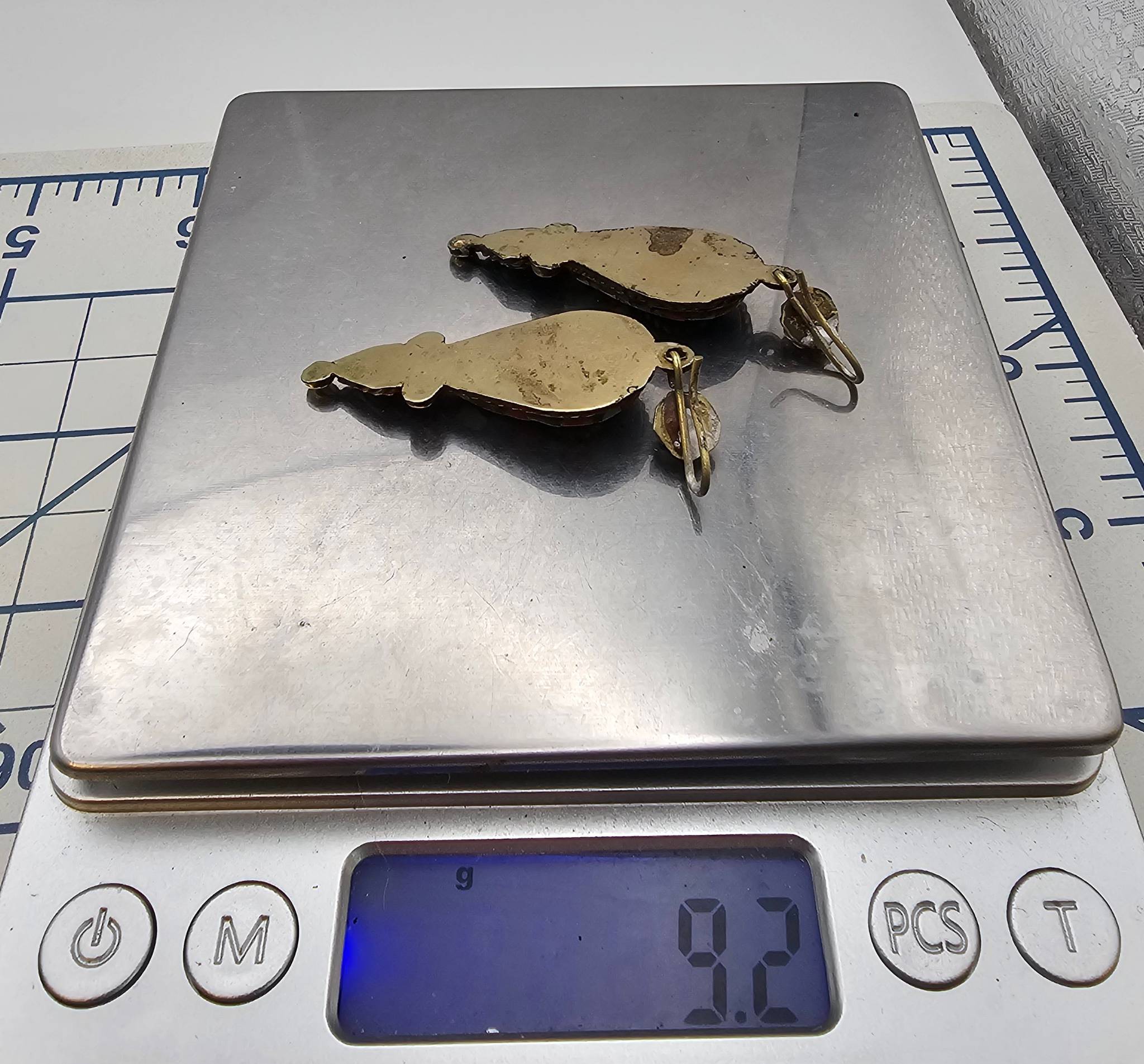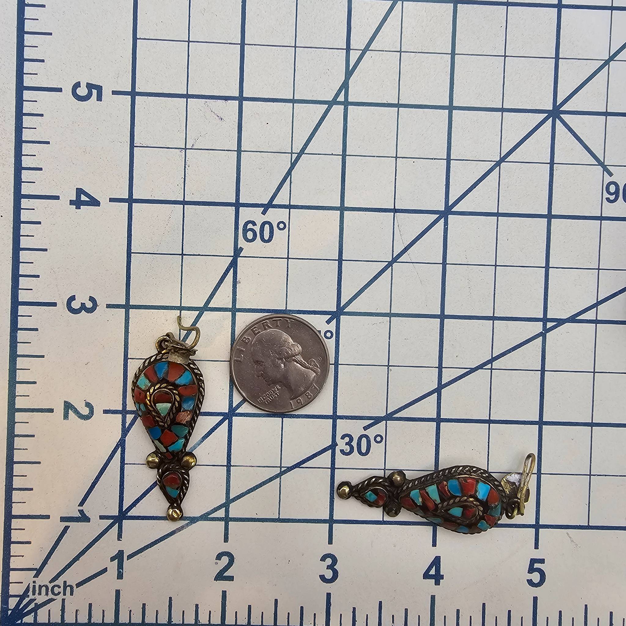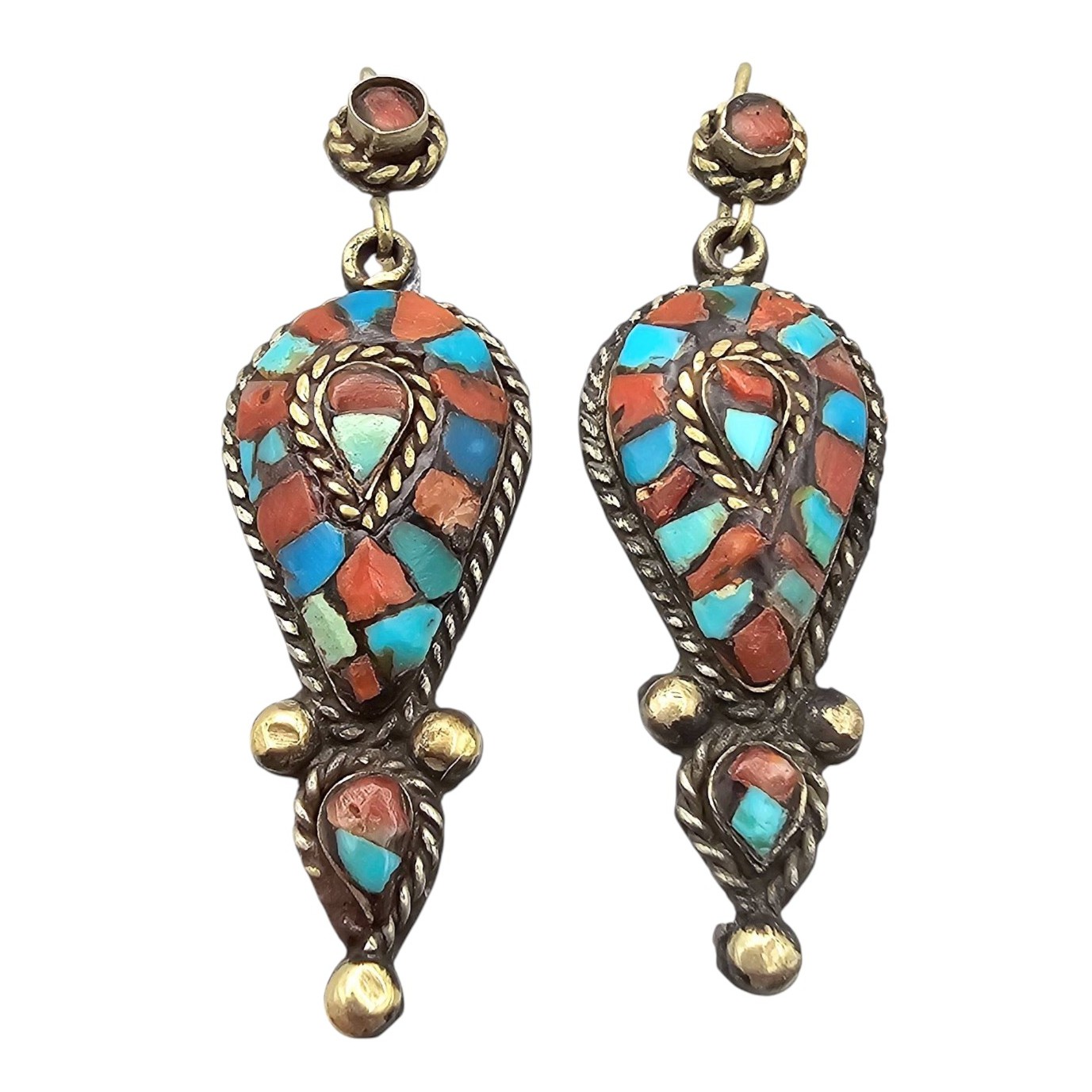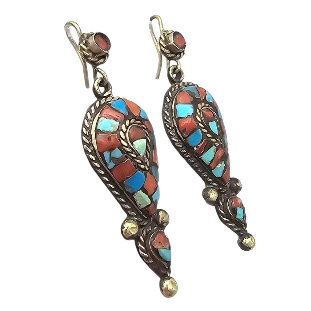 Vintage Tibetan earrings featuring inlaid turquoise and coral stones with intricate designs. The earrings are backed with brass and include a hook clasp mechanism. Each earring measures approximately 2 inches in overall length and weighs a combined 9.2 grams.