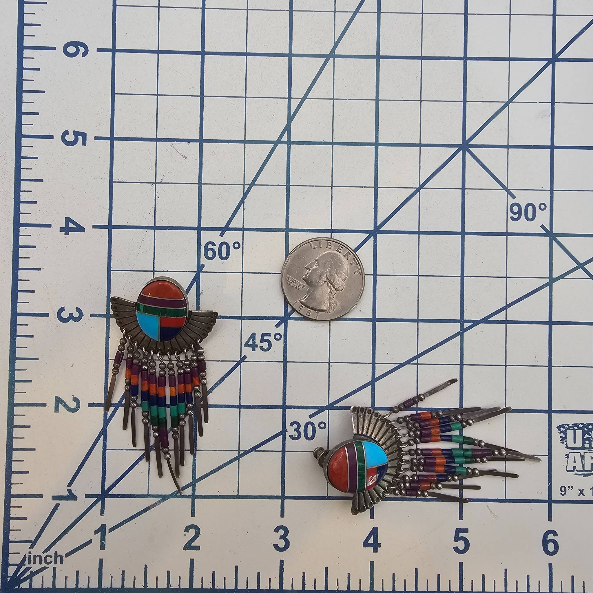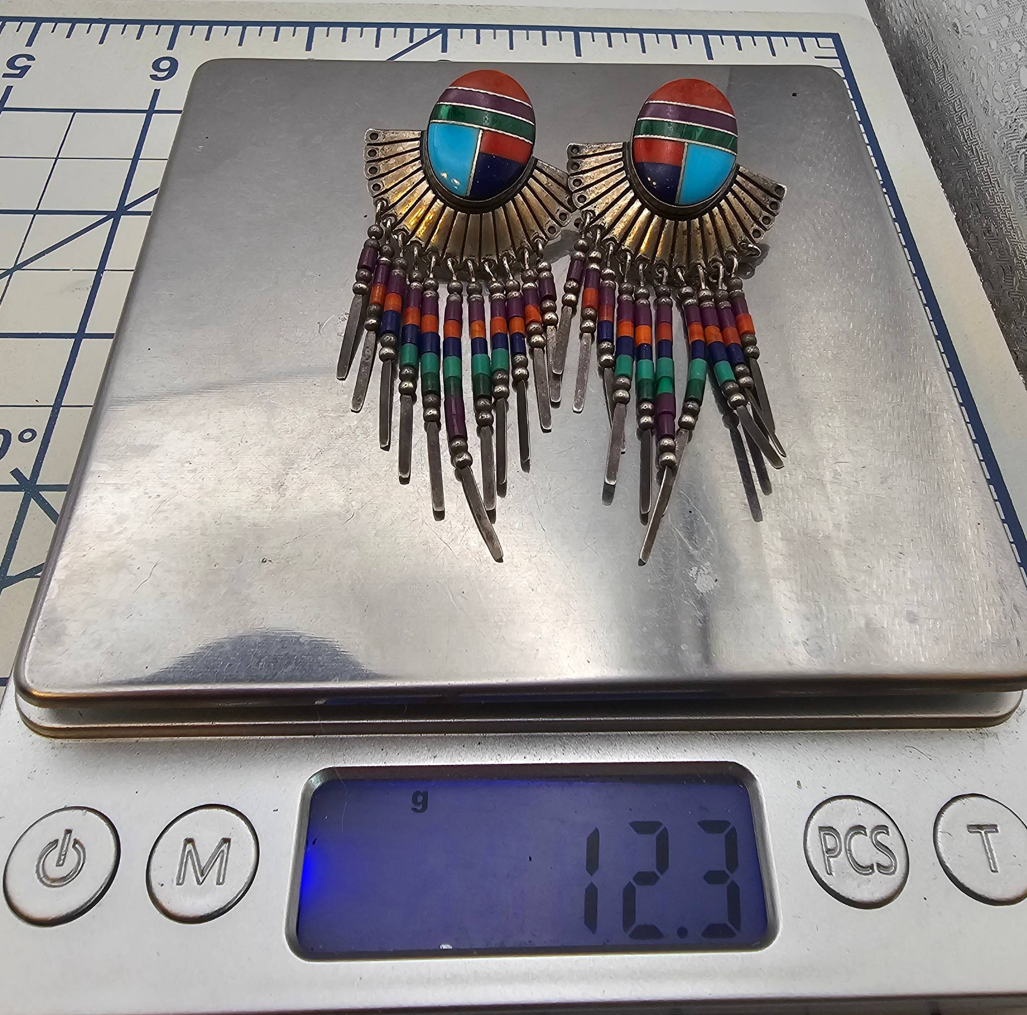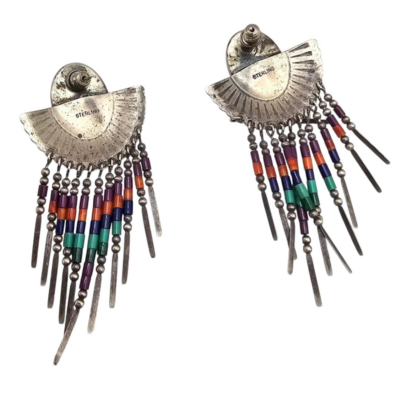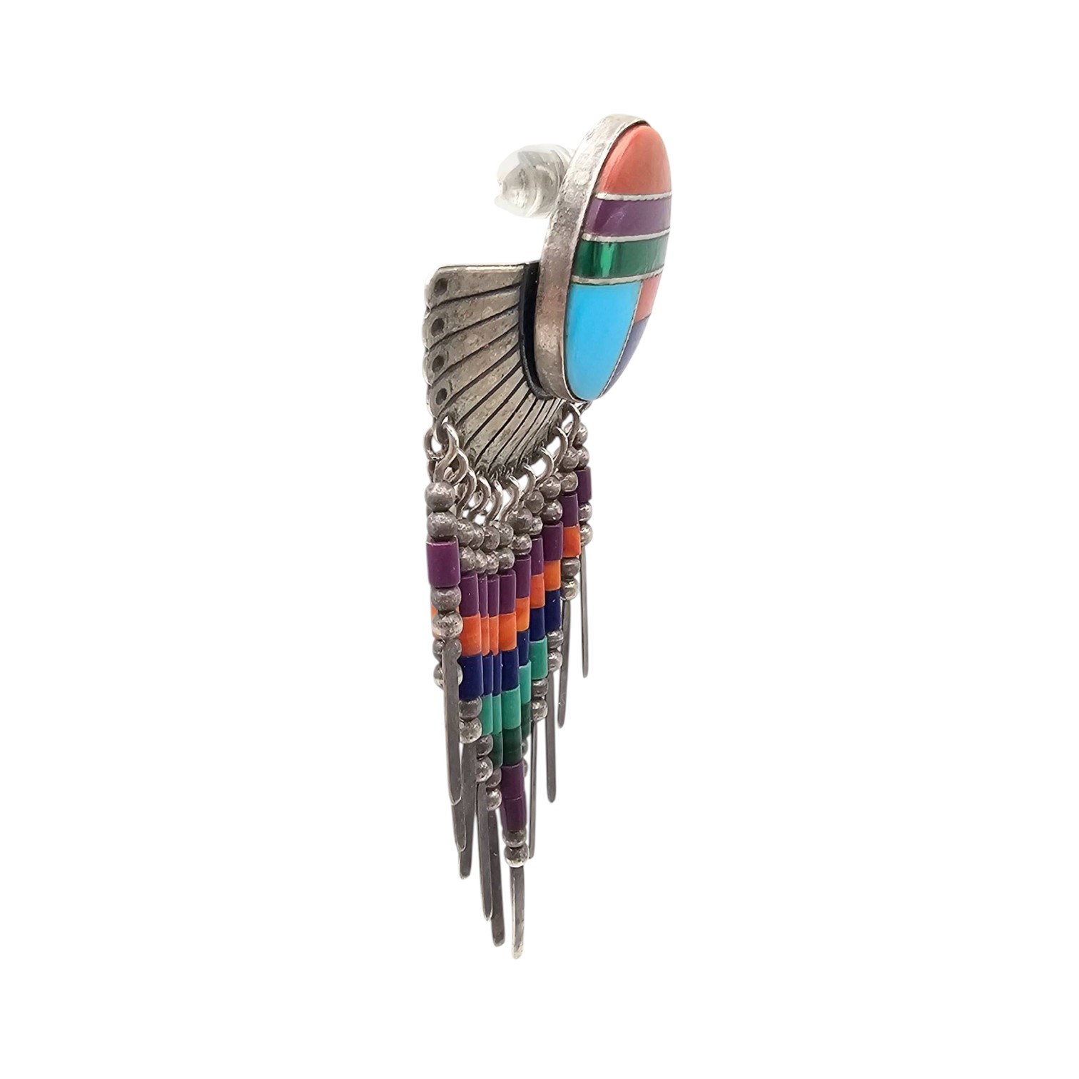 Navajo artisan-crafted earrings featuring sterling silver with a distinctive fringe design. Each earring is adorned with multi-stone inlay, including turquoise, lapis, coral, and malachite. The earrings measure approximately 2.5 inches in length and weigh a combined total of 12.3 grams. Marked sterling on the reverse, ensuring authenticity.
