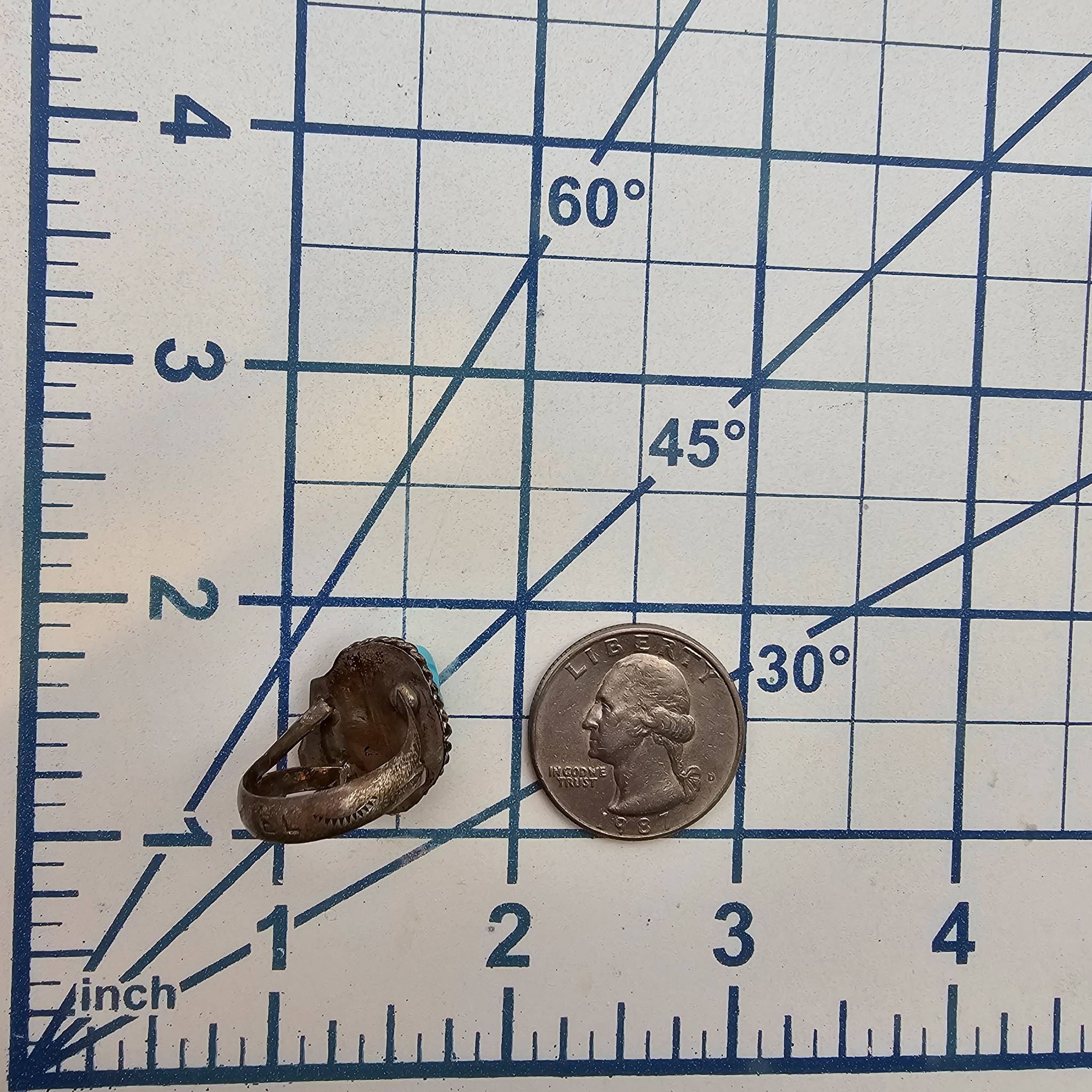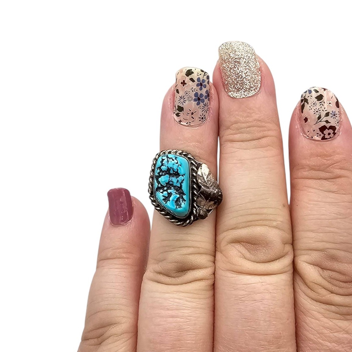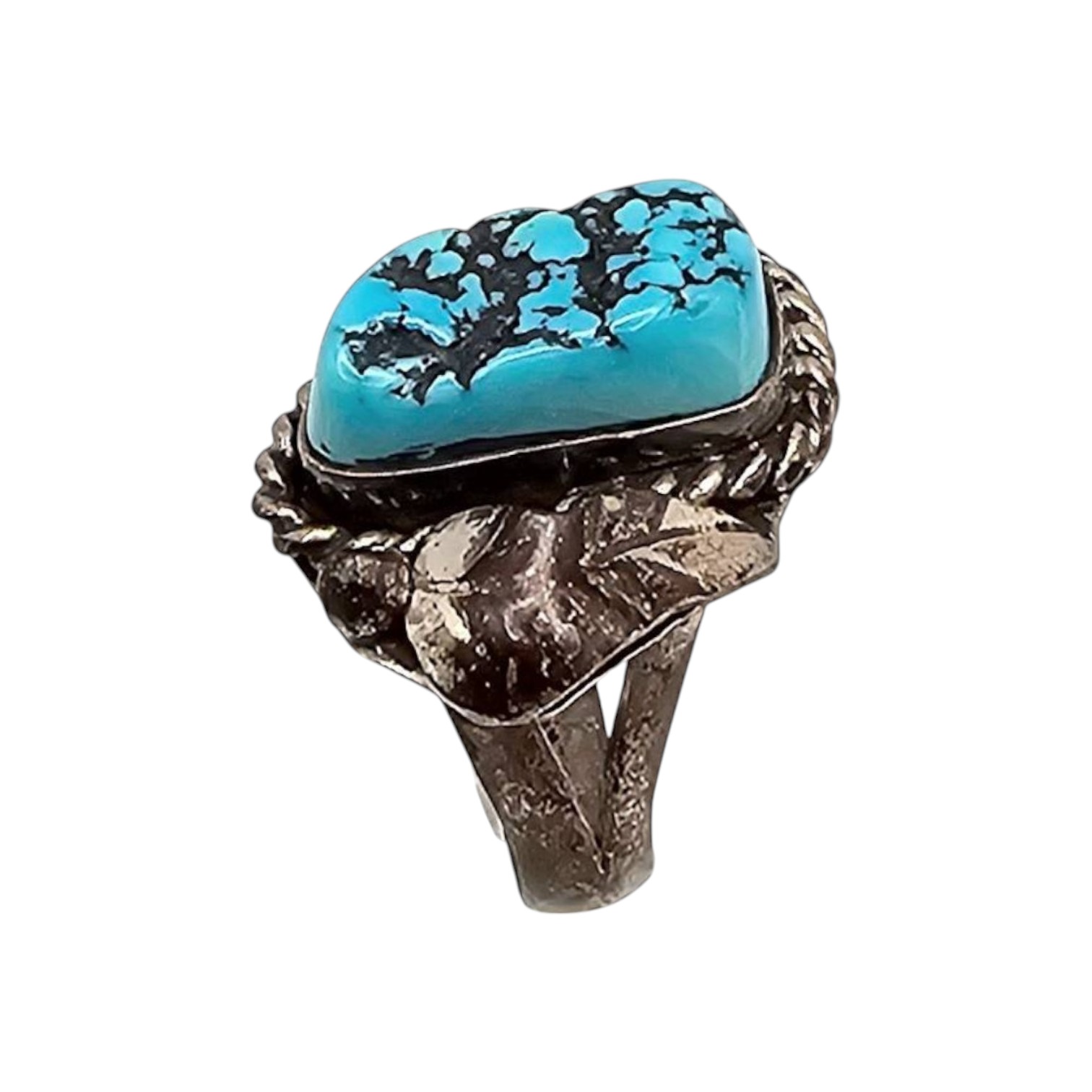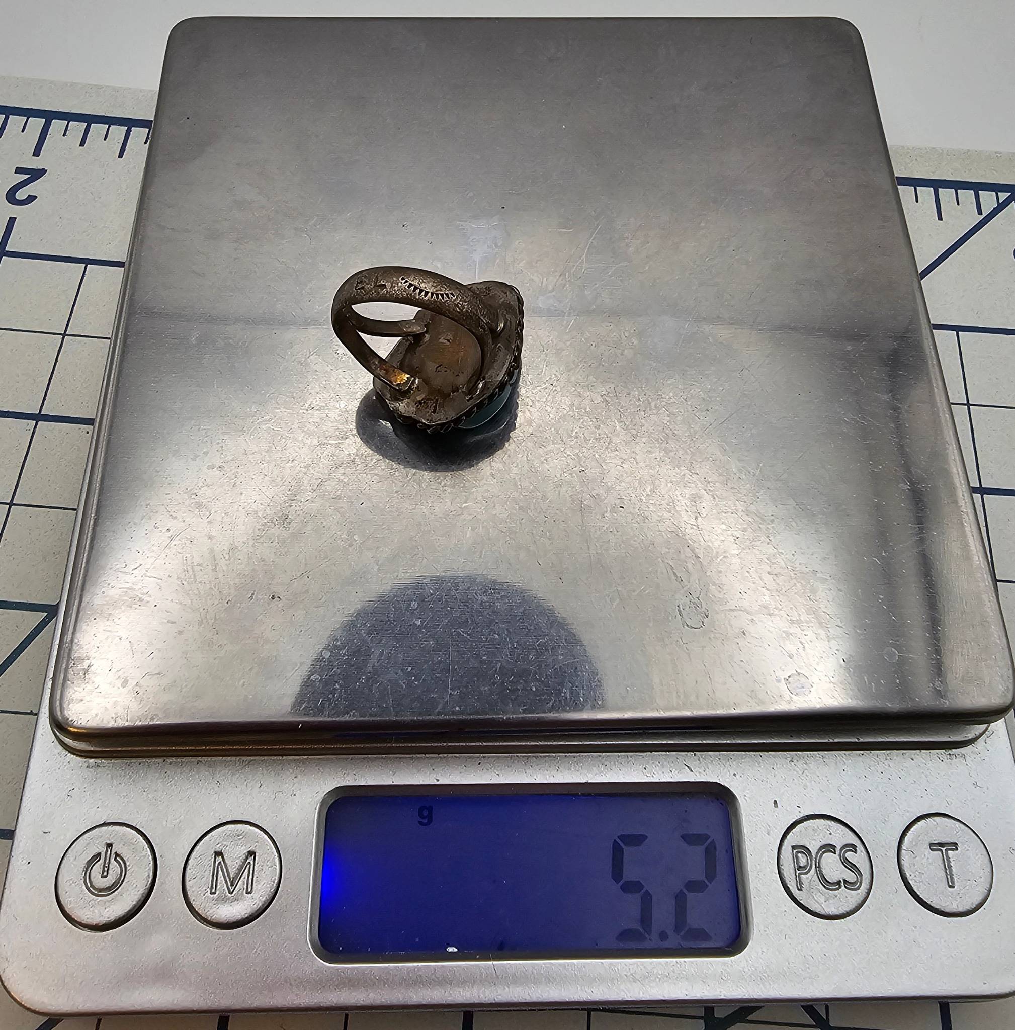 Navajo sterling silver ring featuring a turquoise stone with black matrix. The ring is a size 4.75 and weighs 5.2 grams.
