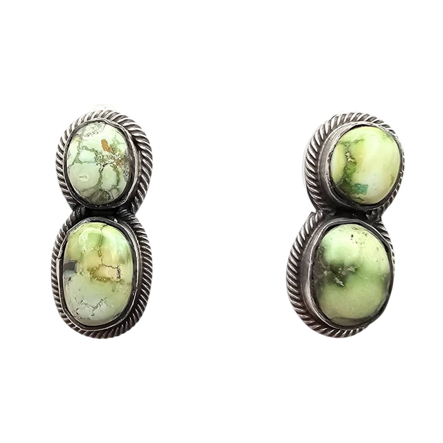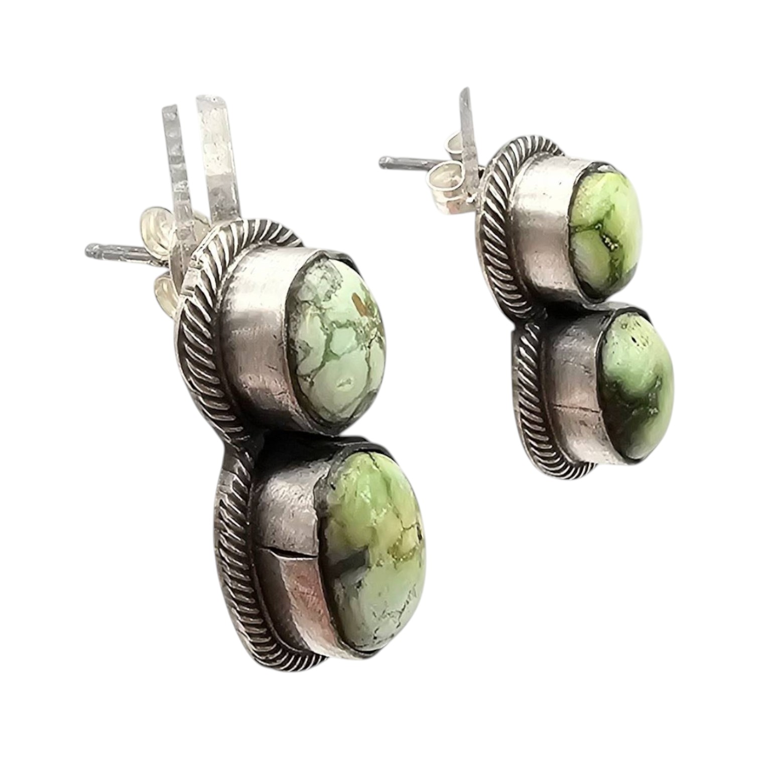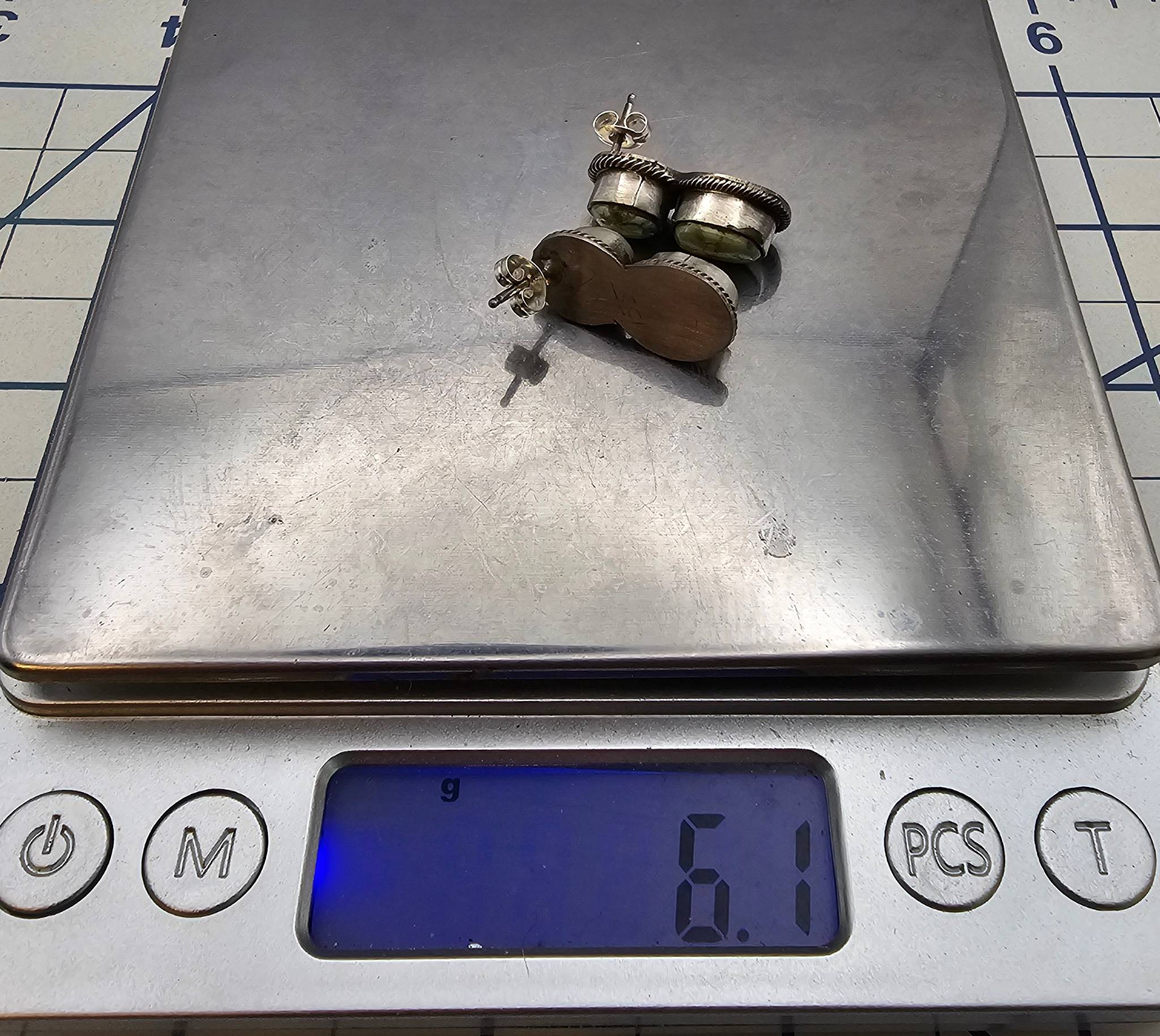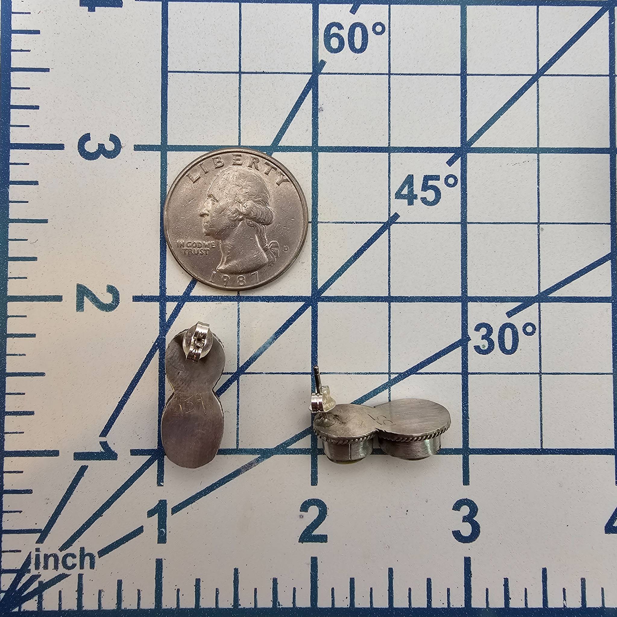 Handmade Navajo earrings by artist Antionette Largo. The earrings are crafted in sterling silver featuring Palomino stones with a green hue and natural matrix. Weight is approximately 6.1 grams. Dimensions shown with ruler and coin for reference.