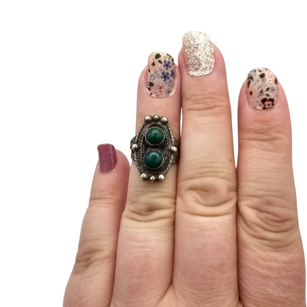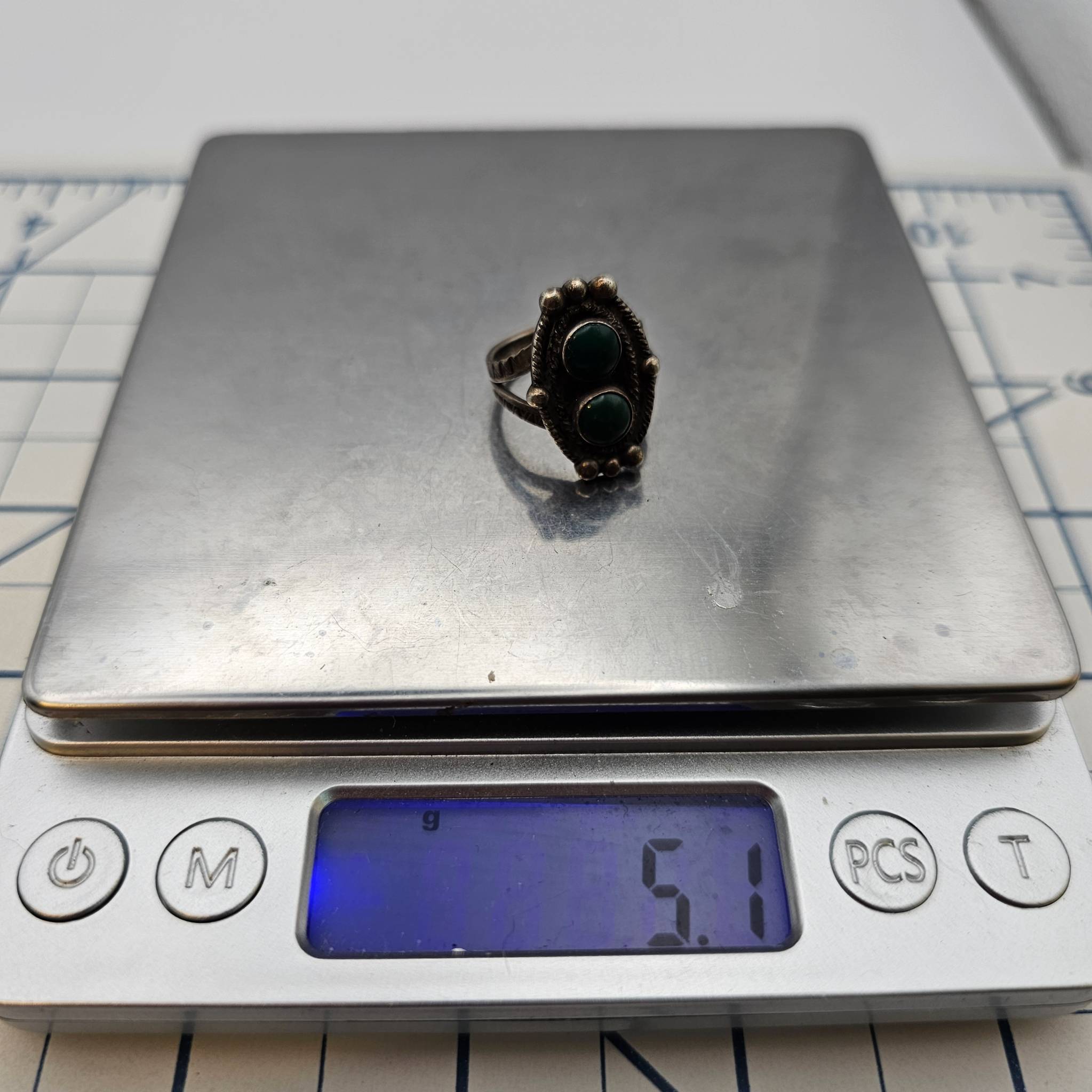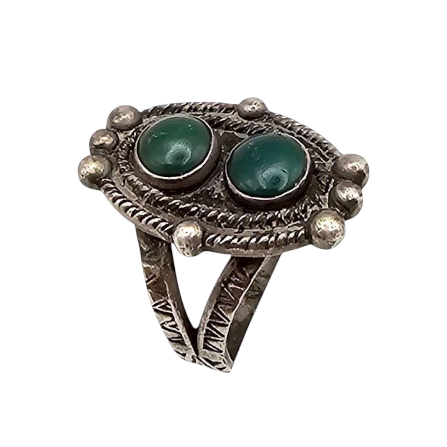 Navajo-crafted sterling silver ring featuring two polished turquoise cabochons. The silver band is intricately designed with twisted rope detailing and silver bead accents surrounding the stones. The ring weighs 5.1 grams and is marked as size 4.5. Made from. sterling silver.