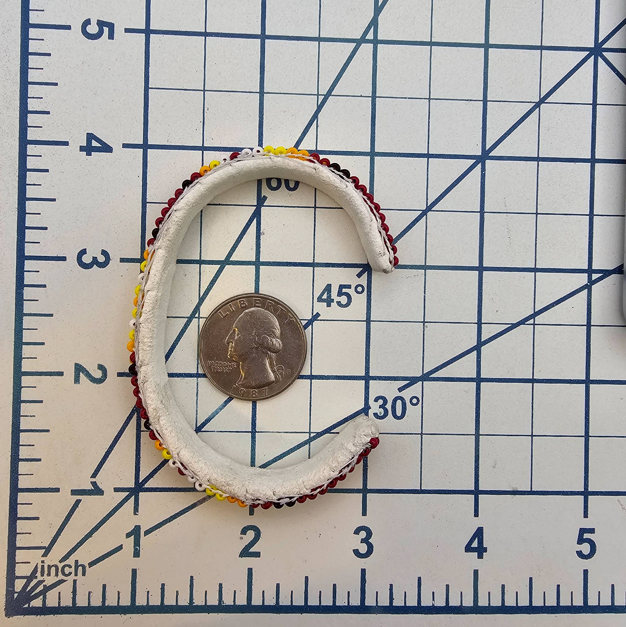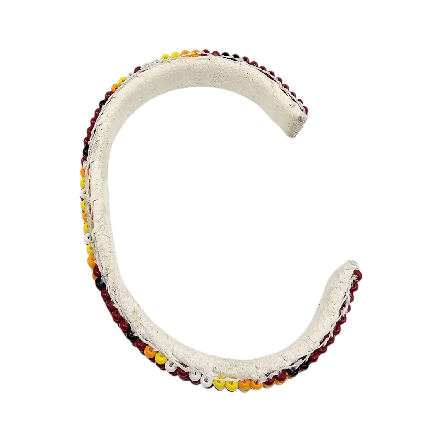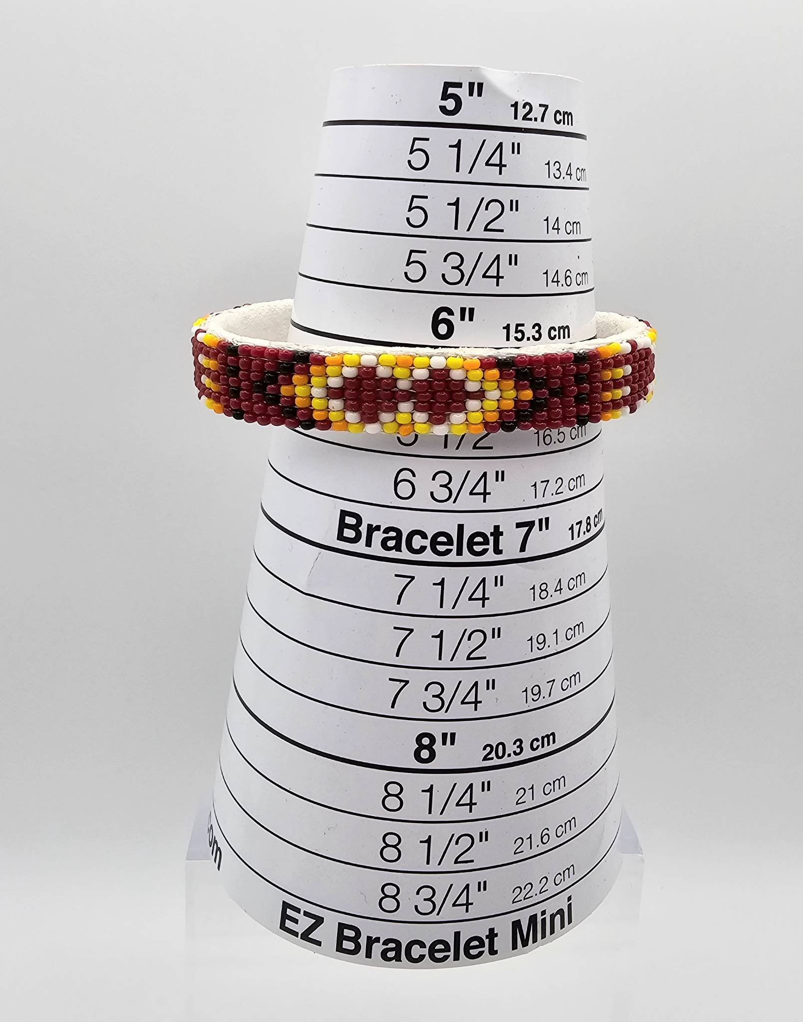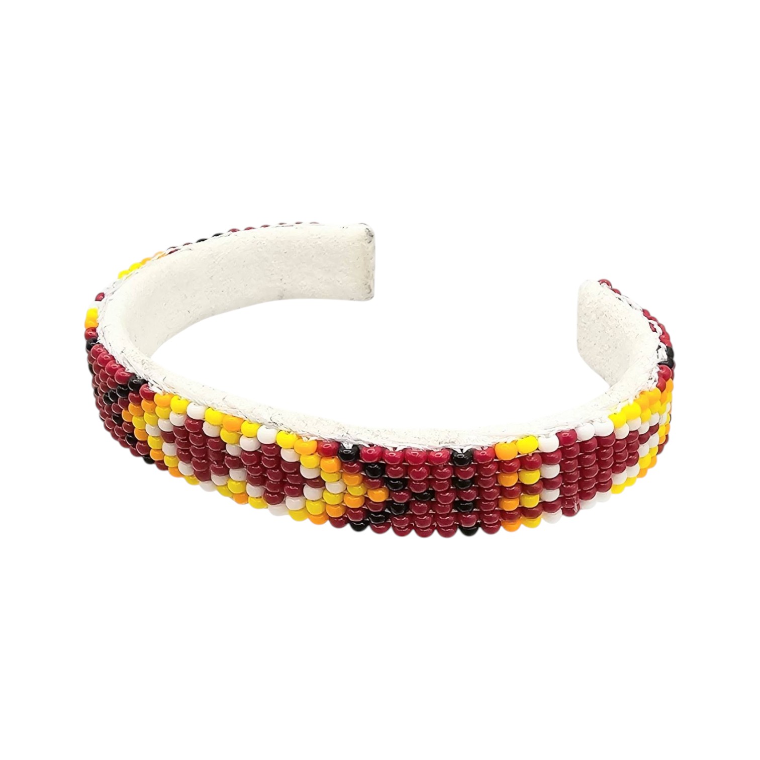 Handmade beaded bracelet by Navajo artisan Ramone Yazzie. Features intricate beadwork in red, yellow, white, and black against a leather base. The bracelet is approximately 3 inches in diameter and fits as a cuff.