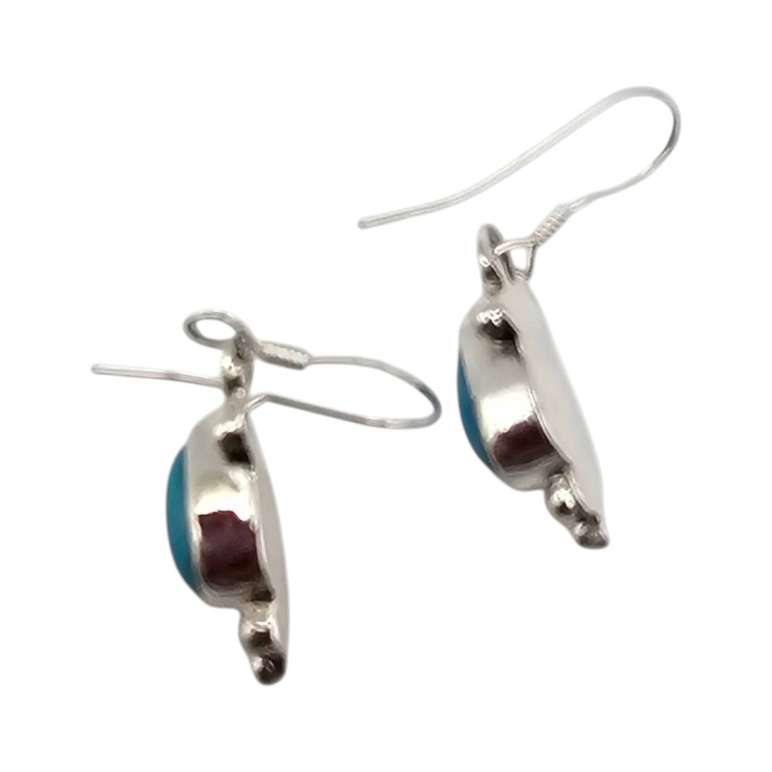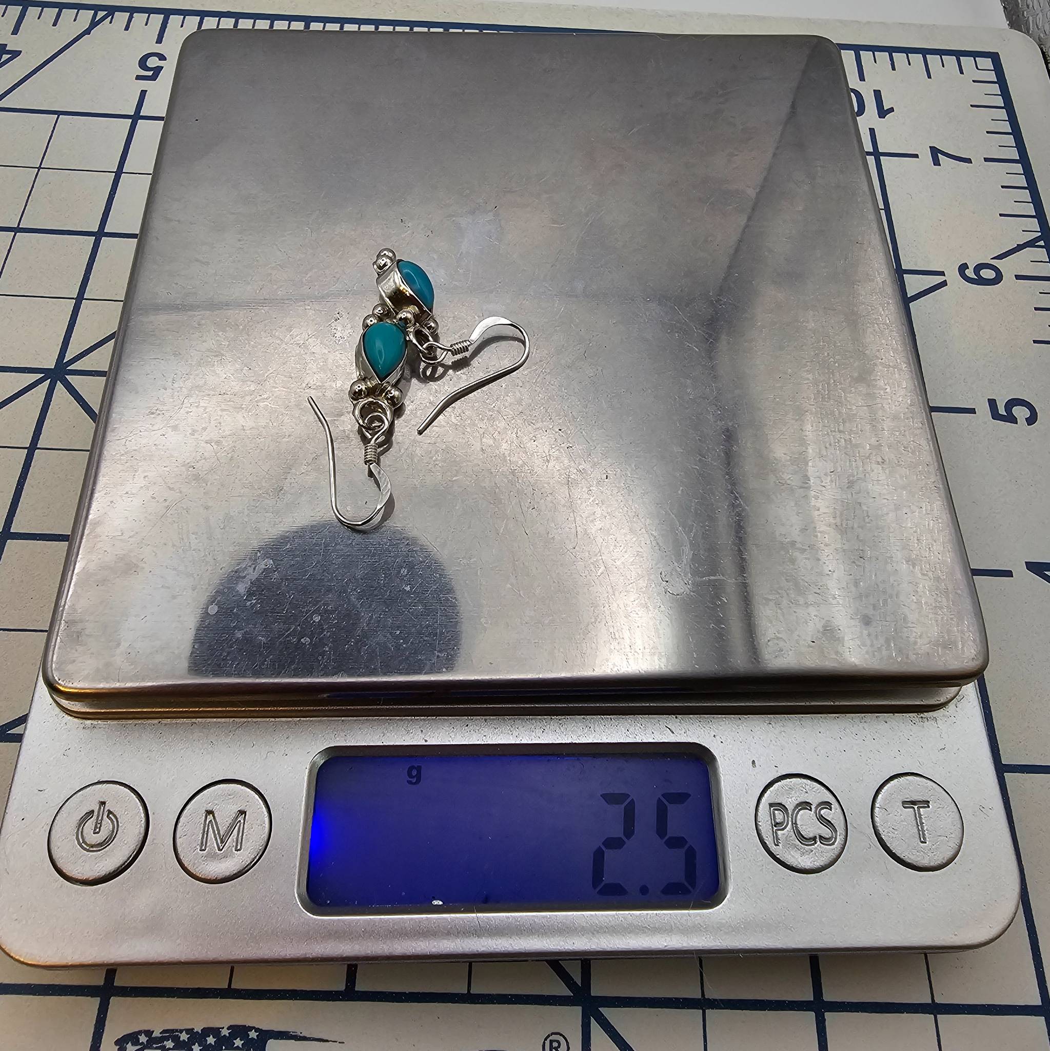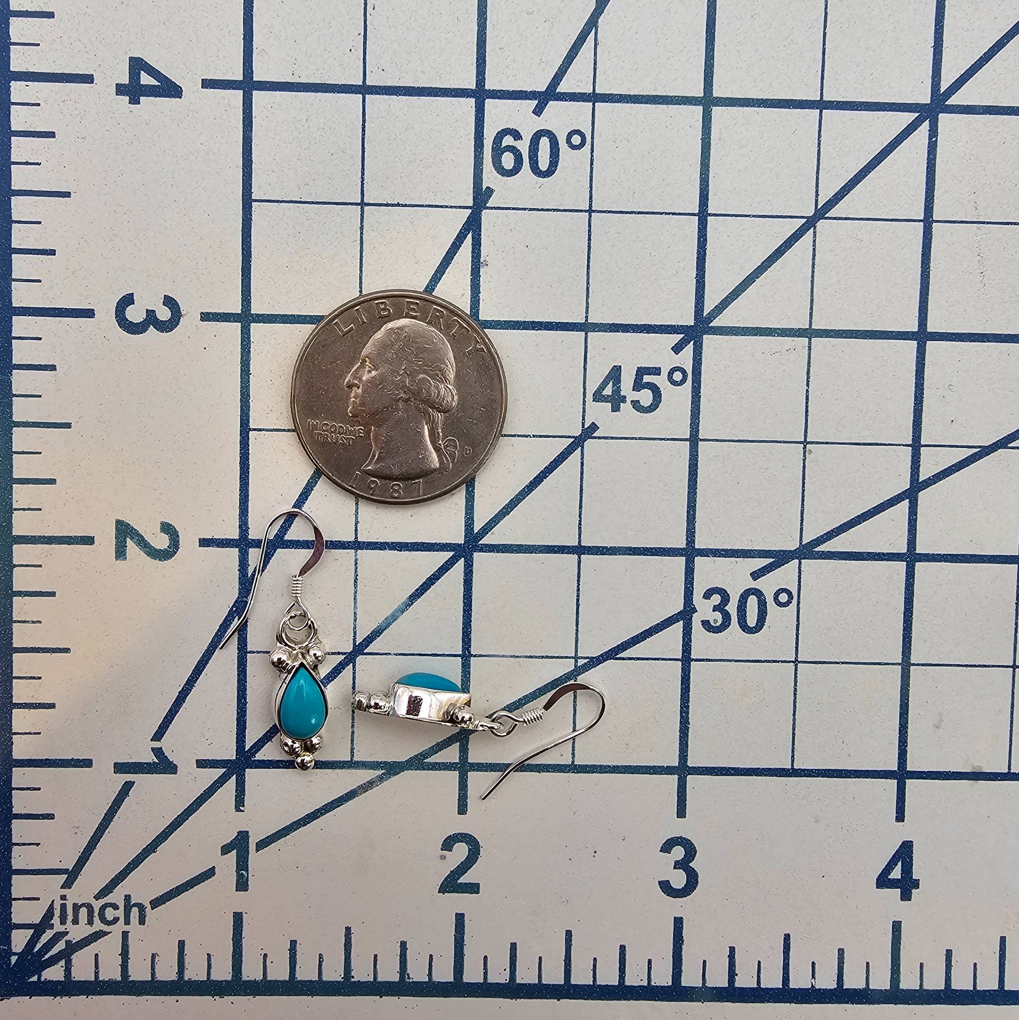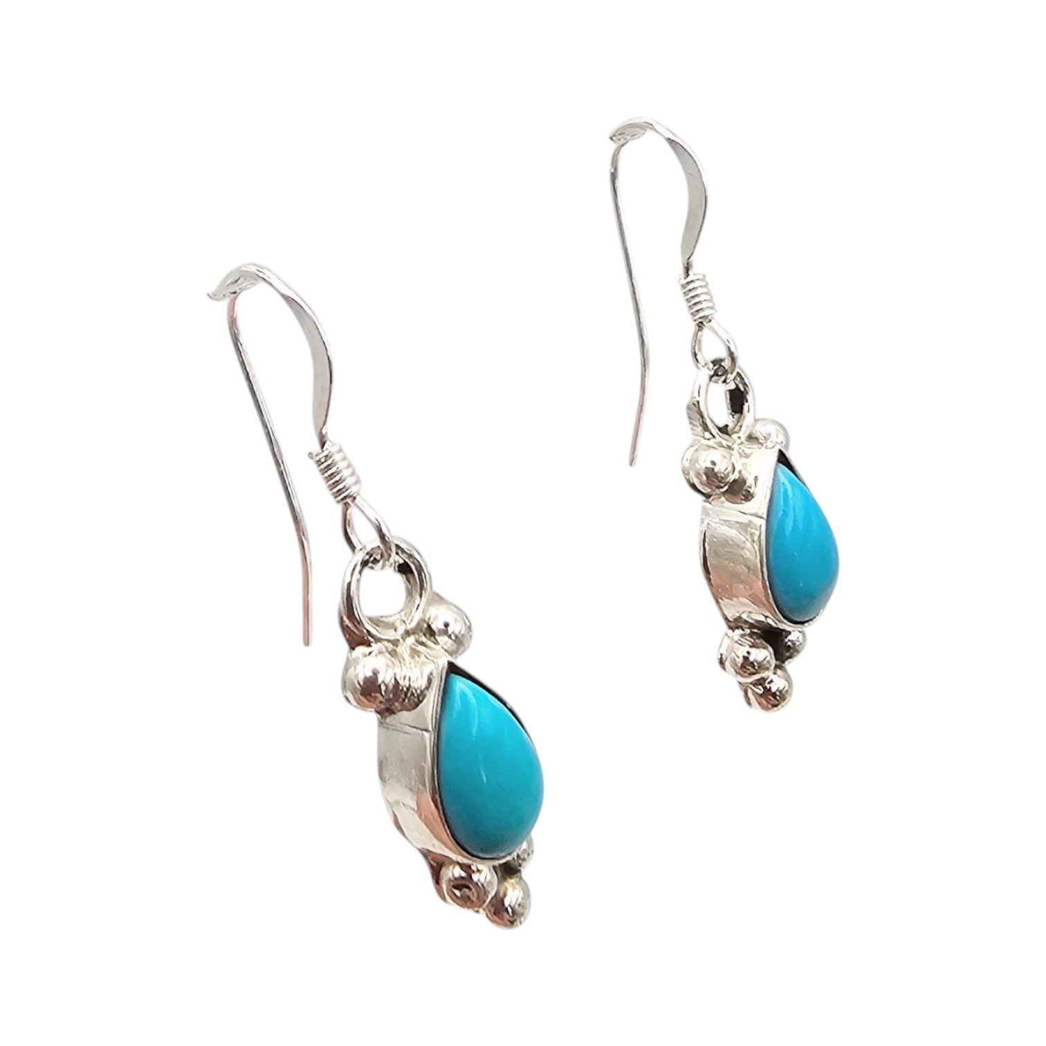Geraldine James Navajo handmade earrings crafted from sterling silver and featuring Kingman turquoise stones. The earrings display a teardrop design with silver bead accents. Measurements provided include a weight of 2.5 grams.