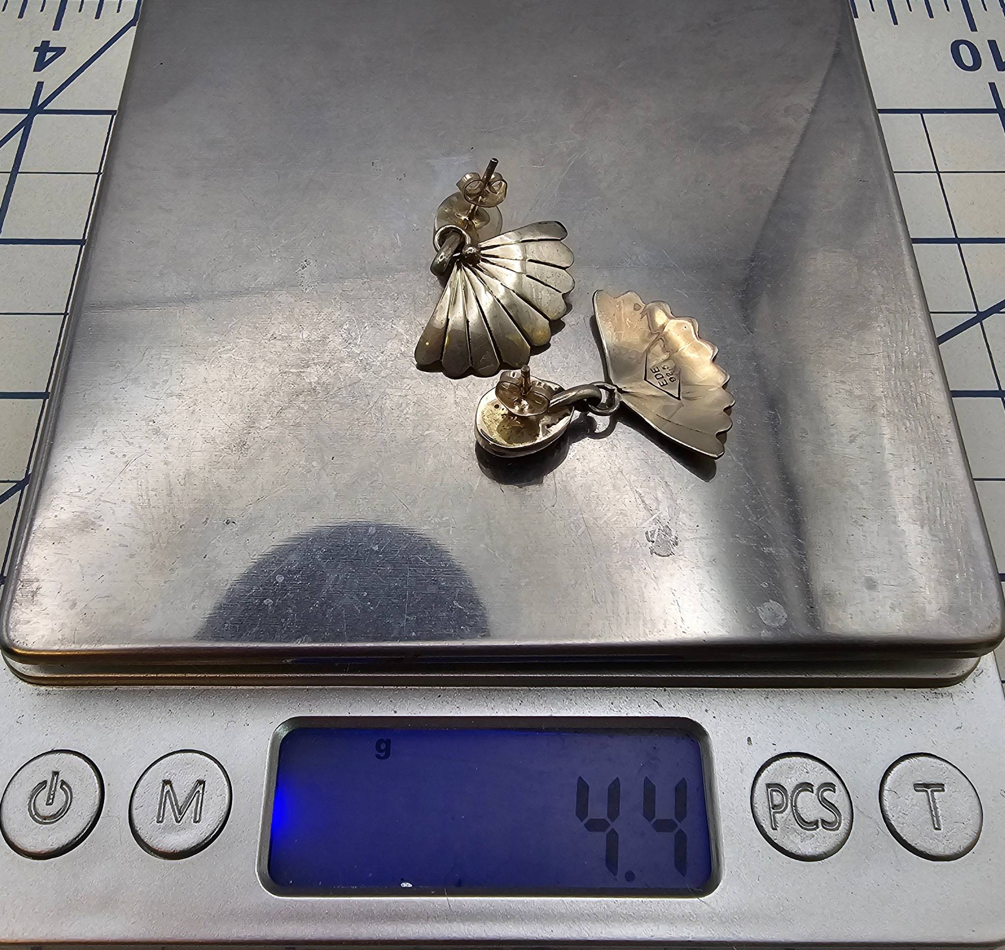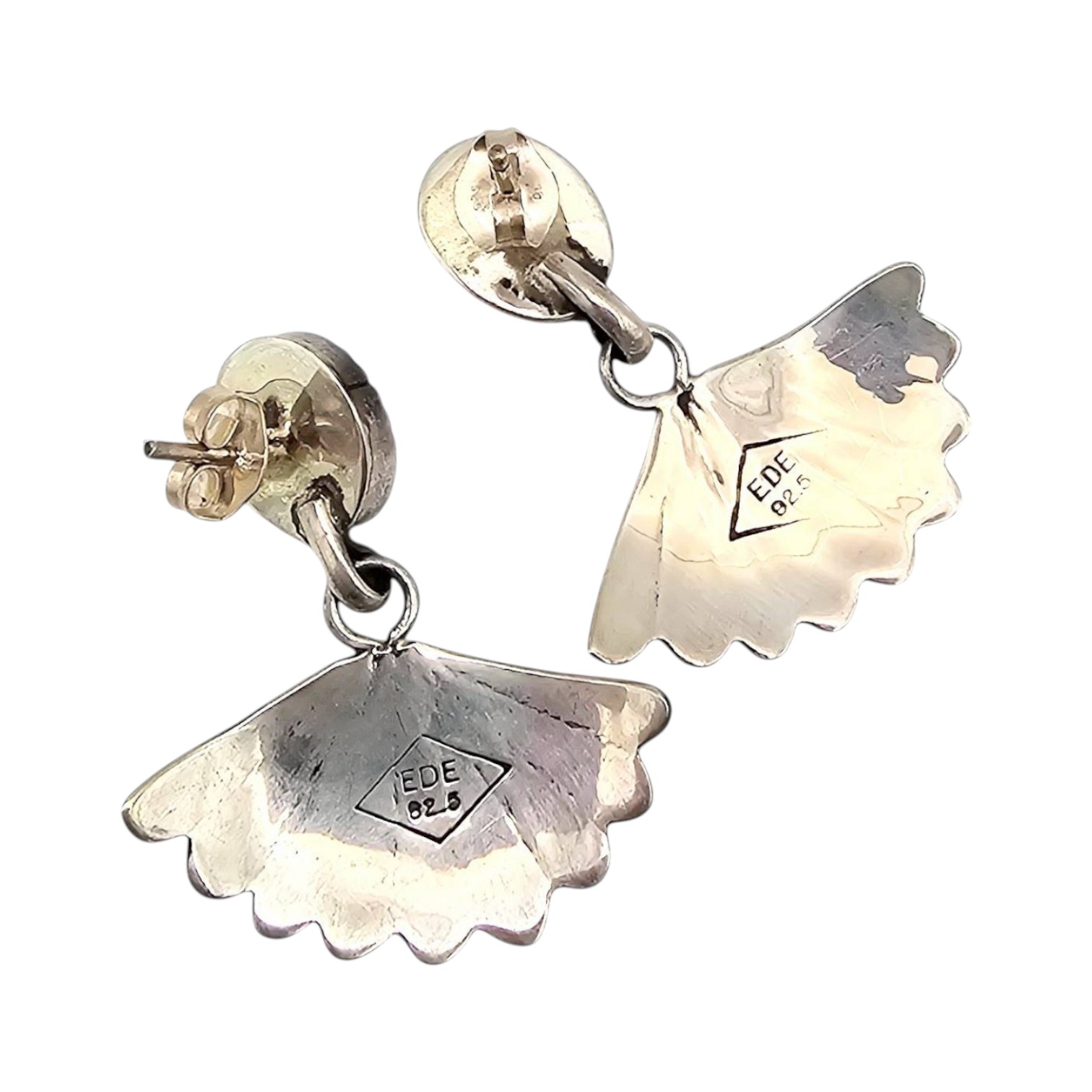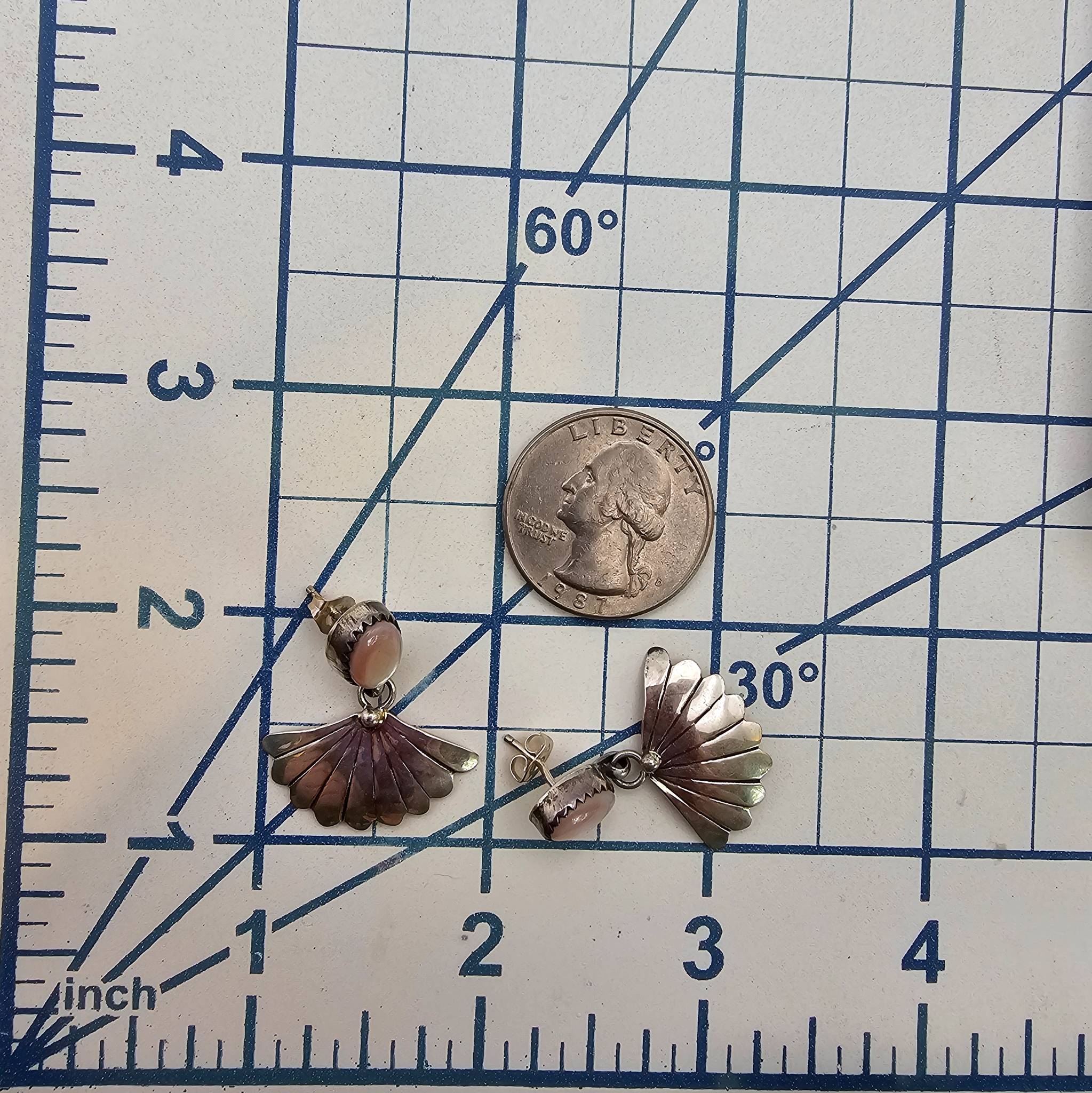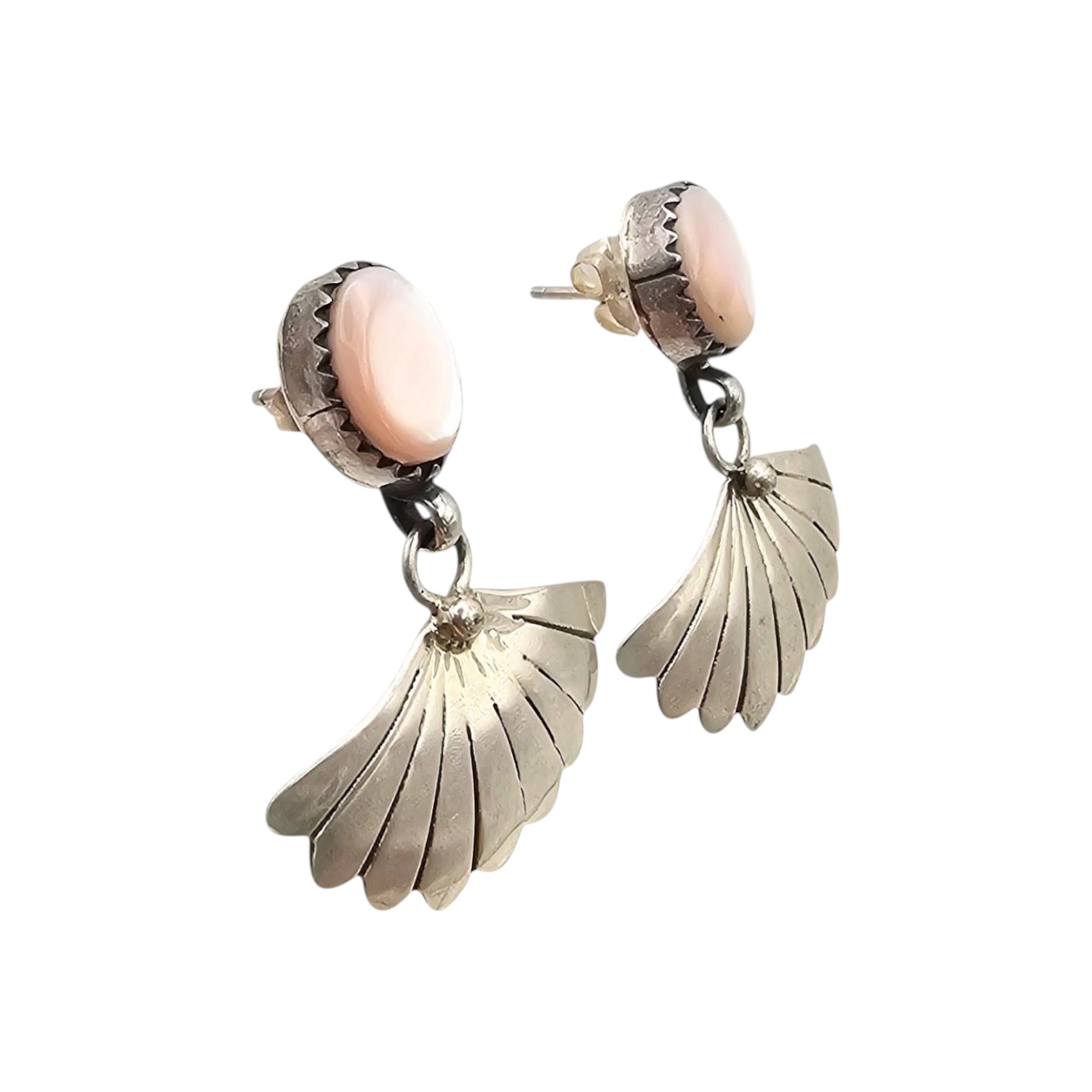 Handcrafted sterling silver earrings created by Navajo artisan Gary Shorty, featuring pink shell accents. Weighing 4.4 grams, these earrings highlight a fan-shaped design with stamped details. Marked ‘TDE ‘ on the reverse to indicate sterling silver composition. Approximately 1.5 inches in length.