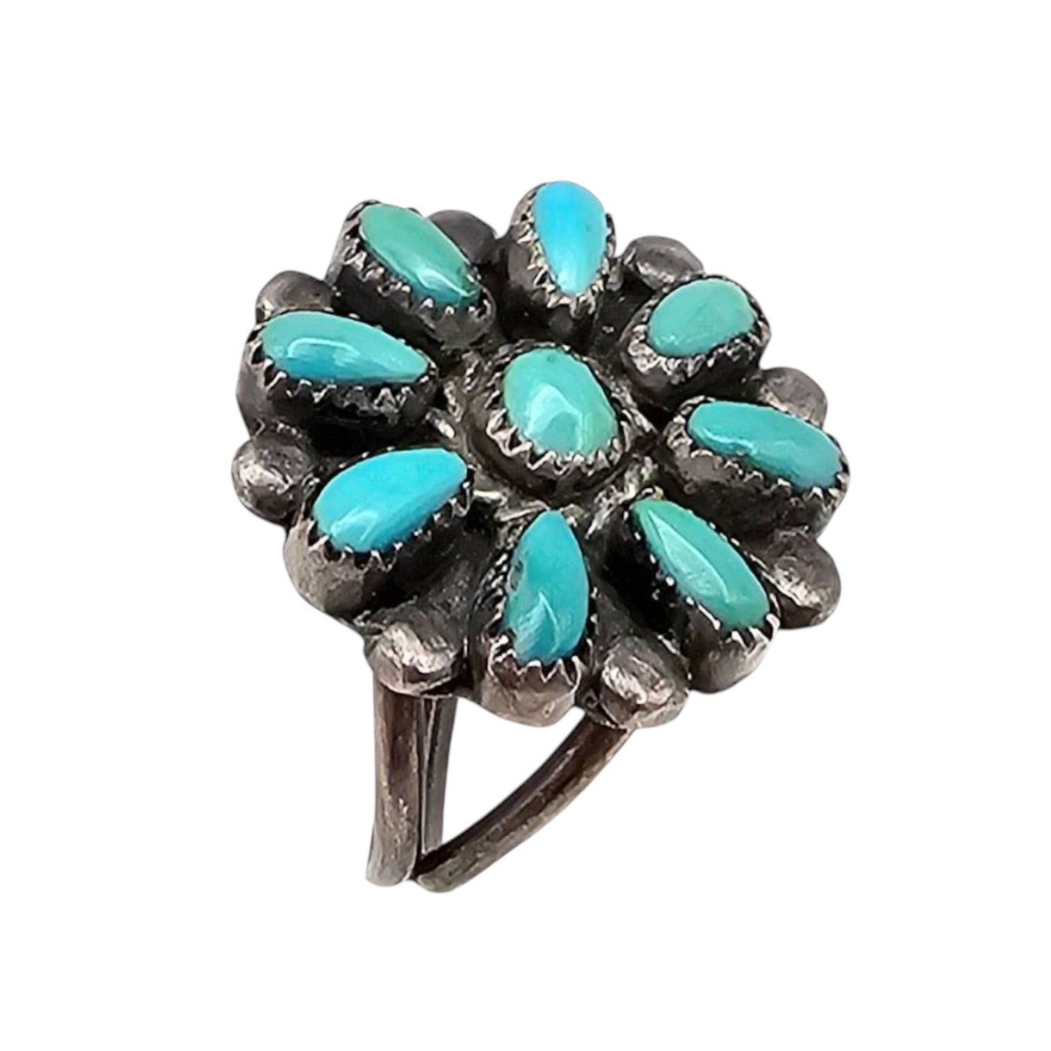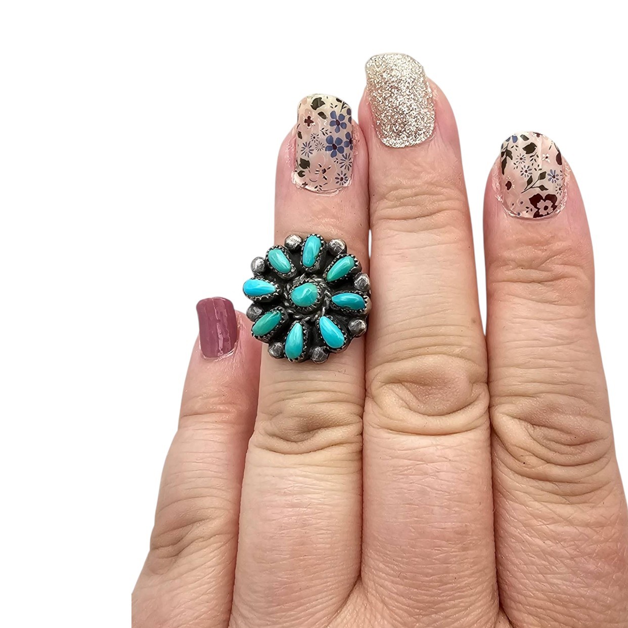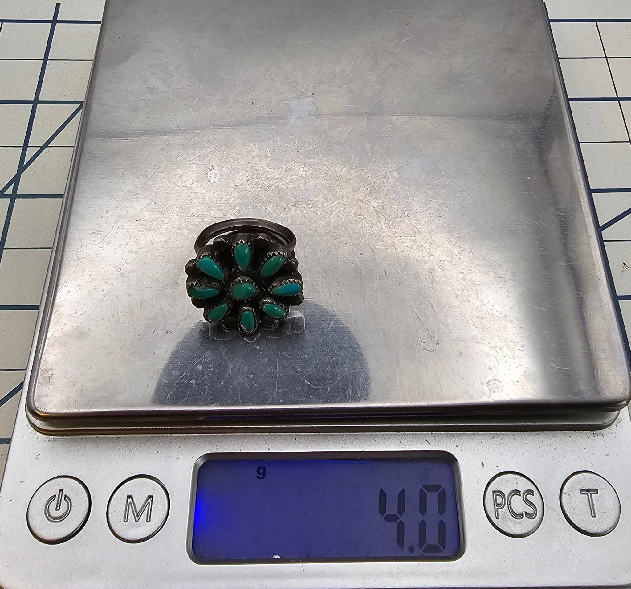 Handmade Navajo sterling silver ring featuring a flower-like arrangement of turquoise stones in a petit point design. The ring is marked as , indicating sterling silver construction. It is size 4.5 and weighs approximately 4.0 grams.