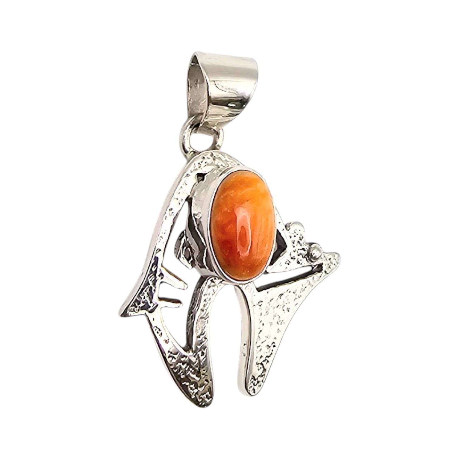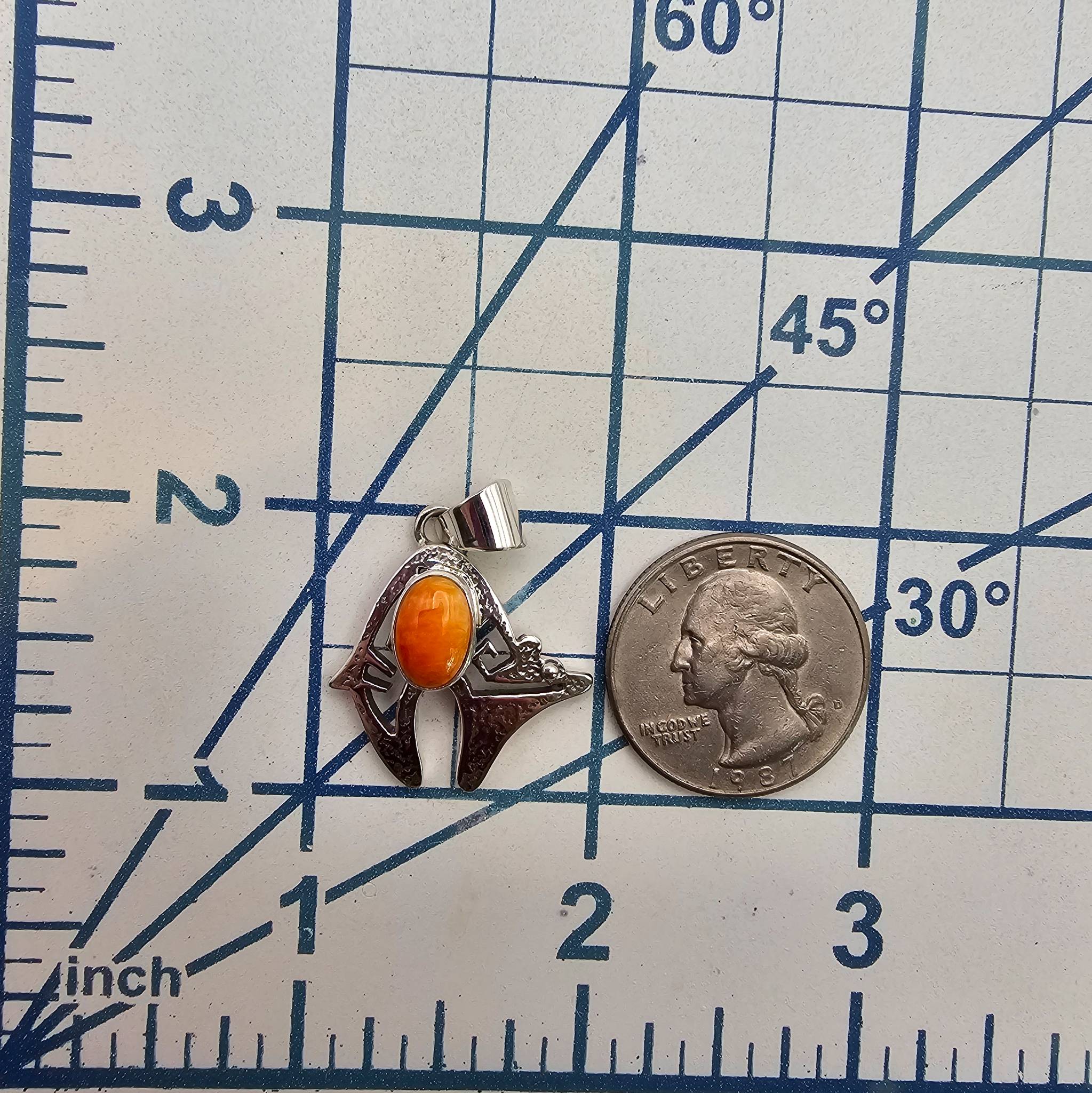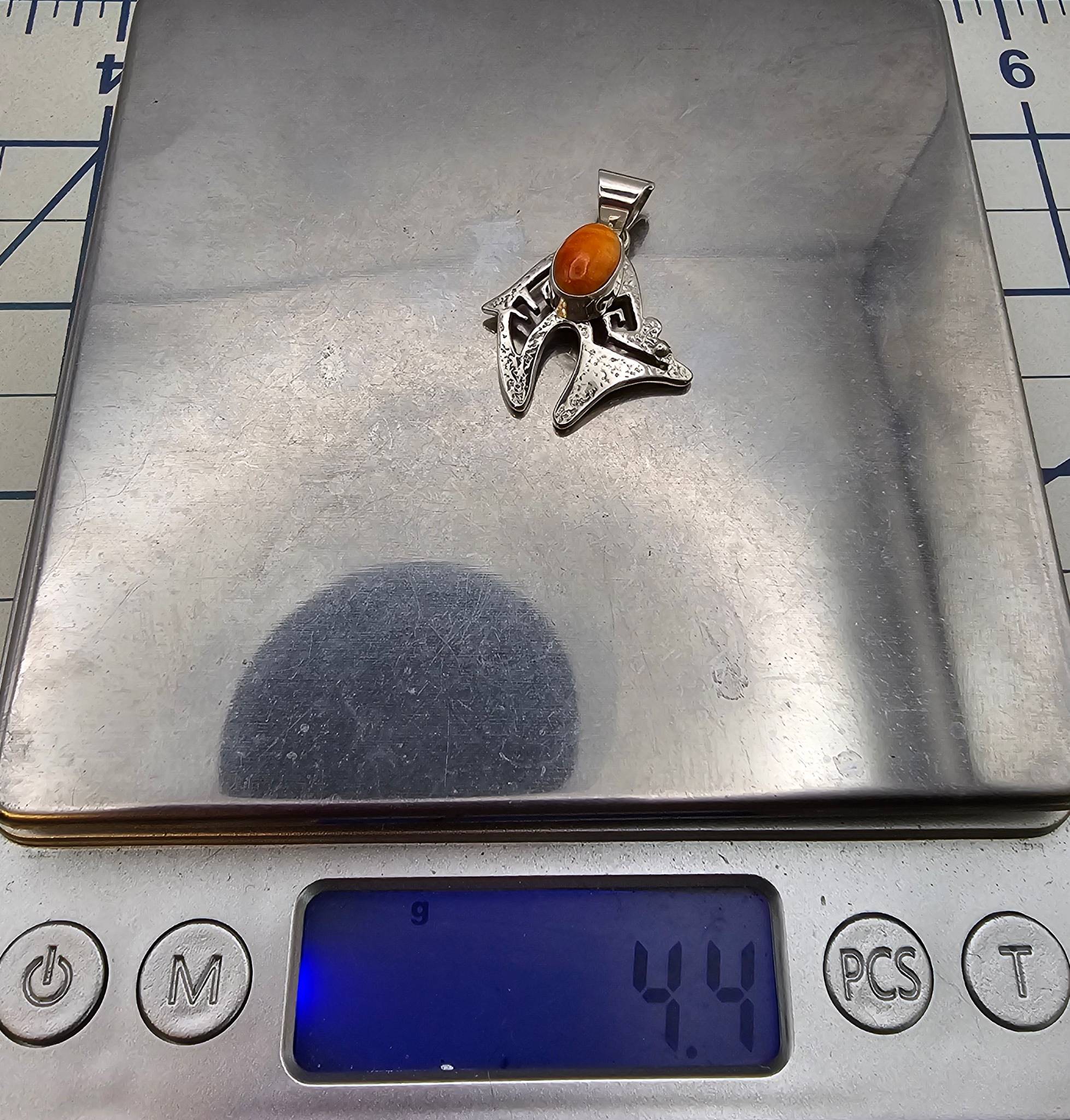 Navajo handmade pendant by Allen Lee, crafted in sterling silver. Features an oval centerpiece made from spiny oyster stone, set against a decorative Native American-inspired design. The pendant weighs 4.4 grams and includes a silver bail for secure attachment. Marked ‘Sterling’ and inscribed with the maker’s hallmark on the back.